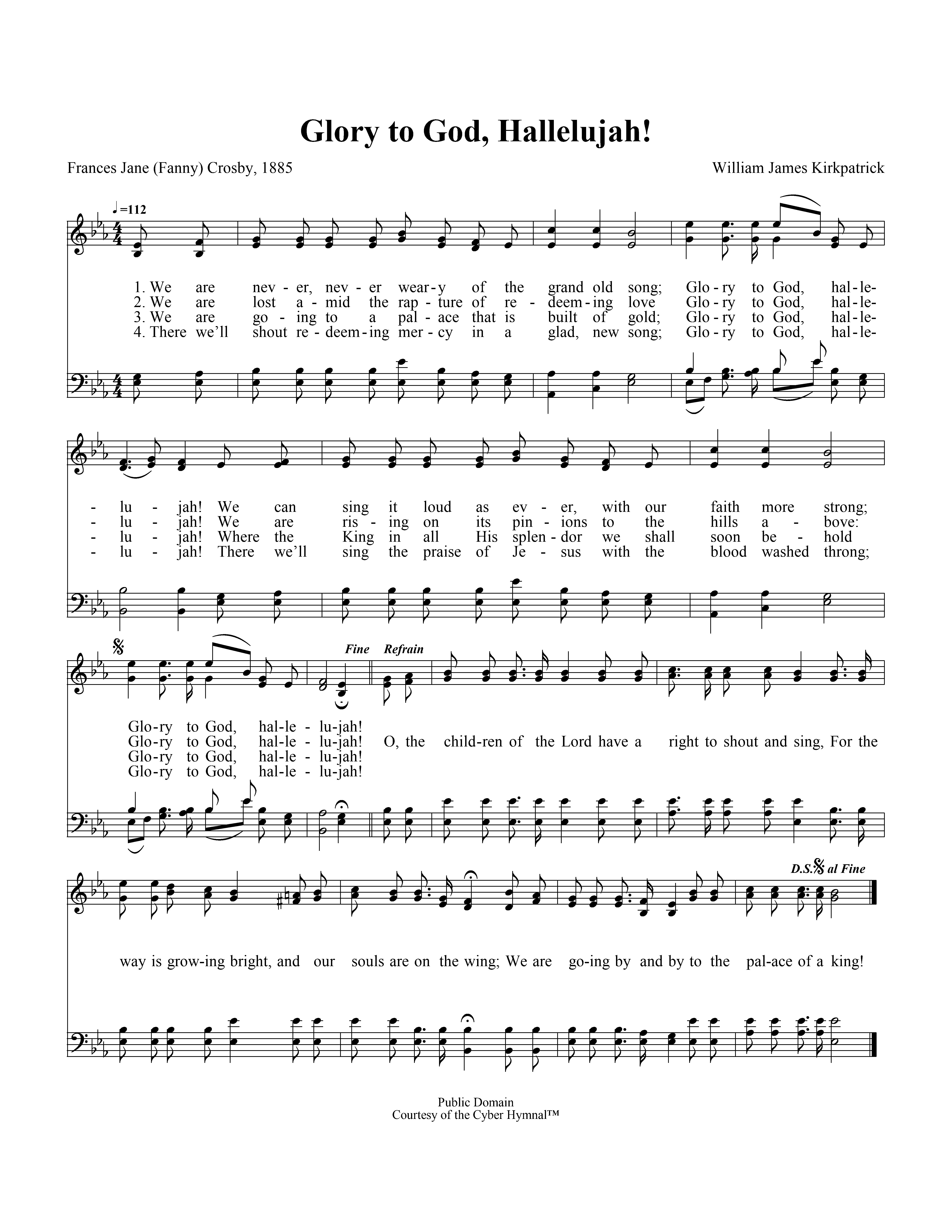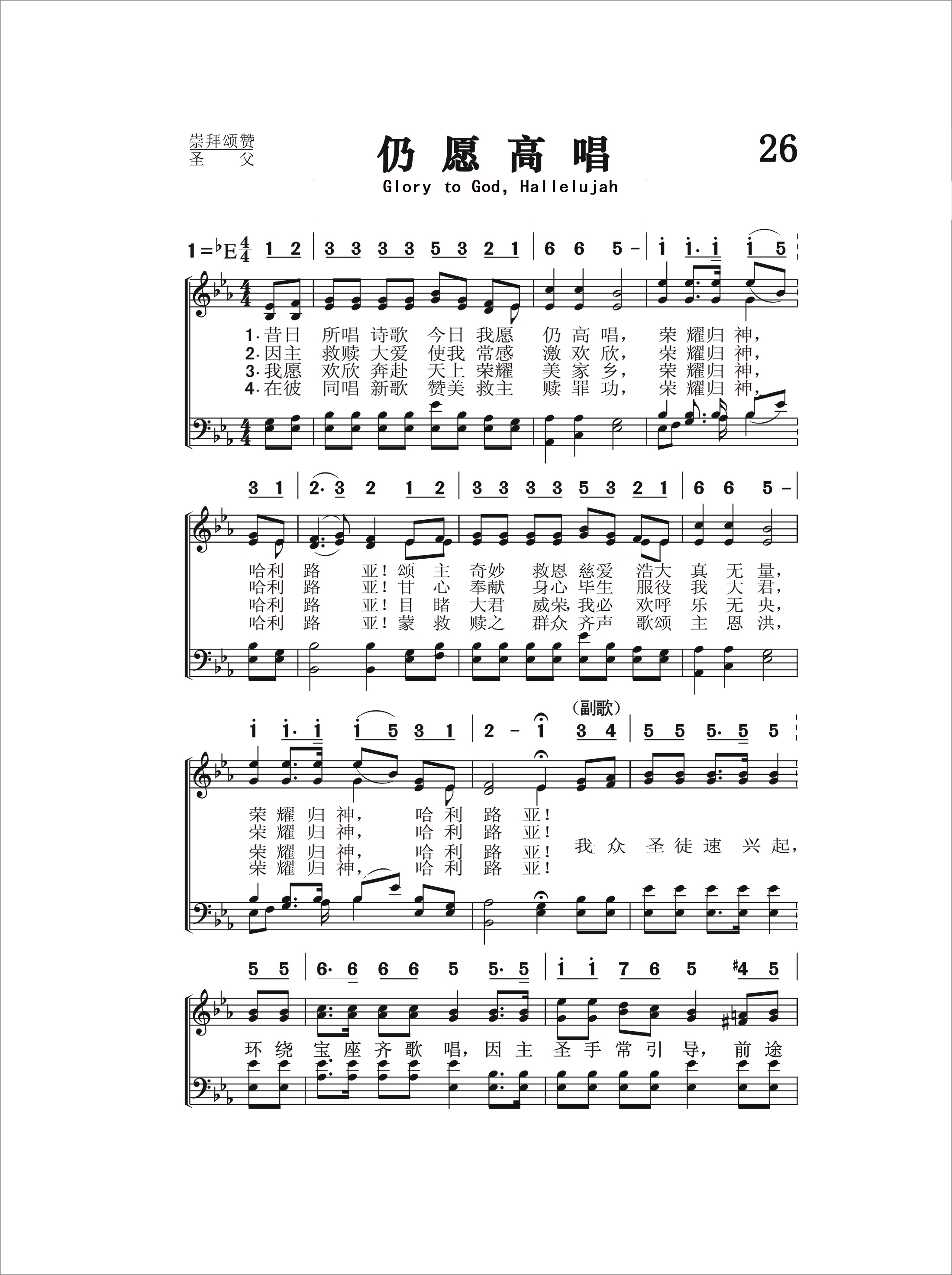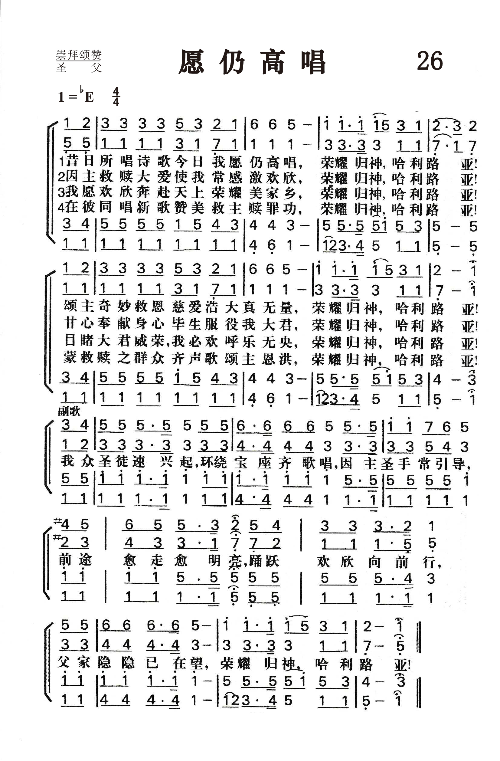第26首仍愿高唱 Glory to God,Hallelujah 克罗斯比(Fanny J.Crosby,1820,3,24-1915,2,12)作词,柯克帕特里克(W.J.Kirkpatrick,1838,2,27-1921,9,20)作曲 昔日所唱诗歌今日我愿仍高唱,荣耀归神,哈利路亚! 颂主奇妙救恩慈爱浩大真无量,荣耀归神,哈利路亚! 因主救赎大爱使我常感激欢欣,荣耀归神,哈利路亚! 甘心奉献身心毕生服役我大君,荣耀归神,哈利路亚! 我愿欢欣奔赴天上荣耀美家乡,荣耀归神,哈利路亚! 目睹大君威荣,我必欢欣乐无央,荣耀归神,哈利路亚! 彼此同唱新歌赞美救主赎罪功,荣耀归神,哈利路亚! 蒙救赎的群众齐声歌颂主洪恩,荣耀归神,哈利路亚! 我众圣徒速兴起,环绕宝座齐歌唱,因主圣手常引导,前途愈走愈明亮, 踊跃欢欣向前行,父家隐隐已在望,荣耀归神,哈利路亚! 词作者克罗斯比是美国才华出众,负有盛名的福音女诗人。她出生六个月时因庸医,误诊而双目失明。15岁时她就读于纽约最早的一所盲童学校。1847-1858年,她留在该校教授英语语法,修辞学,罗马史和美国历史。她少年时代就开始写诗,24岁时出版了《盲女与她的诗》,引起美国文坛的注意。1850年灵性奋兴的经验,使她集中全力专写圣诗,后在福音圣诗作曲家和编辑布雷得伯里的鼓励下,立志以创作福音圣诗作为自己的终生事业,于是与纽约一家出版社签订合同,每周写圣诗三首,结果写了5929首。此外,她还为布利斯写525首,为桑基写237首,为劳里写219首,为多恩写1500首。她一生共写了8440首圣诗,堪称为最多产的圣诗作家。 曲作者柯尔帕特里克是美国音乐出版家,宗教音乐作曲家。他出生于爱尔兰,自幼跟他父亲学音乐,以后受教于几个名师,青年时移居美国。南北战争时他参军,任军乐队吹笛手。1862年至1872年在美国费城做家具商,并在美以美会担任义工,曾任美国费城美以美会唱诗班指挥。同时他还作曲。他在1859年21岁时即开始编辑出版赞美诗工作,以后与斯托克顿.斯威尼合编出版约一百多部宗教音乐集和书刊。他谱写了不少信徒所喜爱的福音歌曲。 “我们应当靠着耶稣,常常以颂赞为祭献给上帝,这就是那承认主名的人嘴唇的果子”(来13:15)。 这是一首信徒十分爱唱的诗歌,其旋律欢快明朗,带有进行曲的节奏,体现了信徒积极向上,亲近上帝,在属灵的经验上日日进步的精神。