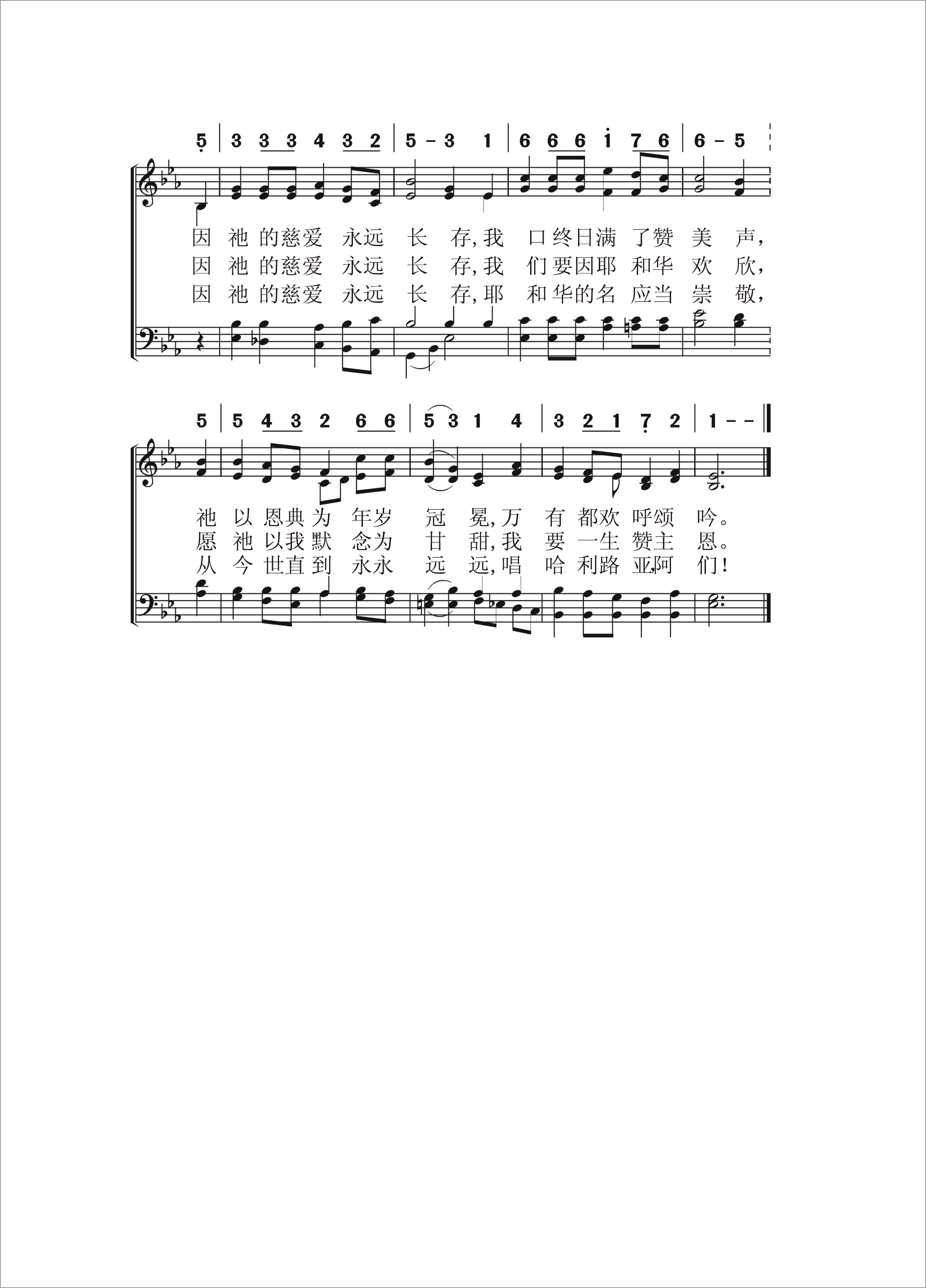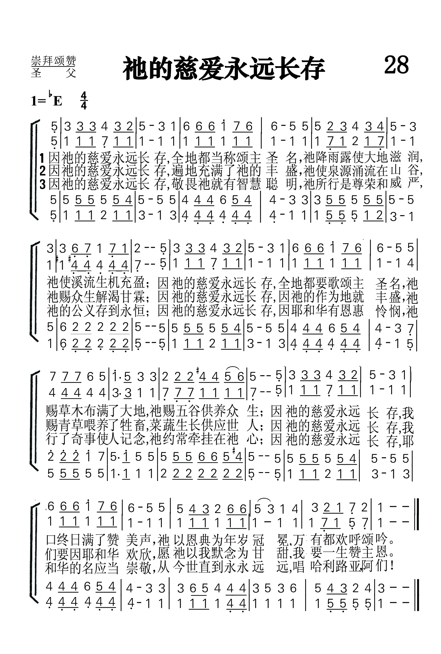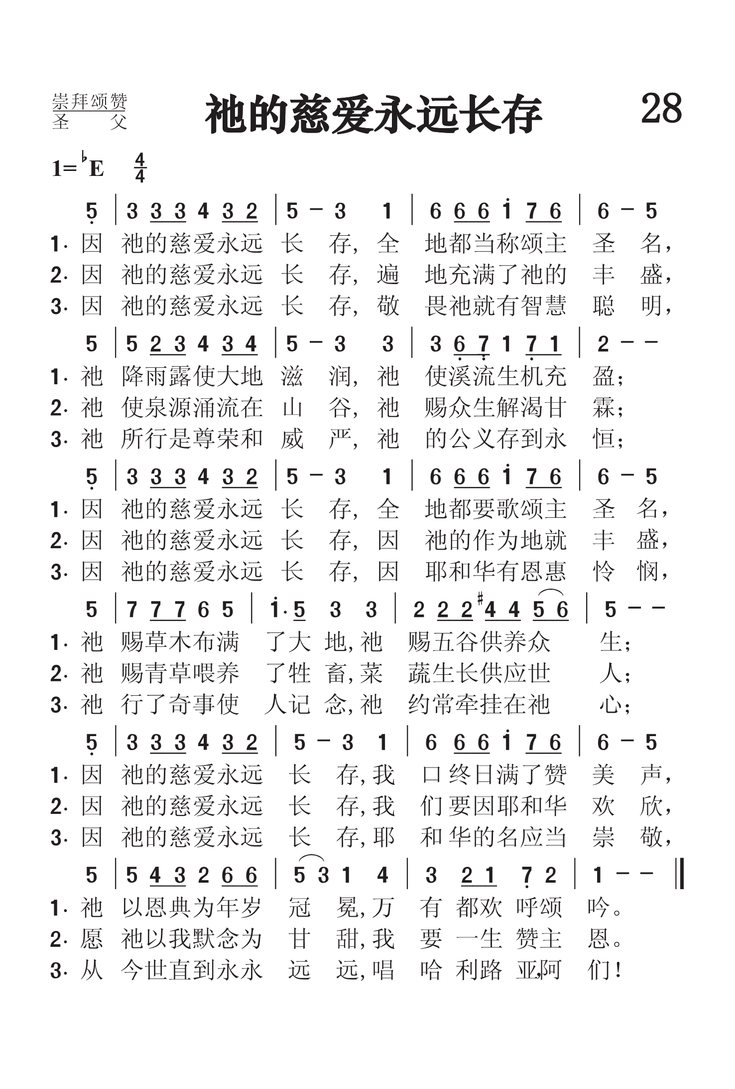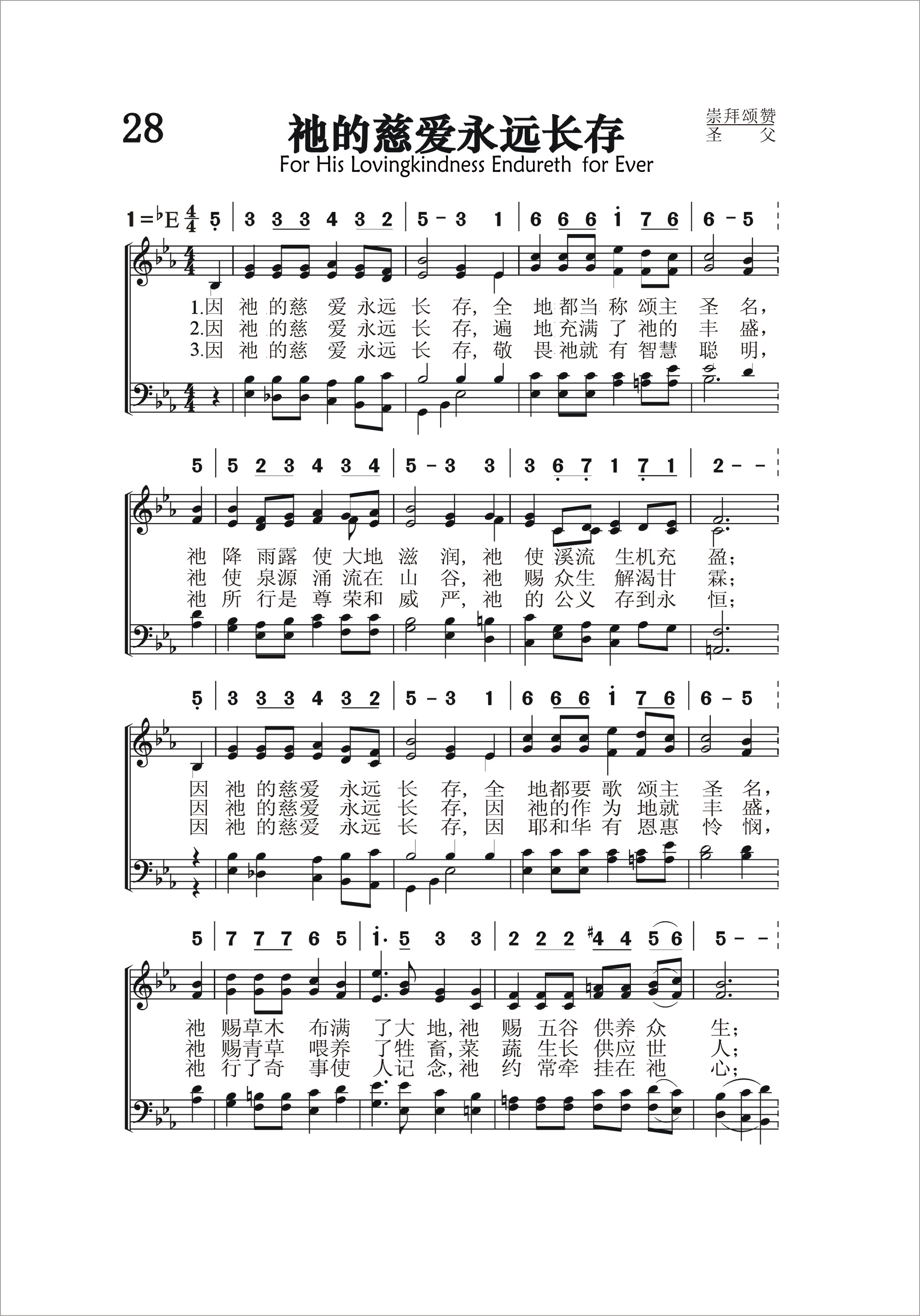 第28首 祂的慈爱永远长存 For His Lovingkindness Endureth For Ever (《颂赞圣诗》567首) 因祂的慈爱永远长存, 全地都当称颂主圣名, 祂降雨露使大地滋润, 祂使溪流生机充盈; 因祂的慈爱永远长存, 全地都要歌颂主圣名, 祂赐草木布满了大地, 祂赐五谷供养众生; 因祂的慈爱永远长存, 我口终日满了赞美声, 祂以恩典为年岁冠冕, 万有都欢呼颂吟。 因祂的慈爱永远长存,遍地充满了祂的丰圣, 祂使泉源涌流在山谷,祂赐众生解渴甘霖; 因祂的慈爱永远长存,因祂的作为地就丰盛, 祂使青草喂养牲了牲畜,菜蔬生长供应世人; 因祂的慈爱永远长存,我们要因耶和华欢欣; 愿祂以我为默念甘甜,我要一生赞主恩。 因祂的慈爱永远长存,敬畏祂就有智慧聪明, 祂所行是尊荣和威严,祂的公义存到永恒; 因祂的慈爱永远长存,因耶和华有恩惠怜悯, 祂行了奇事使人纪念,祂约常牵挂在祂 心; 因祂的慈爱永远长存,耶和华的名应当崇敬, 从今世直到永永远远,哈利路亚,阿门! 万军之耶和华是应当称颂的,因为在宇宙穹苍之中,没有别神会像祂那样普施恩惠给所造的众生。这首诗歌用《旧约》《诗篇》的语言,怀着深厚的情感,述说和见证上帝的慈爱永远长存。诗歌描述了上帝使泉源涌流在山谷, 赐众生解渴甘霖,赐青草喂养了牲畜,使菜蔬生长供应世人,表达了蒙恩之人终日满了赞美声,一生赞主大爱的美好愿望。