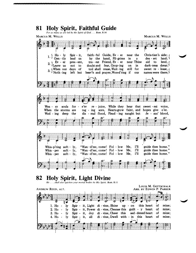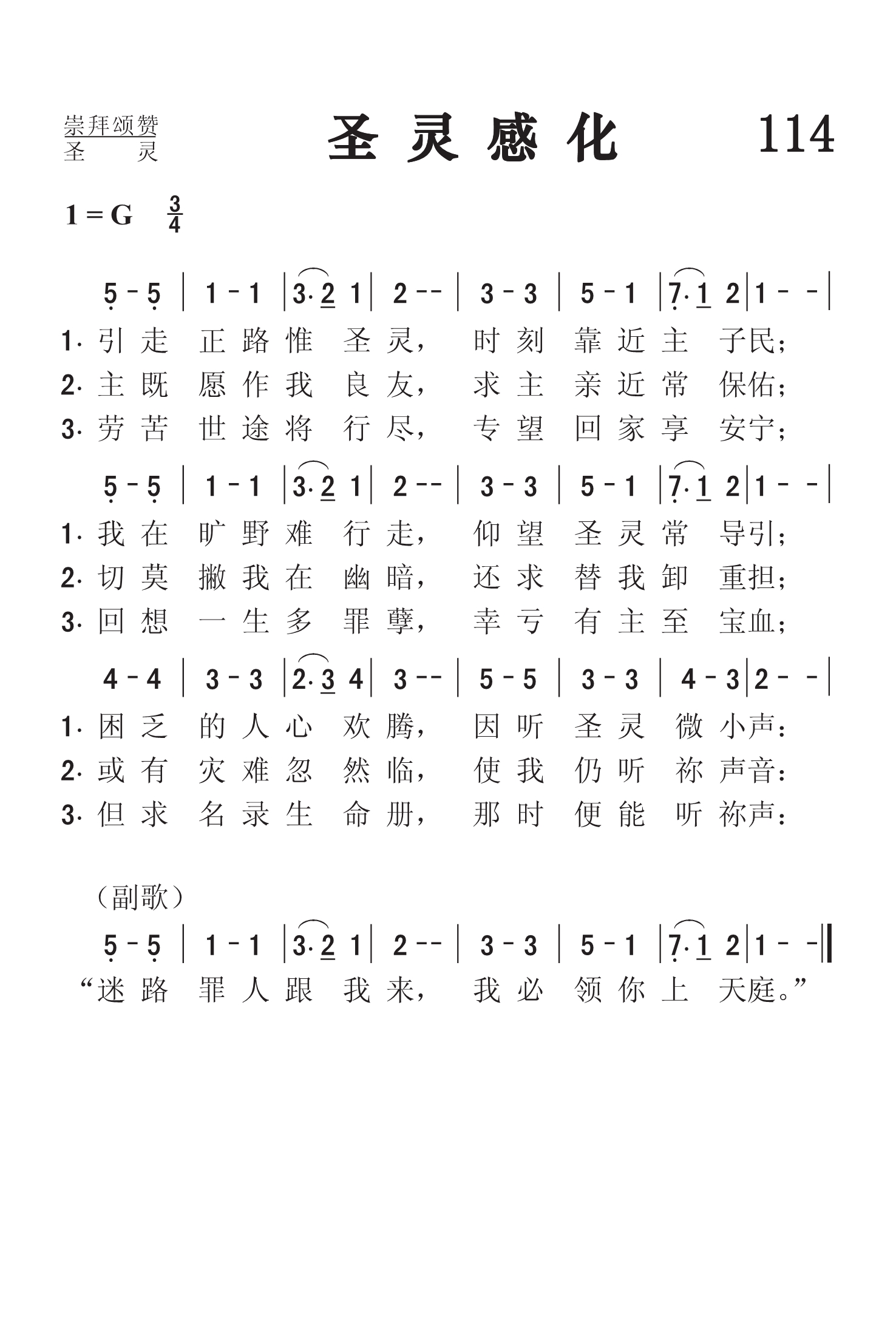 第114首圣灵感化 Holy Spirit,Faithful Guide 马库斯.韦尔斯(M.M.Wells,1815.10.2-1895.7.17)作词作曲 引走正路惟圣灵 ,时刻靠近主子民; 我在旷野难行走, 仰望圣灵常导引; 困乏的人心欢腾,因听圣灵微小声: “迷路罪人跟我来 ,我必领你上天庭”。 主既愿作我良友 ,求主亲近常保佑; 切莫撇我在幽暗, 还求替我卸重担; 或有灾难忽然临, 使我仍听祢声音: “迷路罪人跟我来 ,我必领你上天庭”。 劳苦世途将行尽, 专望主来享安宁; 回想一生多罪孽 ,幸亏有主至宝血; 但求名录生命册 ,那时便能听你声: “迷路罪人跟我来 ,我必领你上天庭”。 “只等真理的圣灵来了,祂要引导你们明白一切的真理”(约16:13)。 马库斯.韦尔斯出生于美国纽约州。他早年悔改信主,终生从事农业劳动和农具制作。他只是一名默默无闻的平信徒。可是他热心事奉主,一生信靠主,在平凡的岗位上为主做出美好的见证。1858年10月的一天,他在玉米地里劳动,有感于圣灵的慈悲引导,他突发诗兴,就赶紧写下了这首文辞优美,含义深刻的《圣灵引导》,第二天又自己为它谱曲,然后把它寄给伍德伯里教授,发表在《纽约音乐先驱》杂志上。不久,这首歌就在教会中传唱开来。这首脍炙人口,百唱不厌的诗歌,成了这位普通信徒珍贵的属灵遗产。