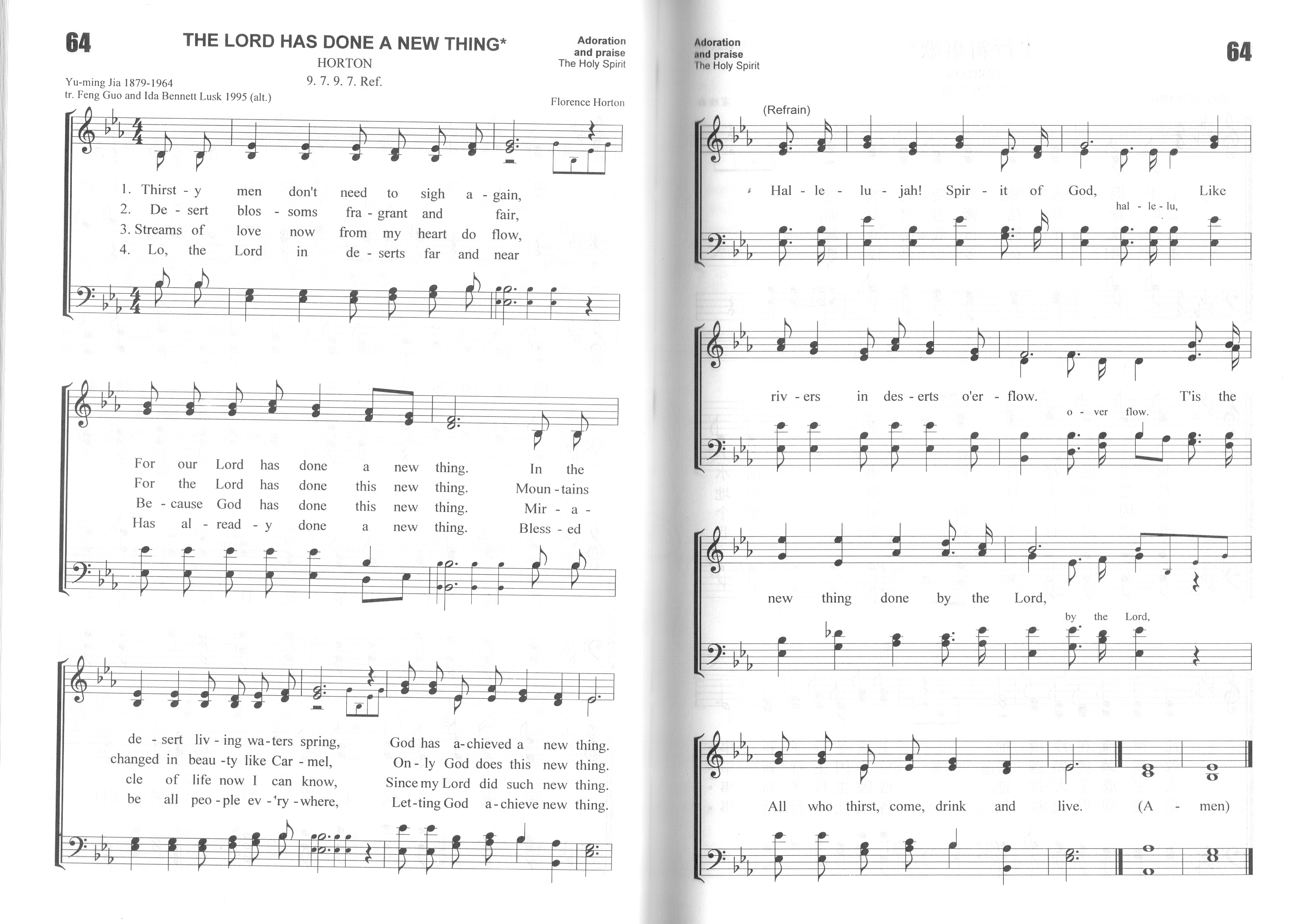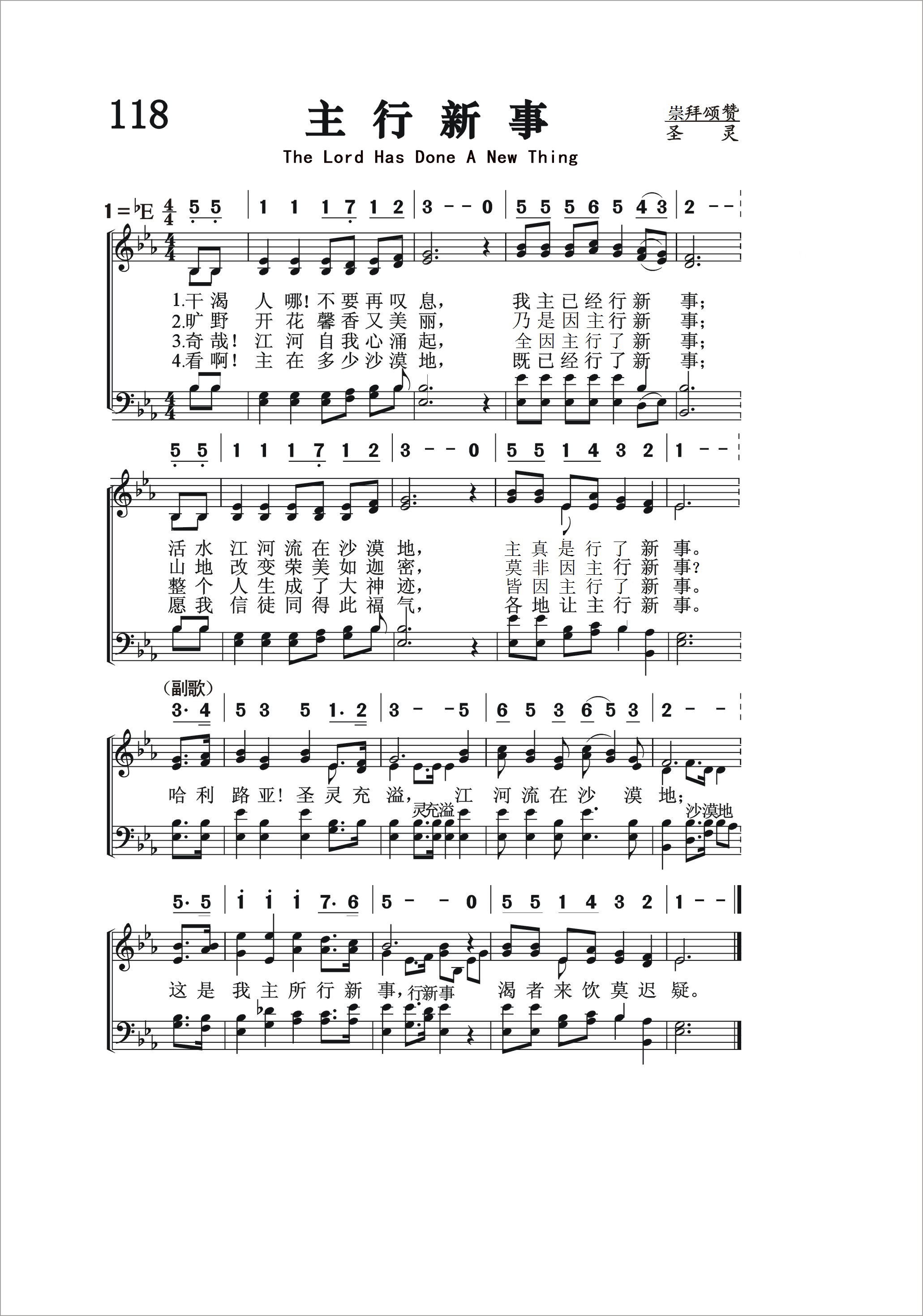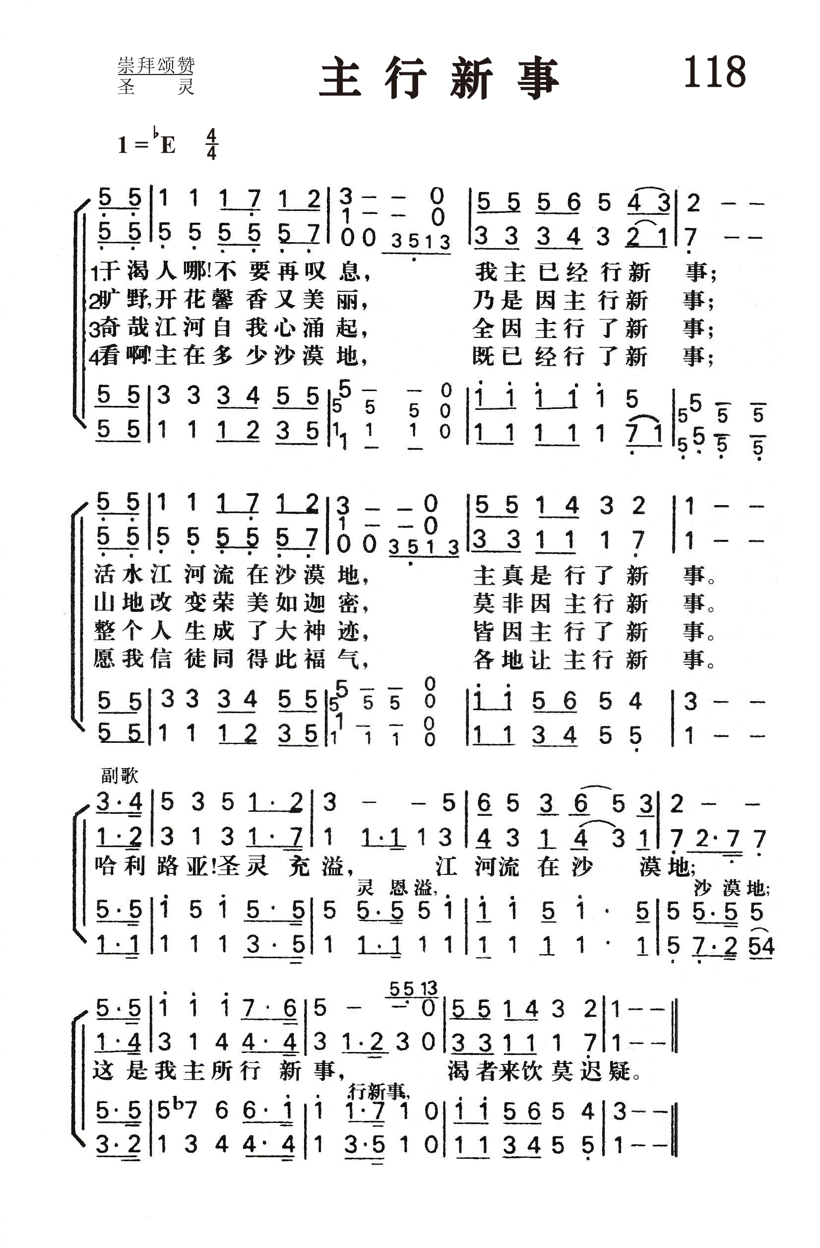 第118首主行新事 The Lord Has Done a New Thing 干渴人哪!不要再叹息,我主已经行新事; 活水江河流在沙漠地,主真是行了新事。 旷野开花馨香有美丽,乃是因主行新事; 山地改变荣美如迦密,莫非因主行新事? 奇哉!江河自我心涌起,全因主行了新事。 整个人生成了大神迹,皆因主行了新事。 看哪!主在多少沙漠地,既已经行了新事; 愿我信徒同得此福气,各地让主行新事。 哈利路亚 !圣灵充溢,江河流在沙漠地; 这是我主所行新事,渴着来饮莫迟疑。 本诗原名《沙漠流江河》,是贾玉铭(1897-1964)根据赛43:19-21:“看哪,我要做一件新事;如今要发现,你们岂不知道吗?我必在旷野开道路,在沙漠开江河。野地的走兽必尊重我;野狗和鸵鸟也必如此。因我使旷野有水,使沙漠有河,好赐给我的百姓、我的选民喝。这百姓是我为自己所造的,好述说我的美德”而写成的。原载《圣徒心声》第85期。 贾玉铭字惺吾。山东人,是中国基督教福音派的著名神学家、神学教育家、解经家,出任过很多神学院、灵修院的教授跟院长。 1880年(清光绪六年),贾玉铭出生在中国山东省昌乐县小岭村。1901年,毕业于狄考文(Calvin Wilson Mateer,1835-1920)博士在登州府创办的长老会文会馆(齐鲁大学前身),由于庚子事变的影响,那一年文会馆只毕业了两名学生,而其中之一其中之一是贾玉铭(德新)。然后他继续进教士馆(神学院),接受改革宗系统神学的训练。 贾玉铭从教士馆毕业以后,先后在美北长老会在山东省设立的安邱县逢旺支会、济宁州教会和沂州府教会担任牧师。1907年,赫士博士(Watson M. Hayes,1857~1944)在山东潍县创办女子神学院。1915年在金陵神学院任教。1919年,赫士博士由于信仰原因,另外创办华北神学院,并于1922年迁往滕县。贾玉铭牧师被聘为教授。 20年代创办《灵光报》双月刊, 30年代在南京负责灵光报社工作。1930年任金陵女子神学院院长。1936年金陵神学院和金陵女子神学院合并,他辞去金陵女子神学院院长职,1936年10月,贾玉铭创立了中国基督教灵修学院。他在这里付出的心力最大,他写过很多作品,其中最著名的就是五卷《圣书要义》,此外,他主编《灵光报》。他是非常有名,影响很大的。 贾玉铭跟丁立美是长老会文会馆(后来的齐鲁大学)的同学,后来也一起同工很多年。丁立美是比较多灾多难学生当中组织了“学生立志布道团”当第一任的巡行干事,后来1919年到“云南布道会”去。贾玉铭比较多做教学方面的工作,是在1930年代有影响的基督教传道人。 抗战期间,中国基督教灵修学院几经转折迁至重庆。1945年迁回南京。1948年迁往上海至1956年停办前,他一直主持灵修学院工作。1948 年,他被推选为世界福音会议的副会长之一。1954年被选为中国基督教三自爱国运动委员会副主任。 主要著作有《神道学》 《宣道法》《教牧学》《灵修日课》和《圣书要义》(8卷) 等10多部。1964年4月病逝上海。 曲调作者是霍顿(F.Horton),生平不详。本曲节奏较强。正歌部分沉着平稳,犹如军队前进。副歌则欢乐见激昂,从而形象地体现了歌曲的主题。
