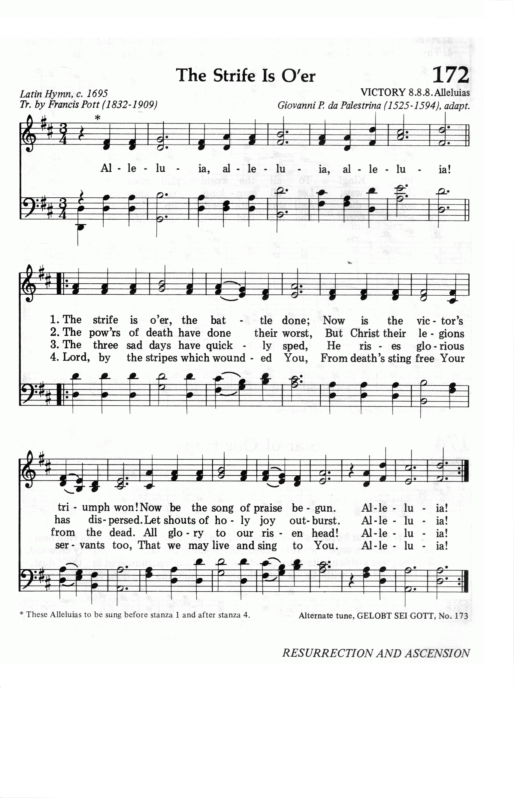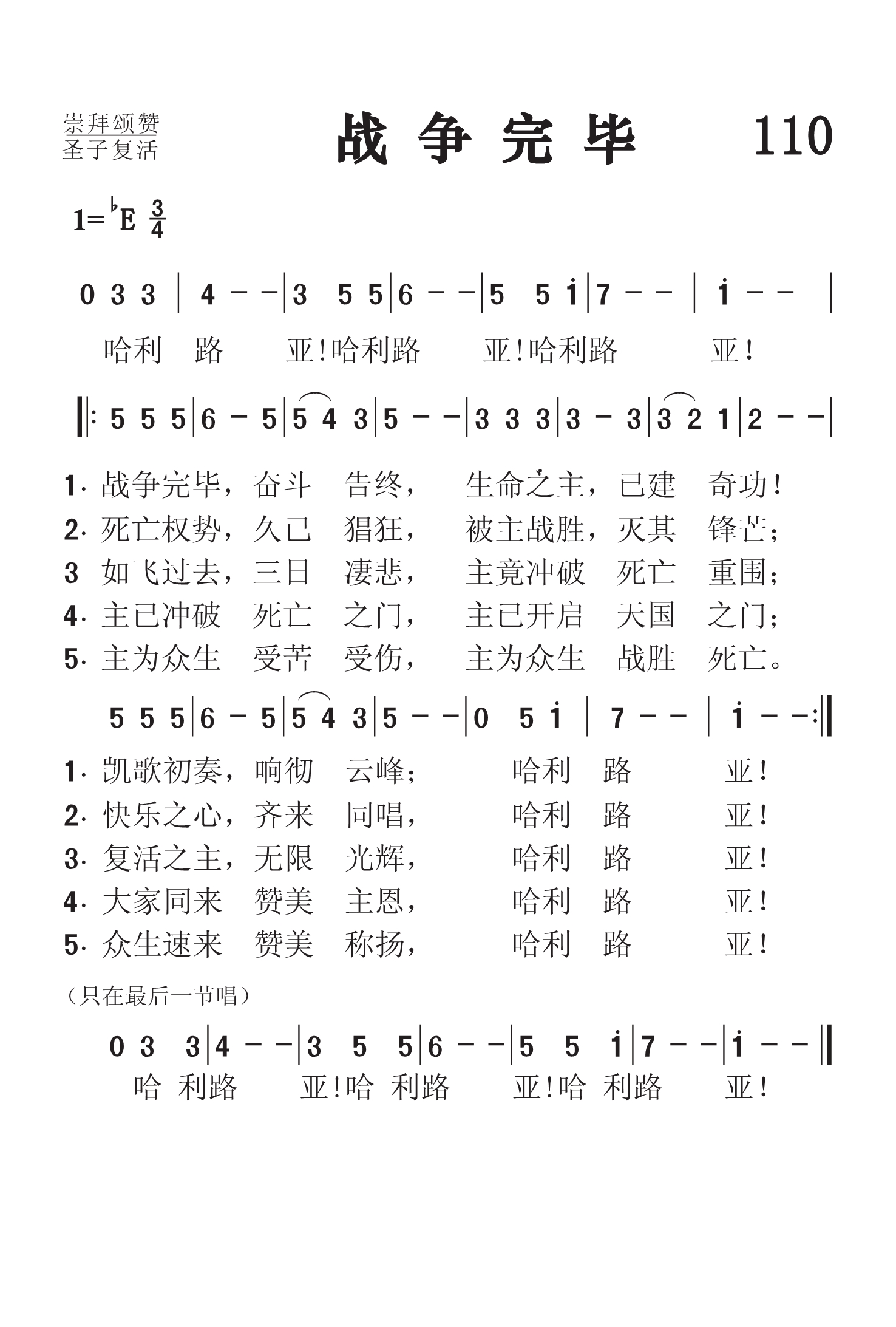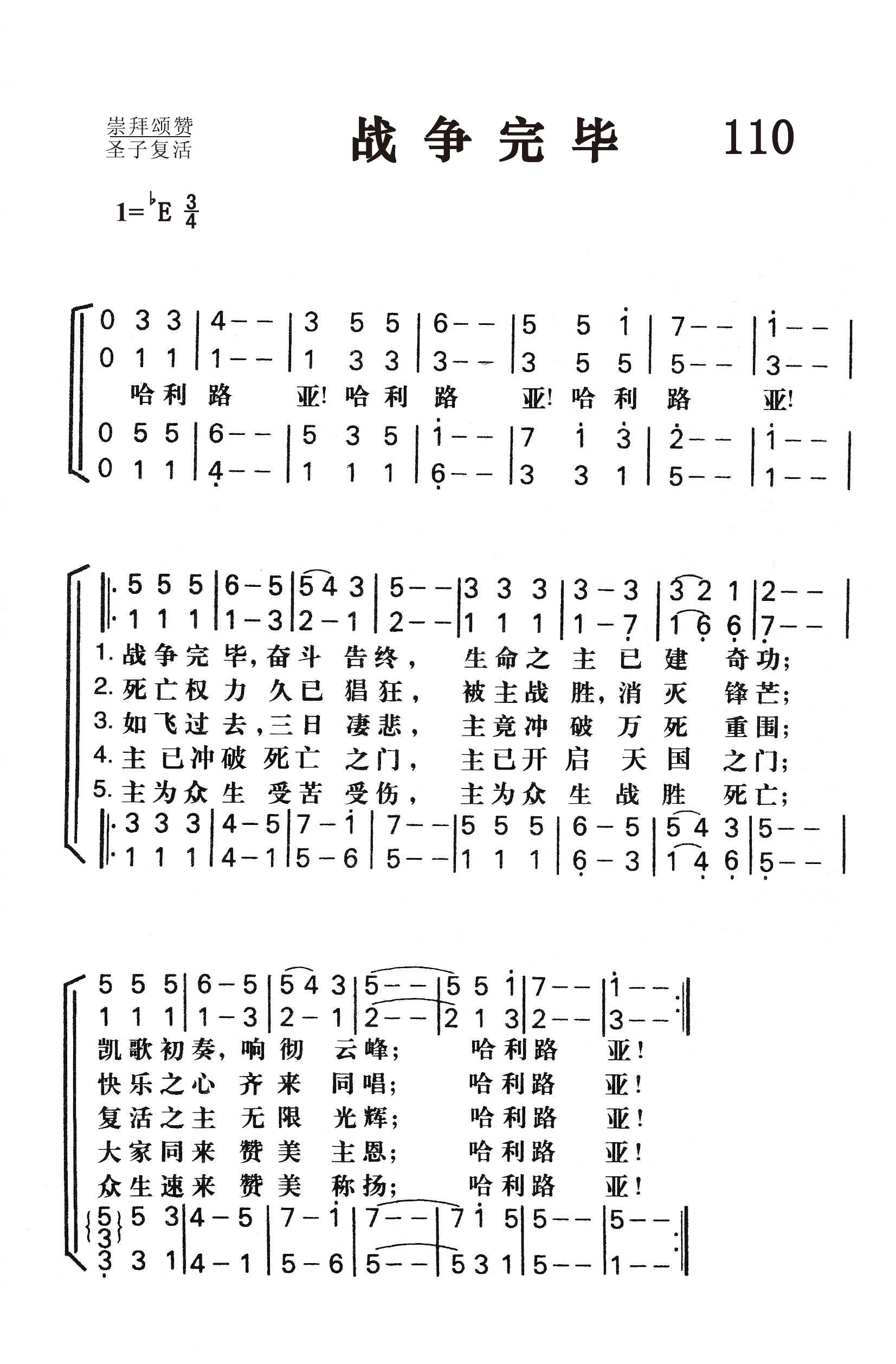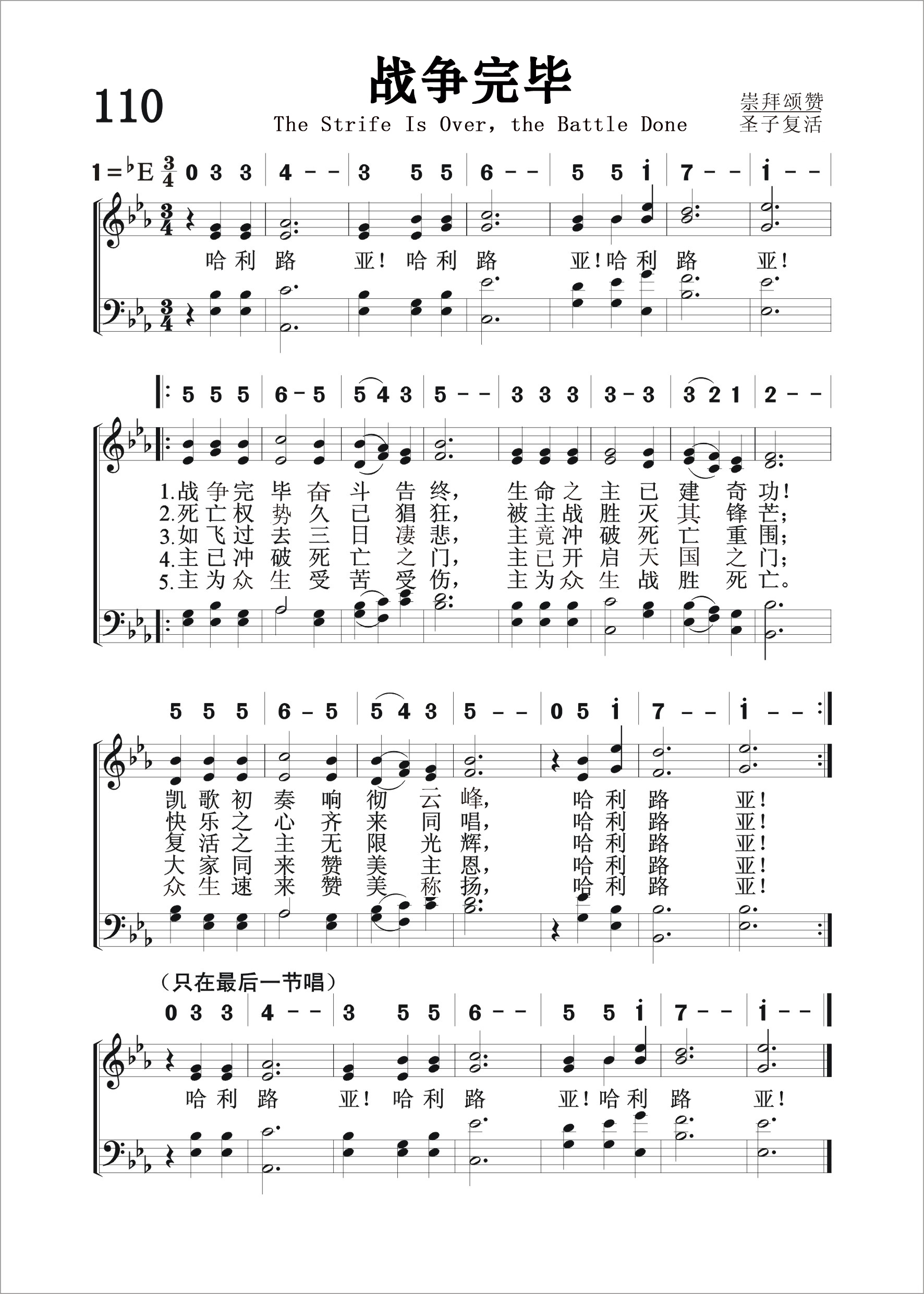 第110首 战争完毕 The Strife Is Over,the Battle Done 哈利路亚! 哈利路亚!哈利路亚! 战事完毕,争斗告终,生命之主,已建奇功! 凯旋初奏,响彻云峰;哈利路亚! 死亡权势,久已猖狂,被主战胜,灭其锋芒, 快乐之心,齐来同唱,哈利路亚! 如飞过去,三日伤悲,主竟冲破死亡重围, 复活之主,无限光辉,哈利路亚! 主已冲破死亡的门,主已开启天国之门, 大家同来赞美主恩,哈利路亚! 主为众生受苦受伤,主为众生战胜死亡, 众生速来赞美称扬,哈利路亚! 哈利路亚!哈利路亚!哈利路亚! 这首诗歌过去一直认为是十二世纪的拉丁圣诗,但现在则已确认是选自1753年在德国蒙斯特出版的拉丁文《圣诗》,由尼尔(J.M.Neale,1818,1,24-1866,8,6)于1851年译成英语,刊于当年出版的《中世纪赞美诗》一书。本诗的旋律是《今古圣诗》的第二任主编蒙克(W .Honk ,1823,3,16-1889,3,1)根据帕勒斯特里那(G.P.Da Palestrina,约1525-1594)所作《荣耀颂》的乐句改编。 帕勒斯特里那是第一位在教会音乐和西洋音乐史上占重要地位的音乐家。他出身于意大利农民家庭,26岁到罗马学习音乐,学成后回乡在教会服务了十年,后重返罗马,任好几个教堂的音乐指挥,最后任圣彼得大教堂总圣乐师。 帕勒斯特里那在声乐方面把声音发展到最富于表现力和最完善的地步,为美声唱法奠定了基础。在和声方面,他巧妙地把过去合唱中由于两个旋律的共同进行而产生的和声效果,变为“用和声于合唱”,为现代和声学打下了基础。1566年,有人反对在教会合唱中运用和声,而主张用齐唱。为此,教皇庇护四世专门召集会议讨论。在会上,帕勒斯特里那特地创作了《教皇米切尔弥撒曲》,采用了历代音乐的精华,把几个不同的优美旋律融为一曲,不但词句清楚,而且其和声效果使乐曲的情感更加绚丽多彩,为以后欧洲多声部之合唱的先河。 蒙克的改编保留了原曲的雄伟和精致。全曲使人排除俗念,净化心灵,高唱基督复活的伟大胜利。 英译者尼尔出生在英国伦敦,父亲是圣公会牧师。他自幼就立志献身为主服务,后就读剑桥大学,以文学见长,曾获诗文奖。1846年起担任东格林斯达妇幼救济院牧师兼监督,曾帮助数千妇女摆脱疾病和困境。他工作繁重,待遇菲薄,却乐道安贫,任劳任怨。他才思横溢,精通二十种文字,工作之余笔耕不已。那些脍炙人口的希腊、拉丁语经典圣诗,差不多都是经他的手翻译的。但他从来不计较报酬,一心为主作工。1860年,美国哈佛大学授予他荣誉神学博士学位。 曲改编者蒙克出生于英国伦敦,是著名的琴师,唱诗班指挥,圣乐作家,圣诗编辑,声乐教授。他把毕生的精力都奉献献给了教会,一生只写过一首世俗歌曲,其余均为圣乐。当他在纽英伦圣马提亚堂任管风琴师时,曾领导一个业余唱诗班,每天唱诵早晚礼拜众赞歌的全部祷文,同时兼任伦敦皇家音乐学院声乐教授。他曾对人说:“教堂的管风琴是感动人心的工具,而不是炫耀自己技术的乐器。”他所谱写的圣诗旋律既有历史风采,又有时代特征。1882年达勒姆大学授予他音乐博士学位。
