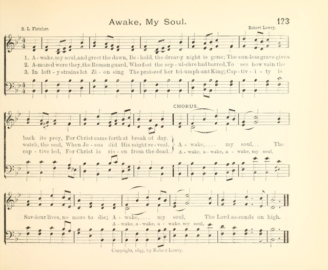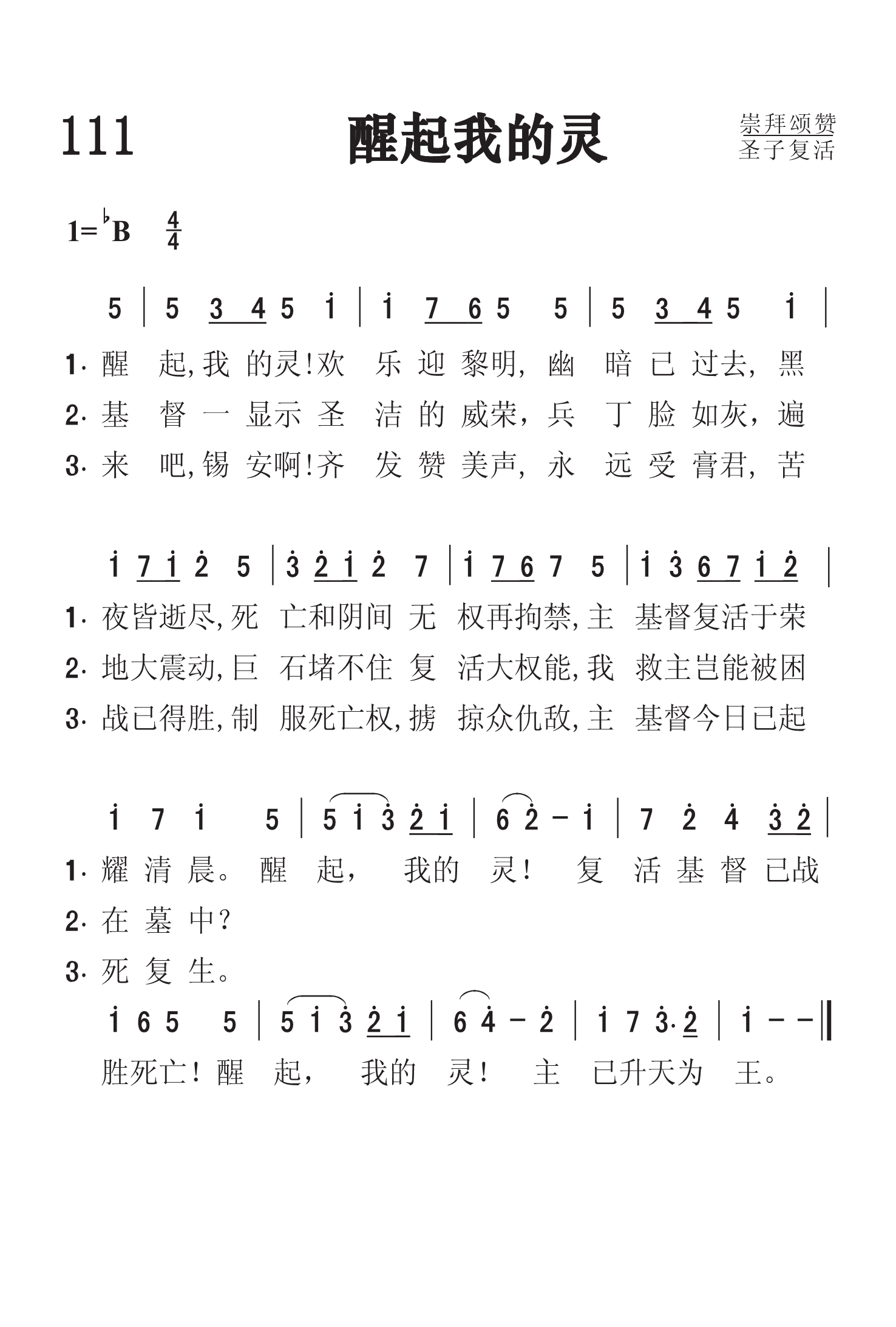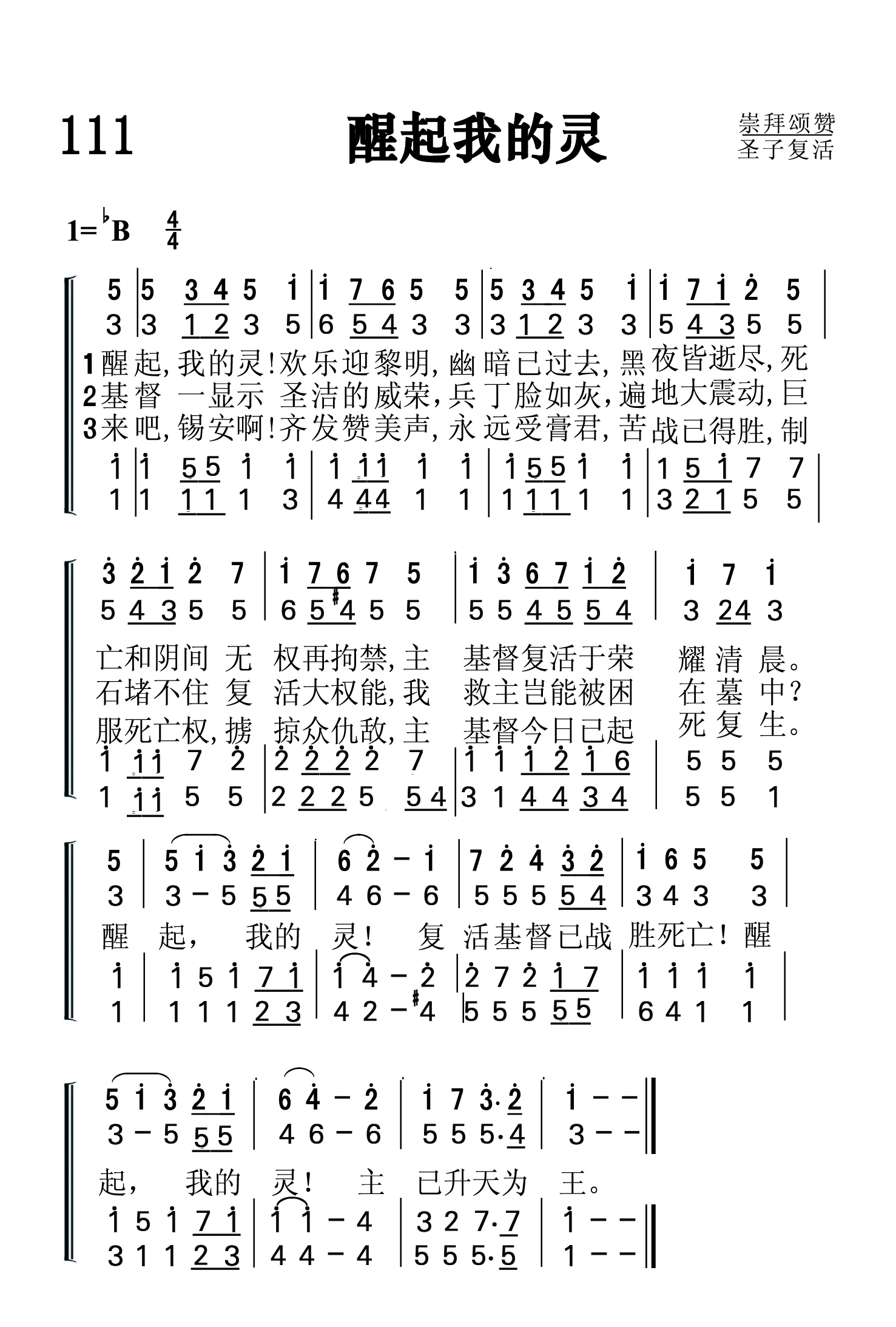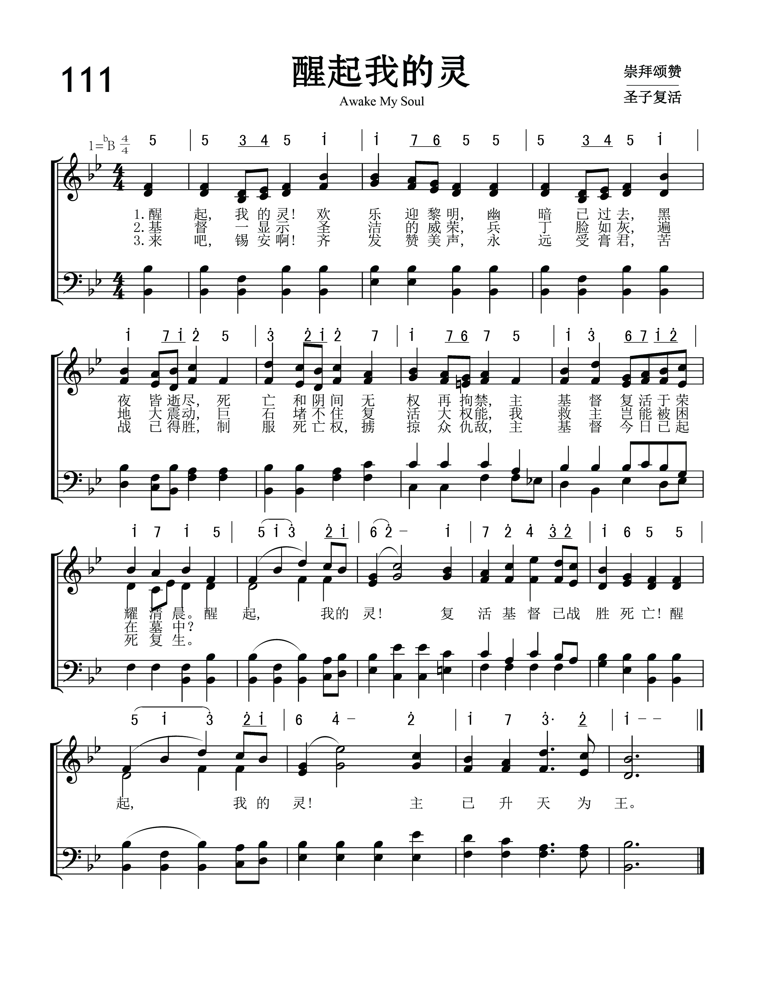 第111首醒起我的灵 Awake My Soul (《基督颂歌》(C.S)214首) 弗莱彻(Robert Lowe Fletcher)作词,劳里(R .Lowry,1826,3,12-1899,11,25)作曲,赵典仁、吴涤申合译 醒起,我的灵!欢乐迎黎明, 幽暗已过去, 黑夜皆逝尽, 死亡和阴间无权再拘禁, 主基督复活于荣耀清晨。 醒起,我的灵!复活基督已战胜死亡! 醒起,我的灵!主已升天为王。 词作者弗莱彻生平不详。1910年11月26日的《标准邮报》(The Post-Standard)曾报导说:“作曲家罗伯特. 弗莱彻明天将莅临南大街公理教会。上午他将以《保守的生活》为题发表演讲。晚上他将举办传统的福音诗歌崇拜。届时他要演绎他自己的作品。弗莱彻会邀请会众协助他歌唱。他是一个有趣的人,会把大批陌生人吸引到南大街教会来”。 曲作者劳里出生于美国费城。大学毕业后,担任费城,纽约布鲁克林等地浸会教堂的牧师。1869至1875年兼任母校修辞学教授,离校时母校赠送他荣誉神学博士学位。1875年起至1899年去世,一直任新泽西州普兰菲尔德地方浸会牧师。他自幼爱好音乐,但并没有专学音乐,直到他41岁后才致力于福音音乐圣诗的编写,并自己作曲配和声。有人问他:“你怎么又能作词又能作曲并能配以和声呢?”他回答说:“我也没有什么特别的办法。有时,音乐曲调在我心中出现,而词句也随着出来了,词与曲就配合得很好。我常常注意着自己的心境,无论是在家中,还是走在街上,任何事物触动了我的灵感,我就马上抓住它,把它记录下来。我有时在报纸的边上或一个旧信封的背面,把我的灵感记录下来。我觉得我的头脑就象一架常转动的纺车,音乐从其中流了出来,有时并不注意在我头脑里流出来的曲调是C调还是A调,只有当我把它写在纸上时,才想它当用什么调。我在纸上一面写,一面把它完成,成为一首曲调,然后再到管风琴上去试奏,不是先试奏而后写出,而常常是曲调与词一同写出。” 劳里还说:“我有时宁愿写赞美诗可以长期流传下来,影响很多的人,因为讲道完毕后常常会被人遗忘。”的确,他当时讲道的听众只有一千人,而他所写的赞美诗多年以来却有成千上万的人在颂唱。劳里牧师一生编辑过十八种不同的赞美诗集。
