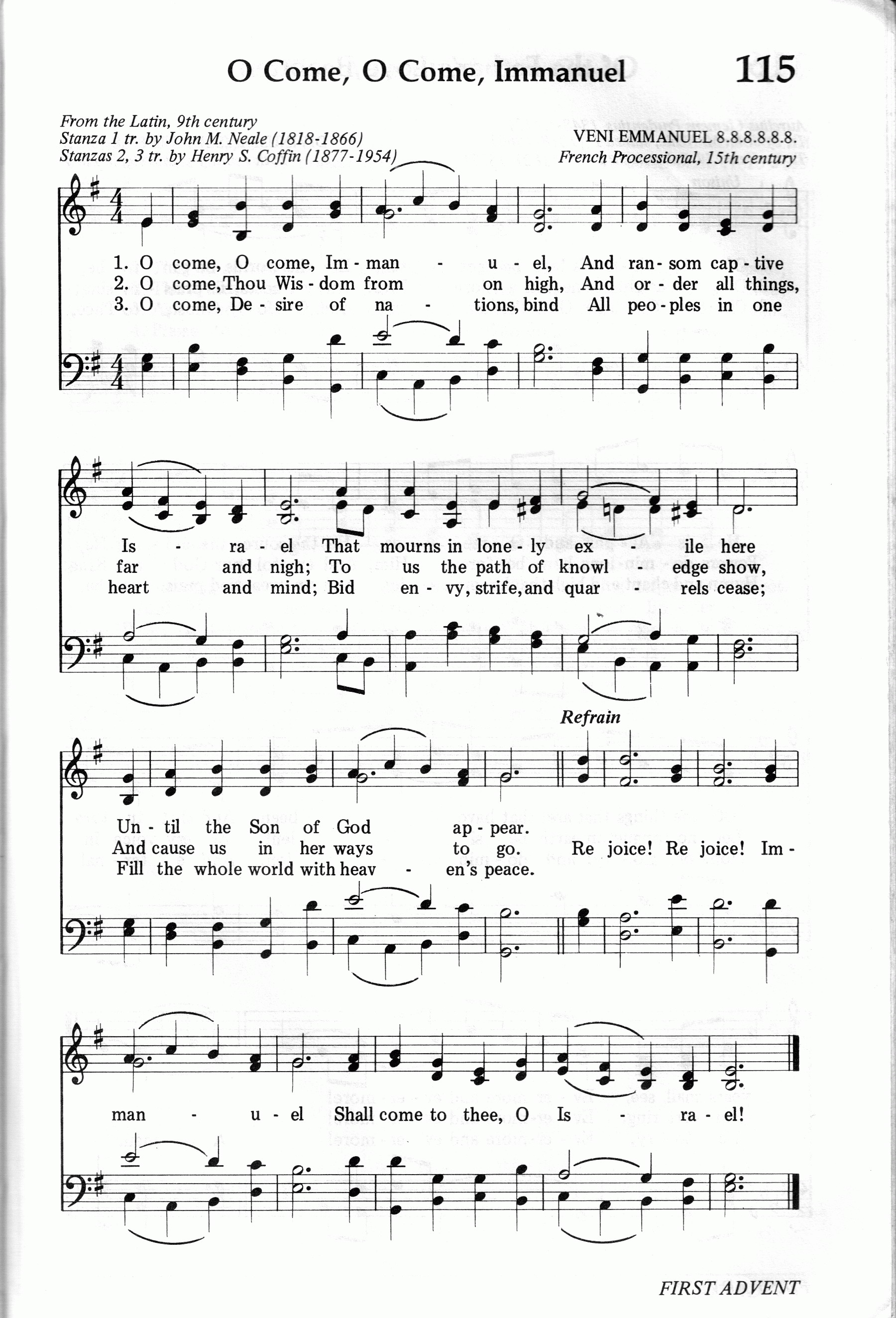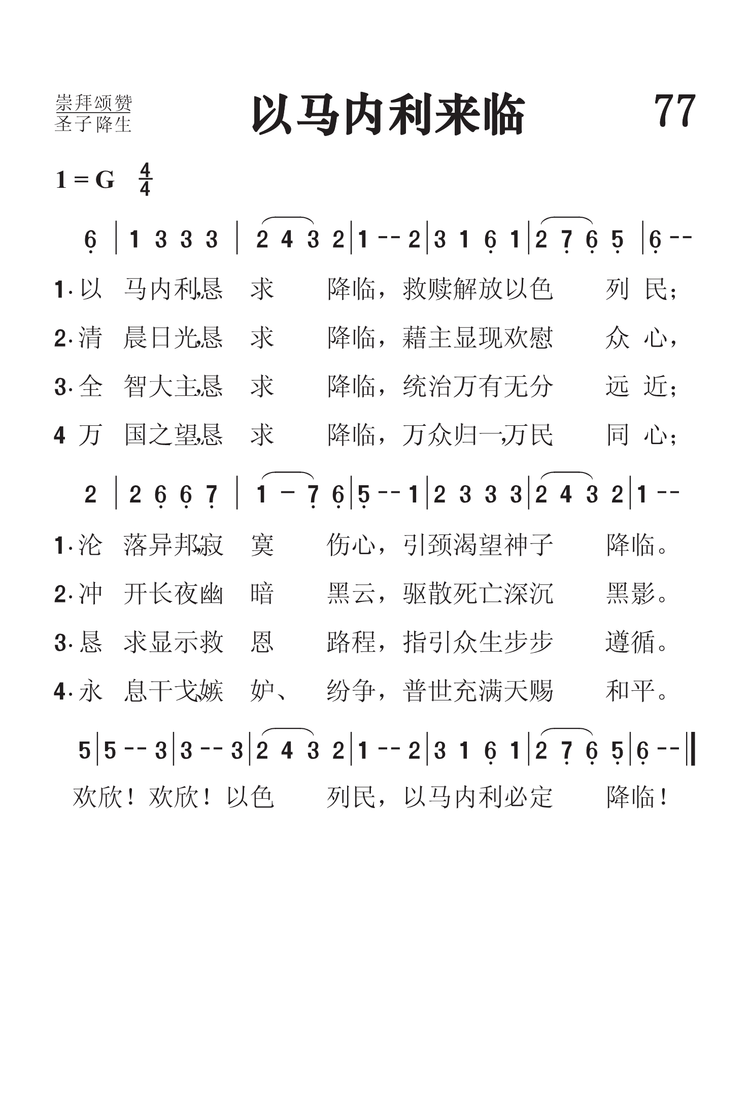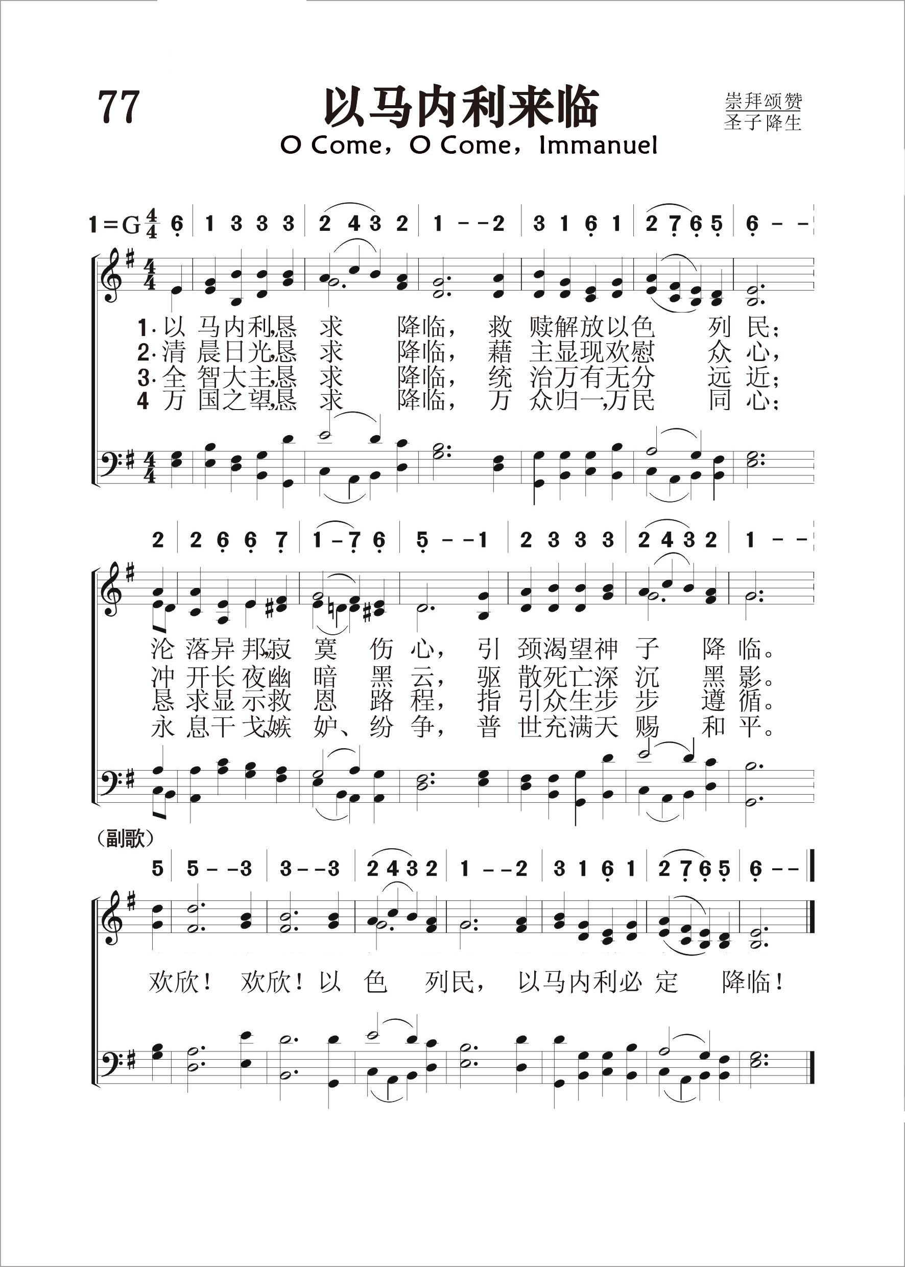第77首以马内利来临 O Come,O Come,Immanuel 以马内利, 恳求降临,救赎解放以色列民; 沦落异邦,寂寞伤心,引颈渴望神子降临。 清晨日光,恳求降临,藉主显现欢慰众心, 冲开长夜幽暗黑云,驱散死亡深沉黑影。 全智大主,恳求降临,统治万有无分远近; 恳求显示救恩路程,指引众生步步遵循。 万国之望,恳求降临,万众归一万民同心; 永息干戈\嫉妒、纷争,普世充满天赐和平。 欢欣!欢欣!以色列民,以马内利必定降临! “必有童女怀孕生子,给祂起名叫以马内利”(赛7:14)。 这是一首十二世纪的拉丁圣诗。表达了上帝的子民怀着欢乐恳切地等候救赎主来临的心情。原诗采用启应对唱(Antiphon)的形式,共有8节,从12月17日起每天唱一段,到12月23日则唱两段。1851年,尼尔牧师(见《赞美诗》505版第6首介绍)把这首拉丁圣诗译成英语。但现在采用的第二和第三段是由圣歌编辑科芬(Henry S.Coffin,1877-)英译的。 原曲是十三世纪的一首单声部的平咏调(Plain Song,素歌)。为它配写和声的是英国无伴奏合唱的权威之一托玛斯.赫尔默牧师(T.Helmore,1811-1890)。正歌按小调处理,副歌则按大调处理,结尾又用小调,把渴望和欢快的心情奇妙地结合在一起。刘廷芳于1934年把这首诗歌译成中文。