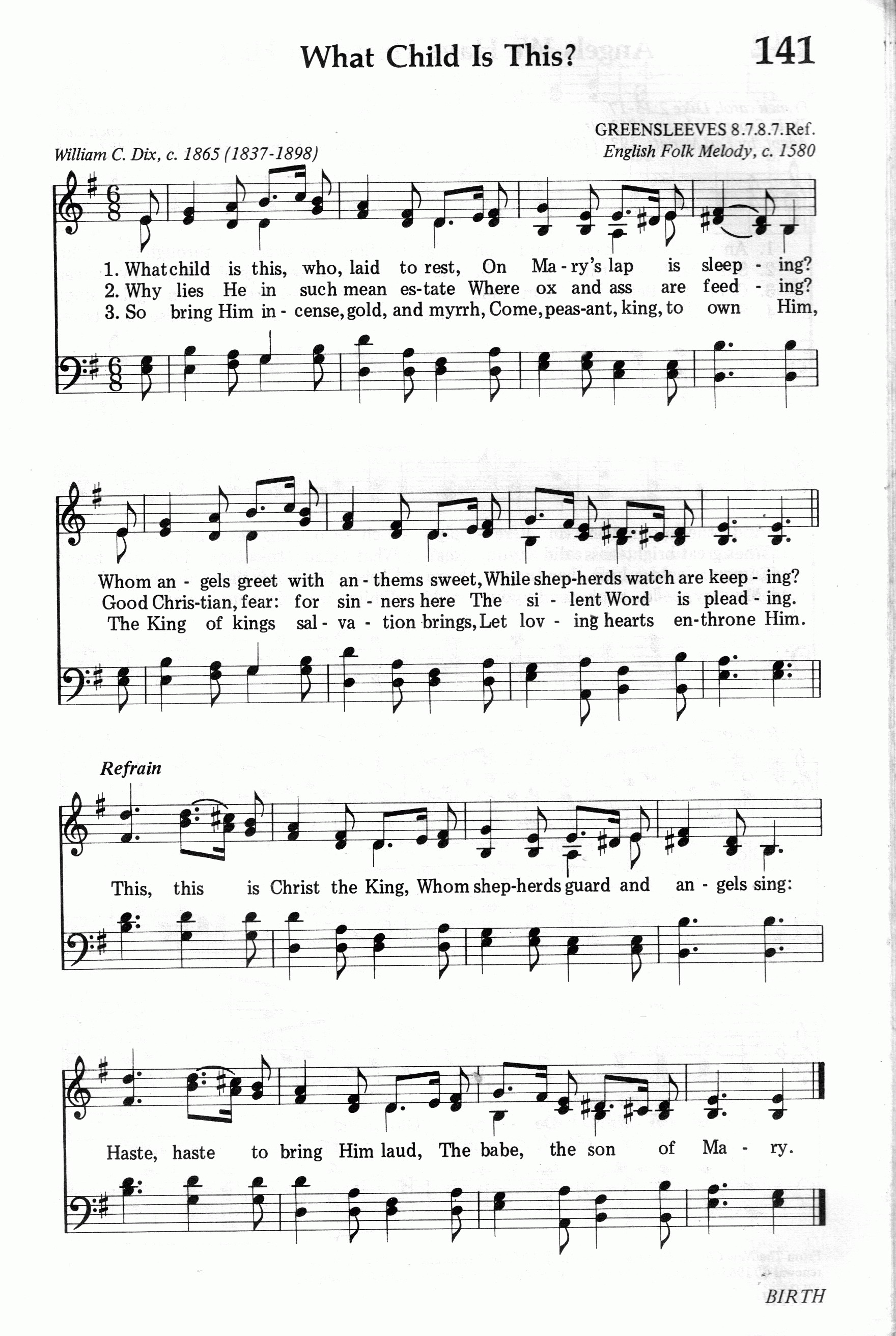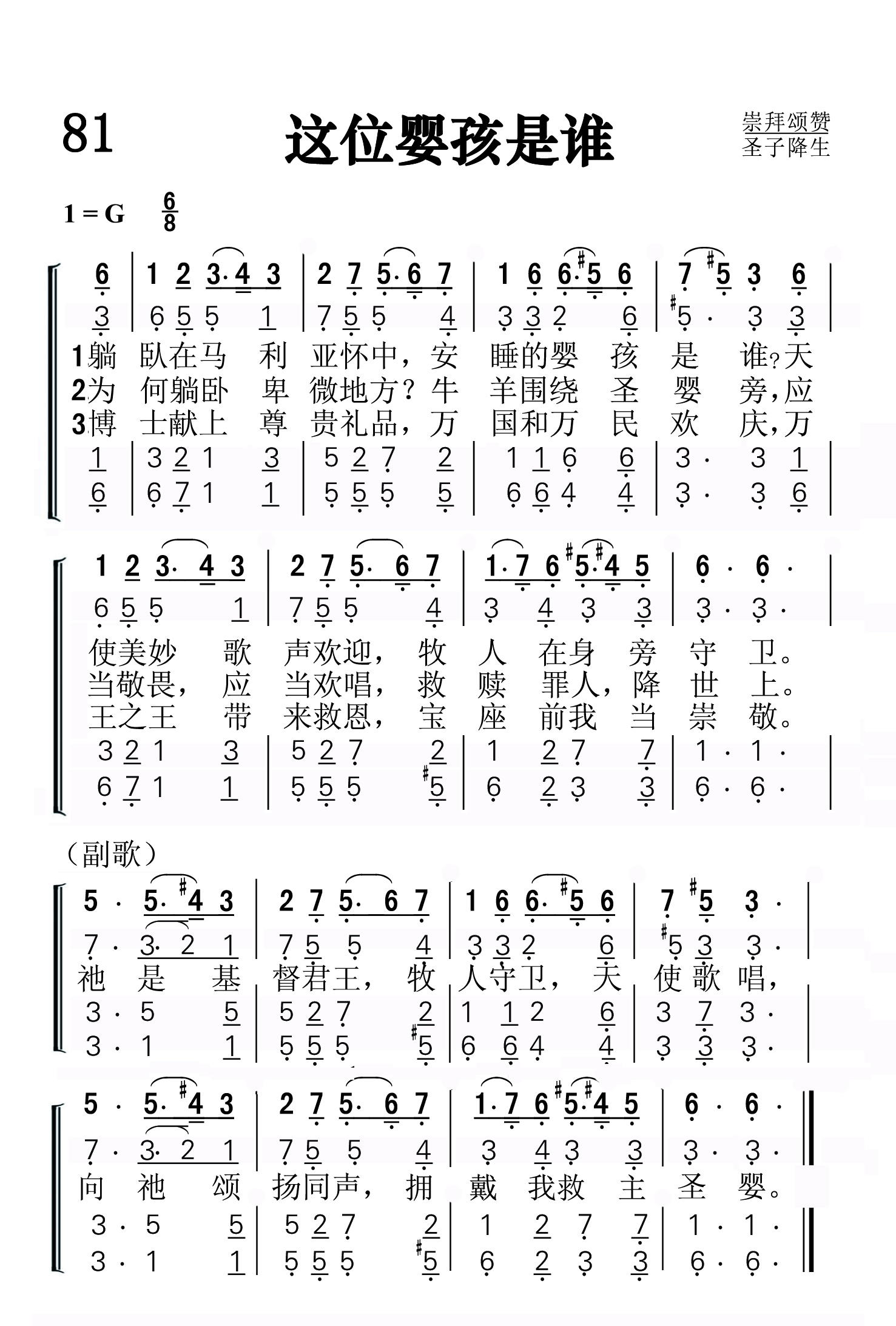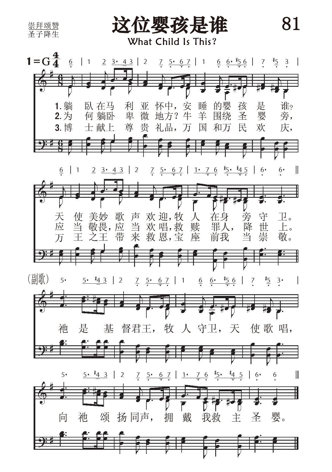 第81首 这位婴孩是谁? What Child is This? (《赞美诗》506版93首) 威廉.迪克斯(William Chafferton Dix,1837-1898)作词(1865年);英国传统圣诞歌曲(1580年) 躺臥在马利亚怀中,安睡的婴孩是谁 天使美妙歌声欢迎,牧人在身旁守卫。 为何祂睡在马槽中,陪伴的是众马牛 好信徒当虔诚敬畏,默然为同胞祈求。 博士献上尊贵礼品,万国和万民欢庆, 万王之王带来救恩,宝座前我当崇敬。 祂是基督君王,牧人守卫,天使歌唱, 向祂颂扬同声, 拥戴我救主圣婴。 词作者威廉.迪克斯出生于英国布里斯托尔。他和他的父亲都是外科大夫。他年轻时曾在布里斯托尔文法学校受教育,精通希腊文和埃塞俄比亚文。他曾打算把圣书译成埃塞俄比亚语。他自己也曾创作、翻译、出版过一些诗。1865年,他得了一场大病,病中他父亲照顾他,他读了太2:1-12和路2:11-16,受感写下了这首诗,并予以发表。他还曾在一家保险公司工作,担任过一家水运保险公司的总经理。这首诗原来的题目是《卑微的宝座》,后改名为《这位奇妙婴孩是谁?》 曲谱原名《绿袖子》。是第6世纪伦敦讨乞的人所唱的歌,莎士比亚在《温莎的风流娘儿们》一剧中曾提及此曲。从1642年起,这首曲就被人填上了圣诞的内容而成了圣诞歌曲。诗歌配上了迪克斯的词以后,英国著名音乐家斯坦那(John Stainer,1840-1901)又为它配上和声,使之更加完美。