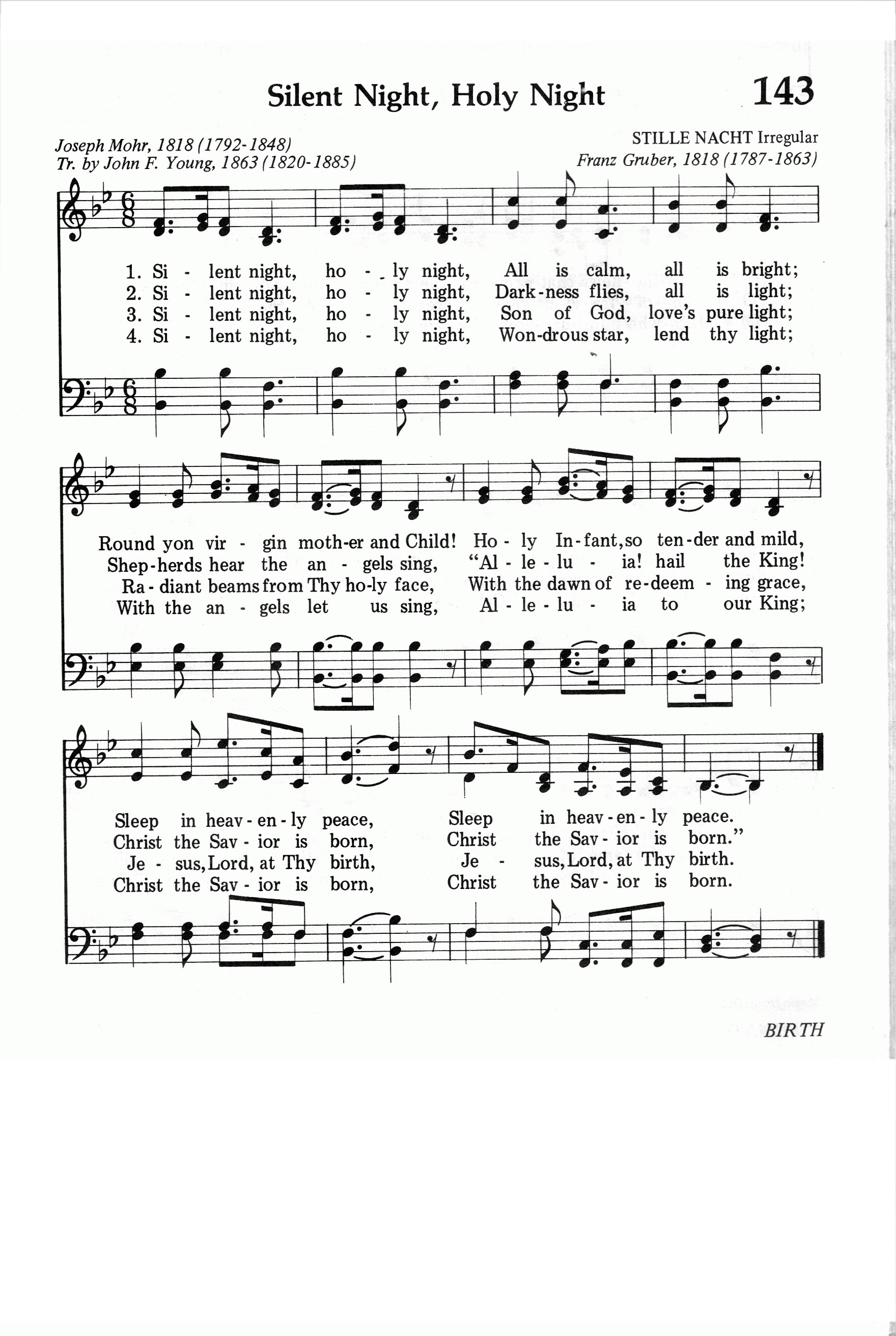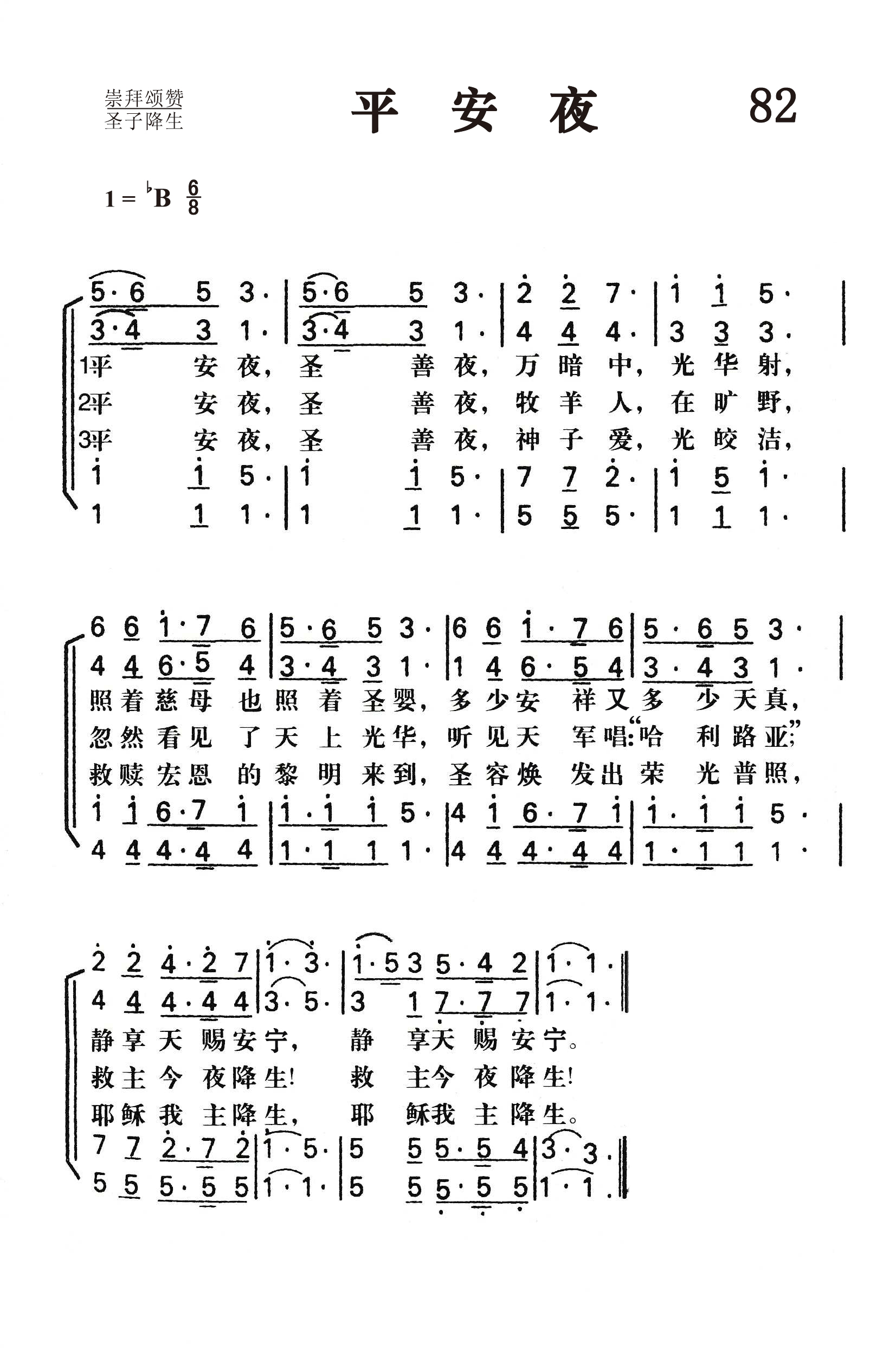 第82首平安夜 Silent Night,Holy Night 穆尔(J.Mohr,1792,12,11-1848,12,4)作词(1818年),格吕伯(F.Gruber,1787,11,25-1863,6,7)作曲(1818年),刘廷芳译(1933年)。 平安夜 ,圣善夜, 万暗中 ,光华射, 照着慈母也照着圣婴, 多少安祥也多少天真, 静享天赐安宁, 静享天赐安宁。 平安夜, 圣善夜, 牧羊人 ,在旷野, 忽然看见了天上光华, 听见天军唱:“哈利路亚”; 救主今夜降生! 救主今夜降生! 平安夜, 圣善夜, 神子爱 ,光皎洁; 救赎宏恩的黎明来到, 圣荣焕发出荣光普照, 耶稣我主降生。 耶稣我主降生。 《平安夜》是最负盛名的圣诞歌曲。其八六拍子的优美旋律,既有摇篮曲的特点,又有圆舞曲的风格,给千万人带来平静的心情。它仿佛在告诉人们:人间的一切都应是美丽圣洁的,人与人之间的关系应该是善良和谐的。 词作者约瑟夫. 穆尔是音乐家莫扎特的同乡,出生在奥地利的萨尔斯堡,童年时是一个活泼的儿童合唱团的团员,1815年受封为罗马天主教神父。 1818年圣诞节前夕,在奥地利的阿尔卑斯山谷中,有一座新建的小教堂。 新到任的穆尔独坐在教堂内,想到圣诞节来临,教堂的风琴却坏了,不能在午夜弥撒时,演奏原定的圣诞音乐,因此他必需写下合适的诗歌作庆典之用。 那天下午,他跋踄山谷探访一个工人家庭,他们新生一婴孩,看到他们贫穷的家境,使他联想到救主的诞生。 深夜他疲惫地独坐在教堂,远眺窗外,白雪皑皑晖映山壁,从悠静的夜景中,他似乎看到当年救主降世的情景,于是他振笔疾书写下了《平安夜》。 翌晨,穆尔就兴冲冲地去找他的好友格吕伯。格吕伯是当地小学的校长,也是教堂的风琴师。 他看了诗后,不禁欢呼:“这正是我们一直想要的圣诞诗,愿我们的上帝受赞美!” 立刻他脑中涌出了一个美妙的旋律来配合这诗,他们兴奋地练习着,格罗伯用吉他来伴奏,当晚他们的合唱深深地感动了会众。 数月后,邻村的乐师前来修理风琴,修毕请格吕伯试音,格吕伯就奏《平安夜》,乐师为美妙的音乐感动,央求格吕伯给他一份抄本。 他带回家乡后,把它当作民谣教孩童们唱。 在那村中有一个做手套的商人,他有四个女儿都具有优美的歌喉,常随她们父亲销售手套四处演唱,渐成名为四重唱(Strasser Quartet)。 有一次她们被邀请至德王御前献唱,德王腓烈四世听到《平安夜》后,大受感动,他命令全国,今后庆祝圣诞时,都要把《平安夜》放在第一首;他又想找作者,但无人知晓,于是他派宫廷诗班长查访。 诗班长到各地图书馆查考,并向音乐家探询,经年累月都不得要领。 多年后,有一天诗班长路过萨尔斯堡时,听到一只鹦鹉在唱《平安夜》,觉得奇怪,后来想到附近有一座小教堂,鹦鹉该是从那儿听到学会的,于是追踪而去,找到了格吕伯,但此时穆尔业已逝世。 这首诗歌柔美流畅,通俗易懂,很传遍了整个欧洲,美洲以及全世界,翻译成一百多种文字。虽然56岁的穆尔去世时一贫如洗,但190年以来,这首诗歌所讲述的神圣之爱,传报了从天而来的平安,温暖了无数疲惫贫寒者的心灵。