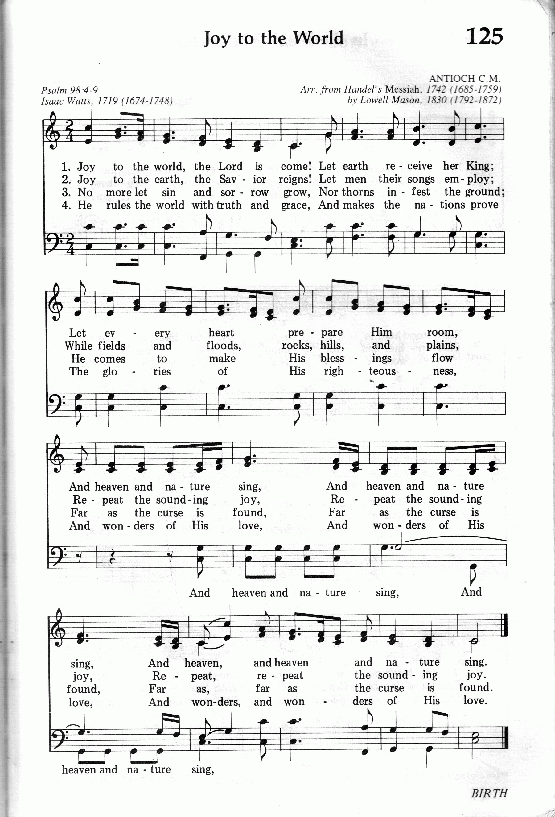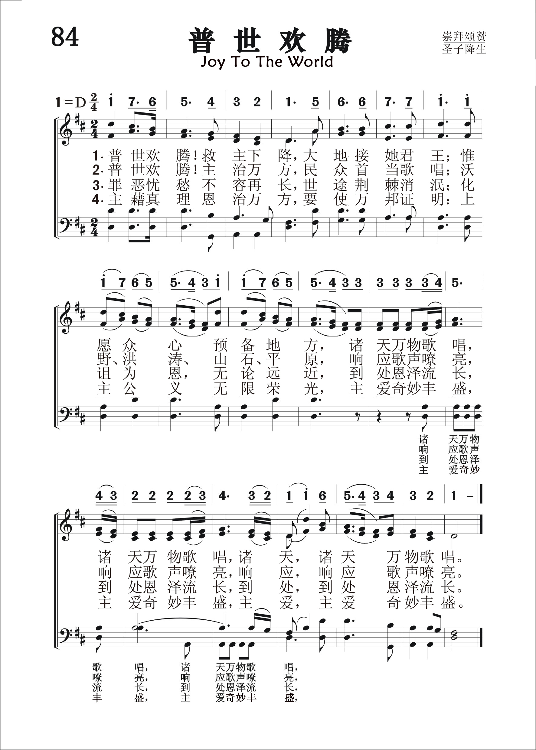 第84首普世欢腾 Joy to the World 瓦茨(Isaac Watts, 1674-1748)作词(1719年),亨德尔(Geoge .F .Handel,1685,2,23-1759,4,14)作曲(1742),梅森(见第58首介绍)改编(1830),刘廷芳译(1934年) 普世欢腾!救主下降, 大地接她君王; 惟愿众心预备地方, 诸天万物歌唱, 诸天万物歌唱。 诸天,诸天万物歌唱 普世欢腾!主治万方, 民众首当歌唱, 沃野、洪涛、山石、平原, 响应歌声嘹亮, 响应歌声嘹亮。 响应,响应歌声嘹亮。 主藉真理恩治万方, 要使万邦证明: 上主公义无限荣光, 主爱奇妙丰盛, 主爱奇妙丰盛, 主爱,主爱奇妙丰盛。 词作者瓦茨出生于英国独立教会一位执事的家庭。当时不属国教的信徒横遭迫害,瓦茨的父亲曾因此被捕入狱,但他们全家人都信仰坚定,刚强不屈。母亲常抱着小瓦茨去探监。由于家境贫困,营养不足,小瓦茨从小身体虚弱,身体矮小。及至长大无钱上学。曾有人愿出资供他上学,但以毕业后要在国教内任圣职为条件,遭到他父子的坚决拒绝,毅然决定自己到伦敦私立学校半工半读。 瓦茨从小就表现出文学方面的才华。18岁那年他从伦敦学校回家度暑假,在参加礼拜后,他指出所唱诗篇实在平淡乏味。担任该堂执事的父亲对他说:“青年人,你不要消极地指责和批评。你说不好,请你写点好的给我们吧!”他接受了这个挑战,回家后就根据《启示录》第5章写了一首八节的长诗,题为《颂赞被杀的羔羊》,下周带到教会,让信徒群众试唱,受到他们热烈的欢迎。他们要求他继续写下去。于是他几乎每周都写一首,到他21岁时便积累了一百多首,先后出版了好几本圣诗集,其中以1707年问世的《圣诗与灵歌》和1719年出版的《以新约的言语仿写大卫的诗篇》,最为脍炙人口。这些以旧约的诗篇为依据所写的具有福音特点的现代圣诗,为教会的崇拜增色不少。 瓦茨虽然很有才华,但为人和蔼可亲,平易近人,通情达理。他一生健康欠佳, 却坚持登台讲道,诲人不倦。 瓦茨在1712年因身体不佳,就接受了伦敦阿布尼爵士夫妇的邀请,到他家别墅休养。原定做客一星期,谁知一住就是36年,直到去世。瓦茨的许多诗文是在这个别墅内写成的。除写圣诗以外,瓦茨还将《诗篇》译为韵诗,且着《逻辑学》一书,英国牛津大学曾选作课本。1728年爱丁堡大学授予他荣誉博士学位;他的名字被列入《英国诗人传》之中。他去世后,英国威斯敏斯特教堂特为他立了一个纪念碑。 瓦茨一生写诗600余首,在当时是一个最高记录,难得的是至今仍有许多为人传诵不衰。 瓦茨以他丰富多彩的圣诗创作,一扫当时英国教会的消沉气氛,振奋信徒群众的崇拜精神。他冲出原有的局限,更加全面深刻地领会圣书的内涵,写出了庄严雄伟的新歌,为基督教圣诗开辟了一条康庄大道。《普世欢腾》是他的代表作;他以新约的语言,仿写旧约的诗篇。他根据诗篇第98篇1、3、6等节写成第一节、第二节,然后加上一段基督教的福音信息“化诅为恩,无远弗届,到处主泽流长。”以后又回到诗篇第98篇第9节。“因为祂来,要审判遍地。祂要按公义审判世界,按公正审判万民。” 这首诗充分表达了救主以真理和恩惠统治世界的思想,原来的题目是《弥赛亚的来临及其国度》。 曲调名为《安提阿(ANTIOCH)》,是根据清唱剧《弥赛亚》第17曲《荣耀归主》合唱改编的。在这首合唱曲中,亨德尔所谱写天使的歌声,成了《普世欢腾》的第一句旋律,而“诸天万物歌唱”一句,则是描述“地上平安人蒙恩”,梅森根据这首合唱曲主题,编写成一首新的圣诞欢歌。 德国音乐大师亨德尔同时也是一位伟大的宗教音乐作曲家。他是虔诚的基督徒,自幼就表现出音乐天赋。其父不愿他学习音乐,要他学习法律,他为了尊重父亲就学了法律。但法律这门学问对他没有什么影响。他还是以音乐创作作为自己终生的事业。他写歌剧35年,后转而创作圣乐,写下了浩如烟海的宗教音乐,包括以圣书故事为蓝本的清唱剧《复活》,《以斯帖》,《底波拉》,《扫罗》,《以色列人在埃及》,《参孙》,《约瑟和他的兄弟们》,《所罗门》和《耶弗他》等。其中最著名的是他于1741年用24天写成的《弥赛亚》。他写的受难曲有《约翰受难曲》、《耶稣为世人罪孽受苦而死》;还有许多感恩颂和赞美诗。1752年他双目失明,但继续与人合作进行创作。1759年4月6日,他亲自最后一次在伦敦参加《弥赛亚》的公演。同月14日他歇下了自己的劳苦,被安葬在威斯敏斯特大教堂诗人墓地。 《颂赞诗歌》107首《荣耀归基督》,《赞美诗》(505版)第18首《天下万民》和107《我愿有口万千》也是亨德尔作曲的。 圣乐音乐家梅森出生于美国马萨诸塞州的梅德菲尔德。幼年在校时就喜欢音乐,16岁时已成了乡村教堂唱诗的指挥。1812年迁居乔治亚州,在一家银行当办事员,同时在长老会礼拜堂任管风琴师及唱诗班指挥,并开始学习和声学和作曲。他自编了一本《圣乐曲调集》,送到好几家印刷长和出版社去,虽然讲明不要稿费,也没有一家肯承印。后经波士顿亨德尔.海顿音乐社出资代印,结果销路之广,出人意料,大大鼓舞了梅森,使他决定以音乐为他的终生事业。1827年他迁居波士顿,当选为亨德尔及海顿学会主席,并任教堂唱诗班指挥十四年。1829年编辑出版了第一本《儿童赞美诗》。他为了培养训练儿童唱诗,创办成立波士顿音乐学院,专门训练儿童唱歌。1834年又在音乐学院内成立了培训儿童音乐的教师培训班。他还负责