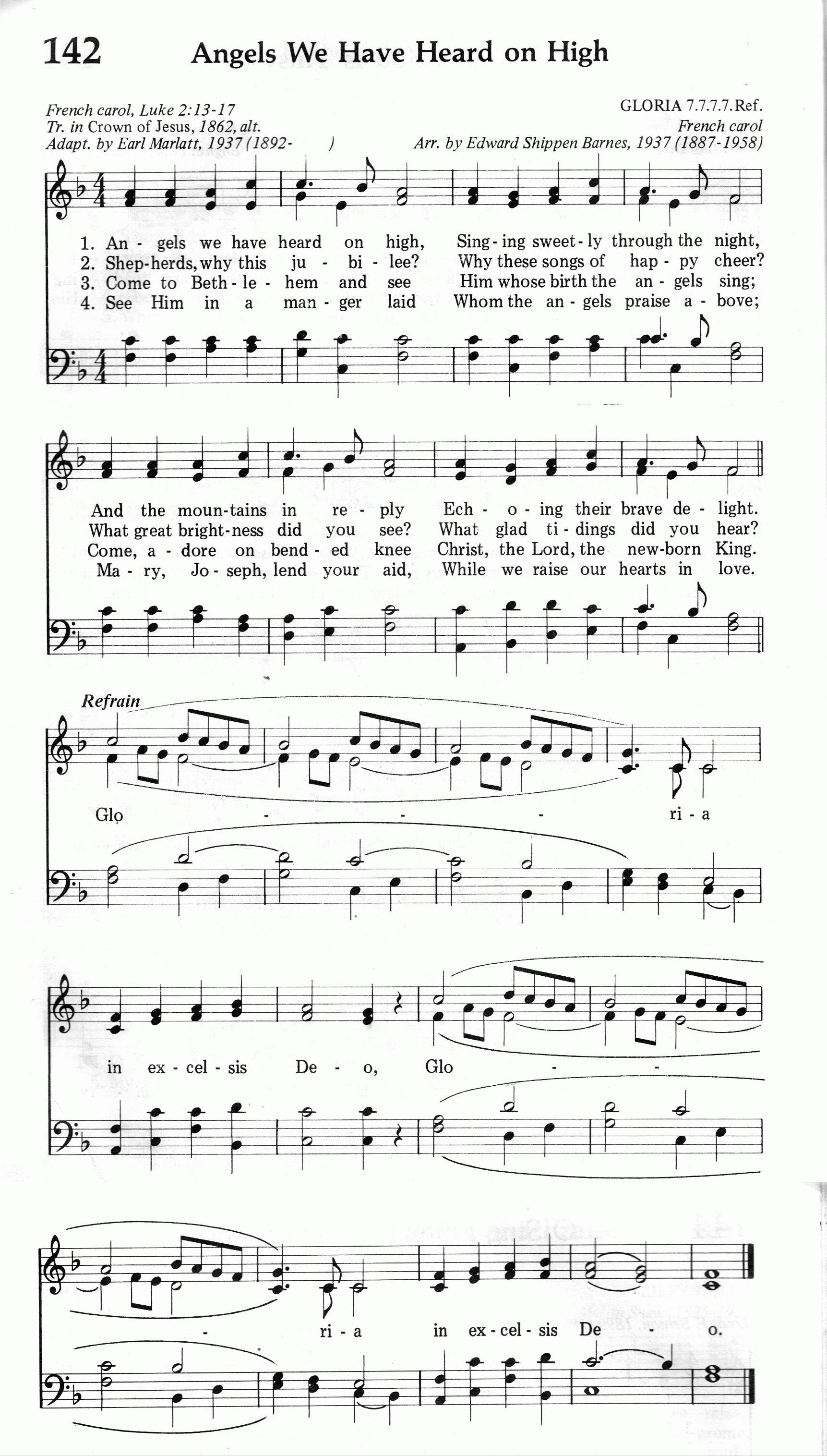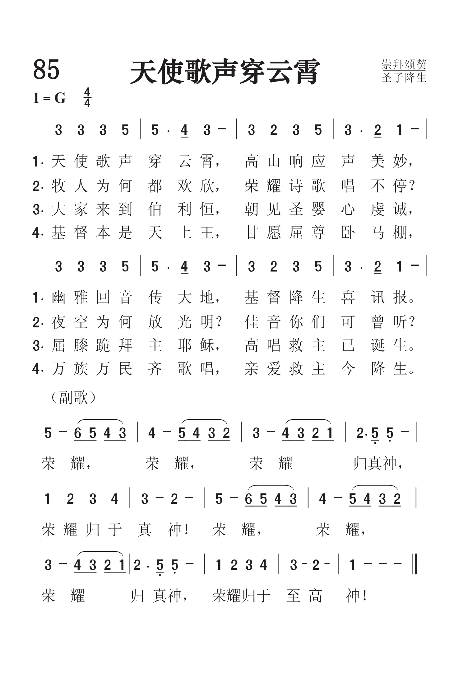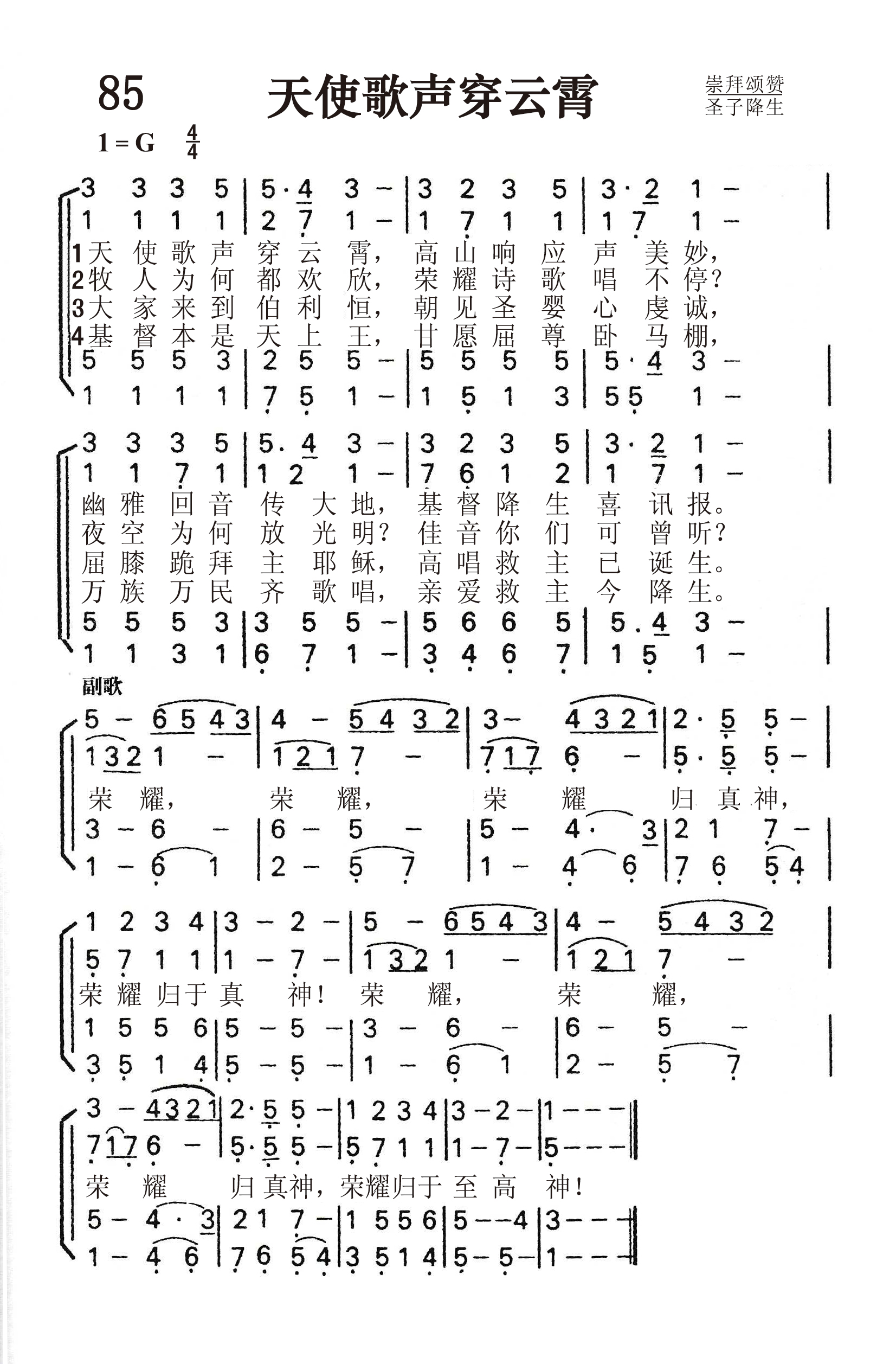 第85首 天使歌声穿云霄 Angels We Have Heard on High 法国圣诞民歌,杨旅复译(1982年) 天使歌声穿云霄,高山响应声美妙, 幽暗回音传大地,基督降生喜讯报。 牧人为何都欢欣,荣耀诗歌唱不停? 夜空为何放光明?佳音你们可曾听? 大家来到伯利恒,朝见圣婴心虔诚, 屈膝跪拜主耶稣,高唱救主已诞生。 荣耀, 荣耀 ,荣耀归真神, 荣耀归于真神! 荣耀 ,荣耀 ,荣耀归真神! 荣耀归于至高神! 这是一首古老的法国圣诞歌曲,是法语和拉丁语的混合诗。原词作者佚名。英译者是查德威克(J.Chdwick,1813-1882)。为本诗曲调配和声的巴纳斯(E.S.Barnes,1887-1958)毕业于耶鲁大学,又在巴黎向着名的音乐家丹第(V.D’Indy)学习作曲。他曾在美国纽约和加州的长老会教堂担任管风琴师,唱诗班指挥,写过许多宗教音乐。 本诗的汉译者杨旅复是我国基督教界资深的圣乐专家、蔡文浩牧师的夫人。1916年生,1937年从苏州景海女子学校音乐专业毕业,1945 年毕业于上海沪江大学社会系,后曾去美国威士明特合唱音乐学院 进修。几十年来她除了在不少学校内担任音乐教师外,一贯努力推进圣乐的工作,曾任中国基督教协进会的音乐干事。她在上海、杭州曾担任教会唱诗班指挥。1981年中国基督教圣诗委员会成立时,她应邀担任委员,并任《新编》编辑委员会委员。1984年浙江神学院开办起,杨旅复一直担任教会音乐课,培养了许多教会圣乐人才。杨旅复在音乐方面是一个多面手,能弹琴、指挥、作词、作曲、翻译圣诗。《赞美诗(新编)》收入她所创作的六首诗歌,如《学做好牧人》、《复活喜讯歌》等。