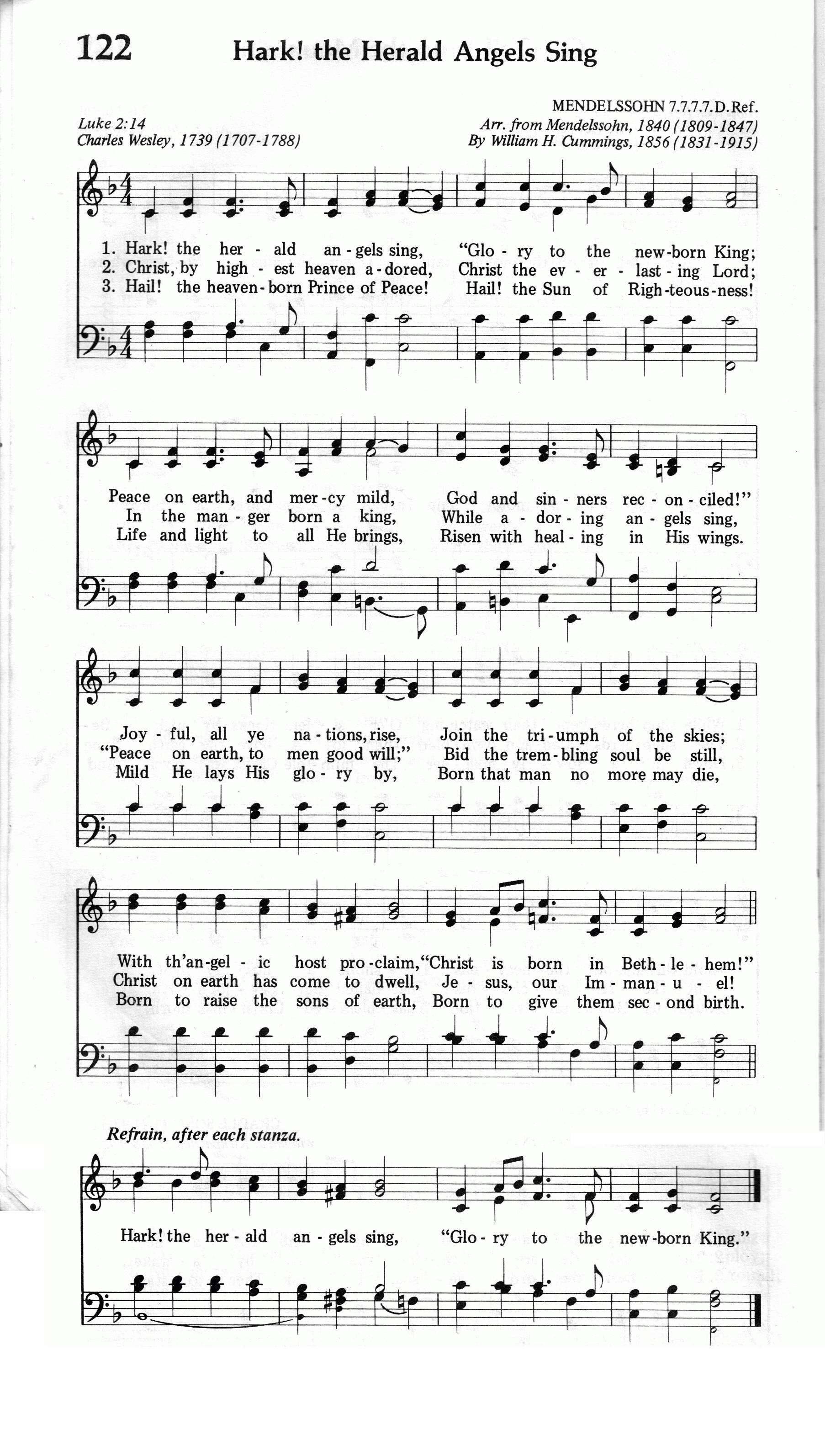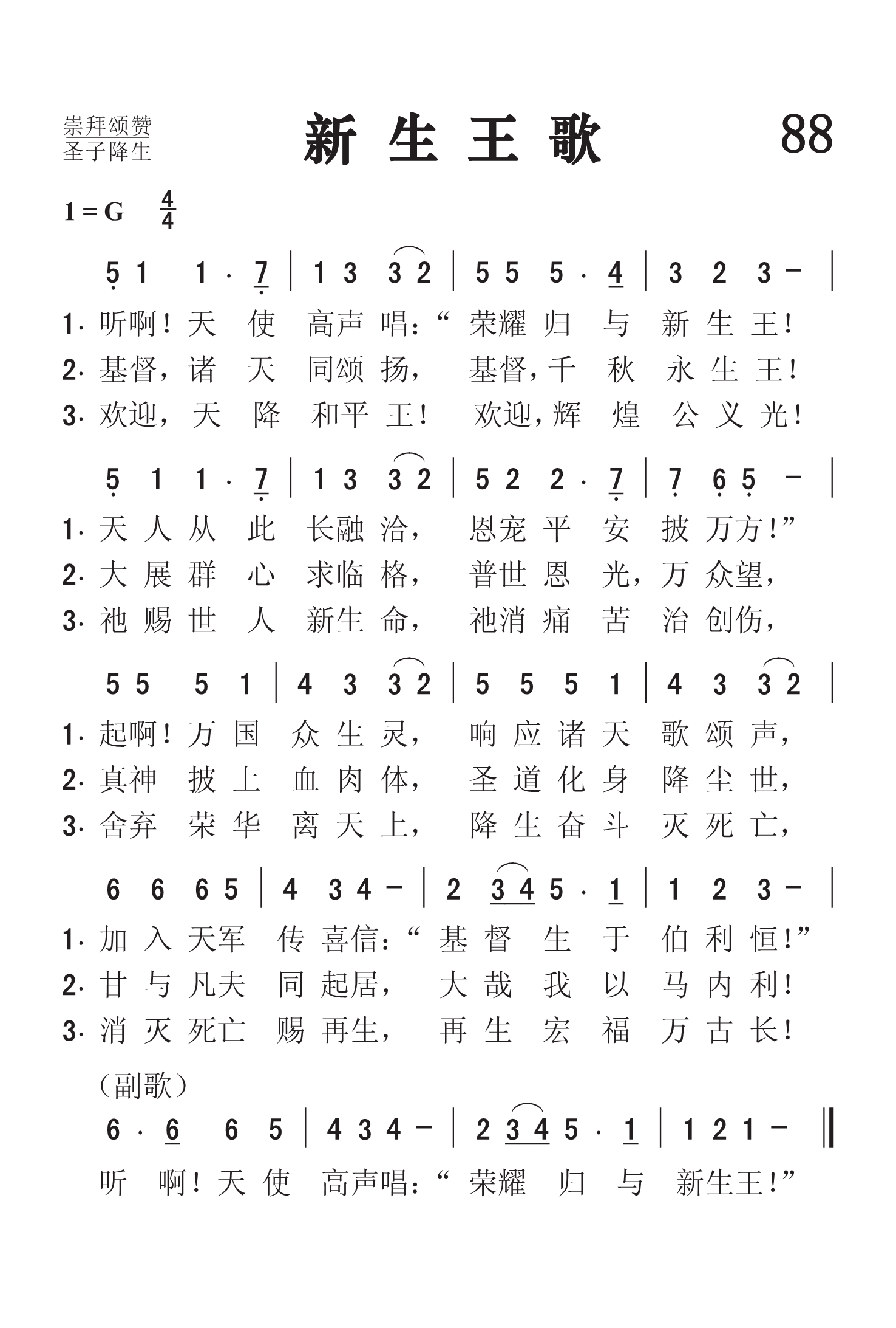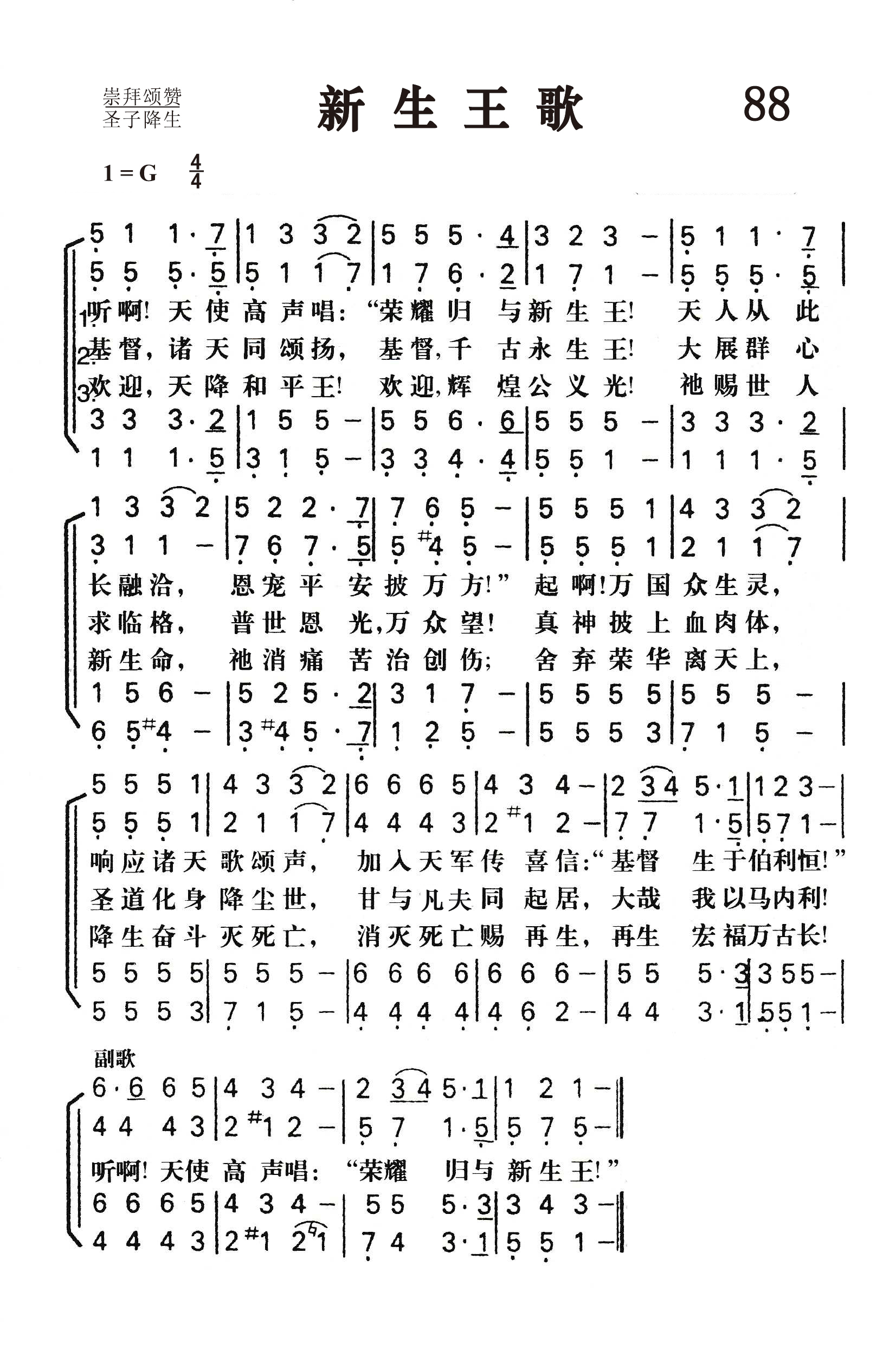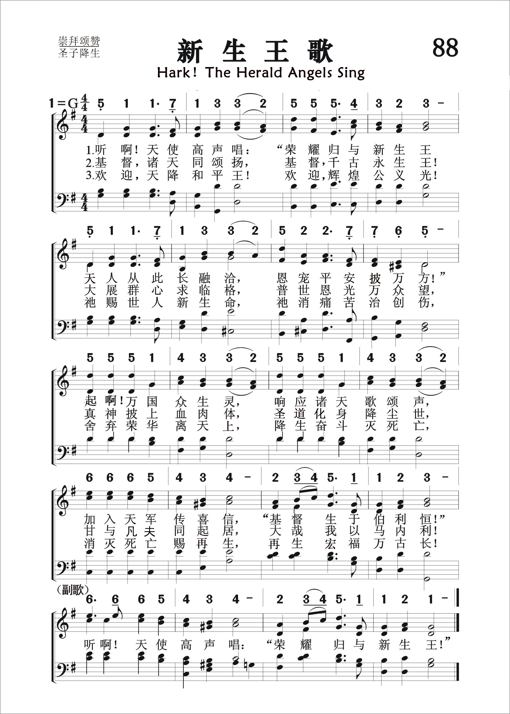 第88首新生王歌 Hark!The Herald Angels Sing 查理.卫斯利(见第51首介绍)作词(1839年),门德尔松(F.Mendelssohn,1809-1847)作曲(1840年),康明斯(William H.Cummings)改编(1850年),刘廷芳译(1930年) 听啊!天使高声唱:“荣耀归于新生王! 天人从此长融洽,恩宠平安披万方!” 起啊!万国众生灵,响应诸天歌颂声, 加入天军传喜讯:“基督生于伯利恒!” 基督,诸天同颂扬,基督,千古永生王! 大展群心求临格,普世恩光万众望, 真神披上血肉体,圣道化身降尘世, 甘与凡夫同起居,大哉我以马内利! 欢迎,天降和平王!欢迎,辉煌公义光! 祂赐世人新生命,祂消痛苦治创伤, 舍弃荣华离天上。降生奋斗灭死亡, 消灭死亡赐再生,再生洪福万古长! 听啊!天使高声唱:“荣耀归于新生王”。 这是一首家喻户晓的圣诞诗歌,词句优美,含义深刻。原诗共有十节,现在普遍采用的是三节。第一节歌颂神人和好,第二节赞美道成肉身,第三节欢呼和平之君、公义的太阳。 本诗曾有过好几个曲调。直到1855年,才普遍采用德国伟大的作曲家门德尔松所谱的曲。 门德尔松是犹太籍的基督徒,是一位与贝多芬,莫扎特,海顿等平名的音乐大师,38岁就英年早逝。他12岁就创作一首钢琴四重奏;20岁就组织演出几乎被人遗忘的巴赫作品《马太受难曲》。他一生写过许多宗教音乐,最著名的有清唱剧《伊莱贾》,《圣保罗》和《耶稣基督》(未完成)。这首《新生王歌》是门德尔松为印刷术发明400周年而写的《颂歌》(作品第68号)中第二乐章的主题,原为男声合唱,由铜管乐队伴奏。 《颂赞诗歌》502首《常住爱中》,570首《小鸟啼鸣》,《赞美诗》(506版)499首《全能圣天父》也是门德尔松作曲的。