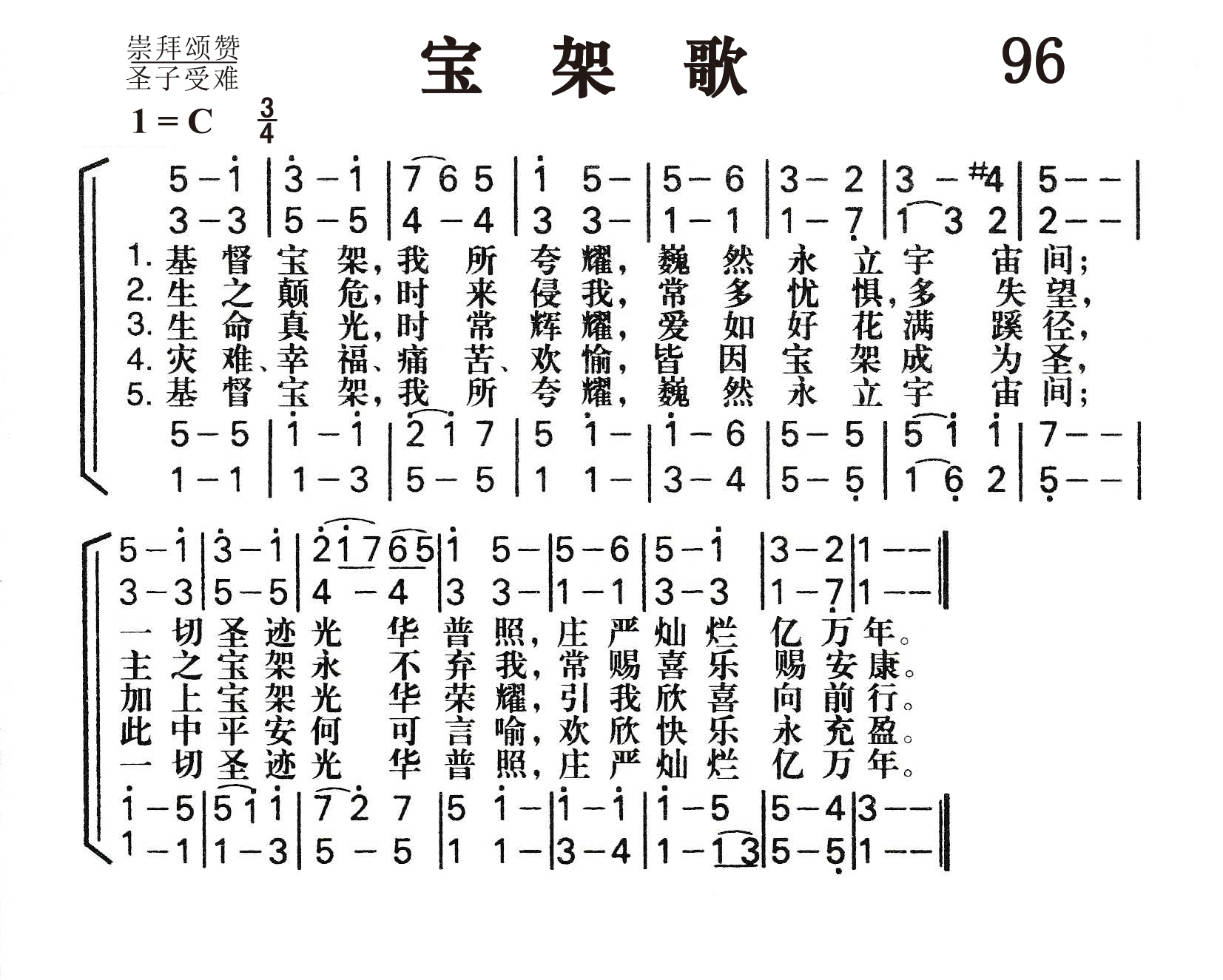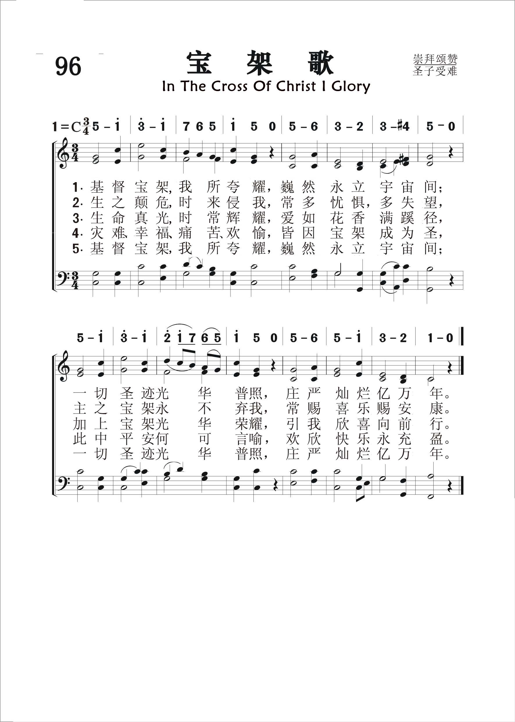 第96首宝架歌 In the Cross of Christ I Glory 鲍林(J.Bowring,1792,10,17-1872,11,23)作词(1825年),康基(I.Conkey,1815,5,5-1867,4,30)作曲(1851年),赵紫宸(1888-1979)译(1931年) 基督宝架,我所夸耀,巍然永立宇宙间; 一切圣迹光华普照,庄严灿烂亿万年。 生之巅危,时来侵我,常多忧惧,多失望, 主之宝架永不弃我,常赐喜乐赐安康。 生命真光,时常辉耀,爱如好花满蹊径, 加上宝架光华荣耀,引我欣喜向前行。 灾难、幸福、痛苦、欢愉,皆因宝架成为圣, 此中平安何可言喻,欢欣快乐永充盈。 词作者鲍林是一位多才多艺的英国人。他具有非凡的语言天赋,精通多国文字,曾把22种语言的著作翻译成英语,出版36卷以上的书籍。他长期担任外交官员,派驻国外任职。1849年任英国驻广州领事,驻华商务监督;1854年任香港总督和和驻华公使。 鲍林创作过不少诗歌,包括这首著名的《宝架歌》。据传本诗是作者在澳门访问时,看到被火焚烧的圣保罗教堂,房顶的十字架却仍巍然屹立,联想到主耶稣的十字架,有感而写的。 曲作者康基是美国浸信会教堂的管风琴诗和唱诗班指挥,又是男低音歌手。1861年起,他领导一个四重唱小组到各地巡回献唱。本曲写于基督受难周,调名《拉斯本(Rathbun)》,是为了纪念一位不畏风雨坚持到堂献唱的女高音拉斯本夫人。 译者赵紫宸是中国著名的神学家和诗人。他出生于浙江省德清县的一个小商人家庭,1907年受洗加入基督教监哩会,在苏州东吴大学毕业后赴美留学。回国后到母校教授社会学。1625-1951年,任燕京大学宗教学院院长兼牧师。1947年获美国普林斯顿大学荣誉于神学博士学位。1948年当选为世界基督教协进会六主席之一。他对基督教神学,西方哲学和中国古典文学都有很深的造诣,曾写下许多具有学术价值的著作,并对赞美诗的中国本土化作出很大的贡献。 《赞美诗》506版第138首《圣灵歌》(1931年),505版第214首《尊主歌》(1931年)和第277首《信靠羔羊》(1931年)也是赵紫宸作词的。