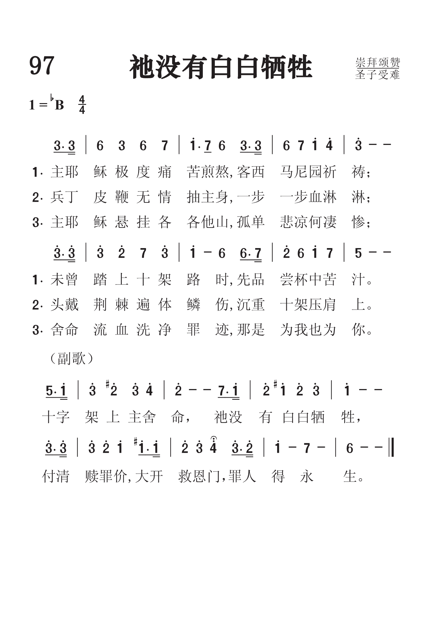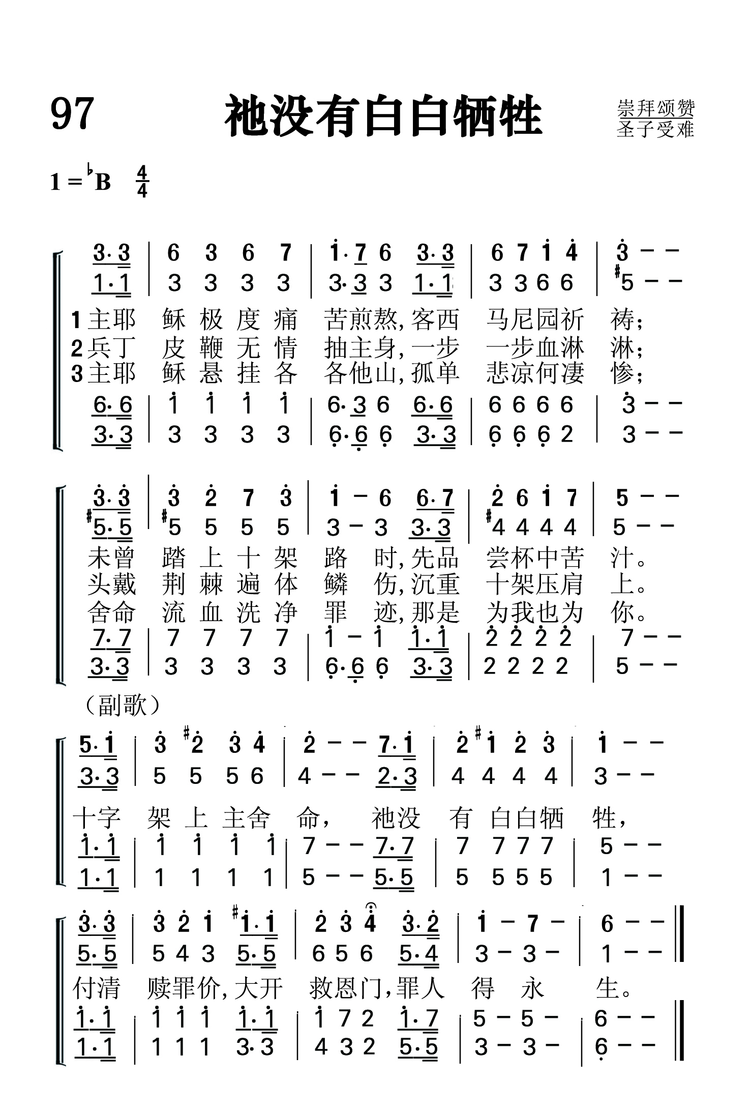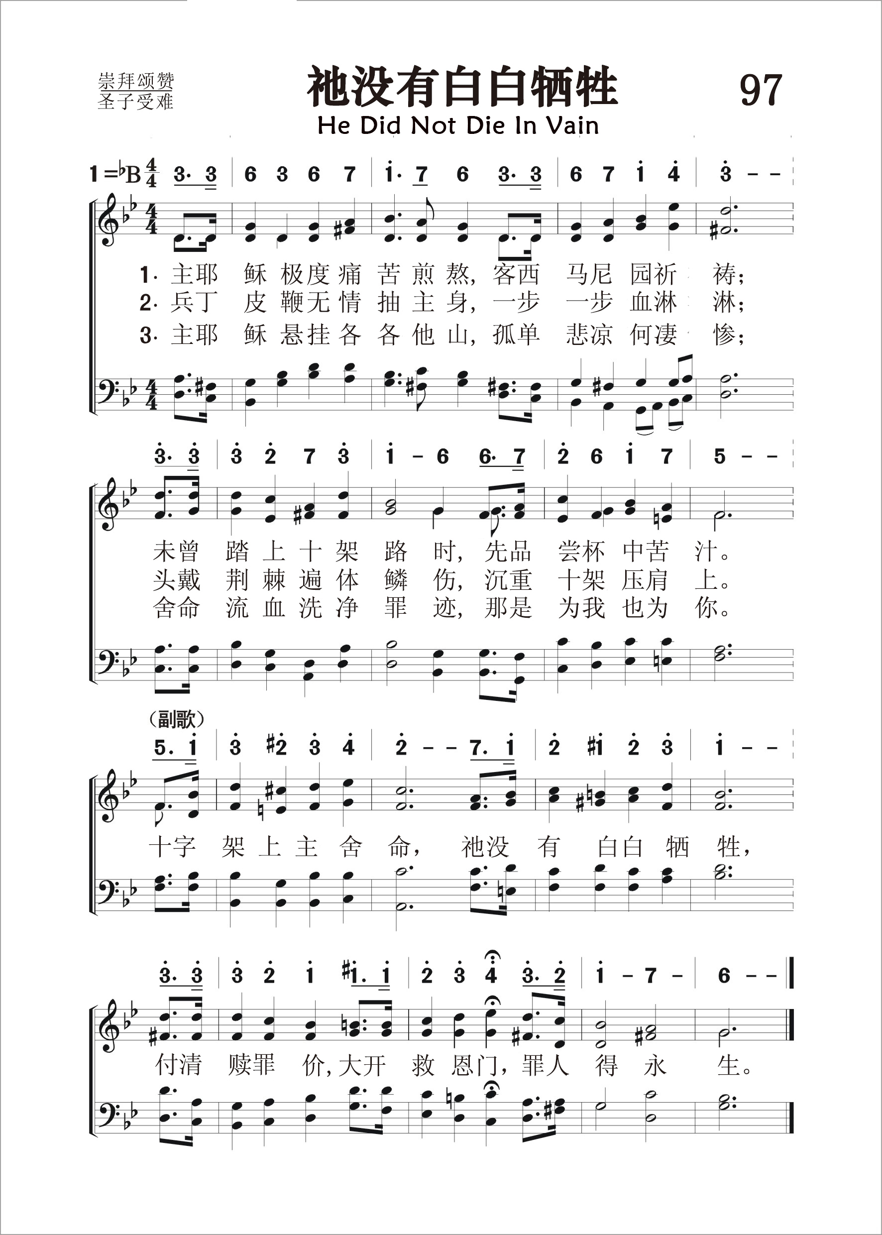 第97首 祂没有白白牺牲 He did not Die in Vain (《颂赞圣诗》85首) 主耶稣极度痛苦煎熬,客西马尼园祈祷; 未曾踏上十架路时,先品尝杯中苦汁。 兵丁皮鞭无情抽主身,一步一步血淋淋; 头戴荆冠遍体鳞伤,沉重十架压肩上。 主耶稣悬挂各各他山,孤单悲凉何凄惨; 舍命流血除净罪迹,那是为我也为你。 十字架上主舍命,祂没有白白牺牲, 付清赎罪价,大开救恩门,罪人得永生。 这首诗歌为我们展示了救主耶稣背负着沉重的十字架,步履蹒跚走向各各他的凄凉画面。祂头戴荆冠,遍体鳞伤,承受了人世间最大的痛苦。然而在凄凉之中仍有光明和希望。救主所受苦受难,将为全世界罪人偿付赎价。撒但的谎言被戳穿了。他丑恶的庐山真面目暴露在整个宇宙之前。十字架敲响了他的丧钟。上帝救赎的大工终必完成。