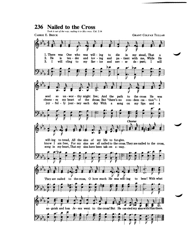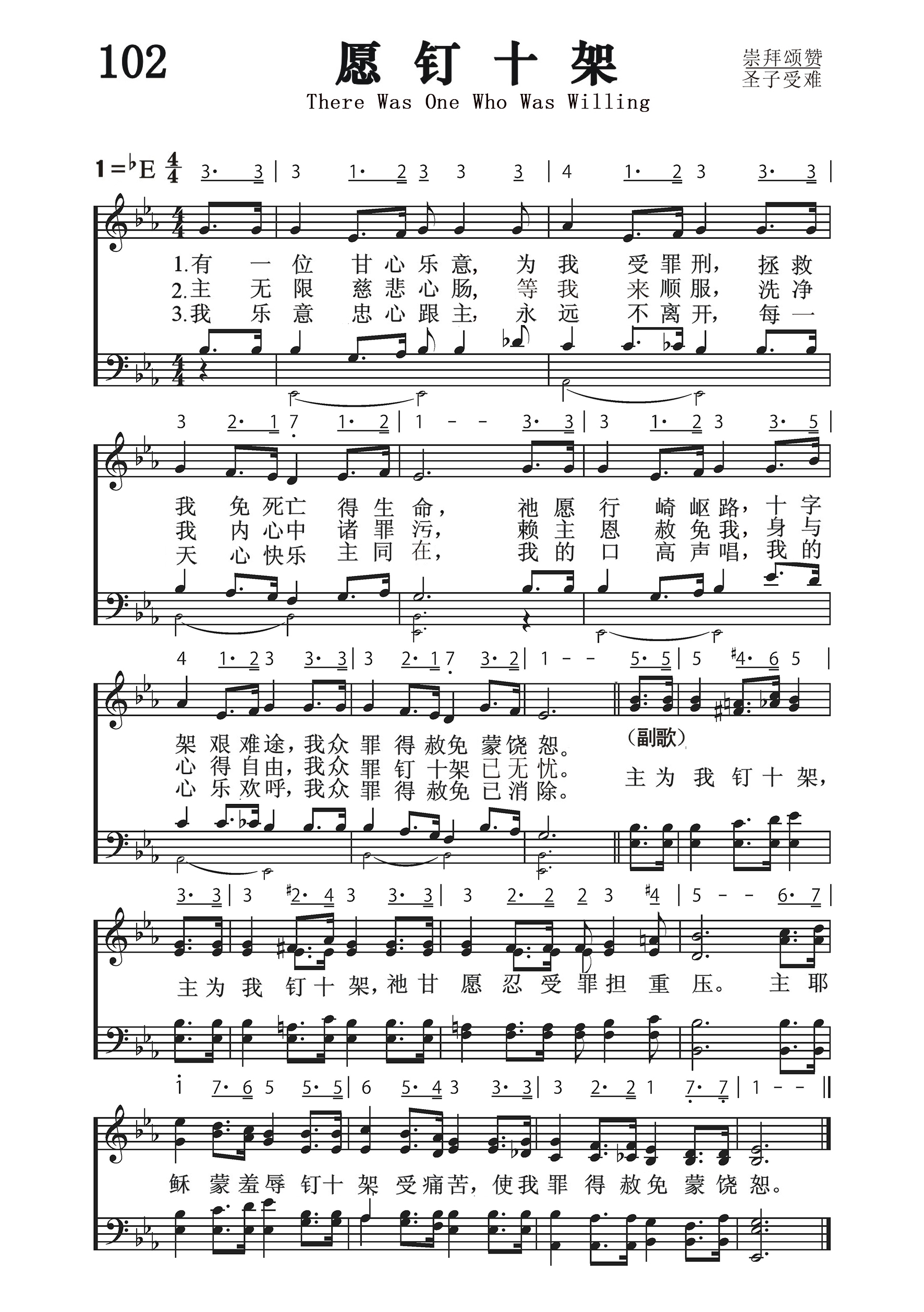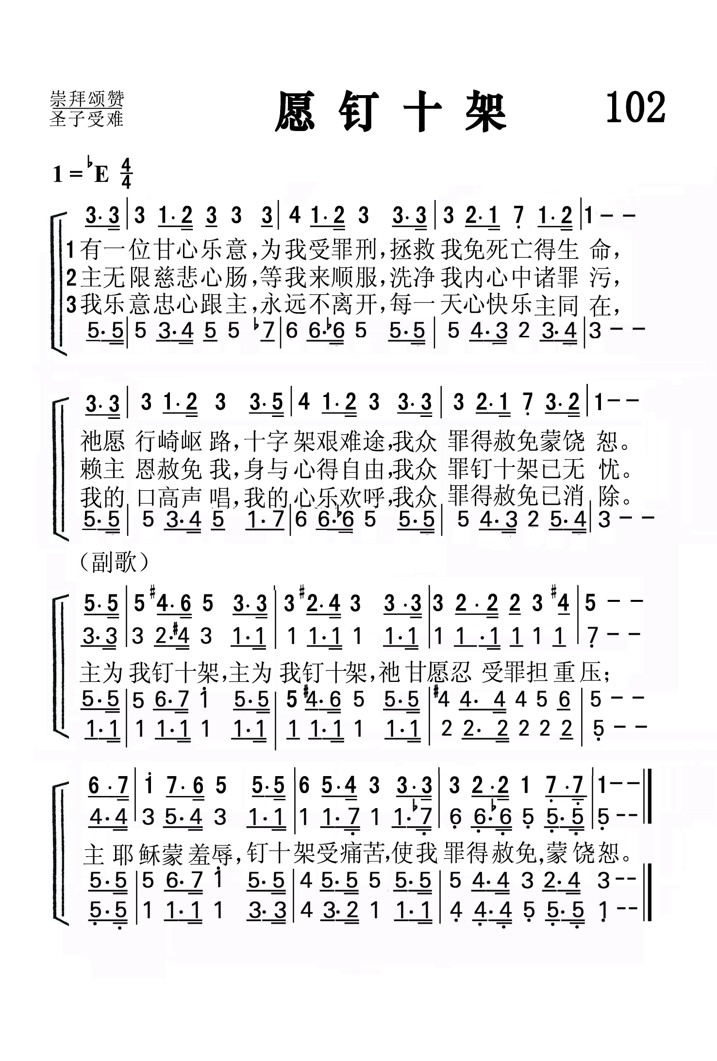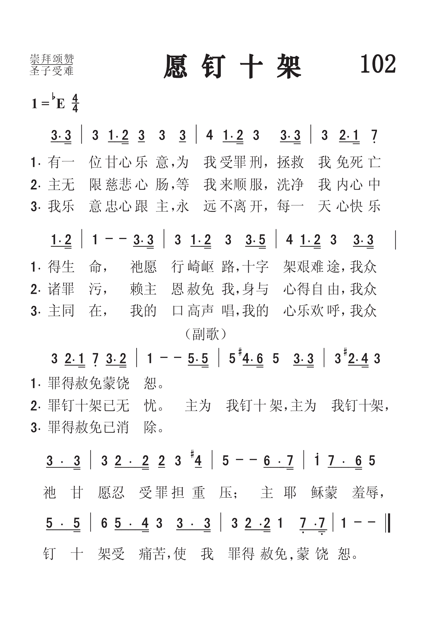 第102首愿钉十架 There Was One Who Was Willing 卡丽.布雷克(Carrie E Breck [Mrs.Frank A Breck],1855,1,22-1934,3,27)作词,图勒(Grant Colfax Tullar,1869,6,5-1950,5,20)作曲 有一位甘心乐意,为我受罪刑, 拯救我免死亡得生命, 祂愿行崎岖路,十字架艰难途 ,我众罪蒙赦免得饶恕。 主无限慈悲心肠,感召我顺服, 洗净我内心中诸罪污, 赖主恩赦免我,身与心得自由 ,我众罪钉十架以无忧。 我乐意忠心跟主,永远不离开,每一天心快乐主同在, 我的口高声唱,我的心乐欢呼,我众罪得赦免已消除。 主为钉十架 ,主为我钉十架, 祂甘愿忍受罪担重压; 主耶稣蒙羞辱,钉十架受痛苦 ,使我罪得赦免蒙饶恕。 词作者布雷克夫人出生于美国佛蒙特州,小时住在新泽西州,后迁至俄勒冈州波特兰市,与她丈夫和五个女儿一起生活。她是长老会虔诚的基督徒,默默无闻地从事家庭主妇的工作,常利用处理家务之瑕创作诗歌。她一共写了将近二千首诗,多数谱成圣诗。 她喜欢即兴作诗,有时在缝纫、有时怀抱着婴儿、有时在做家事,只要有灵感,即刻成诗。这首《愿钉十架》就是她的代表作品之一,是一首感人至深的纪念诗歌。 曲作者图勒牧师出生于美国康涅耿格州托兰县。父亲在战争中受过伤,干不了重活,母亲在他2岁时去世。在这家破人亡之际,他过起了流离的生活。他从十岁起就务工谋生,做过毛织厂工人,鞋店伙计。19岁那年,因参加聚会而接受救恩,获得重生。“旧事已过,都变成新的了”(林后5:17)。他感觉到圣工的呼召,就于20岁就读神学院。二年以后因体力不支而退学,但发现在诗歌方面有特殊的才能,就决定向这一方向发展。以后他先后在美国,加拿大及其它地方讲道,唱诗,辛勤为主工作,直至80高龄去世。 《颂赞诗歌》第229首《面对面》和491首《前进》也是布雷克夫人作词,图勒作曲的。