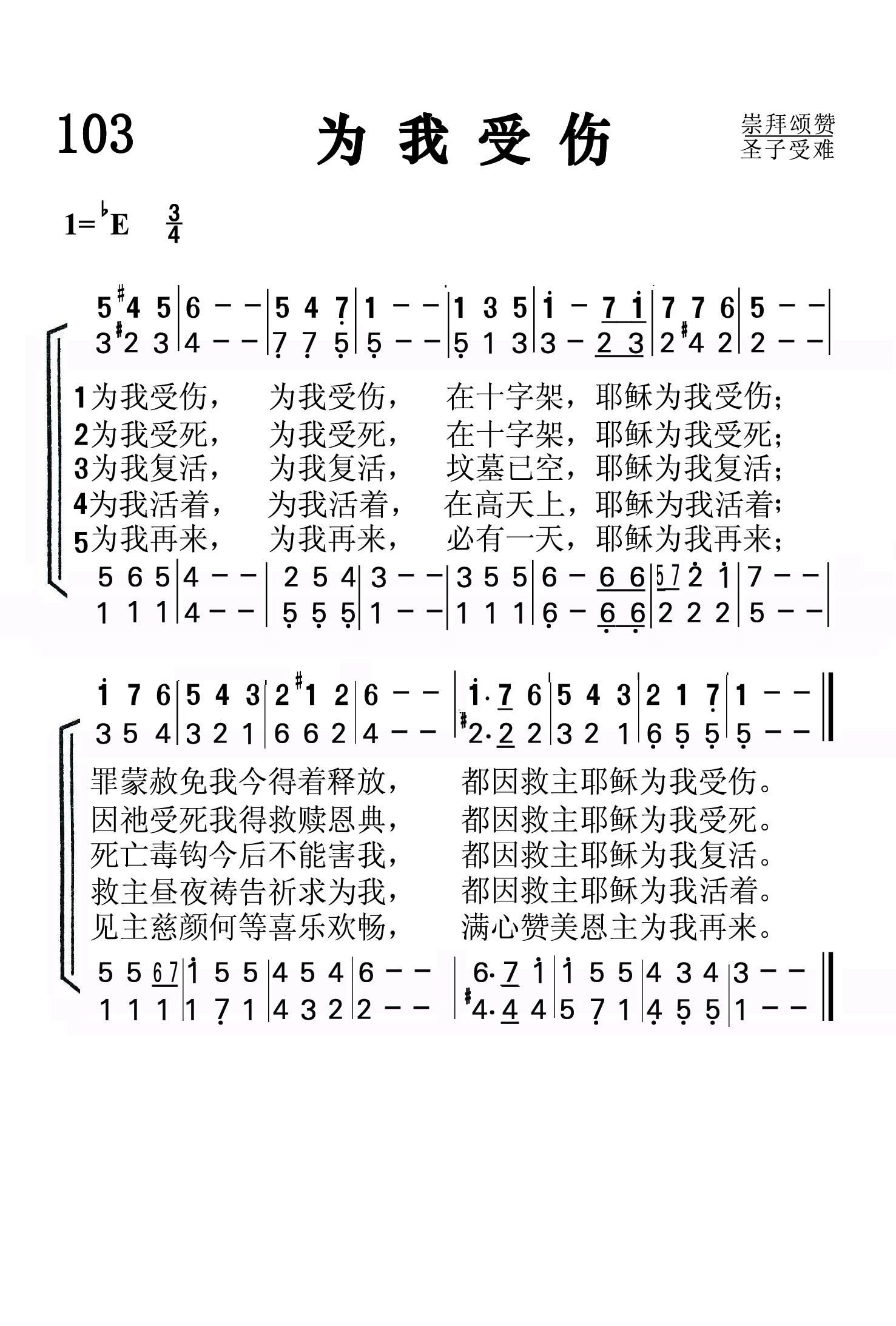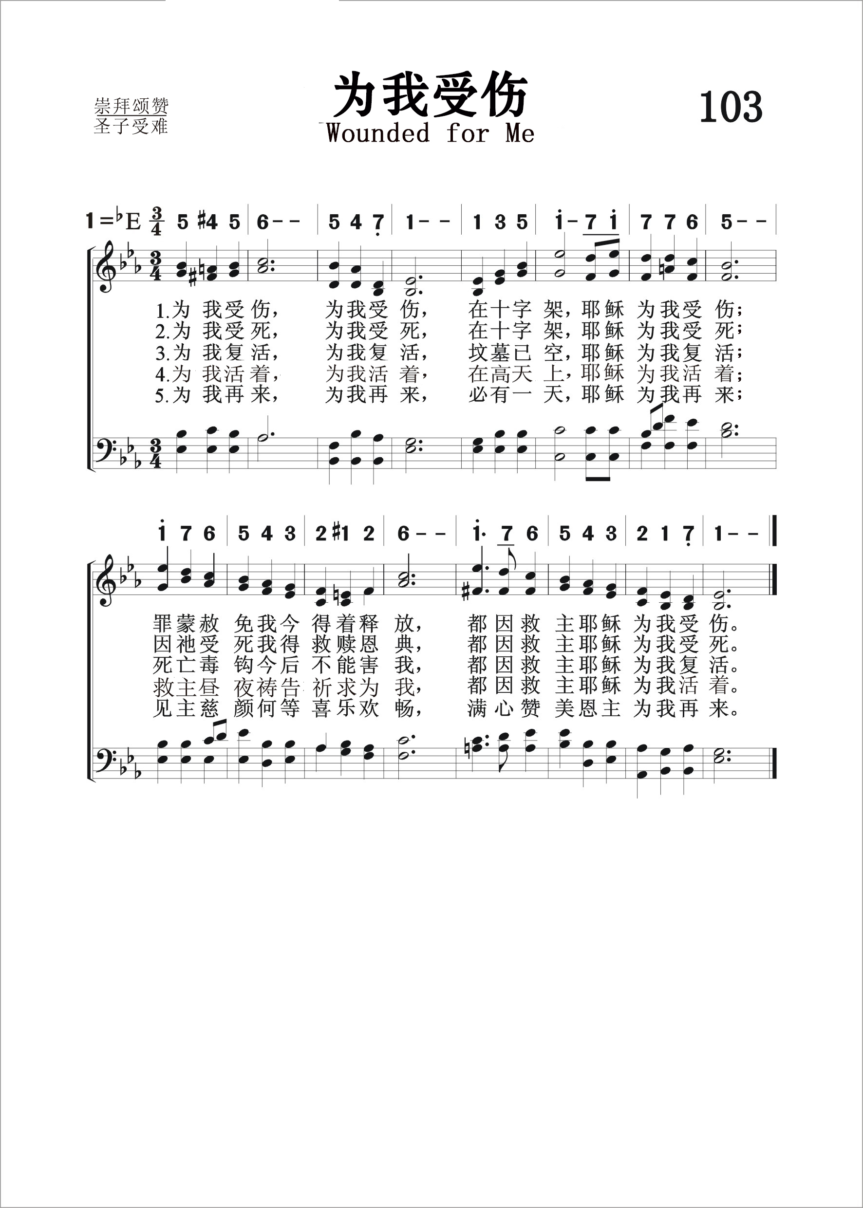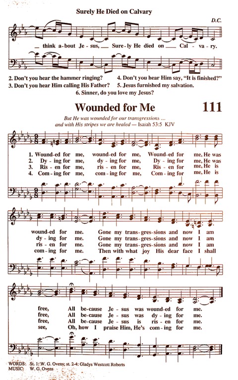 第103首 为我受伤 Wounded for Me 格拉迪斯.罗伯茨(Gladys Watkin Roberts,1888-?)作词,欧文斯(William.Gilbert.Ovens,1869年约5月-1945,11,18)作曲 为我受伤,为我受伤 ,在十字架,耶稣为我受伤; 罪蒙赦免我今得着释放, 都因救主耶稣为我受伤。 为我受死,为我受死, 在十字架耶稣为我受死; 因祂受死我得救赎恩典, 都因救主耶稣为我受死。 为我复活,为我复活 ,坟墓已空,耶稣为我复活; 死亡毒钩今后不能害我, 都因救主耶稣为我复活。 为我活着,为我升天, 在父右边耶稣为我活着 ; 救主昼夜祷告祈求为我, 都因救主耶稣为我活着。 为我再来,为我再来, 必有一天,耶稣为我再来; 见主慈颜何等喜乐欢畅, 满心赞美恩主为我再来。 “祂为我们的过犯受害,为我们的罪孽压伤。因祂受的刑罚,我们得平安;因祂受的鞭伤,我们得医治”(赛53:5)。 这首诗歌分别从救主耶稣为我们受伤,受死,复活,活着,再来五个方面展示了祂无比奇妙的救恩,把主道成肉身,降世受苦,复活升天,荣耀再来与我们的生命联系在一起。它旋律优美,充满激情,是最著名的福音诗歌之一。欧文斯是第一节歌词和曲调的作者。格拉迪斯.罗伯茨为2-5节的词作者。 曲作者威廉. 欧文斯出生于英国伯蒙奇,先后在剑桥和牛津接受教育,获法学士和文学硕士学位。曾在北爱尔兰海边传道达三十年之久。