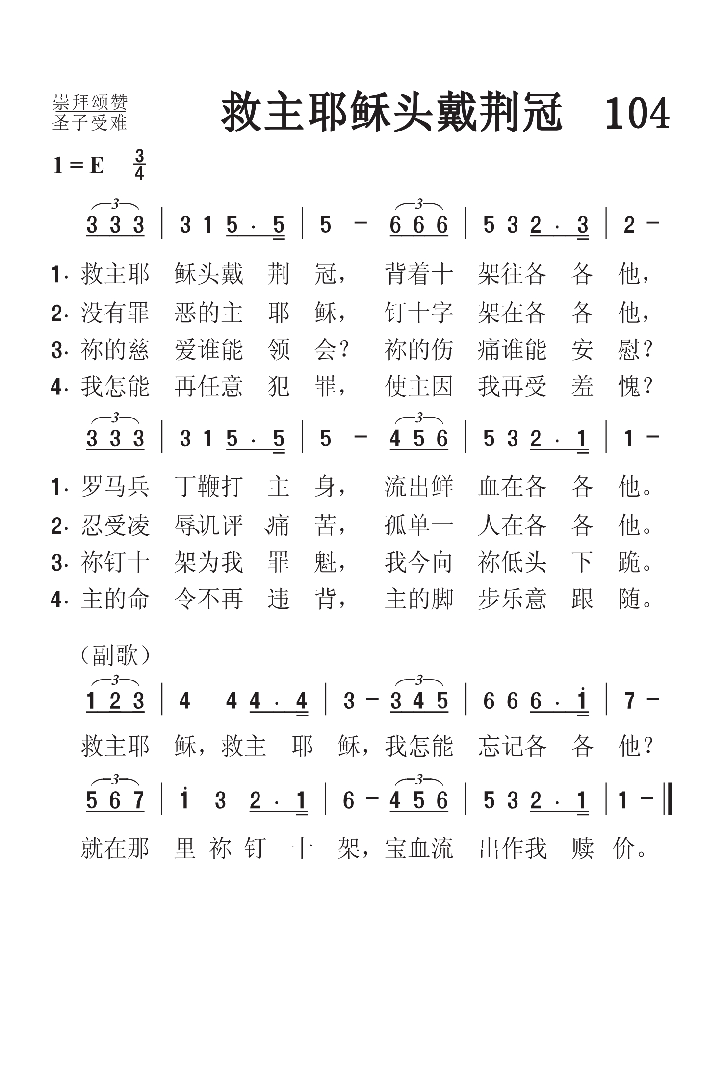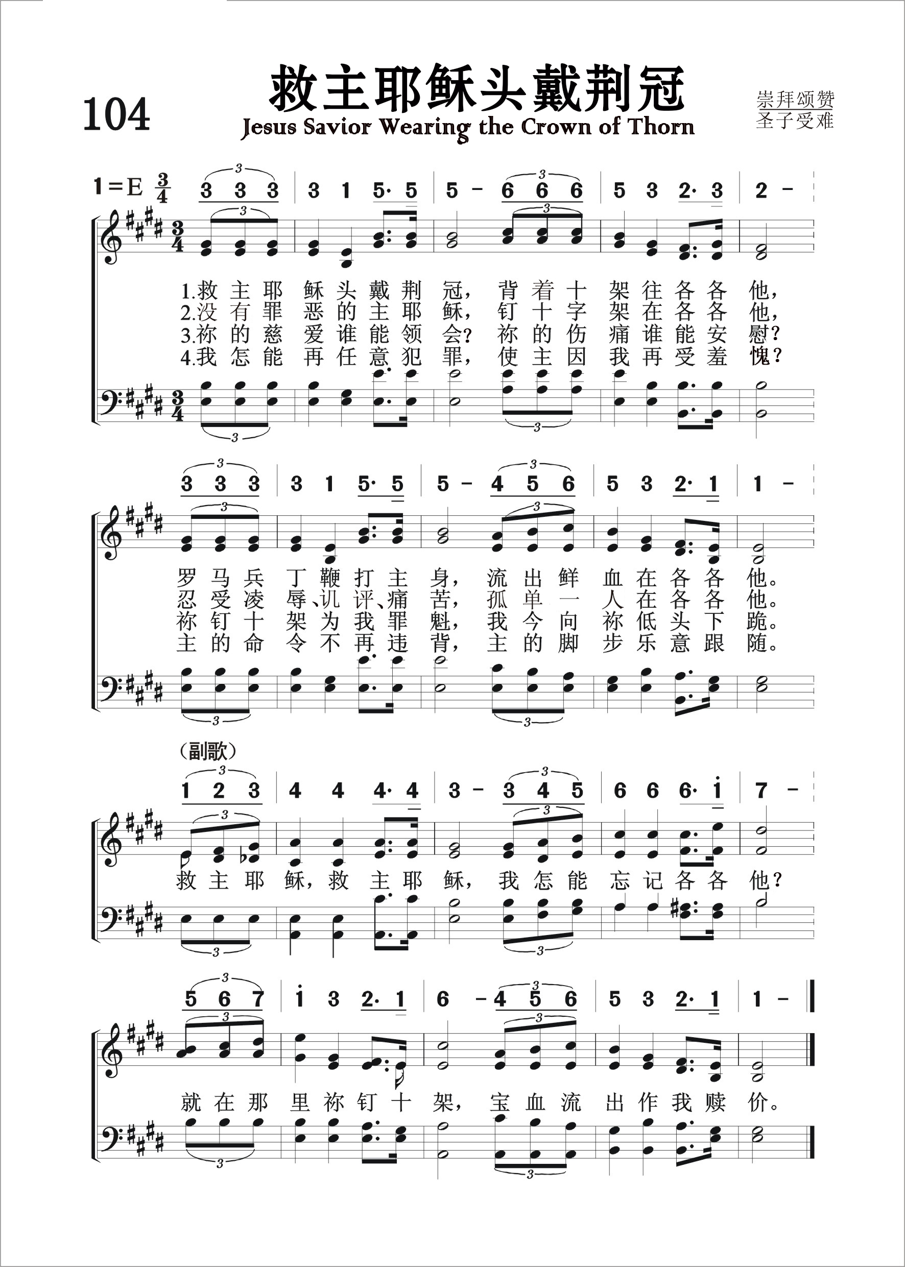 第104首 救主耶稣头戴荆冠 Jesus Savior Wearing the Crown of Thorn 威廉.马丁(William .C.Martin,1864,12,25-1914,8,30)作词,布莱克(J.M.Black,1856,8,19—1938,12,21)作曲 救主耶稣头戴荆冠,背着十架到各各他, 罗马兵丁鞭打主身,流出鲜血在各各他。 没有罪恶的主耶稣,钉十字架在各各他, 忍受耻辱讥评痛苦,孤单一人在各各他。 你的慈爱谁能领会,你的伤痛谁能安慰, 你钉十架为我罪魁,我今向你低头下拜。 我怎能再任意犯罪,使主因我忍受羞愧, 主命令我不敢违背,主脚步我乐意跟随。 救主耶稣救主耶稣,我怎能忘记各各他? 就在那里你钉十架,宝血流出作我赎价。 这首感人肺腑的赞美诗叙述了主耶稣背负沉重的十字架前往各各他的惨痛历程。祂是完全无罪之主,圣洁而无瑕。祂本是天地的主宰,宇宙的君王,享有天庭的至高尊荣,可是为了拯救落在黑暗权势之下的可怜人类,祂竟在这条充满血迹和苦难的道路上挣扎到底。愿这首纪念主的诗歌时常提醒我们主的牺牲之爱,使我们永远感戴祂的大恩大德,让祂的鲜血不致为我们白白倾流。 词作者威廉.马丁出生于美国新泽西州,是一位虔诚爱主的基督徒,一直担任浸信会的牧师。他曾创作不少感人的赞美诗歌。在这首诗歌里,他热情地歌颂耶稣甜美的圣名,表达了千万圣徒的共同心意。第72首《主名流芳》也是威廉.马丁作词的。 曲作者布莱克出生于美国纽约州,一生热心爱主,殷勤为主作工。他曾负责教会团契工作。有一天,他遇见了一个衣杉褴褛,贫穷可怜的姑娘,大约十四五岁,名叫贝茜,在打扫走廊。她的父亲整天只知道酗酒,家里没有一点快乐。布莱克对这位女孩深表同情,就对她传福音,邀请她参加主日学和青年团契。第二天,还把新衣新鞋送到她的家里。这位姑娘接受了主的救恩,不间断地参赴教会的聚会。 布莱克自幼就具有音乐的天赋,擅长声乐和键盘,曾担任音乐教师,后来成为著名的圣诗编辑家。《颂赞诗歌》123首《恩惠天国》也是布莱克作曲的。203首《末日点名》是布莱克作词作曲的。