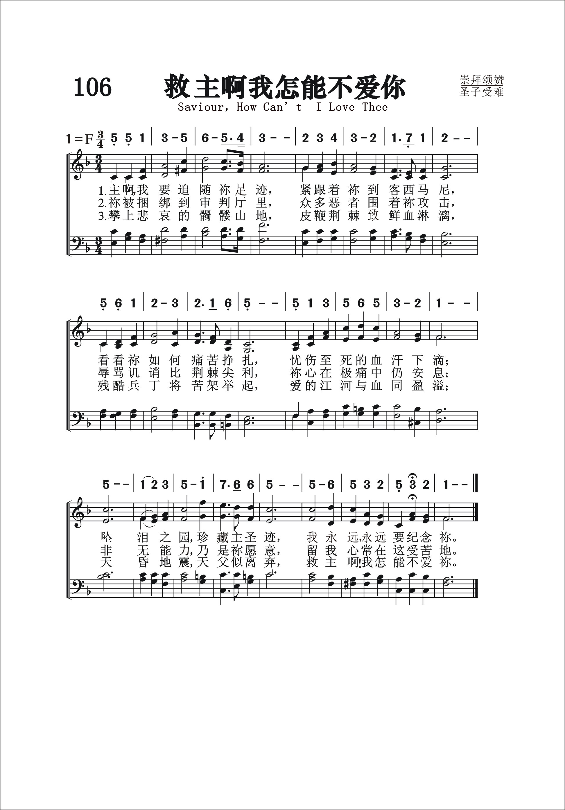 第106首 救主啊,我怎能不爱祢 Saviour,How Can’tI Love Thee 赵典仁作词(1990年)王重光 作曲 主啊,我要追随祢踪迹, 紧跟着祢到客西马尼, 看看祢如何痛苦挣扎, 忧伤至死的血汗下滴; 坠泪之园,珍藏主圣迹 ,我永远,永远要纪念祢 祢被捆绑到审判厅里, 众多恶者围着祢攻击, 辱骂讥诮比荆棘尖利, 祢心在极痛中仍安息; 非无能力,乃是祢愿意 ,留我心常在这受苦地。 攀上悲哀的髑髅山地, 皮鞭荆棘让鲜血淋漓, 残酷兵丁将苦架举起, 爱的江河与血同盈溢; 天暗地震,父将祢离弃, 救主啊我怎能不爱祢。 词作者赵典仁是基督复临安息日会牧师,作家,圣诗翻译家。浙江温州人。1943年出生于传道世家,在艰难环境中自学成才。青年时即蒙主恩召,一生奉献于主,致力于拓展福音园地牧养教会至今已有五十余年。他是一位多产的作家。曾撰写过以科学论证上帝创造大能的《谁的计划》,证道故事《石子集》四集(1至3集由吉林省基督教协会出版,第4集由江苏省基督教两会出版)。香港圣书公会根据《石子集》的内容出版了中英对照的《大卫的石子》。他写过救恩系列研经指引丛书《心路镶痕》、《心海导航》、《心山仰止》、《心田耕耘》和《心园爱歌》(均由吉林省基督教协会出版)。他所写的《滴水藏海》由金陵协和神学院出版。他还写过圣书分卷研究等许多学习资料。他是影响广泛的《颂赞圣诗》(吉林版)的主编,参加《颂赞诗歌》(707)的编辑工作,曾与吴涤申合作翻译过一百多首灵意和曲调皆美的赞美诗歌。在《颂赞圣诗》中采用了97首,在本版《颂赞诗歌》中采用了45首,为诗歌集增添了新意与活力。