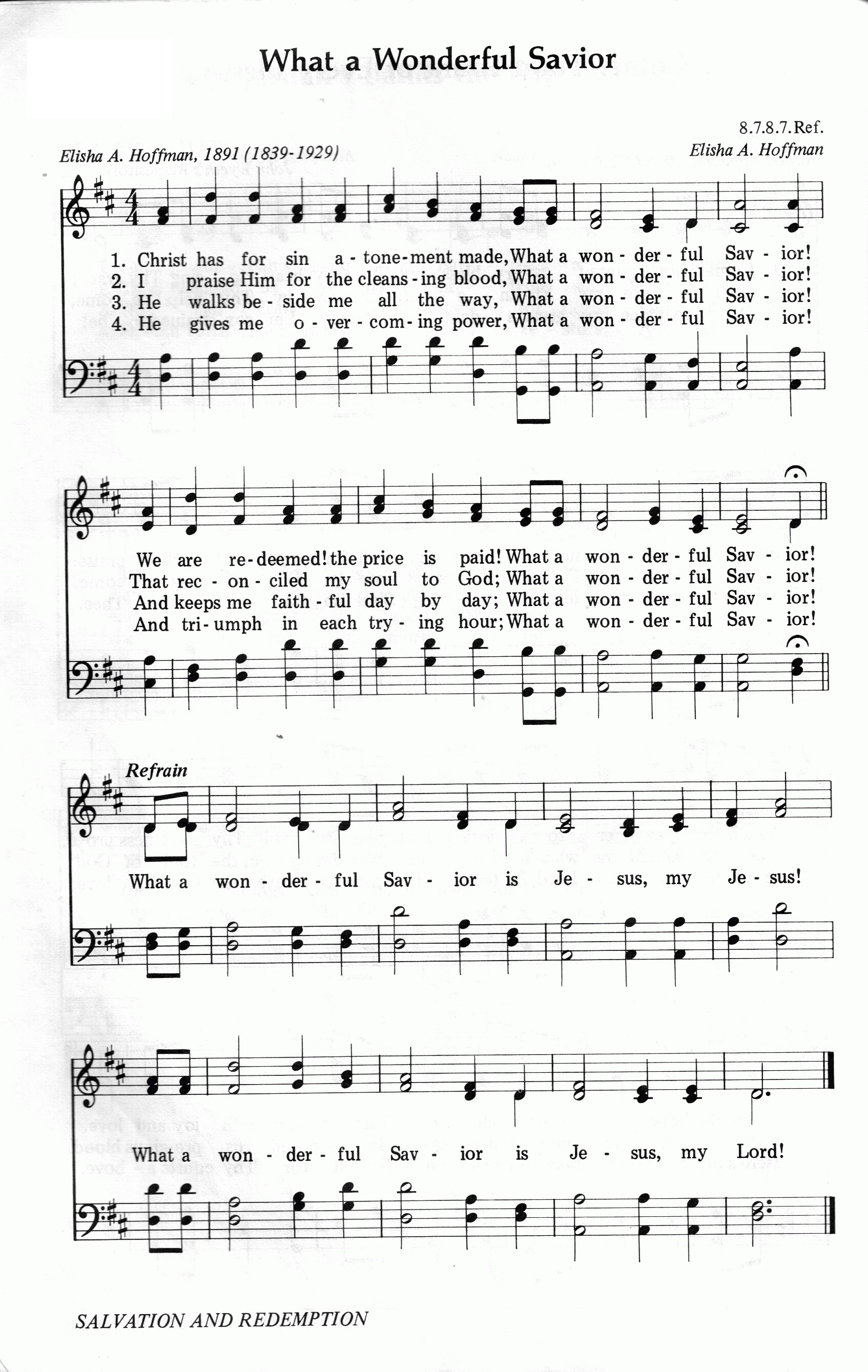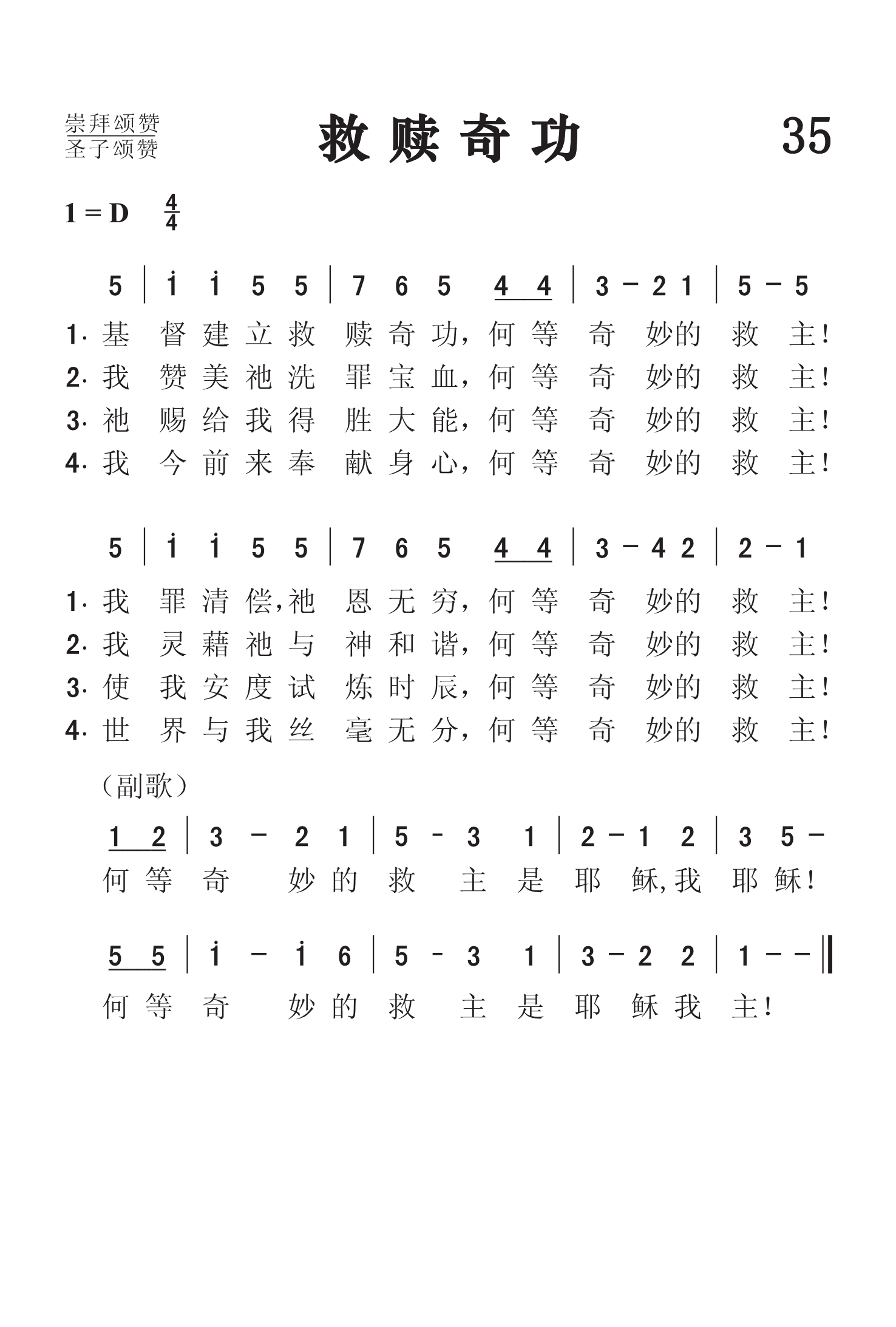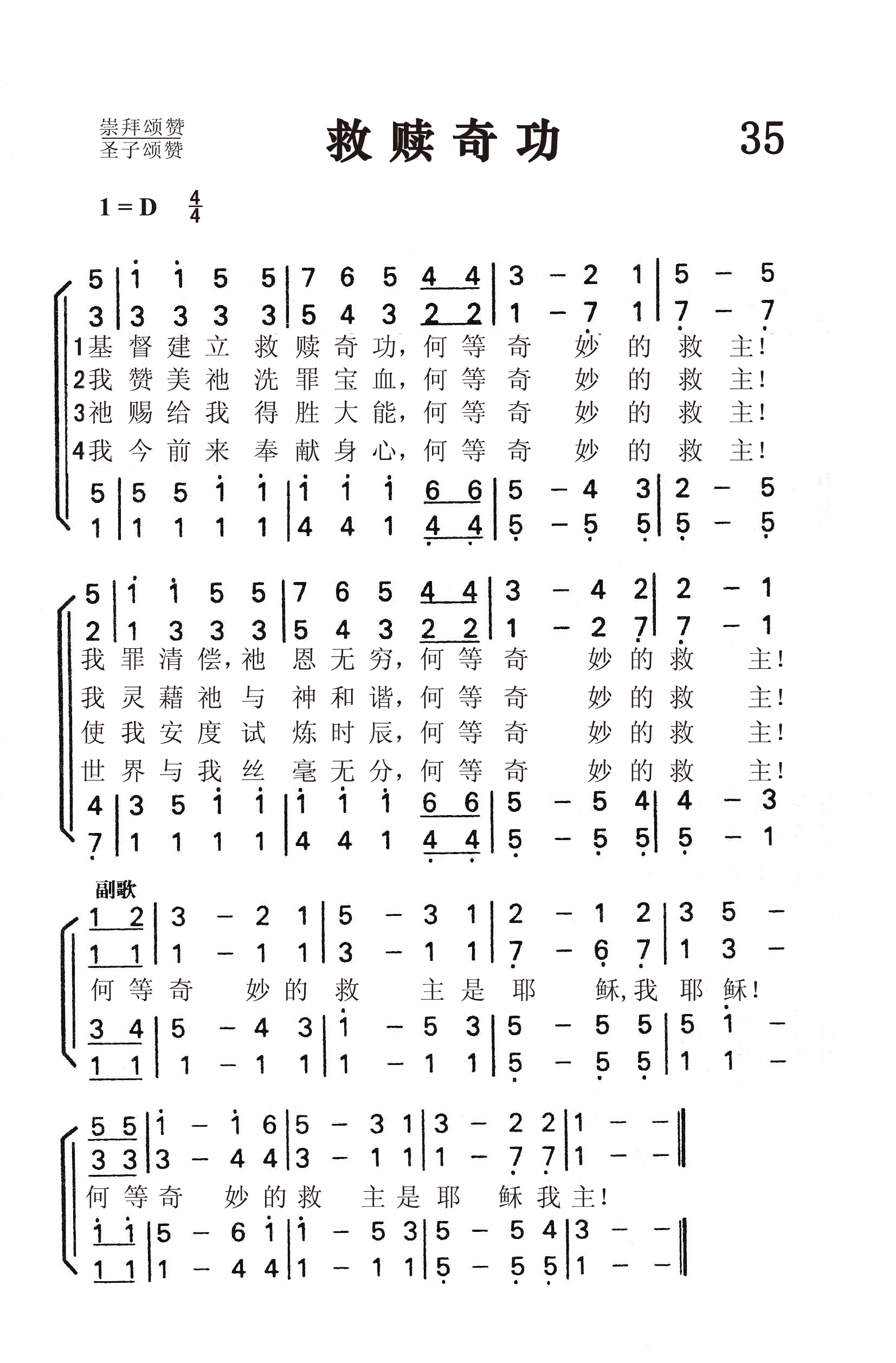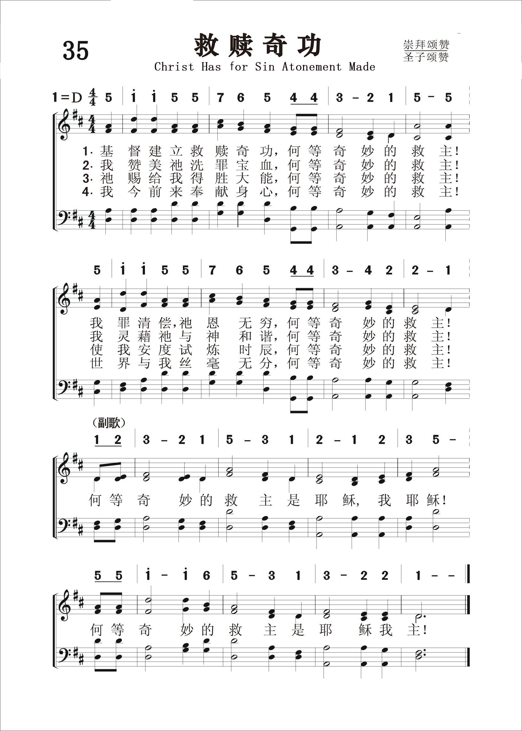 第35首救赎奇功 Christ Has for Sin Atonement Made 霍夫曼(Hoffman 1839,5,7-1929) 作词作曲(1891年) 基督建立救赎奇功,何等奇妙的救主! 我罪清偿,祂恩无 穷,何等奇妙的救主! 我赞美祂洗罪宝血,何等奇妙的救主! 我灵藉祂与神和谐,何等奇妙的救主! 祂赐给我得胜大能,何等奇妙的救主! 使我安度试炼时辰,何等奇妙的救主! 我今前来奉献身心,何等奇妙的救主! 世界与我丝毫无分,何等奇妙的救主! 这是霍夫曼的代表作品之一,歌颂了奇妙的救主建立救赎的大功,用自己的血洗净人的罪孽,使人与上帝重归于好,并赐给人战胜试探的力量,帮助人度过试炼的时光。诗歌节奏明快,旋律简洁优美,甚受欢迎。 霍夫曼出生于美国宾夕法尼亚州一个福音协会牧师的家庭。他毕业于福音协会联合神学院,音乐方面全靠自修。家里每天早晚二次的礼拜都要唱一二首诗。父母都唱得很好,给他留下深刻的印象。他逐渐感觉到上帝给他一种恩赐,有能力借着诗歌来表达他的感受和见解。他十八岁就开始写诗,后来竟成多产的福音诗歌作家,总计二千多首,时常兼作词曲,并帮助编印五十种诗歌集,广受欢迎。他在福音派教会担任牧师多年,最后任密执安州一长老会牧师,经常借着诗歌向成千从未听过的人讲道,使教会兴旺发达。 《颂赞诗歌》139首《荣耀归主名》,471首《一切献于坛上》,576首《靠主臂膀》是霍夫曼作词的。