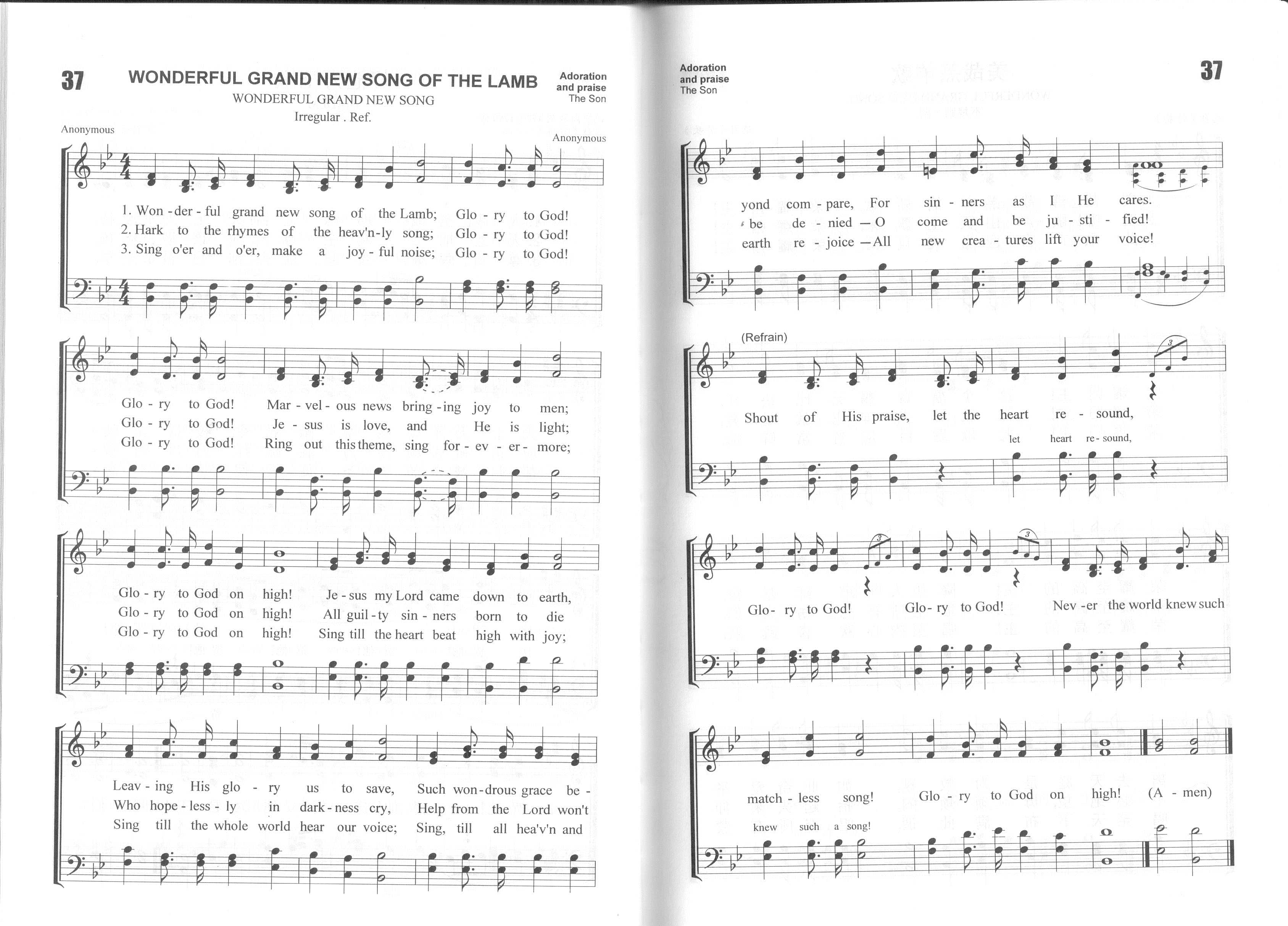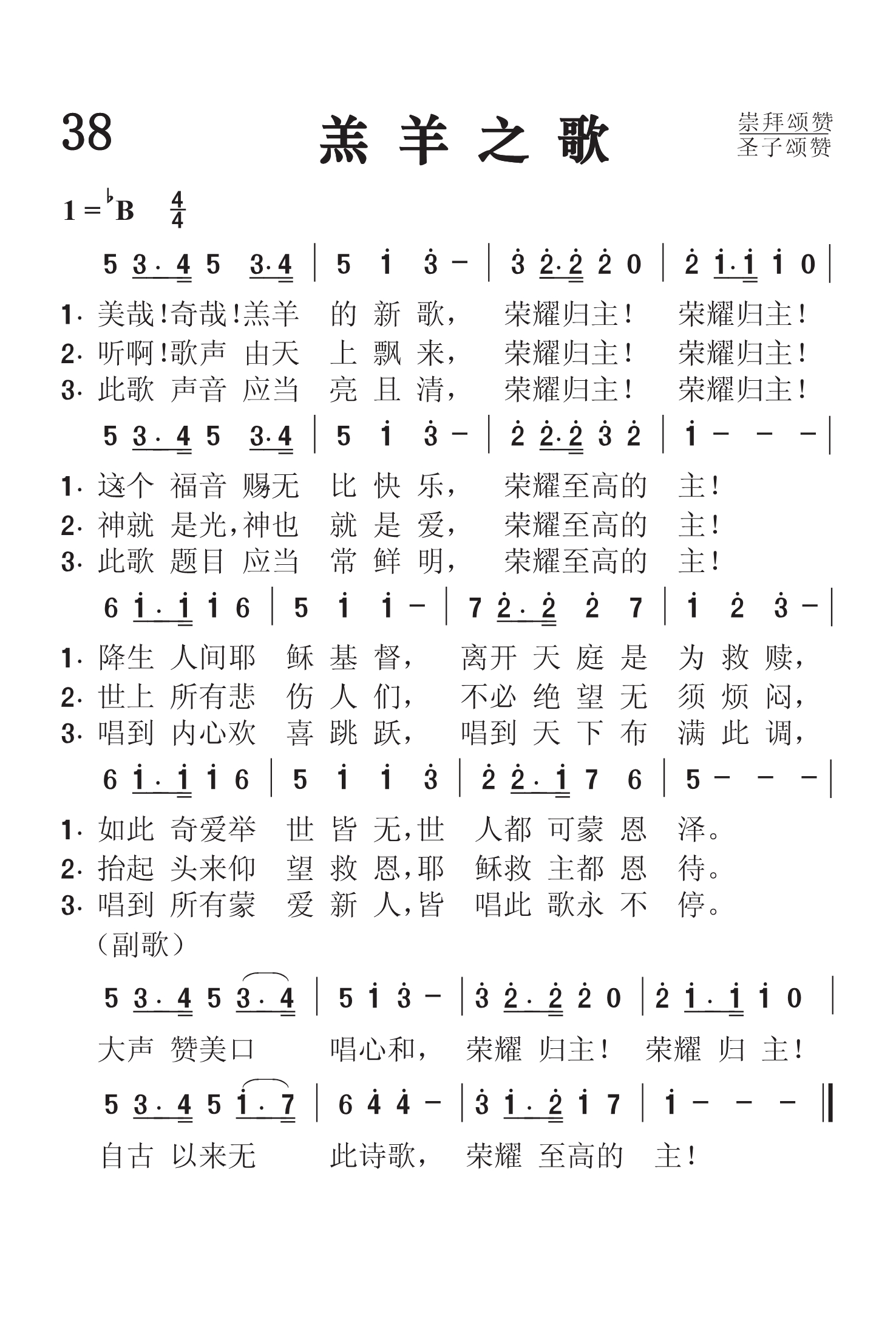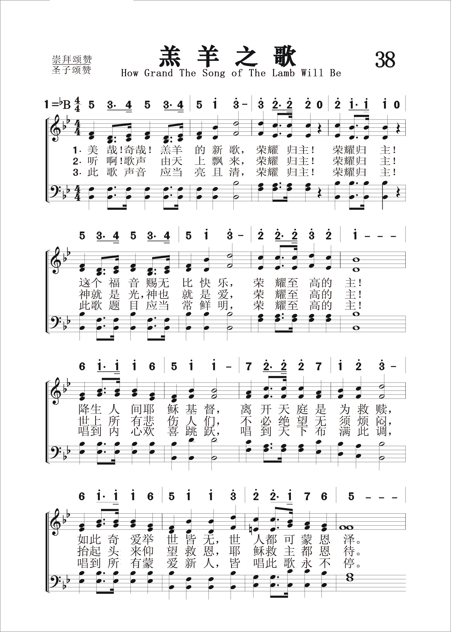 第38首 羔羊之歌 How Grand the Song of the Lamb Will Be “曾被杀的羔羊是配得权柄,丰富,智慧,能力,尊贵,荣耀。颂赞的”(启5:12)。 美哉!奇哉!羔羊的新歌,荣耀归主!荣耀归主! 这个福音赐无比快乐,荣耀至高的主! 降生人间耶稣基督,离开天庭是为救赎, 如此奇爱举世皆无,世人都可蒙恩泽。 听啊!歌声由天上飘来 ,荣耀归主! 荣耀归主! 神就是光,神也就是爱, 荣耀至高的主! 世上所有悲伤人们,不必绝望无须烦闷 抬起头来仰望救恩 耶稣救主都恩待。 此歌声音应当亮且清, 荣耀归主 !荣耀归主! 此歌题旨应当常鲜明, 荣耀至高的主! 唱到内心欢喜跳跃 ,唱到天下布满此声 唱到所有蒙爱新人 ,皆唱此曲永不停。 大声赞扬口唱心和,荣耀归主!荣耀归主! 自古以来无此诗歌,荣耀都归救主!” 这首诗歌源于《普天颂赞》出版以前我国福州各基督教派联合编写的赞美诗集。后经唐守临长老修改后编入基督徒聚会处的《诗歌》之中。词曲作者佚名。本诗洋溢着发自信徒的感谢和赞美,旋律优美,歌词振奋感人,因为它表达了蒙爱的人所发的心声。