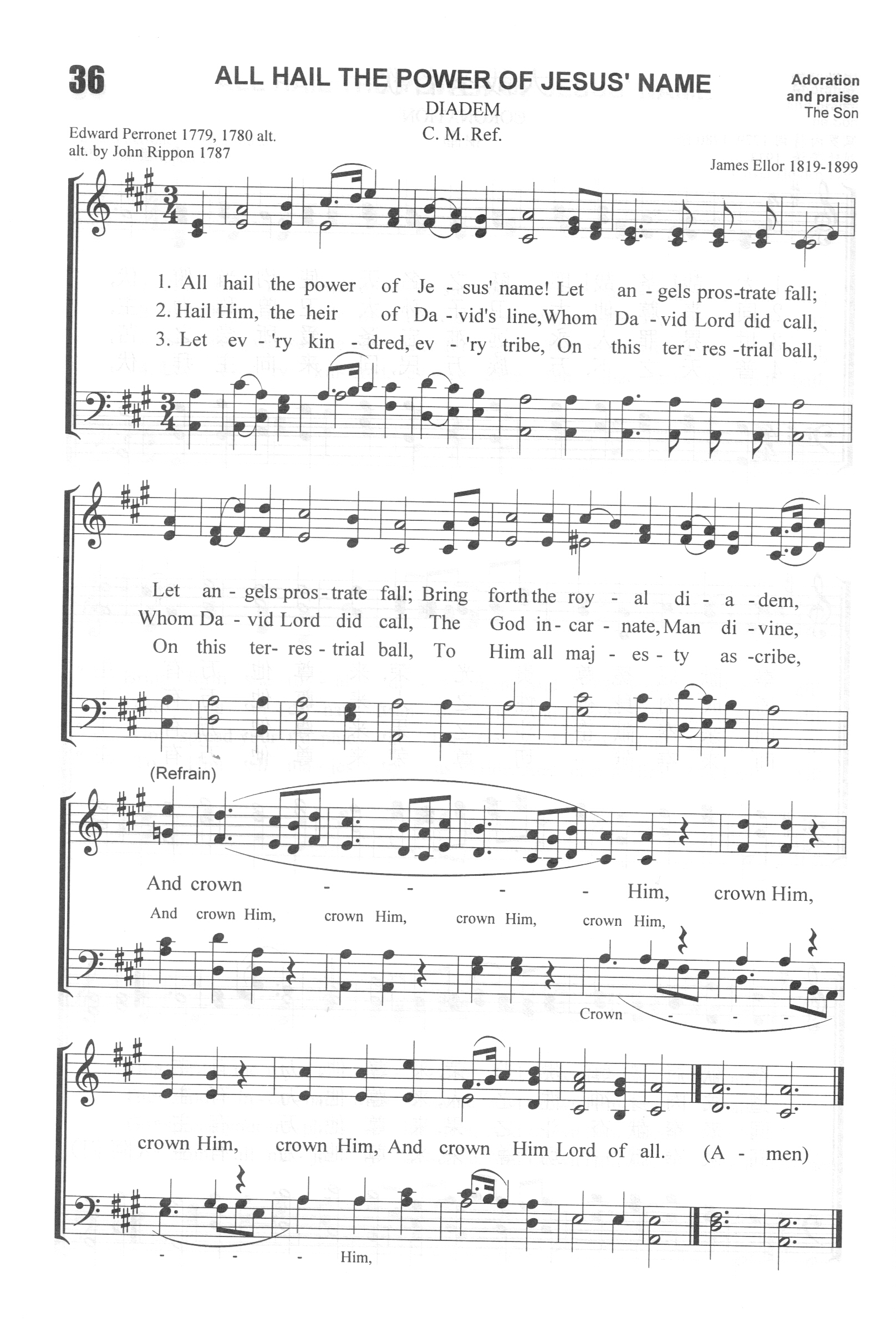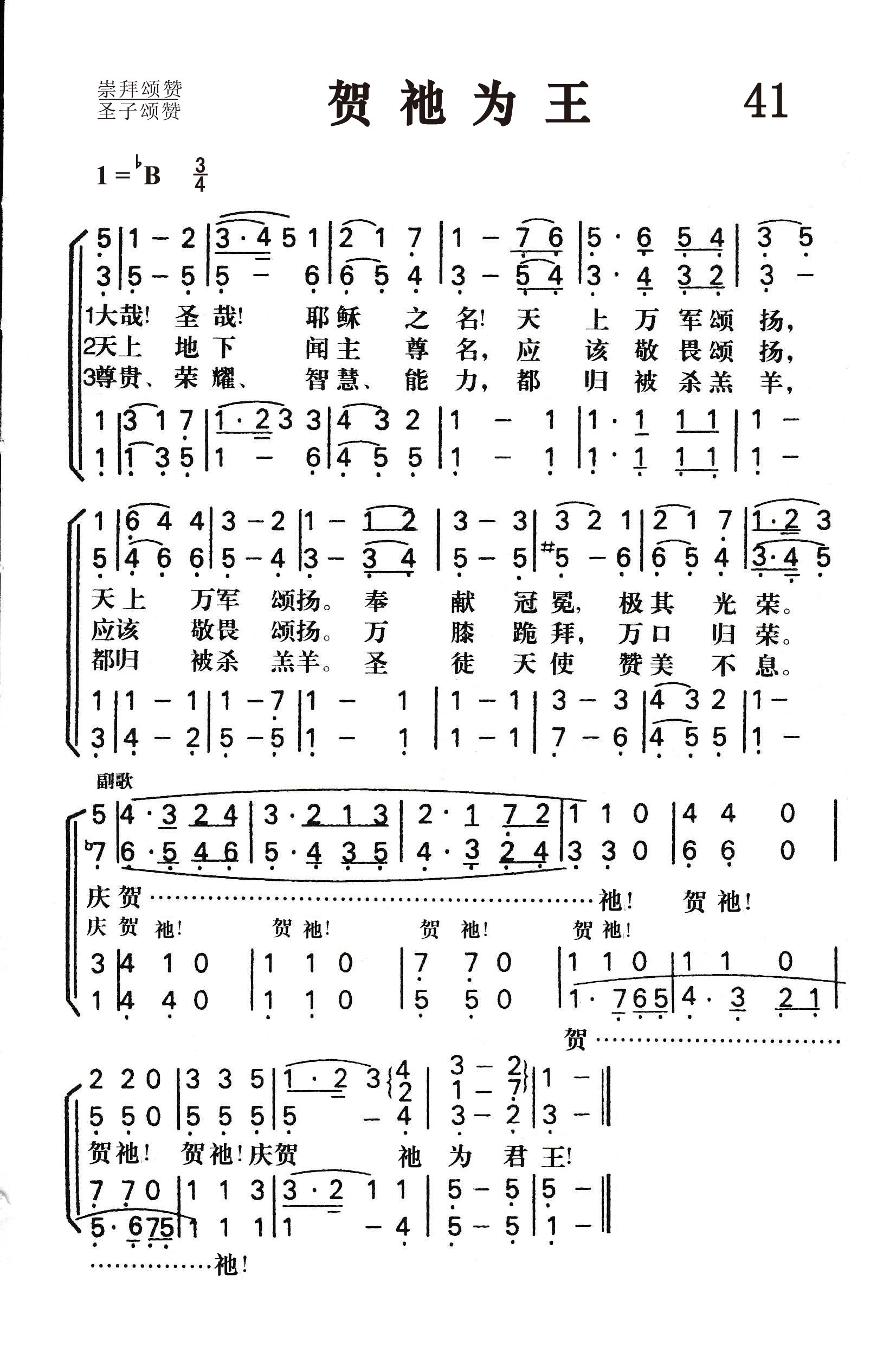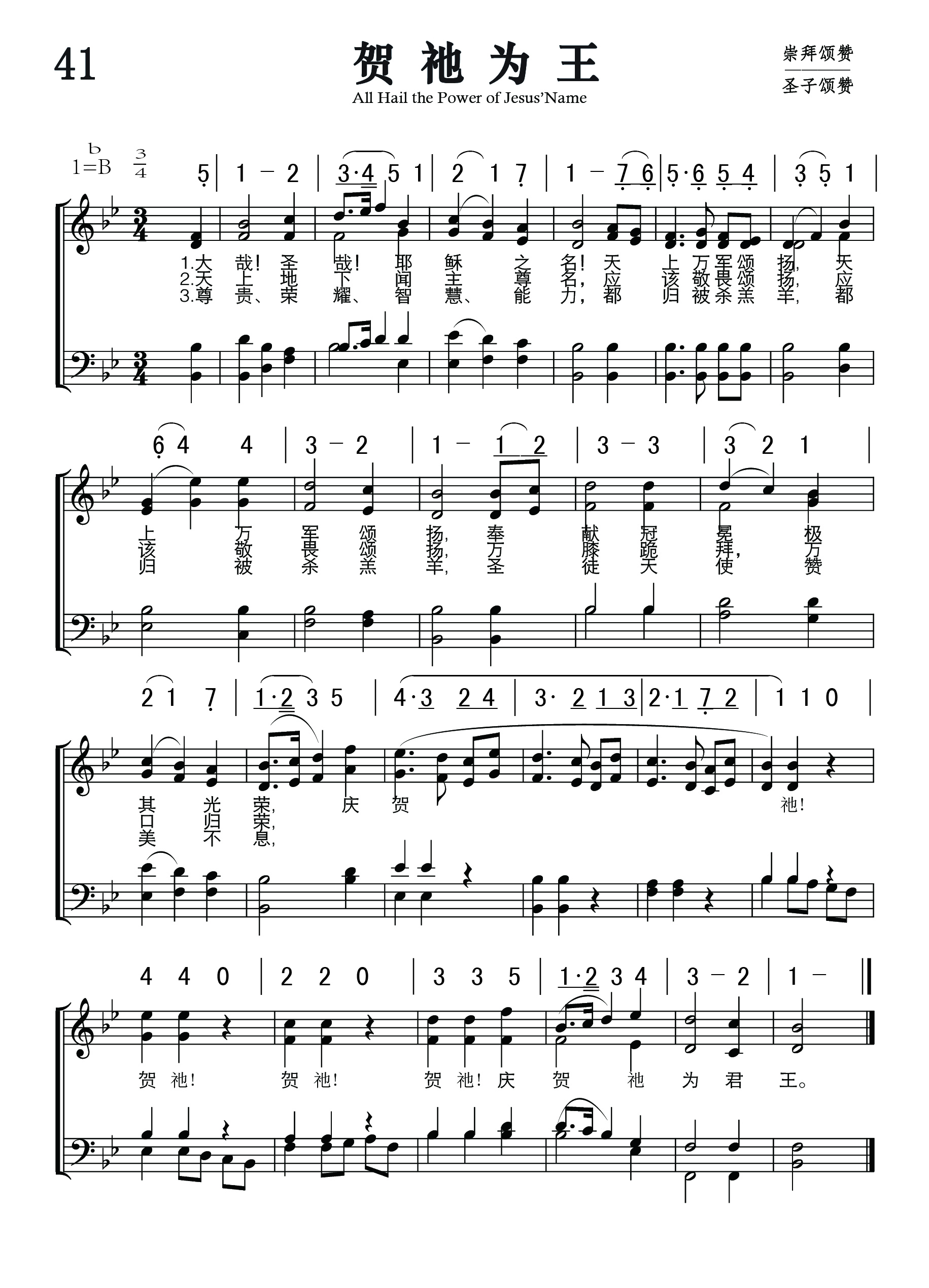 第41首 贺祂为王 All Hail the Power of Jesus’Name 爱德华.佩罗内特(E.Perronet 1726-1792,1,2)作词,埃勒(J.Ellor,1819-1899,9,27)作曲 大哉!圣哉!耶稣的名 !天上万军颂扬; 奉献冠冕极其光荣,庆贺祂为君王。 天上地上闻主尊名, 应该敬畏颂扬; 万膝跪拜,万口称颂,庆贺祂为君王。 尊贵、荣耀、智慧、能力 ,都归被杀羔羊; 圣徒天使赞美不息,庆贺祂为君王。 词作者为爱德华.佩罗内特的父亲是法国的新教徒,逃亡至瑞士,以后移居英国,在圣公会牧会达五十年之久,极力支持卫斯理兄弟。佩罗内特曾随从约翰卫斯理在英国北部布道八年,后因主张布道团团员可主持圣餐和应脱离英国国教两事,意见分歧而分道扬镳。 这首诗是1779年他在坎特伯雷任牧师时所写,当时在《福音杂志》11月号上发表时只有一节,出版后很受欢迎,故1780年4月发表了全诗,共有八节。 1787年里彭(John Rippon, 1751-1836,英国人,浸信会的牧师)将原诗的第二、三、六节删除,另添两节。 曲作者埃勒出生于英国,年轻时学习制帽,六日工作,星期天到教堂领唱。他自学音乐,18岁就指挥卫斯理教堂唱诗班。为主日学周年纪念创作本曲时年仅19岁。1843年他移居美国,继续出事制帽。晚年双目失明,仍继续在教会教唱诗歌。本曲旋律华丽雄健,广为流传,用四部合唱倍加感人。 布道士斯各特(E. P, Scott)有一次赴印度荒山一野蛮部落传福音。 他随身带着一把小提琴独往山区,被一群土人包围。他们高举长予要杀他,他心中默祷,拿起小提琴闭目演奏《贺祂为王》两遍以后,睁眼观看,土人已放下长矛。他们为这新奇乐器所奏的美妙音乐所感,接受他为朋友并迎为上宾。斯各特把耶稣基督福音的真道介绍给他们。 二年半后,斯各特因健康需返美疗养,那些基督徒的土人列队为他送行四十英哩。在临别时,斯各特打消了归意,随他们回去,终身为他们服务。 “我看见仿佛有玻璃海,其中有火搀杂。又看见那些胜了兽和兽的像并它名字数目的人,都站在玻璃海上,拿着上帝的琴,唱上帝仆人摩西的歌和羔羊的歌,说:“主上帝,全能者啊,祢的作为大哉,奇哉!万世之王啊,祢的道途义哉,诚哉!主啊,谁敢不敬畏祢,不将荣耀归与祢的名呢?因为独有祢是圣的,万民都要来在祢面前敬拜,因祢公义的作为已经显出来了”(启15:2-4)。