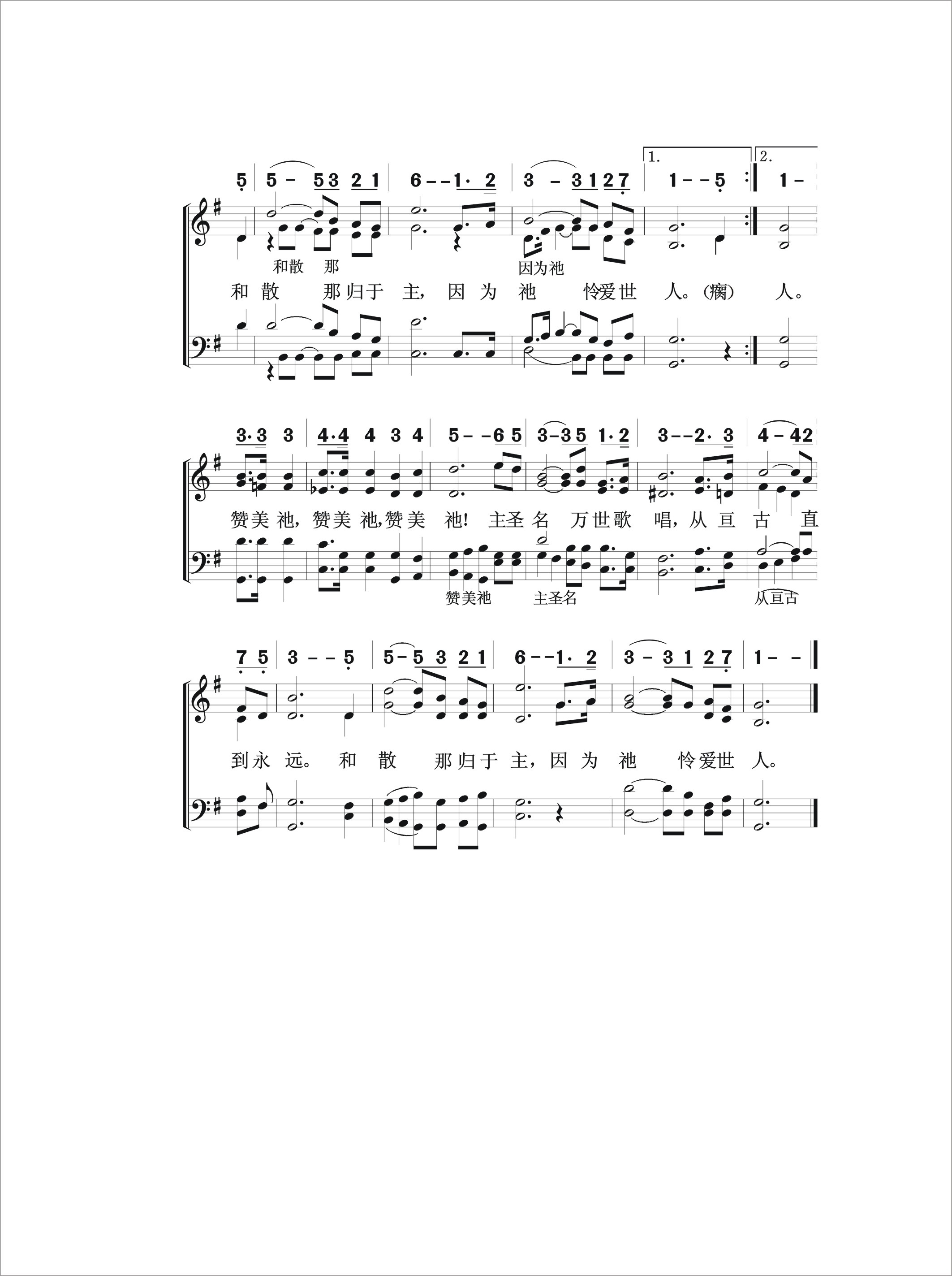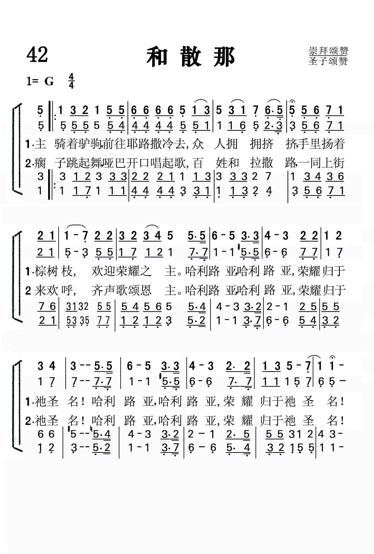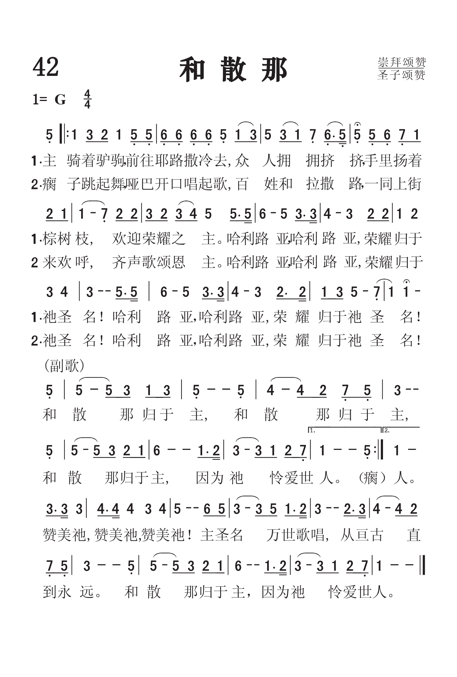 第42首 和撒那 Hosanna (《颂赞圣诗》551首) 主骑着驴驹前往耶路撒冷去,众人拥拥挤挤手里扬着棕树枝, 欢迎荣耀的主,哈利路亚,哈利路亚,荣耀归于祂圣名! 哈利路亚,哈利路亚,荣耀归于祂圣名! 瘸子跳起舞,哑巴开口唱起歌,百姓和拉撒路一同上街来欢呼, 齐声歌颂恩主,哈利路亚,哈利路亚,荣耀归于祂圣名! 哈利路亚,哈利路亚,荣耀归于祂圣名! 和撒那归于主,和撒那归于主 和撒那归于主,因为祂怜爱世人。 赞美祂,赞美祂,赞美祂! 主圣名万世歌唱,从亘古直到永远, 和撒那归于主,因为祂怜爱世人。 这首诗歌以形象生动的语言和明快的旋律为我们展示了救主当年谦谦和和地骑着驴,在万众欢呼拥戴之下,进入耶路撒冷的感人画面。耶稣在地上的一生,饱经磨难,多受痛苦,在贫穷卑微的人群中救死扶伤,宣扬天国爱的福音。祂从不张扬,也不喧哗。可是在祂即将踏上十字架的道路,成就救赎最后大工的时候,祂要以显著的方式出现在众人面前,使人们祂的使命有深刻的印象,为祂离世后福音的大传播做好铺垫。 “众人多半把衣服铺在路上。还有人砍下树枝来铺在路上。前行后随的众人,喊着说,和散那归于大卫的子孙,奉主名来的,是应当称颂的。高高在上和散那”(太21:8、9)。