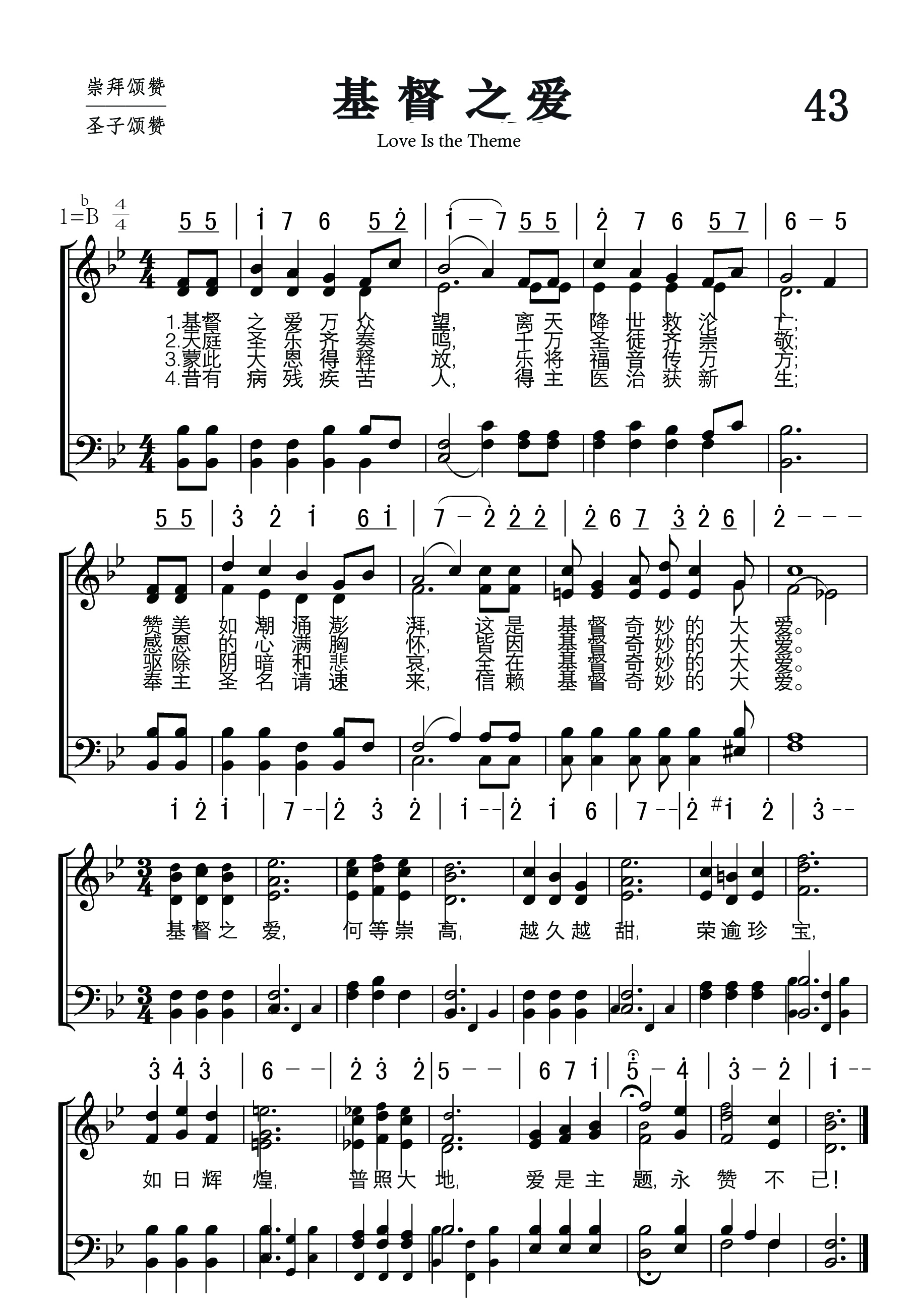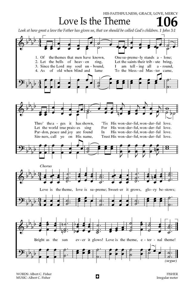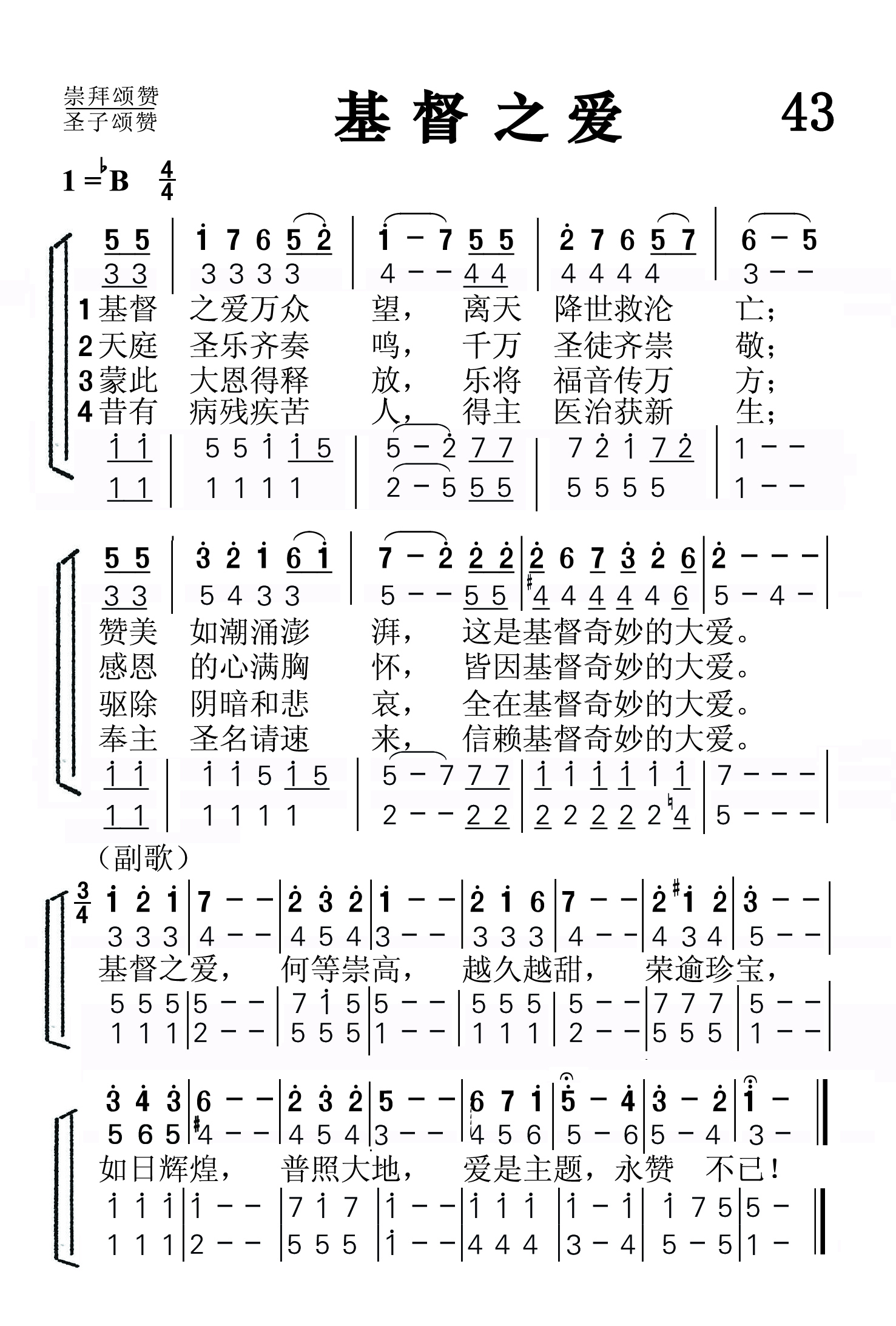 第43首 基督之爱 Love Is the Theme 费希尔(Albert Christopher Fisher,1886,3,10-1946,2,6)作词作曲(1913年) 基督之爱万众望,离天降世救沦亡; 赞美如潮湧澎湃,这是基督奇妙的大爱。 天庭圣乐齐奏鸣,千万圣徒齐崇敬; 感恩的心满胸怀,皆因基督奇妙的大爱。 蒙此大恩得释放,乐将福音传万方; 驱除阴暗和悲哀,全在基督奇妙的大爱, 昔有病残疾苦人,得主医治获新生; 奉主圣名请速来,信赖基督奇妙的大爱。 基督之爱, 何等崇高,越久越甜,荣逾珍宝, 如日辉煌 ,普照大地,爱 是主题,永赞不已! 作者费希尔出生于美国北卡罗来纳州的新伯恩。他先后就读于德克萨斯州的沃思堡大学和理工学院,范德比尔特大学,南卫理大学,在肯塔基州的阿斯伯里学院获神学博士学位。1908年,他前往沃思堡,任南卫理教会末世十余年。在第一次世界大战期间,他任随军牧师。战后,他在东俄克拉荷马和北德克萨斯教会工作。《基督的爱》是他所创作的众多诗歌之一。