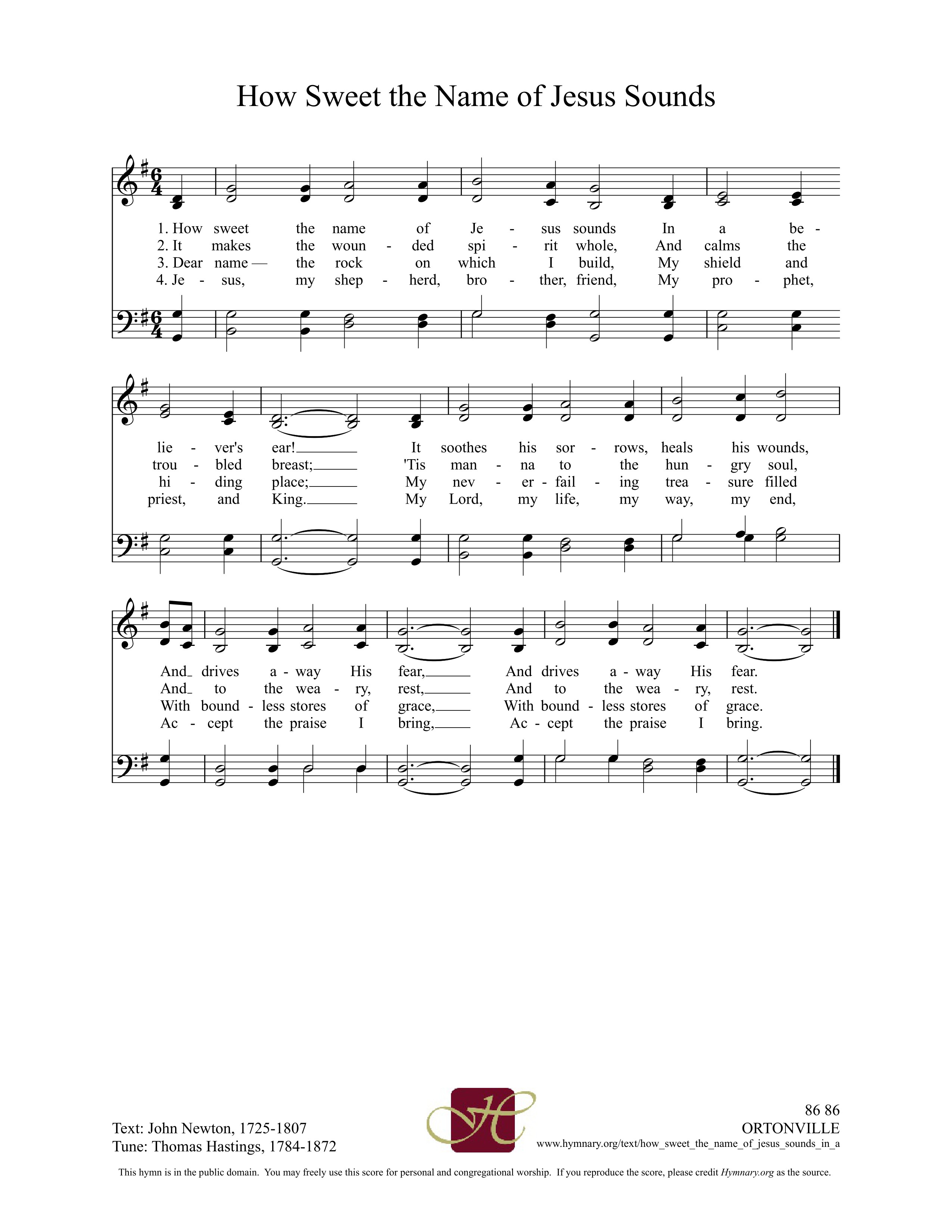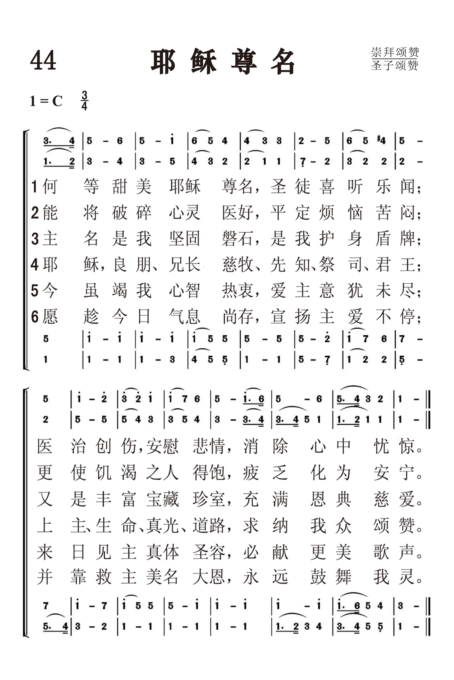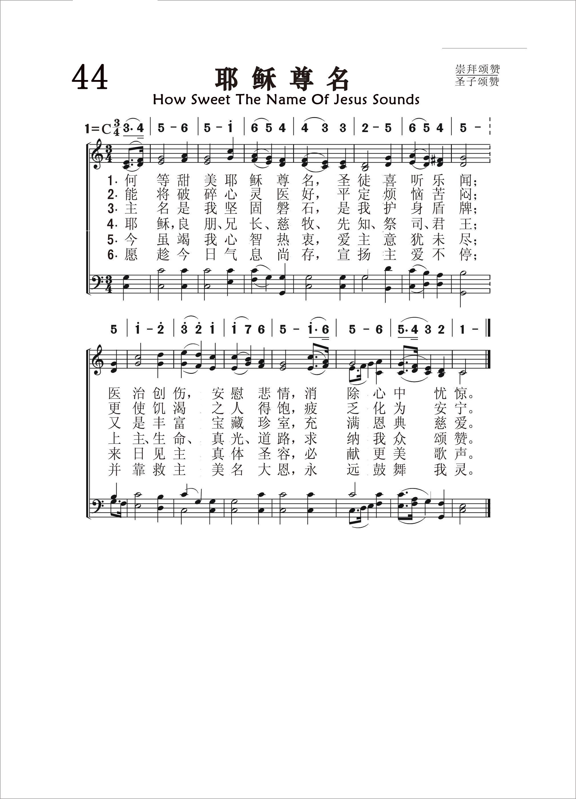 第44首耶稣尊名 How Sweet the Name of Jesus Sounds 约翰牛顿(JOHN NEWTON,1725.7.24-1807.12.21)作词,卡斯伯特夫人(MRS. ELIZABETH HOWARDCUTHBERT,1800-1857)作曲 何等甜美耶稣尊名,圣徒喜听乐闻; 医治创伤,安慰悲情,消除心中忧惊。 能将破碎心灵医好,平定烦恼苦闷; 更使饥渴之人得饱,疲乏化为安宁。 主名是我坚固磐石,是我护身盾牌; 又是丰富宝藏珍室,充满恩典慈爱。 耶稣,良朋\ 兄长、慈牧、先知\ 祭司\君王; 上主\ 生命、真光、道路,求纳我众颂赞。 今虽竭我心智热衷,爱主意犹未尽; 来日见主真体圣容,必献更美歌声。 愿趁今日气息尚存,宣扬主爱不停; 并靠救主美名大恩,永远鼓舞我灵。 “你的名如倒出来的香膏”(歌1:3)。 这是约翰牛顿的一首经典力作,写于1779年,曾有多位作曲家为其谱曲,现已译成多种文字,为各国信徒所喜爱。 当约翰牛顿回顾自己是所走过的路程,想到自己是从多么深的罪恶深渊里被主拯救出来,出黑暗入祂奇妙光明时,他的心中充满无限的感慨。他切身体验到耶稣的圣名是何等宝贵。主的名是“坚固盘石”,“护身盾牌”,“丰富宝藏”,“充满大慈大爱”。牛顿觉得,耶稣真是他的“大牧”,“良朋,先知,君王,祭司”,“上主,生命,道路”。 全诗自始至终表达了作者对舍身救人的主耶稣的景仰和挚爱,反映了所有蒙恩罪人的心声。 词作者约翰.牛顿 出生于基督徒家庭。父亲是西班牙人,从事航业;母亲是英国人,是一位虔诚的基督徒。在他很小的时候,他的母亲就将他抱在膝盖上教他读经唱诗,为他恳切祈祷,将他奉献与主。 但世事的变迁往往出人意料。牛顿七岁那年,他虔诚的母亲去世了。牛顿随后只读了两年书,就跟随父亲在海上漂泊。在八年时间里,牛顿过着放荡不羁的生活,成为凶恶的奴隶贩子。烟酒赌嫖,无恶不作,将母亲的上帝置之度外。 牛顿由于行为不端犯法被捕入狱,出来以后沦为奴隶,过着生不如死的生活。他父亲后带他到另一条船上工作,他二十三岁那年,在海上遭遇风暴,轮船随时都有可能倾复。在这生死攸关的急难时刻,牛顿想起了母亲的上帝,开始跪下向天父上帝祷告,省察自己的罪过,痛改前非。轮船脱离危险以后,他改变了自己的生活方式,攻读圣书,在韦斯利等人的指导之下,学习传道。他所写的《奇异恩典》(《颂赞诗歌》136首)一诗就是他重生得救经历的写照。 1754年,他与妻子定居利物浦,作观潮员为生,并随韦斯利兄弟研读拉丁文及希伯来文圣书,偶而也证道。 1764年他由圣公会按立为牧师,正式从事传扬圣道,牧养教会的工作。他忠实履行献身的誓言,一生呕心沥血克已服务。他又为反对奴隶制而大声疾呼。他还和库柏(诗人1731-1800)合作编写圣诗集。他自己写诗达二百八十余首,其中有许多脍炙人口的名篇。到了他弥留之际,他说:“我现在什么都不记得了,但我还记得两件事,第一,我是个大罪人,第二,基督是伟大的救主。” 在他的墓碑上刻着:“约翰.牛顿牧师,原是不信上帝,犯罪作恶的人,曾在非洲作奴隶之仆,但借着救主耶稣的丰盛怜悯,得蒙保守,拯救和赦免,特派从事宣传福音的工作。” 曲作者卡斯伯特夫人是爱尔兰都伯林人,生平不详。