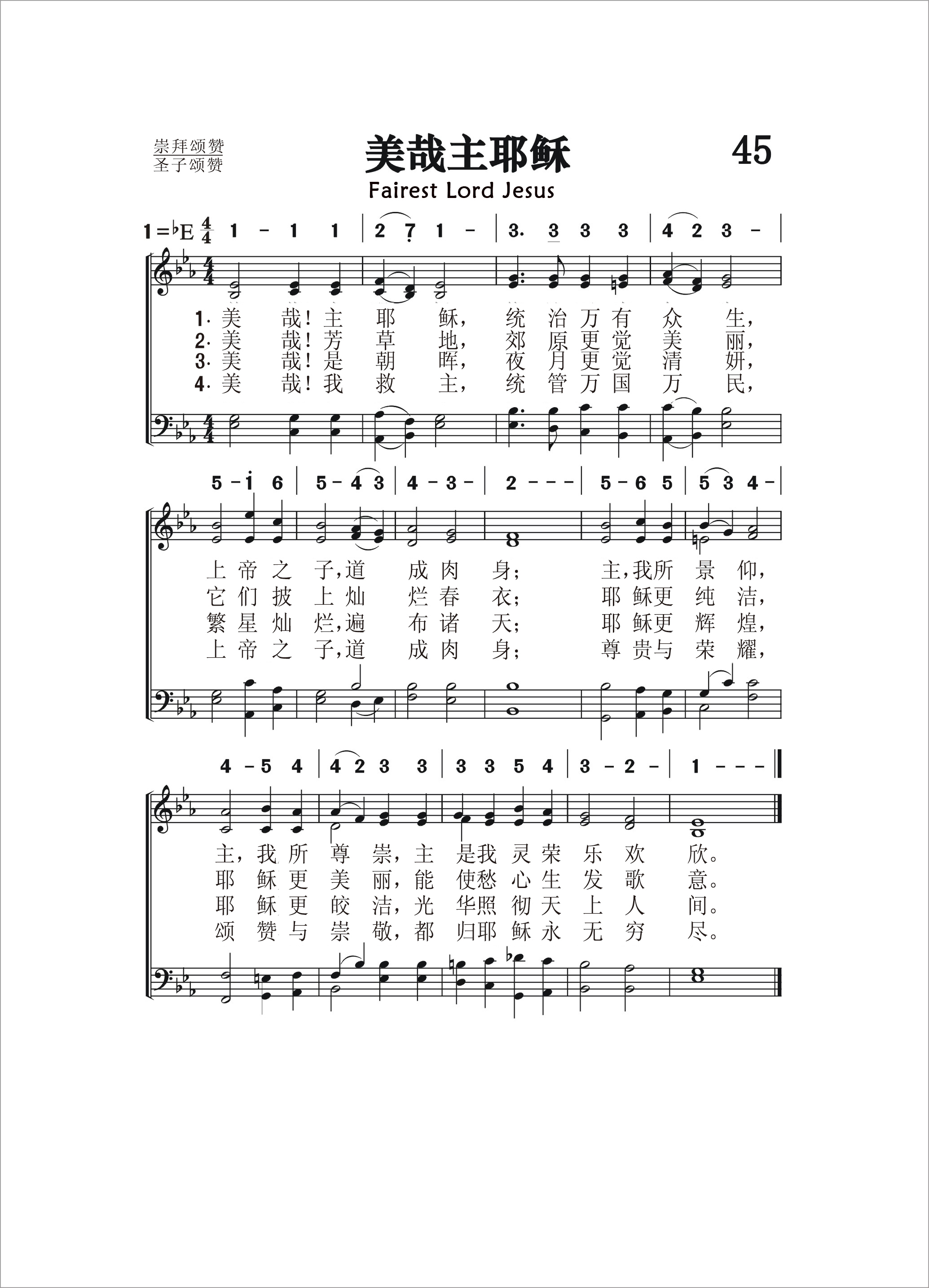 第45首美哉主耶稣 Fairest Lord Jesus 威利斯(R.S.Willis,1819,2,10-1900,5,7)根据西里西亚民歌的旋律改编并配和声(1850年),刘廷芳译(1933年) “独有祂的名被尊荣,祂的荣耀在天地之上”(诗146:13)。 美哉!主耶稣, 统治万有众生, 上帝之子,道成肉身; 主,我所景仰,主,我所尊荣崇, 主是我灵荣乐欢欣。 美哉 !芳草地 ,郊原更觉美丽 它们披上灿烂春衣 ; 耶稣最圣洁,耶稣最美丽, 能使愁心生发歌意。 美哉 !是朝辉, 夜月更觉清妍, 繁星灿烂,遍布诸天 ; 耶稣更辉煌,耶稣更纯洁, 光华照彻天上人间。 美哉!我救主, 统管万国万民, 上 帝之子,道成肉身;尊贵与荣耀, 颂赞与崇敬,都归耶稣永无穷尽。 威利斯(R.S.Willis,1819,2,10-1900,5,7)根据西里西亚民歌的旋律改编并配和声(1850年),刘廷芳译(1933年) 曲作者威利斯从耶鲁大学毕业以后,前往德国研究音乐六年,结识了音乐家门德尔松等。后从事教学,报刊和音乐评论工作。本曲是他所编《二十三首教会众赞歌和圣诗合唱练习》中的一首,原来是和声练习曲。 本诗首见于1677年教会出版的《蒙斯特圣诗》,系西里西亚(欧洲中部)格拉茨的农民凭记忆流传下来的一首民歌。格拉茨在离捷克首都布拉格东北100公里处。1620年,宗教改革家约翰.胡斯(1368-1415)的追随者被赶出波希米亚时,就聚居在靠近波兰的格拉茨,过着男耕女织的简朴生活。他们放弃了旧教的繁文缛节,回归朴素的大自然,从美丽的原野到翠绿的草地,从初升的朝晖到清妍的夜月,联想到耶稣更美丽,更皎洁的圣容,以及祂照彻天上人间的动人画面,这首美丽的诗歌就油然而生。原诗共有5节。后来有人把它从德语译成英语。
