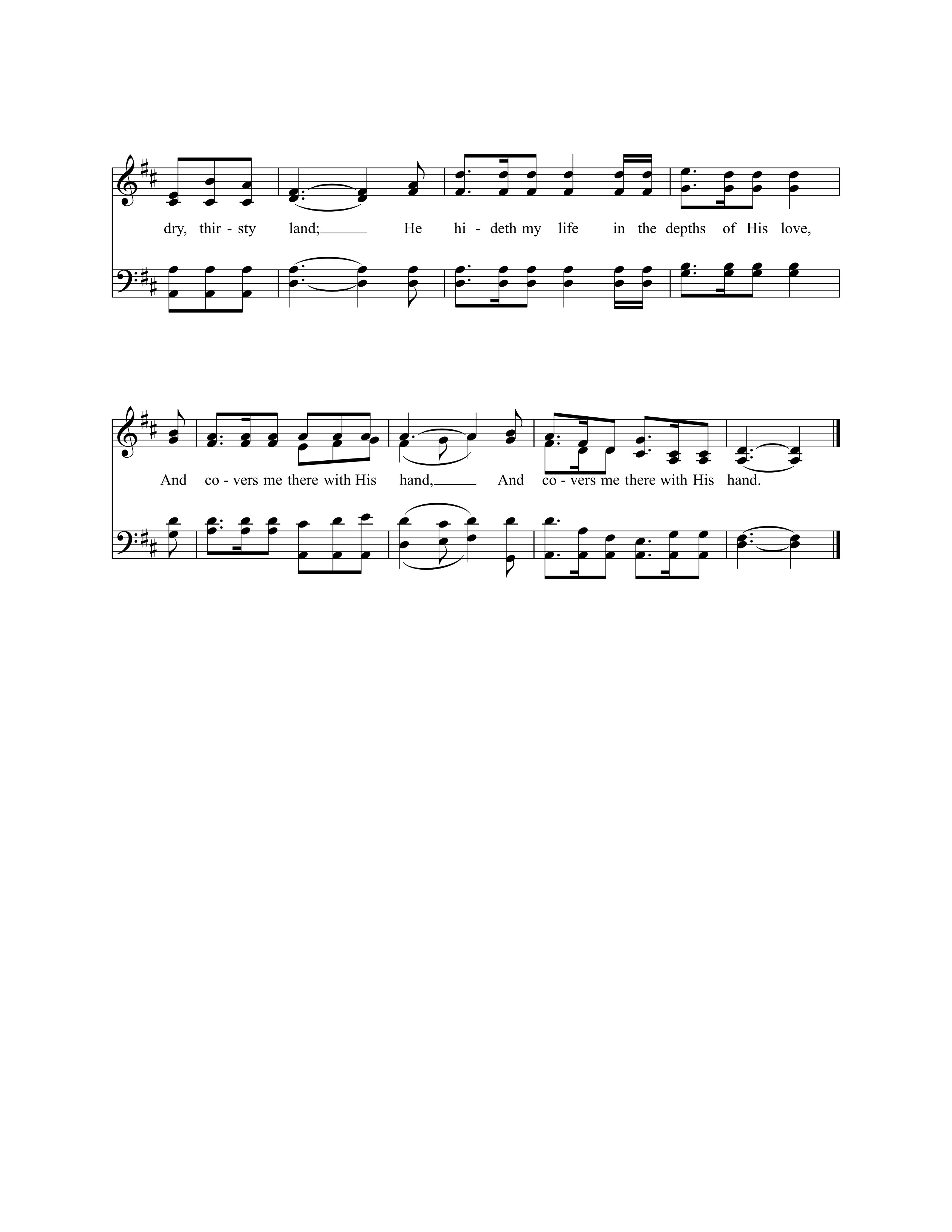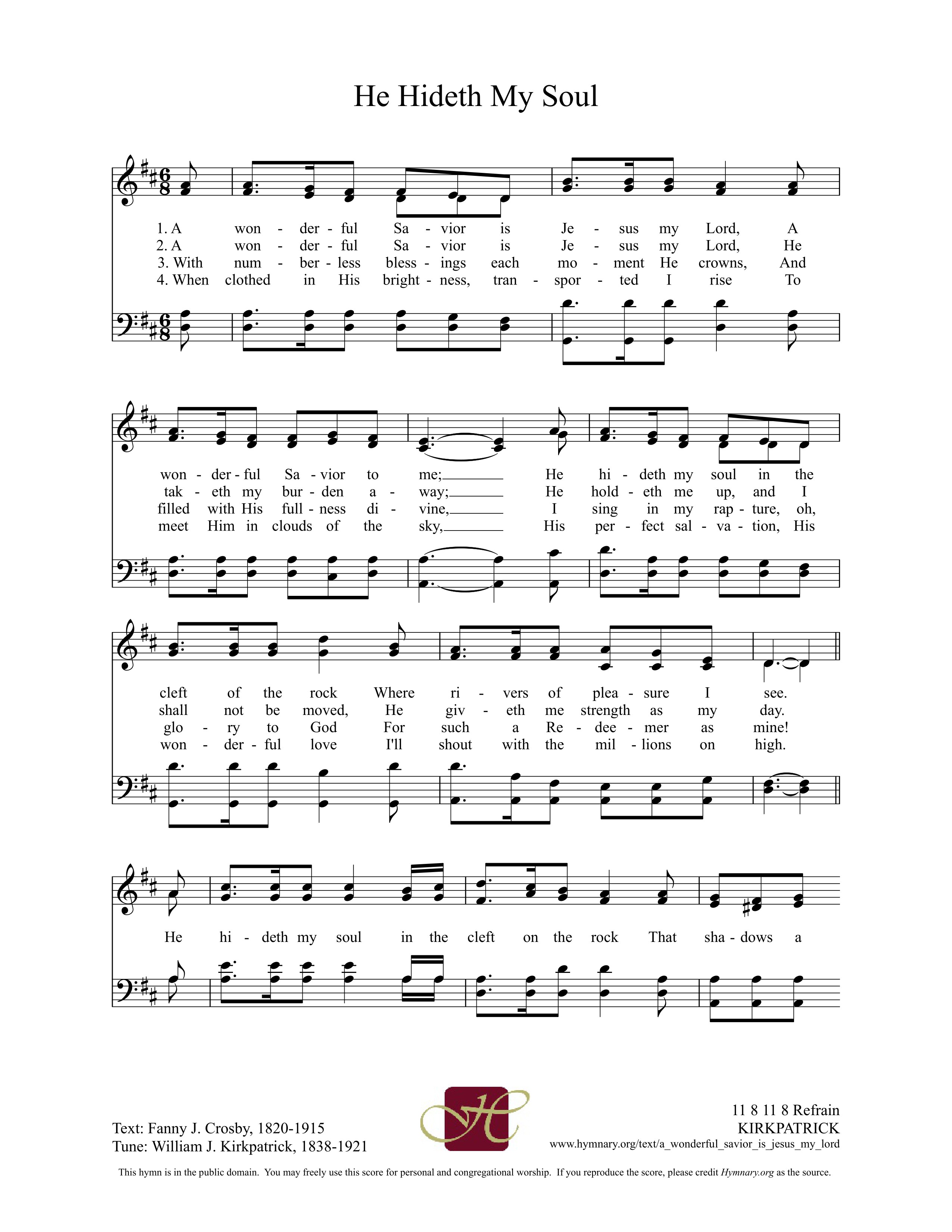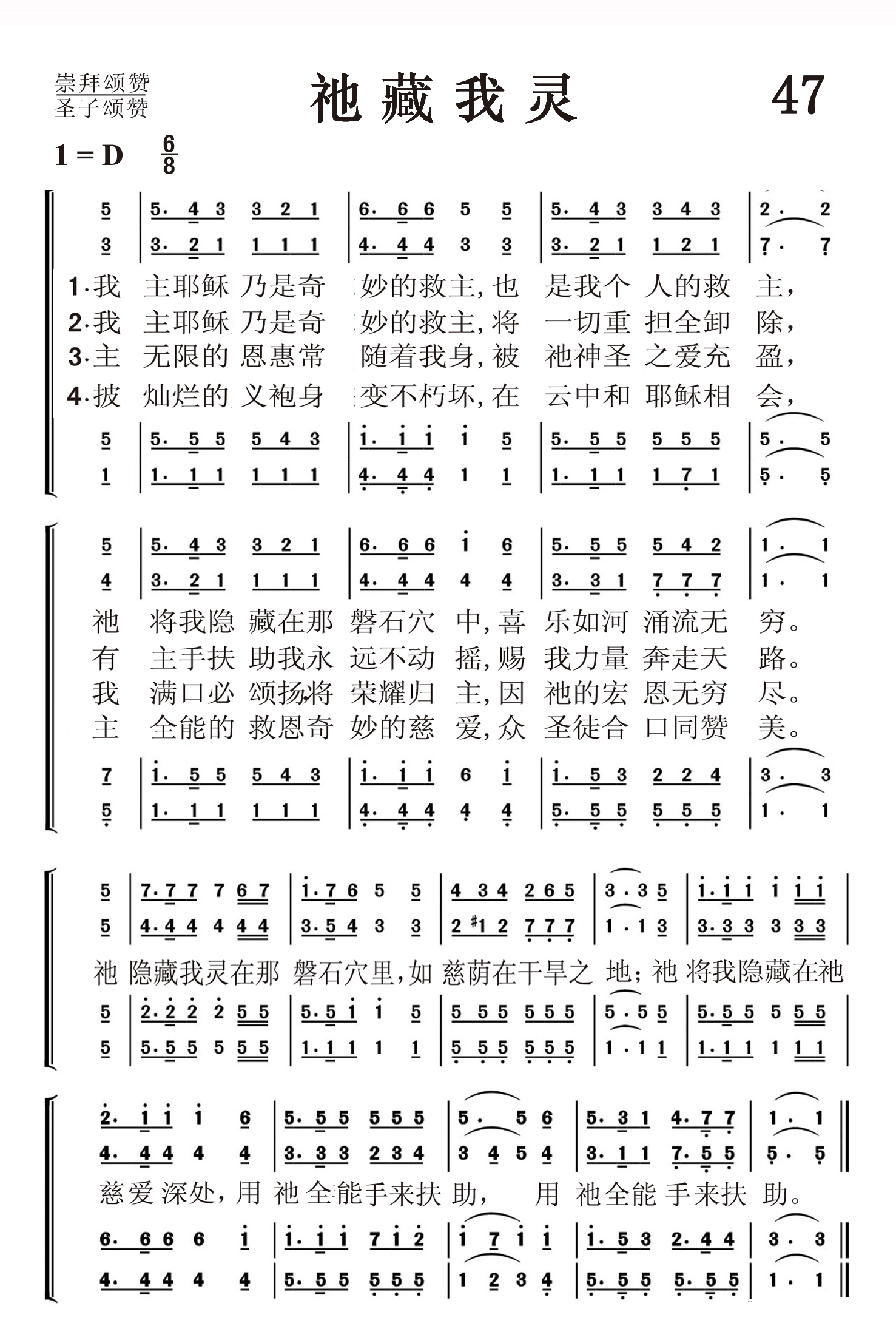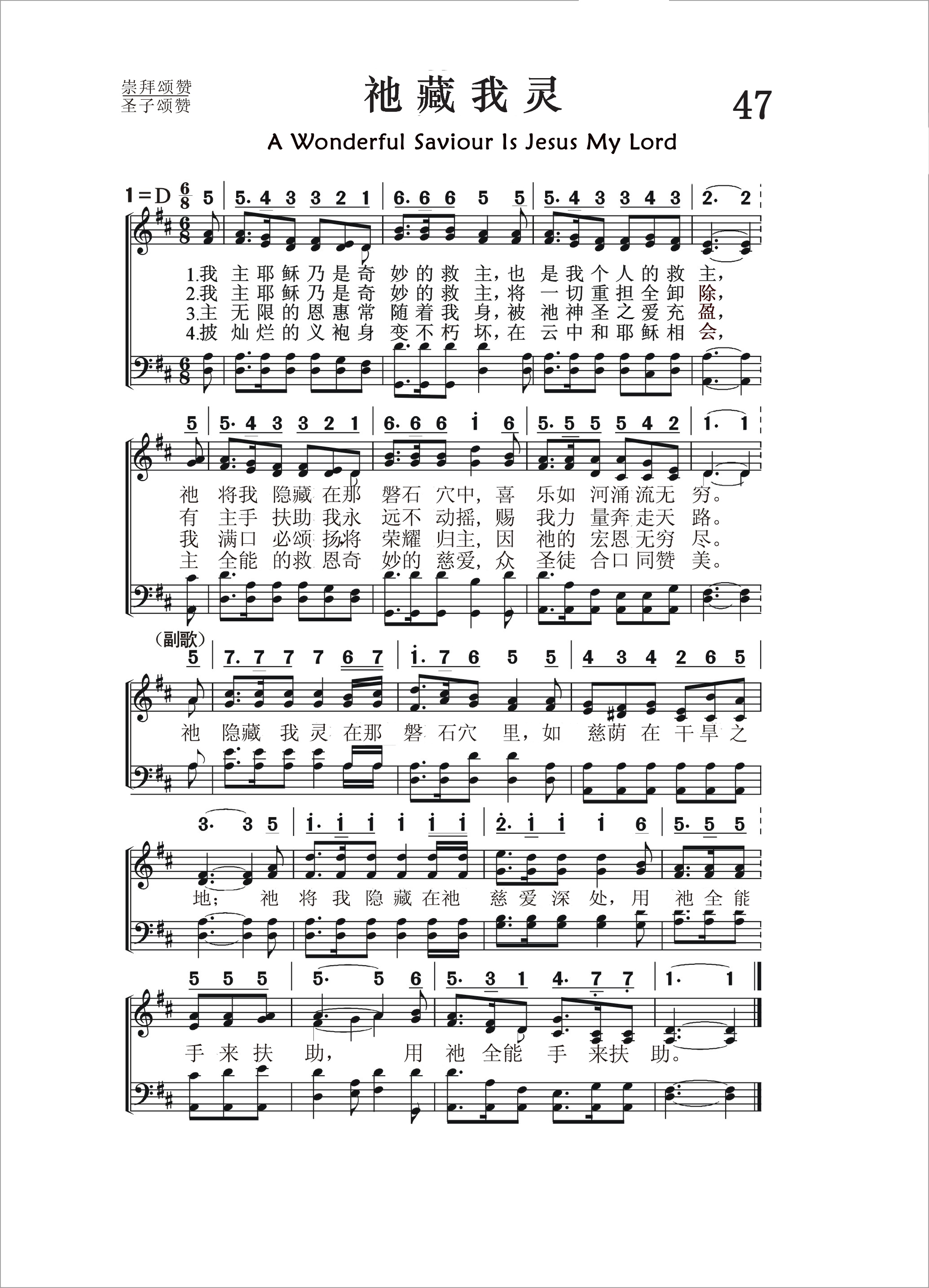 第47首祂藏我灵 A Wonderful Saviour Is Jesus My Lord 克罗斯比(1820-2015)作词,柯克帕特里克(W.J.Kirkpatrick,1838,2,27-1921,9,20)作曲 我主耶稣乃是奇妙的救主 ,也是我个人的救主, 祂将我隐藏在那磐石穴中 ,喜乐如河涌流无穷。 我主耶稣乃是奇妙的救主 ,将一切重担全卸除, 有主手扶助我永远不动摇 ,赐我力量奔走天路。 主无限的恩惠常随着我身, 被祂神圣的爱充盈, 我满口必颂扬,将荣耀归主, 因祂的宏恩无穷尽。 披灿烂的义袍身变不朽坏 ,在云中和耶稣相会, 主全能的救恩奇妙的慈爱 ,众圣徒合口同赞美。 祂将我隐藏在那磐石穴里, 如慈荫在干旱之地; 祂将我隐藏在祂慈爱深处, 用祂全能手来扶助。 在这首优美的诗歌中,作者凭着她属灵的视野,为我们展示了一幅救主慈爱的感人画面。祂是我们患难中随时的帮助,除去我们的一切重担,亲手扶助我们,使我们永不动摇。祂无限的恩典常伴随着我们,使我们发出由衷的感谢和赞美。在最后一节中,作者更把我们的视角推到基督复临时的荣耀,使诗歌在众圣徒的合唱中达到高潮。 词作者克罗斯比是美国才华出众,负有盛名的福音女诗人。她出生六个月时因庸医,误诊而双目失明。15岁时她就读于纽约最早的一所盲童学校。1847-1858年,她留在该校教授英语语法,修辞学,罗马史和美国历史。她少年时代就开始写诗,24岁时出版了《盲女与她的诗》,引起美国文坛的注意。1850年灵性奋兴的经验,使她集中全力专写圣诗,后在福音圣诗作曲家和编辑布雷得伯里的鼓励下,立志以创作福音圣诗作为自己的终生事业,于是与纽约一家出版社签订合同,每周写圣诗三首,结果写了5929首。此外,她还为布利斯写525首,为桑基写237首,为劳里写219首,为多恩写1500首。她一生共写了8440首圣诗,堪称为最多产的圣诗作家。 曲作者柯尔帕特里克是美国音乐出版家,宗教音乐作曲家。他出生于爱尔兰,自幼跟他父亲学音乐,以后受教于几个名师,青年时移居美国。南北战争时他参军,任军乐队吹笛手。1862年至1872年在美国费城做家具商,并在美以美会担任义工,曾任美国费城美以美会唱诗班指挥。同时他还作曲。他在1859年21岁时即开始编辑出版赞美诗工作,以后与斯托克顿.斯威尼合编出版约一百多部宗教音乐集和书刊。他谱写了不少信徒所喜爱的福音歌曲。 《颂赞诗歌》435首《主啊我正回家》(兼作词),26首《仍愿高唱》,79首《马槽歌》,98首《领我到髑髅地》,166首《至宝佳音》,232首《忍耐等候》,289首《高声福音号声》, 532首《抛碇于灵盘》,《赞美诗》(505版)294首《信靠耶稣》,也是柯克帕特里克作曲的。