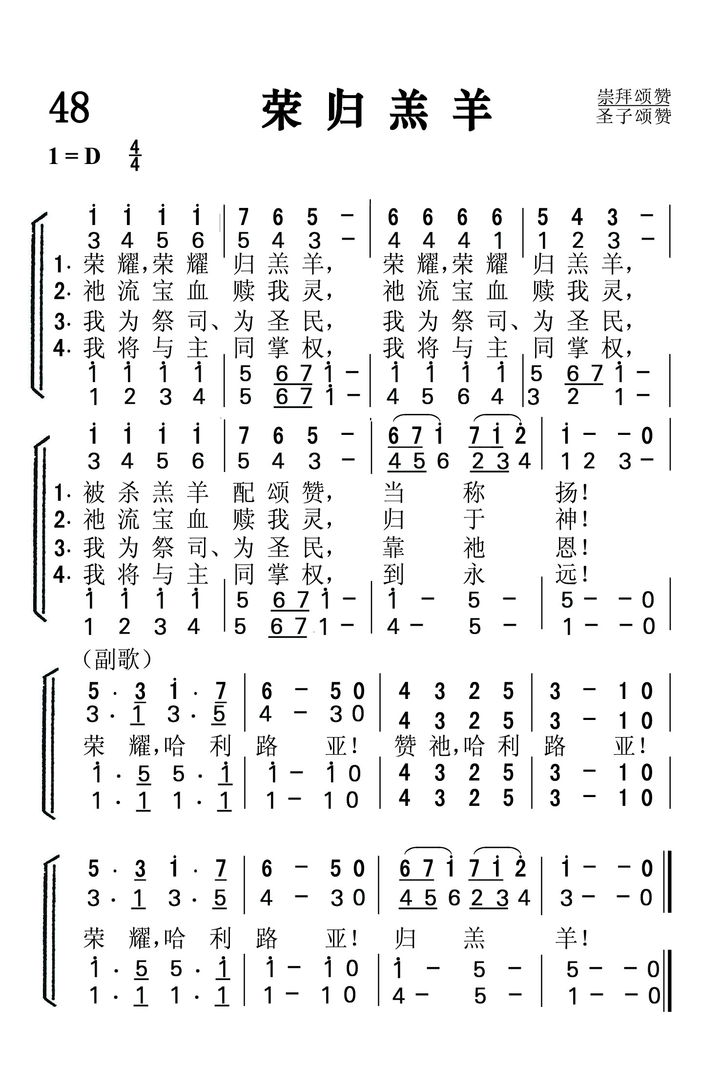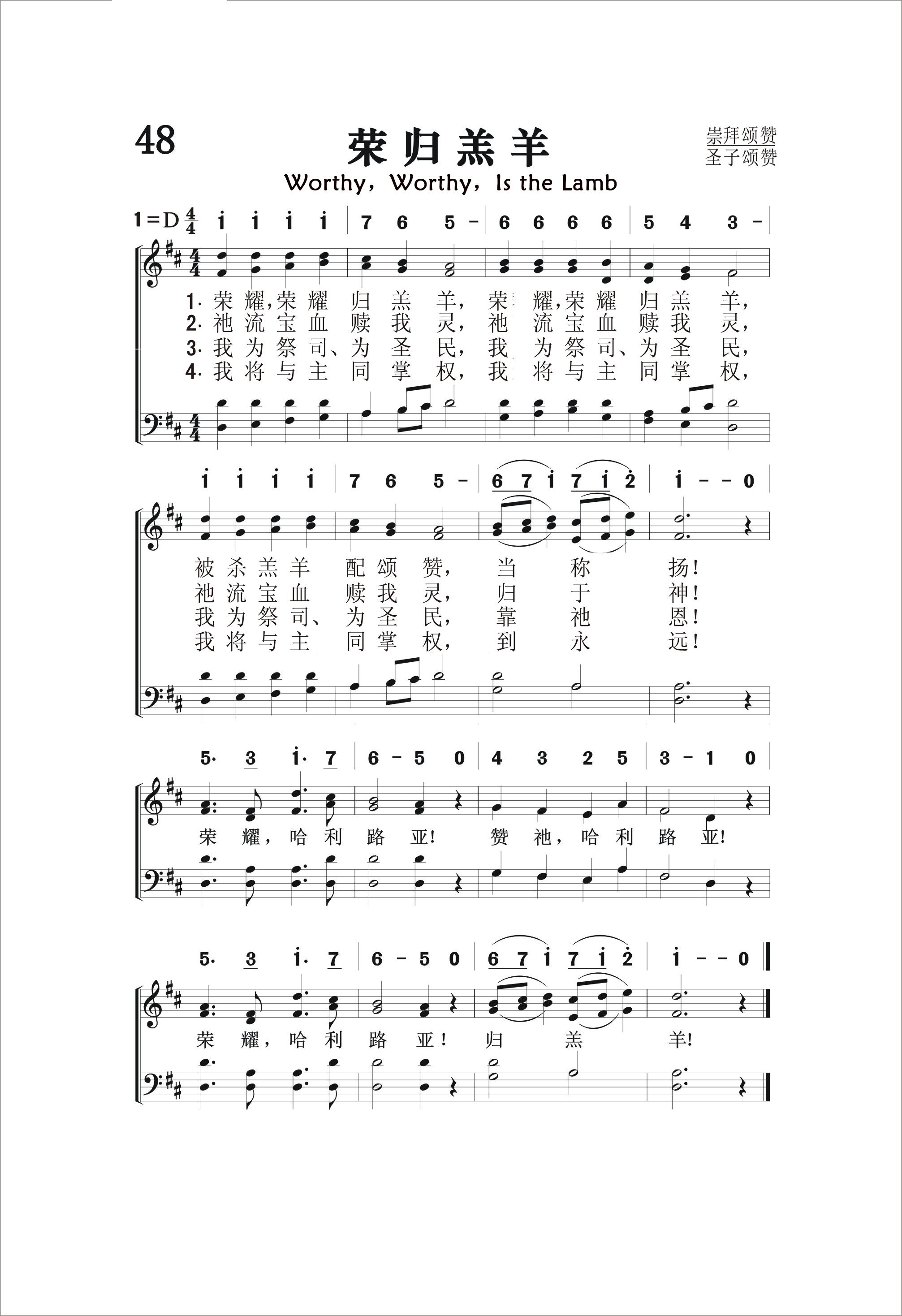 第48首荣归羔羊 Worthy,Worthy,Is the Lamb 威廉.佩顿.麦凯(William Paton Mackay, 1939.5.13-1885.8.22)作词;曲作者佚名 荣耀,荣耀归羔羊, 荣耀,荣耀归羔羊, 被杀羔羊配赞美 ,当称扬! 祂流宝血赎我灵,祂流宝血赎我灵, 祂流宝血赎我灵,归于神! 我为祭司、为圣民,我为祭司、为圣民, 我为祭司、为圣民,靠祂恩! 我将与主同掌权,我将与主同掌权, 我将与主同掌权,到永远! 荣耀,哈利路亚 !赞祂,哈利路亚! 荣耀,哈利路亚!归羔羊! 我们可以从这首气势雄伟的诗歌的字里行间看出,作者对被杀的羔羊基督耶稣有着无比崇敬的情感。作者还通过这首诗表达了上帝的儿女期盼天国降临,得蒙拯救,荣进锡安美地的迫切心情。诗歌的旋律也很优美,适合于合唱和齐唱。 词作者威廉.佩顿.麦凯出生于苏格兰蒙特罗斯,,毕业于爱丁堡大学医学院,行医多年以后,得蒙上帝选召,献身从事传道工作。1868年起,他担任长老会苏格兰赫尔教会牧师,直到1885年去世。他平生写过许多诗歌。这一首是最有名的。所依据的经文是“耶和华啊,求你在这些年间复兴你的作为”(哈3:2),和“你不再将我们救活,使你的百姓靠你喜欢吗”(诗85:6)?该诗写于1863年。1875年被桑基与布立斯编入《福音圣诗圣歌》,定名《主啊,恳求复兴圣工》,作为一首福音诗歌开始流传。