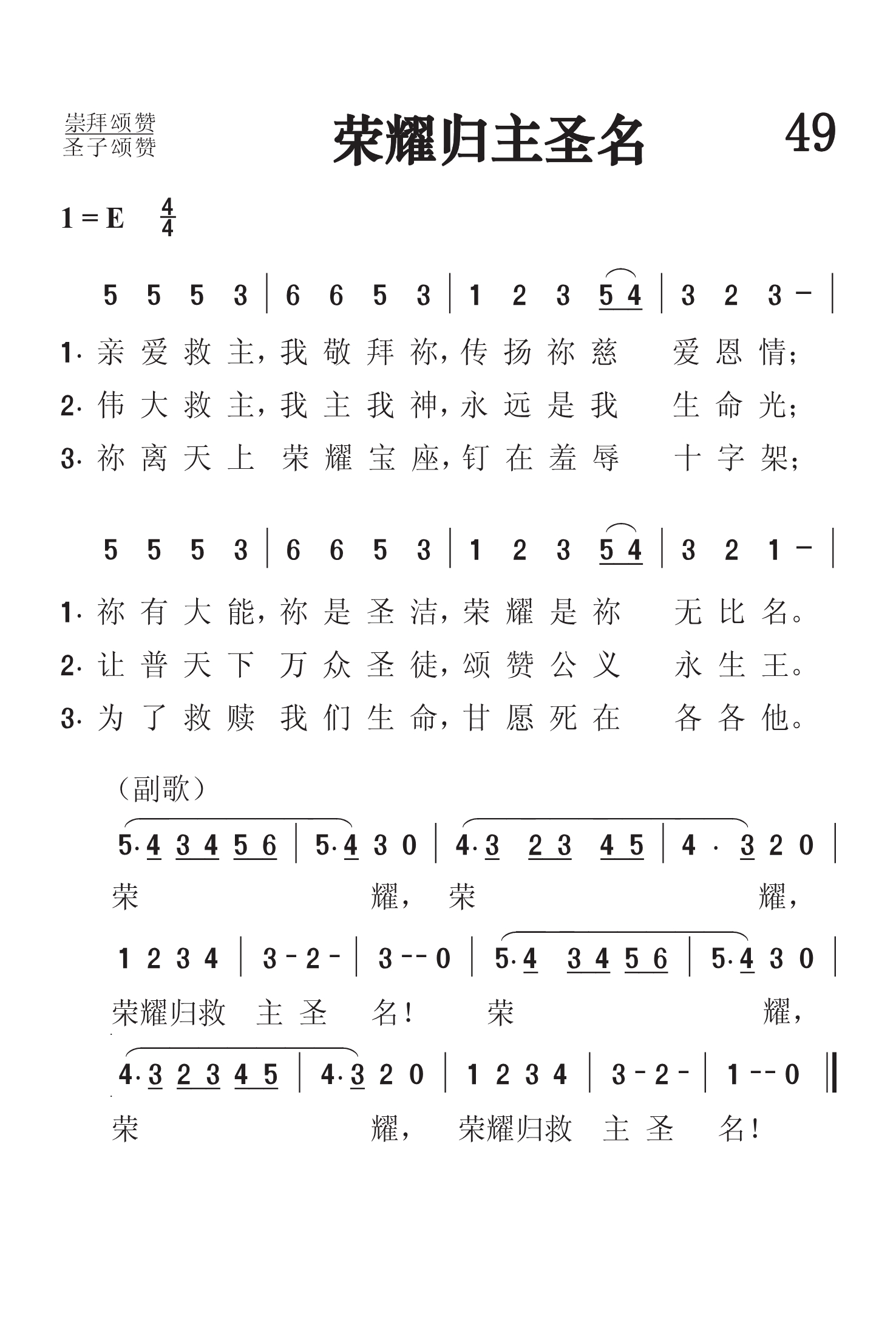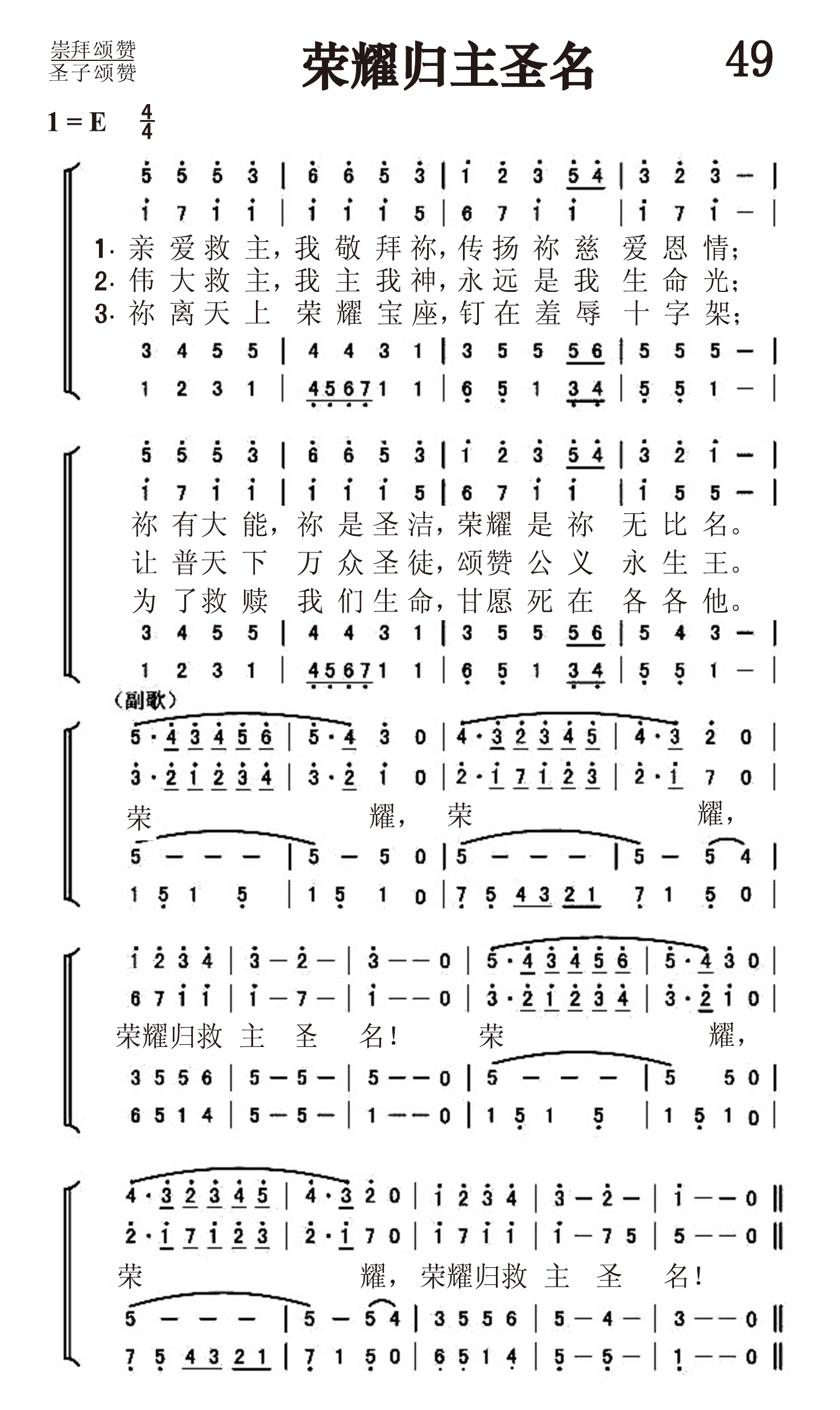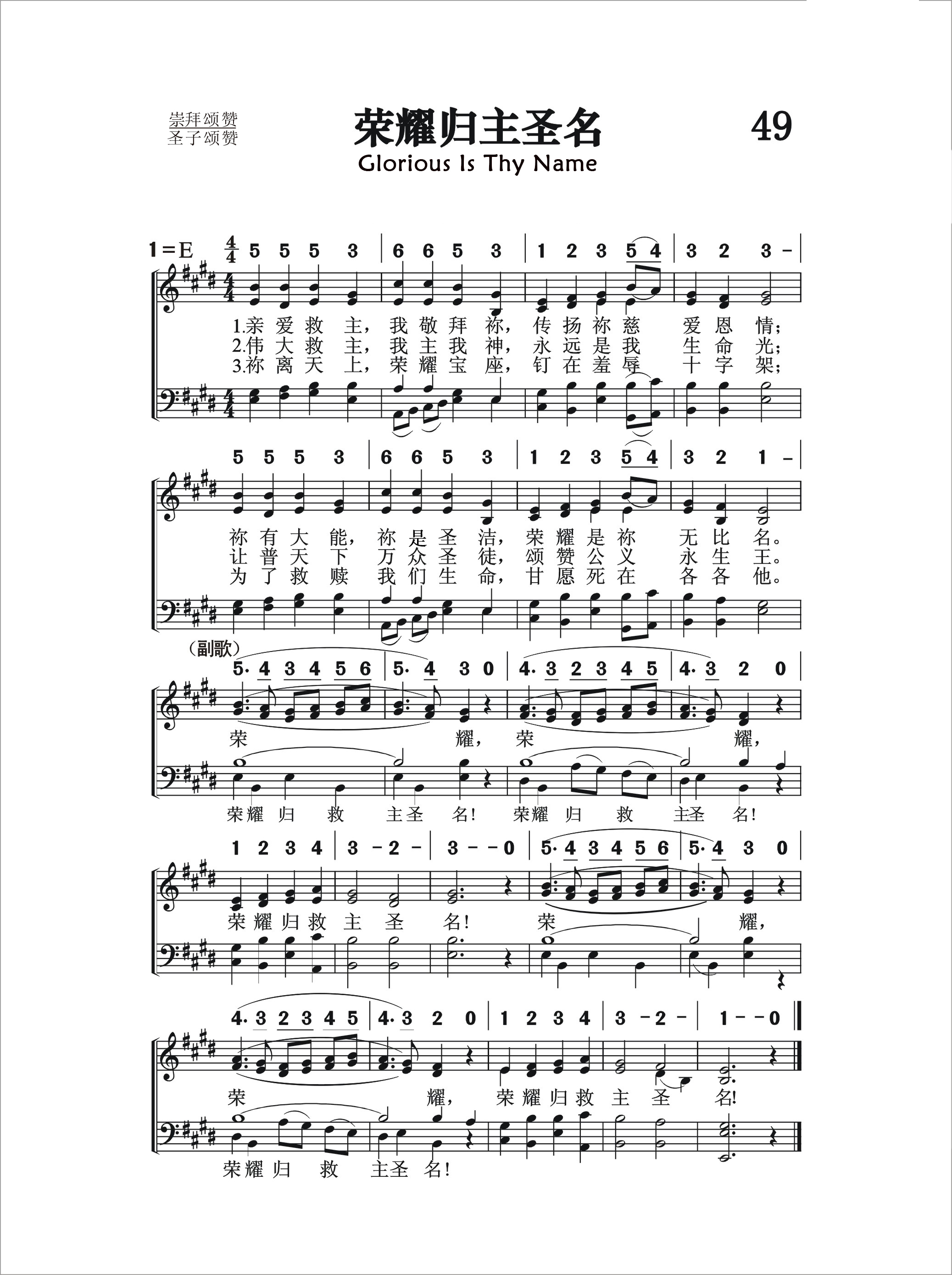 第49首 荣耀归主圣名 Glorious Is Thy Name 麦克金尼(Baylus Benjamin McKinney,1886,7,22-1952,9,7)作词作曲 亲爱救主,我敬拜祢 ,传扬祢慈爱恩情; 祢有大能,祢是圣洁 ,荣耀是祢无比名。 伟大救主,我主我神 ,永远是我生命光; 让普天下万众圣徒 ,颂赞公义永生王。 祢离天上荣耀宝座 ,钉在羞辱十字架; 为了救赎我们生命, 甘愿死在各各他。 麦克金尼出生于美国路易斯安娜州赫夫林,曾就读于路易斯安娜大学和得克萨斯州沃斯堡的西南浸信神学院。1919-1932年在西南浸信神学院任教。1818-1935年,他兼任达拉斯科尔曼音乐公司的音乐编辑;1931-1935年在沃斯堡任牧师。1935年,他成为田纳西州纳什维尔浸信会主日学委员会的音乐编辑。由麦克金尼作词作曲的赞美诗约有150首。此外他还创作了115首赞美诗曲谱。《荣耀归主圣名》是他的代表作品之一。