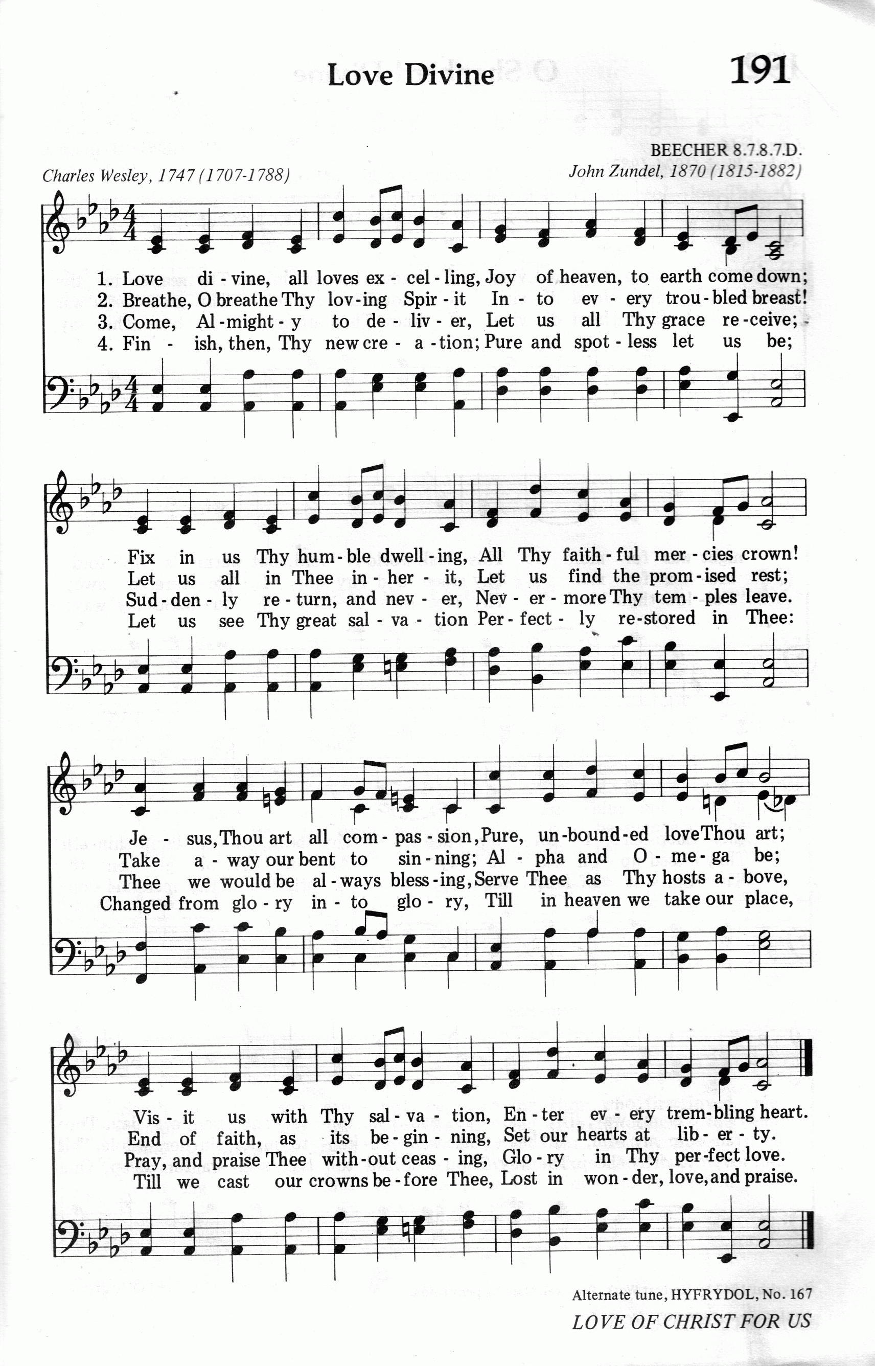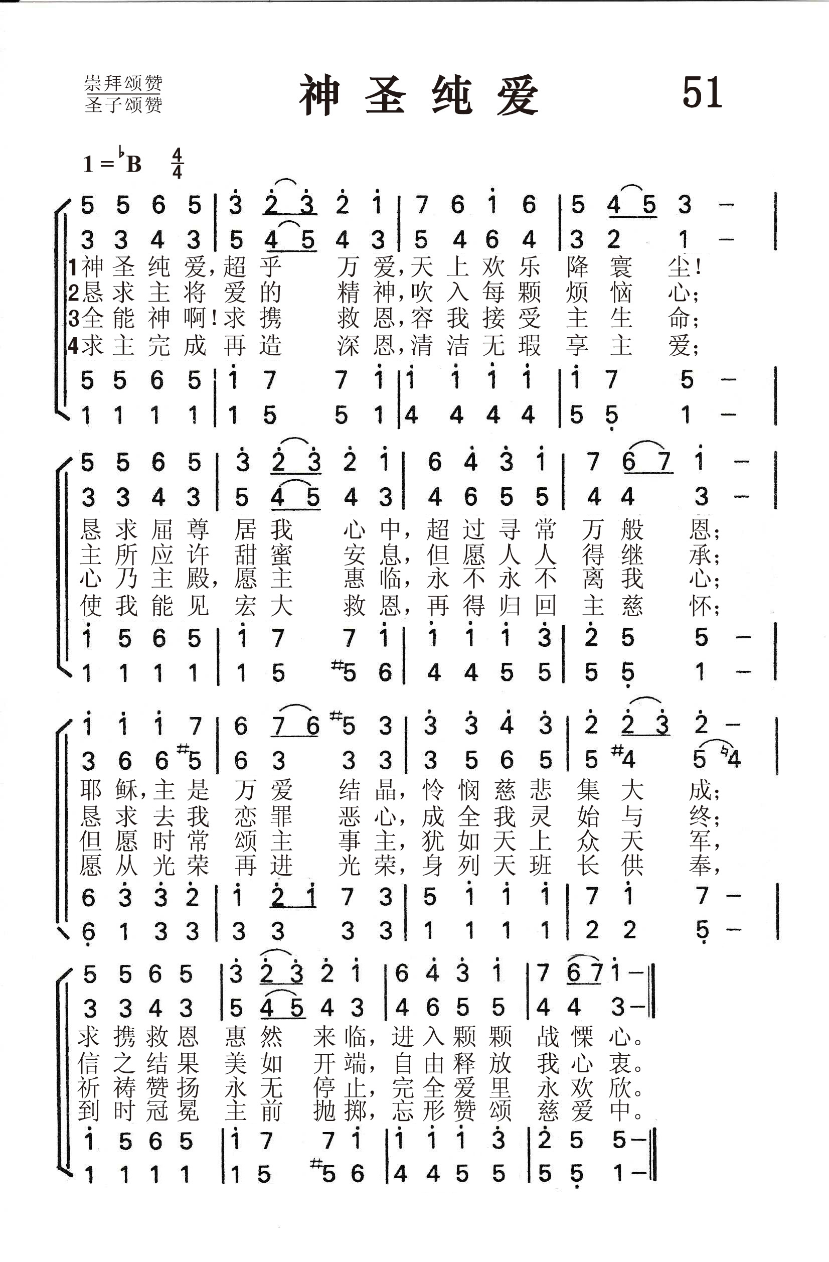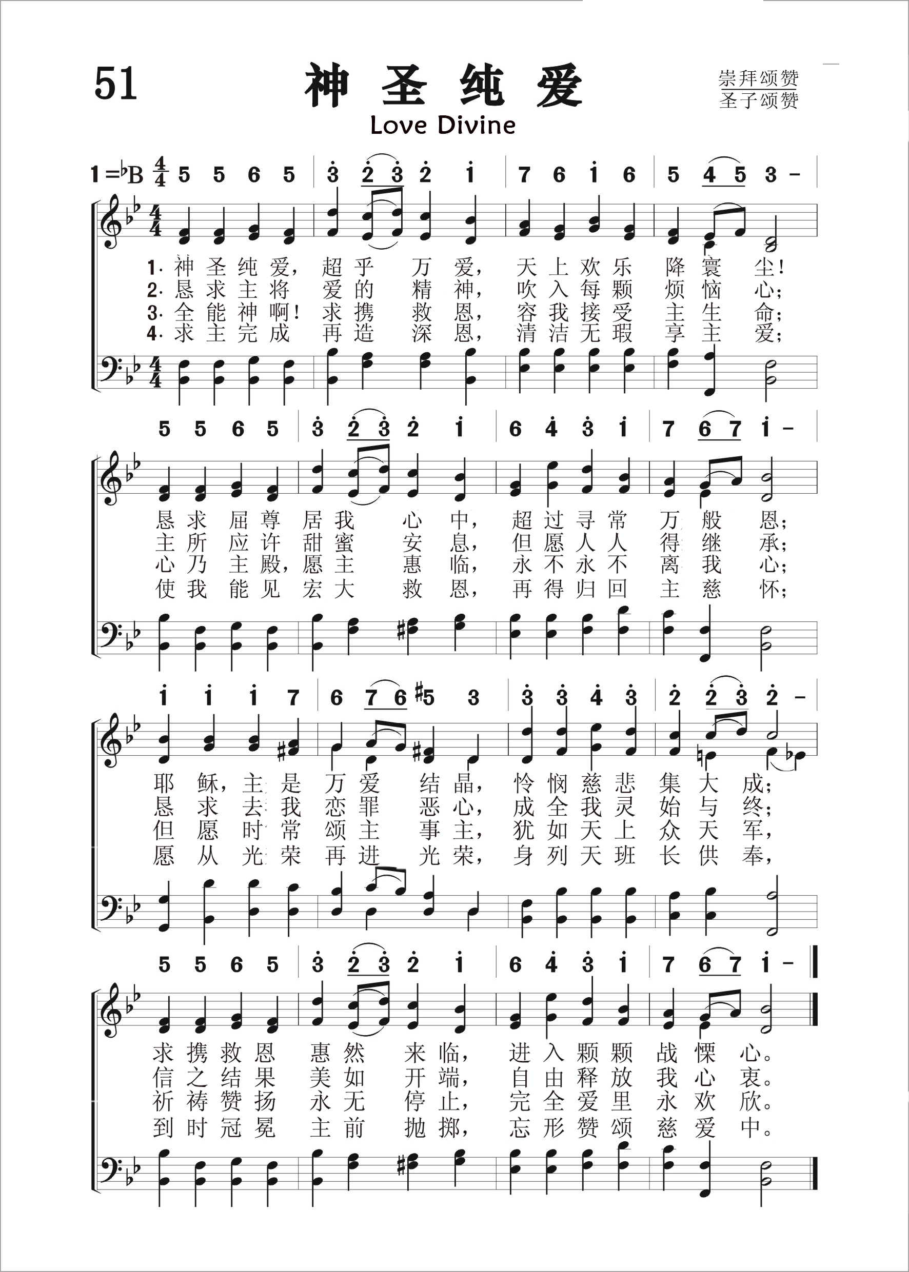 第51首神圣纯爱 Love Divine 查理.卫斯理(Charles Wesley,1707,12,18-1788,3,29)作词(1747年),曾德尔(John.Zundel,1815,12,10-1882,7)作曲(1870年),刘廷芳原译(1833年) 神圣纯爱超乎万爱,天上欢乐降寰尘! 恳求屈尊居我心中,超过寻常万般恩; 耶稣,主是万爱结晶,怜悯慈悲集大成, 求携救恩惠然来临,进入颗颗战栗心。 恳求主将爱的精神,吹入颗颗烦恼心, 主所应许甜蜜安息,但愿人人得继承, 恳求去我恋罪恶心,成全我灵始与终; 信之结果美如开端,自由释放我心衷。 全能神啊!求携救恩,容我接受主生命, 心乃主殿愿主惠临,永不永不离我心; 但愿时常颂主事主,犹如天上众天军, 祈祷赞扬永无停止,完全爱里永欢欣。 求主完成再造深恩,清洁无瑕享主爱, 使我能见宏大救恩,再得归回主慈怀, 愿从光荣再进光荣,身列天班长供奉, 到时冠冕主前抛掷,忘形赞颂慈爱中。 这是卫斯理最有价值的圣诗之一,表现了他崇高的信仰和对于上帝之爱的信靠。这种奇妙的大爱,超乎世界上一切情爱,无比纯洁和慈怜,实在令人五体投地,赞叹不绝。 查理. 卫斯理素有卫斯理运动歌手之称,一生共写圣诗约六千五百首,其中四千余首曾发表过。目前在世界各地教会通用的仍有五百来首,可以说是空前的了。他和他哥哥约翰. 卫斯理(1703—1791)在英美倡导教会奋兴布道运动。它的成功得力于圣诗的传播。当时教会腐败,教牧人员在礼拜时敷衍了事,信徒信心冷淡;社会道德低落,赌博成风,偷盗盛行。卫斯理兄弟以复兴教会为己任,在牛津大学期间,曾邀集同道组织“圣社”,依照英国圣公会公祷书的规定和圣书的记载过宗教生活,被称为“循规蹈矩者”,这就是后来风行英美的韦斯利运动。他们那新兴的教会就被称为卫斯理宗,又称循理宗或循道宗。但卫斯理兄弟始终都是英国圣公会的牧师。他们于1735-1738年应英国教会之聘前往美洲传教。查尔斯. 卫斯理还任乔治亚殖民地总督詹姆斯.奥格尔索普的秘书。后来,因传道没什么效果,就乘船回国。在航程中帆船经历大西洋的滔天波浪。卫斯理和旅客们都惊恐万分,惧怕葬身大海。唯有几位摩拉维亚弟兄会的同道镇静自如,怡然不改其乐,颂歌不绝于口,给卫斯兄弟留下了深刻的印象。回国后他们开始与摩拉维亚的弟兄交往,参加他们的聚会,深受他们的影响。1738年5月11日,查尔斯首先得到了重生的经历。三天以后,约翰也得到了灵性的复兴。从此以后,二人灵力充沛,到处布道,成效显着。他们逐渐改变了英国圣公会的传统传教方式,面向工矿劳工和城市平民,宣传内心的平安,属灵的快乐和通道的幸福,追随者日益增多,并且大都能身体力行,努力从事切实可行的服务工作,如办学校,设医院,到监狱里探望犯人,并向他们布道,掀起了一个奋兴布道运动,在一定程度上扭转了当时的社会风气。 卫斯理弟兄三人(另一位是长兄塞缪尔. 卫斯理)都非常喜爱赞美诗。他们立下了唱诗规则: 一、学会曲调,照着曲谱来唱; 二、从头唱到完,克服困难学好; 三、有精神地唱; 四、要恭敬谦卑地唱,不要大喊大叫; 五、注意节奏,不可太快太慢; 六、用心灵来唱,字字句句都为荣耀上帝。 查理. 卫斯理布道时,常骑着马,心有灵感时,立刻就记下,回家后,再将该诗写出。 曲作者曾德尔是原籍德国的音乐家,曾去俄国彼得堡圣安娜路德教堂任管风琴师和军乐队指挥。1847年到美国从事圣乐工作达三十年,。晚年又回德国至去世。曾德尔在一生中创作了许多圣乐作品,并写过一些音乐专着。本曲发表以后,其和声结构曾引起一些争议,但终为大家所接受。曲调名《Beecher》,是为纪念他的亲密同工比彻牧师。