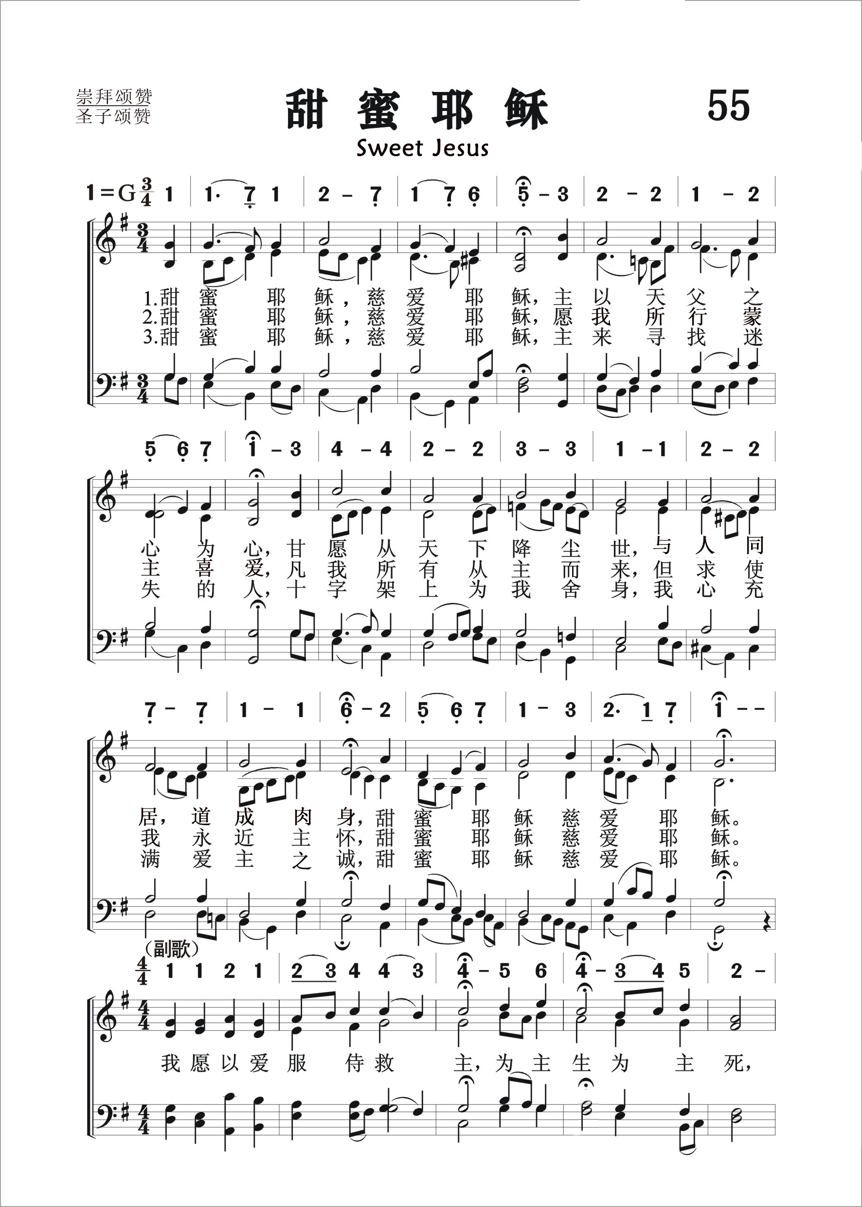 第55首甜蜜耶稣 Sweet Jesus 巴赫(J.S.Bach,1685,3,21-1750,7,28)作曲 甜蜜耶稣,慈爱耶稣,主以天父之心为心, 甘愿从天下降尘世,道成肉身与人同住, 甜蜜耶稣,慈爱耶稣。 甜蜜耶稣,慈爱耶稣,愿我行我主喜悦的事, 凡我所有从主而来,但求使我永近主怀, 甜蜜耶稣,慈爱耶稣。 甜蜜耶稣,慈爱耶稣,主来寻找迷失的人, 十字架上为我舍身,我心充满爱主之诚, 甜蜜耶稣,慈爱耶稣。 我愿以爱服侍救主,为主生,为主死, 生命永不消逝。 永永远远与主同住,永欢欣,永平安, 生命永无止息。 J.S.巴赫是一位虔诚的基督徒。他15岁就参加教堂唱诗班,长期从事教会音乐和宫廷音乐工 作。在他浩如烟海的作品中,教堂音乐占了很大的比例。其传世之作包括《尊主颂》,《约翰受难曲》(1723年),《马太受难曲》(1729年),《圣诞清唱剧》(1734年),《B小调弥撒曲》,康塔塔198首,经文歌6首。他还创作了大量的管弦乐曲,古钢琴曲,管风琴曲,室内乐和世俗合唱曲,是当之无愧的巴洛克时代的音乐大师。 《赞美诗》(505版)第110首《长夜将尽》和133首《欢乐歌声上腾》也是巴赫编配和声的。