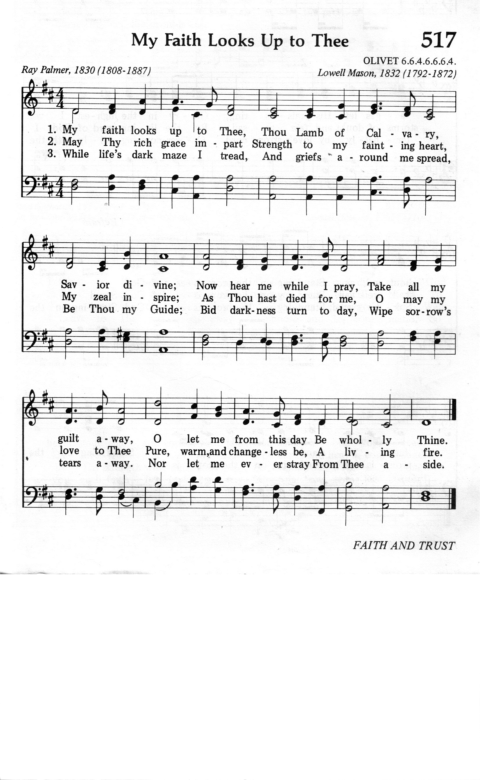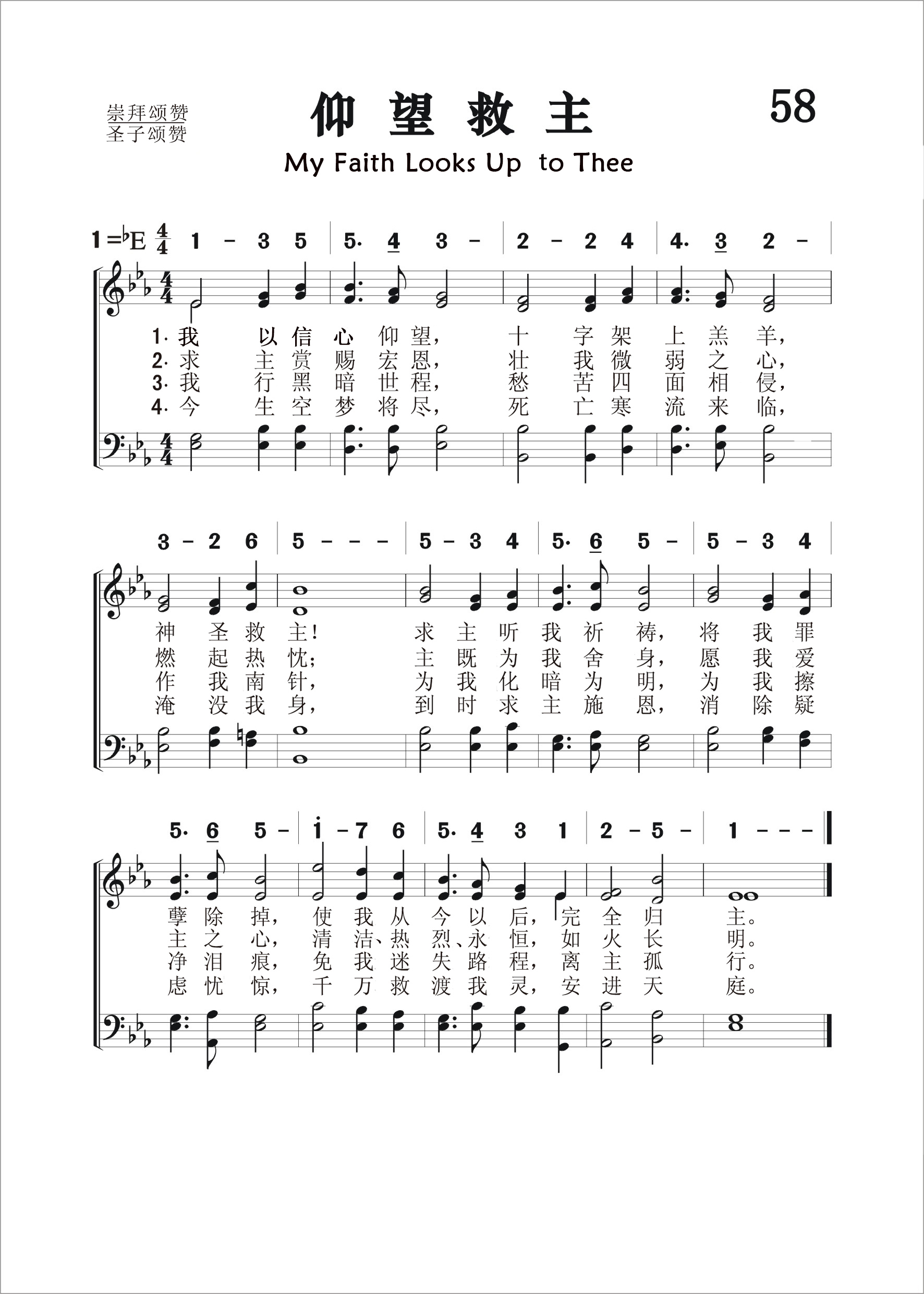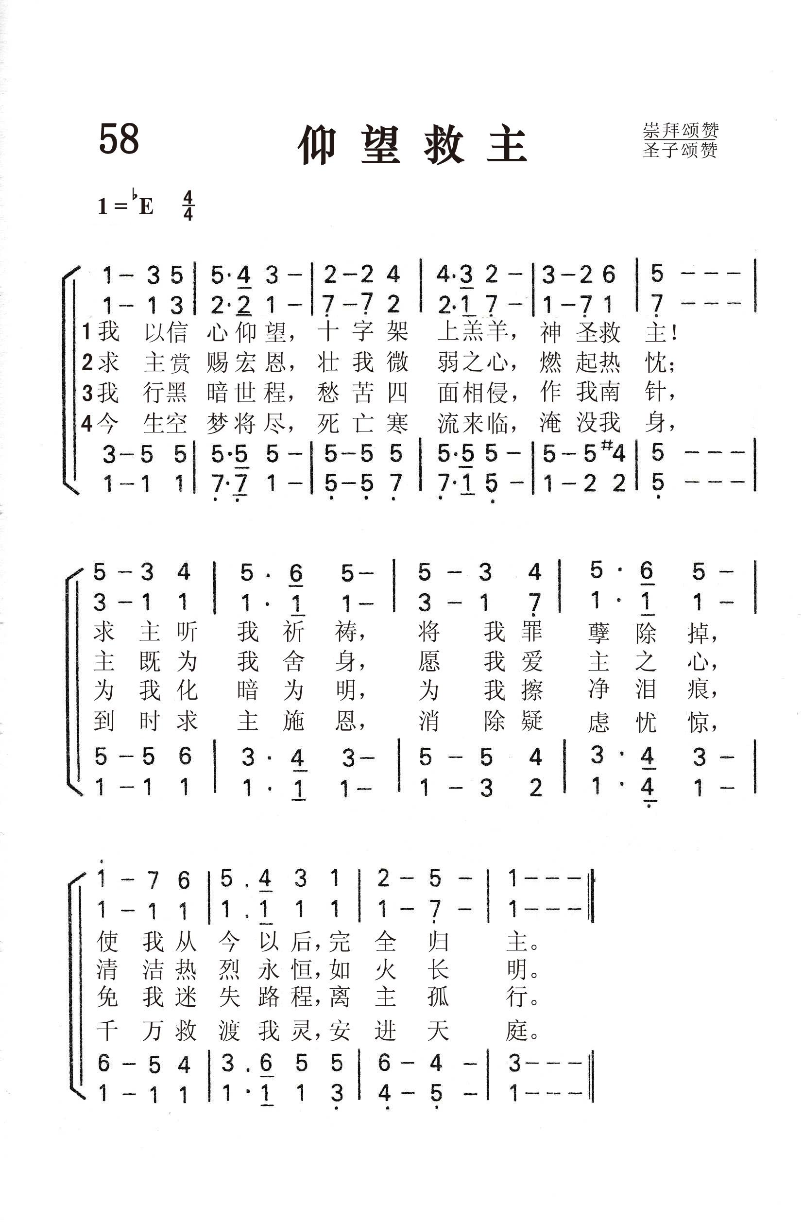 第58首仰望救主 My faith looks up to thee R . 帕尔默(Ray.Palmer 1801,11,12—1887,3,29)作词(1830年), 梅森(Lowell Mason,1792,7,8-1872,8,11)作曲(1832年) 我以信心仰望,十字架上羔羊,神圣救主! 求主听我祈祷,将我罪孽除掉, 使我从今以后,完全归主。 求主赏赐宏恩,壮我微弱之心,燃起热忱; 主既为我舍身,愿我爱主之心, 清洁、热烈、永恒,如火长明。 我行黑暗世程,愁苦四面相侵,作我南针, 为我化暗为明,为我擦净泪痕, 免我迷失路程,离主孤行。 今世空梦将尽,死亡寒流来临,淹没我身, 到时求主施恩,消除疑虑忧惊, 千万救渡我灵,安进天庭。 这是美国公理会牧师雷.帕尔默二十四岁时所写的一首诗歌。他当初写的时候,只是叙述自己的感想,从没想到它能被用于公共礼拜,更没有想到它竟成为普世信徒传颂不衰的一首灵修圣诗。当时他刚出校门,而且经济困难,健康欠佳,就以他“微弱之心”仰望十字架上的羔羊。据他后来回忆说:“我写这首诗的时候,手里拿着笔,随着心里的感动,挥笔直书,写来并不感到为难。起初,我还能心平静气地写,但写到最后两句——‘千万救赎我灵,安进天庭’时,我的眼泪不由夺眶而出。” 帕尔默写完后,便把它夹在一本笔记里,放在衣服口袋内。两年后,有一天在路上遇见他的朋友梅森,梅森告诉他说正与黑斯廷斯合编一本圣诗集,问帕尔默有没有作品可以投稿。帕尔默漫不经心地从口袋里拿出这首诗稿交给梅森。梅森读了一遍,深受感动,连忙跑到附近一家小铺的柜台上抄了一份,回家后就为该诗配了曲,即现在流行各地的《橄榄山(Olivet)》,首先在梅森与黑斯廷斯合编的《公共礼拜灵歌集》内发表。出版后,梅森又遇到了帕尔默,微笑地拍着他的肩膀说:“帕尔默先生,也许你将来会作许多事令人景仰纪念,但我认为最会使你闻名遐迩的却是因为你是《仰望我主》的作者。” 梅森的预言果然不错,帕尔默虽然后来著述出版了11卷神学著作,写了许多圣诗,也翻译了不少拉丁圣诗,其中包括伯尔纳的《慕主歌》,都很受欢迎,但不及这首《我心仰望我主》。因为这首诗以基督徒生活中最重要却有最简单纯朴的行动——信赖十字架上的羔羊,最受人们的欢迎,尊崇和敬佩。有人称它是美国人所写的一首最有名,最精彩,最感动人的圣诗,曾被译成许多国的文字。 这首诗的原题为《自我献身》,是一首敬虔祷告的圣诗。全诗始终表达了真诚悔改与得救的信心,是信徒蒙恩的经历。第一节:悔改与献心;第二节:在基督徒服务中祈求刚毅,热忱与爱心;第三节:在患难困苦中祈求神的恩佑和引导;第四节则祈求能生活的终于得到稳妥快乐的永生。所以它是许多信徒战胜死亡恐惧的动力。临终时的安慰。 雷.帕尔默幼年时因家贫不能进学校受教育,13岁就到一家干果行当小伙计,靠他自己努力学习文化,终于以优异的成绩考进耶鲁大学。并获得了奖学金。他大学毕业后,于1830年前往纽约攻读神学,并在一所女校兼课。1835年,他被按立为牧师。后来他担任美国公理会联合会秘书,帮助建立六百余个教会。他还创作出版了11卷神学著作,写了许多圣诗,并翻译了不少拉丁圣诗,包括伯尔纳的《慕主歌》,都很受欢迎。 圣乐音乐家梅森出生于美国马萨诸塞州的梅德菲尔德。幼年在校时就喜欢音乐,16岁时已成了乡村教堂唱诗的指挥。1812年迁居乔治亚州,在一家银行当办事员,同时在长老会礼拜堂任管风琴师及唱诗班指挥,并开始学习和声学和作曲。他自编了一本《圣乐曲调集》,送到好几家印刷长和出版社去,虽然讲明不要稿费,也没有一家肯承印。后经波士顿亨德尔.海顿音乐社出资代印,结果销路之广,出人意料,大大鼓舞了梅森,使他决定以音乐为他的终生事业。1827年他迁居波士顿,当选为亨德尔及海顿学会主席,并任教堂唱诗班指挥十四年。1829年编辑出版了第一本《儿童赞美诗》。他为了培养训练儿童唱诗,创办成立波士顿音乐学院,专门训练儿童唱歌。1834年又在音乐学院内成立了培训儿童音乐的教师培训班。他还负责出版音乐杂志,编辑出版了80多种诗歌集,创作诗歌曲谱1126首,改编496首,对提高美国的音乐水平,改善教会圣乐方作出突出贡献,为19世纪美国音乐界最有影响的人物。1835年纽约大学授予他第一位音乐博士学位,以表钦仰。 《颂赞诗歌》第160首《无比之爱》,第84首《普世欢腾》(1830年),第184首《欢乐安息日》(1839年),第188首《以安息日为圣日》(1824年),第238首《我家在天》,第250首《主内团契》(1845年),251首《晨祷》,第270首《流血之泉》,第284首《传遍各国》(1823年),第328首《爱惜光阴》,第499首《天国之后嗣》,第510首《更与我主亲近》(1856年),《赞美诗》506版《赞美诗》第95首《思想十架》,128首《在世我为客旅》, 197首《公义审判之主》(1836年),228首《颂主作王》, 262首《耶稣邀请圣民》(1850年),271首《向主献呈》, 505版第103首《我心之乐》,第144首《宝贵圣书》(1830年),第240首《为主而生》(1836年),第246首《竭力寻求》(1836年),第338首《务要提防》(1830年),第345首《还有几年光阴》,第419首《传扬救恩》(1823年),第439首《六日工作完毕》(1830年)也是梅森作曲或改编的。