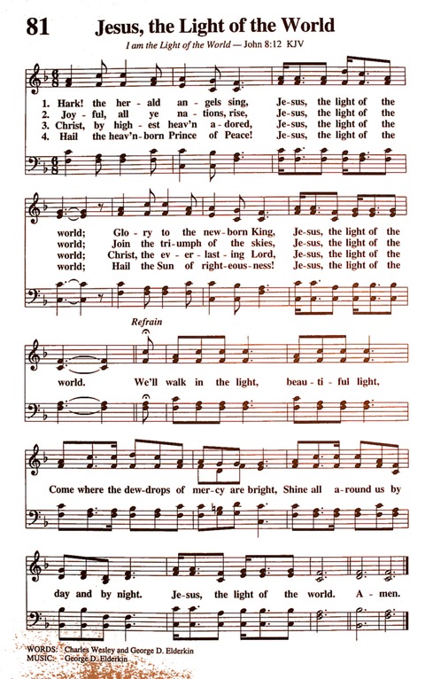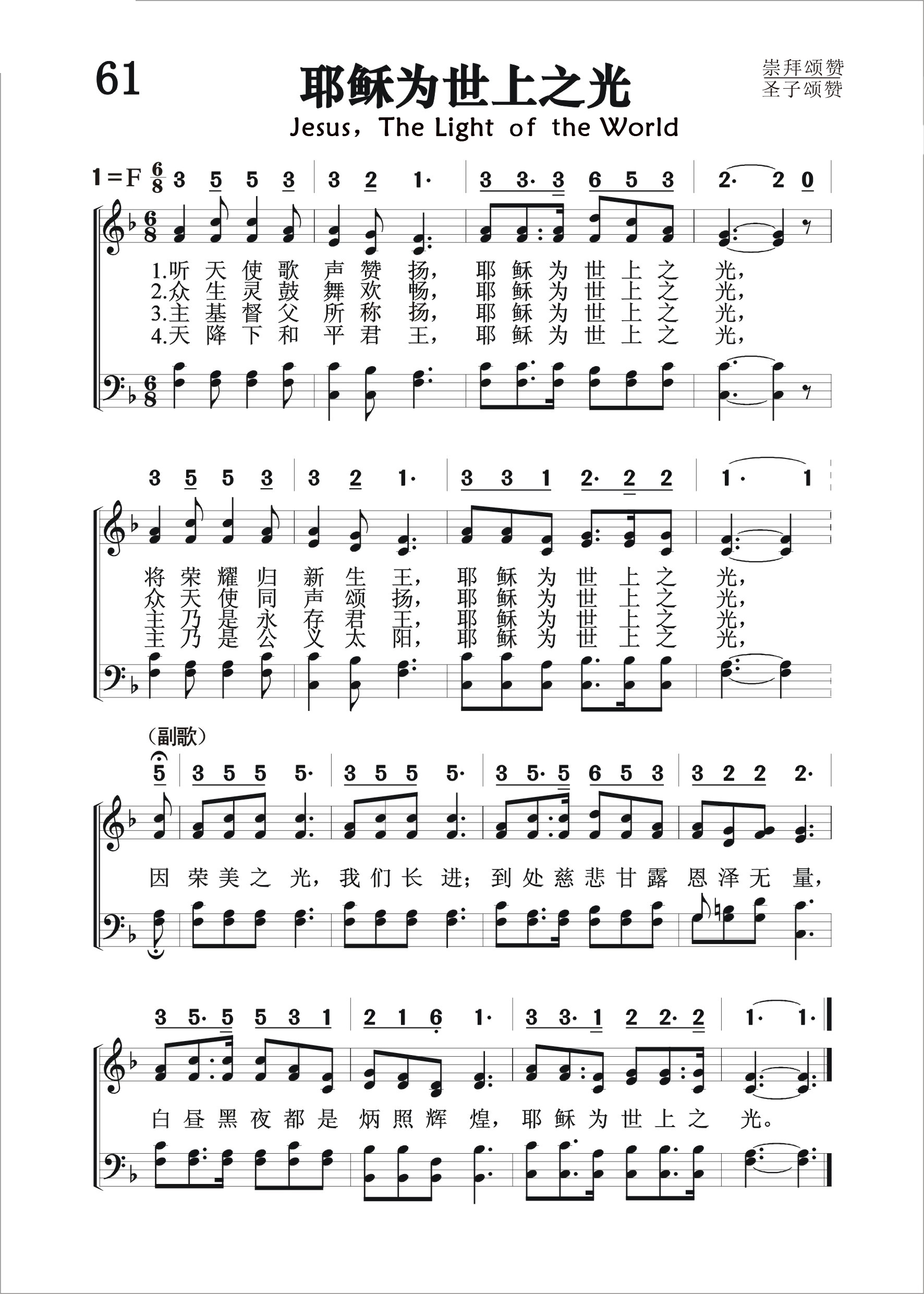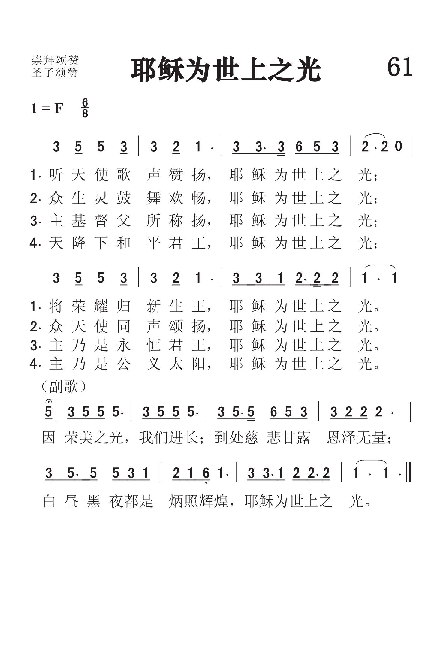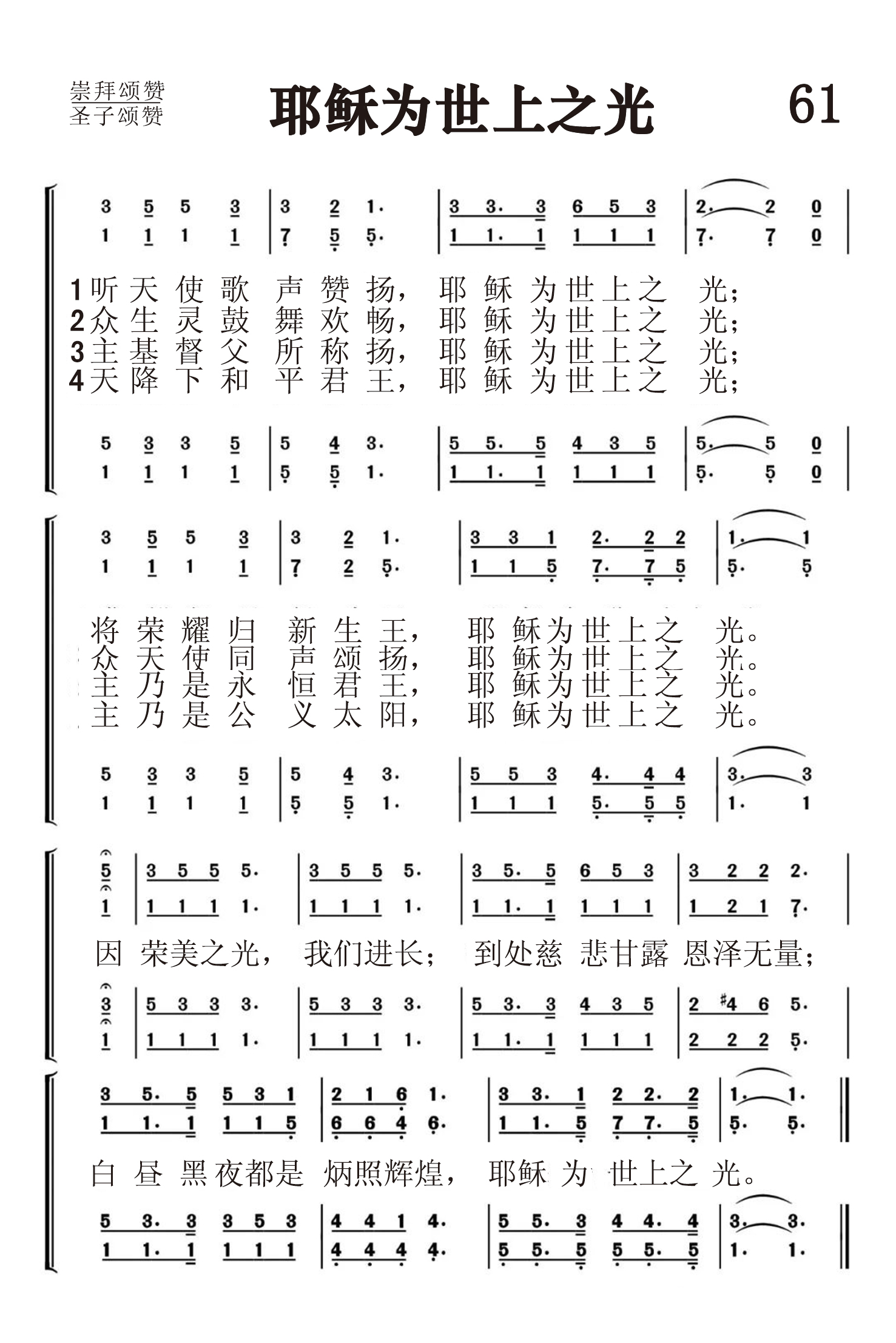 第61首耶稣为世上之光 Jesus,the Light of the World 埃尔德金(George D.Elderkin,1845-1928)改编 听天使歌声赞扬,耶稣为世上之光; 将荣耀归新生王,耶稣为世上之光。 众生灵鼓舞欢畅,耶稣为世上之光; 众天使同声颂扬,耶稣为世上之光。 主基督父所称扬,耶稣为世上之光; 主乃是永恒君王,耶稣为世上之光。 天降下和平君王,耶稣为世上之光; 主乃是公义太阳,耶稣为世上之光。 因荣美之光,我们进长,到处慈悲甘露恩泽无量; 白昼黑夜都是炳照辉煌,耶稣为世上之光。 本诗的原作者已无从知晓,改编者乔治.埃尔德金曾编辑过七本赞美诗集。他自己作词的有溜首,作曲的有七首。 本诗以耶稣为世上之光为主题,尽情颂赞主的恩德。主耶稣是自天而降的生命之光,是公义的日头,照亮一切生在黑暗之中的人,无论白昼黑夜均炳照辉煌,祂也是基督徒属灵成长的甘露和时雨。