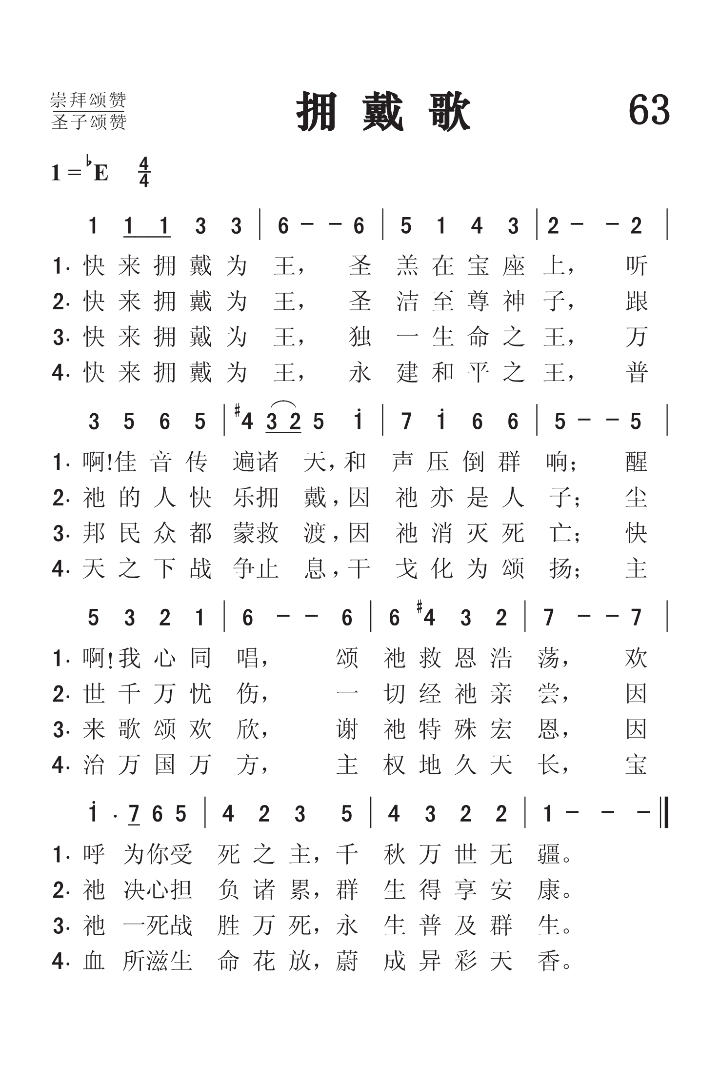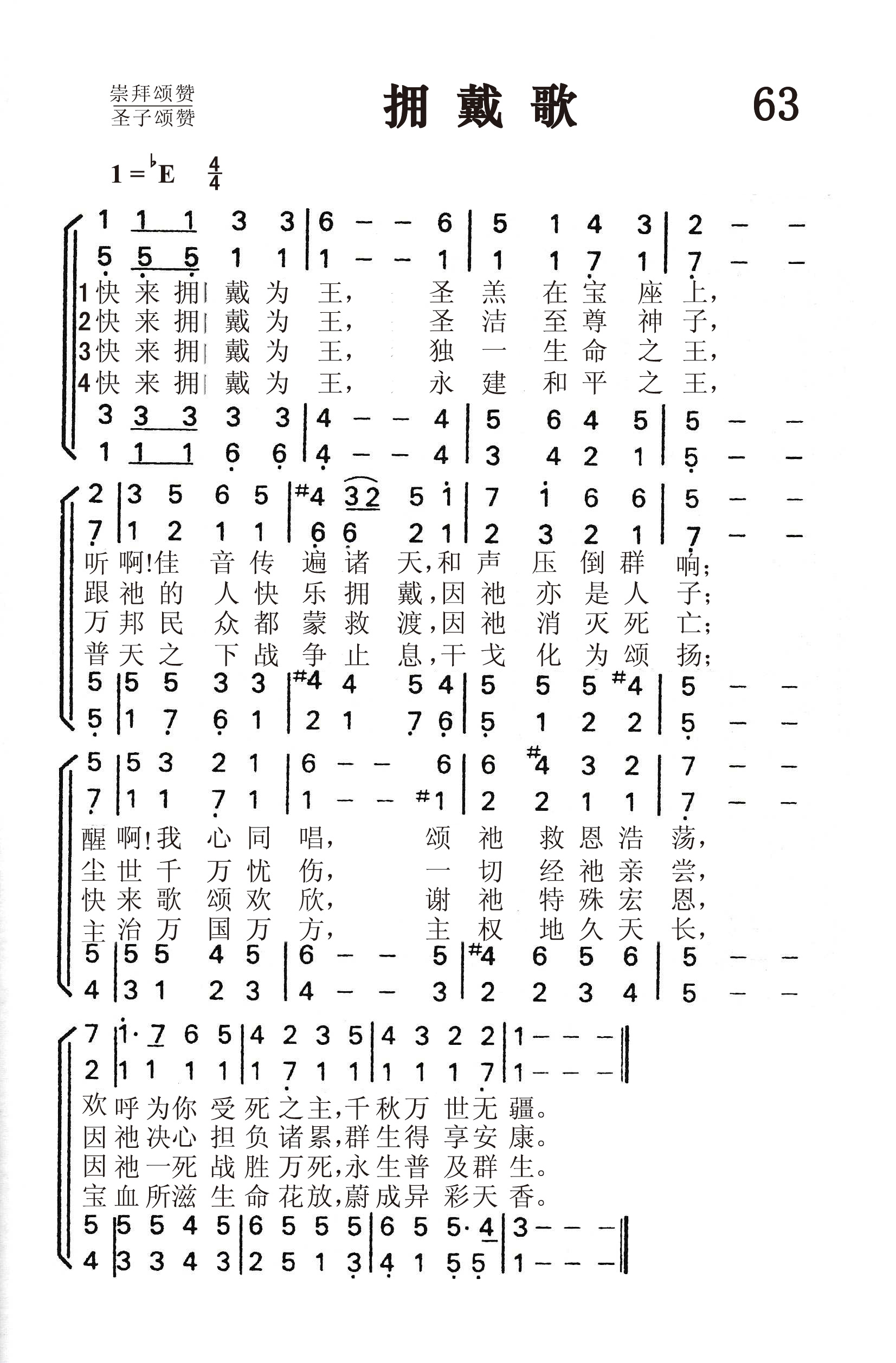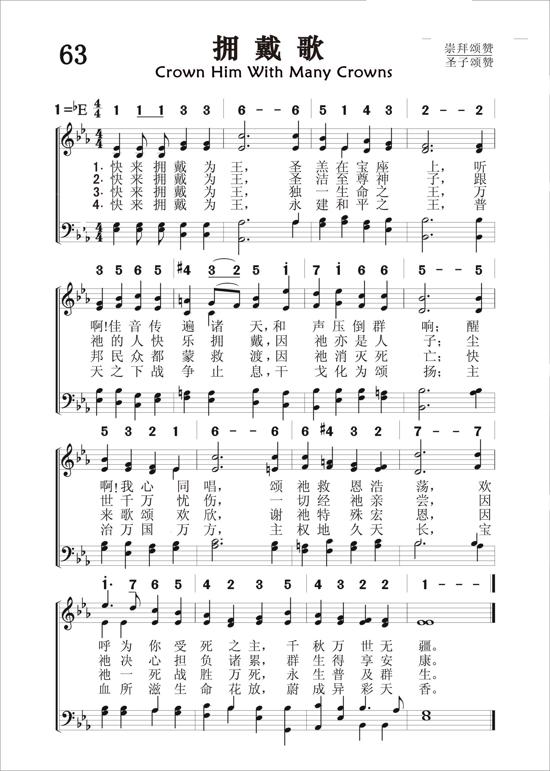 第63首拥戴歌 Crown Him With Many Crowns 布里奇斯(M.Bridges,1800,7,14-1894,10,6)作词(1851年),埃尔维(G.J.Elveg,1816,3,27-1893,12,9)作曲(1868年),刘廷芳译(1932年) 快来拥戴为王,圣羔在宝座上, 听啊!佳音传遍诸天,和声压倒群响; 醒啊!我心同唱,颂祂救恩浩荡, 欢呼为你受死之主,千秋万世无疆。 快来拥戴为王,圣洁至尊神子, 跟祂的人快乐拥戴,因祂亦是人子; 尘世千万忧伤,一切经祂亲尝, 因祂决心担负诸累,群生得享安康。 快来拥戴为王,独一生命之王, 万邦民众都蒙救渡,因祂消灭死亡; 快来歌颂欢欣,谢祂特殊宏恩, 因祂一死战胜万死,永生普及群生。 快来拥戴为王,永建和平之王, 普天之下战争止息,干戈化为颂扬; 主治万国万方主权地久天长, 宝血所滋生命花放,蔚成异彩天香。 《拥戴歌》是一首雄壮,典雅的加冕赞歌,是作者根据《启示录》第19章12节“祂头上戴着许多冠冕”,联想到救主君王的身份写出来的。原诗共六段,第一段为加冕于坐在宝座上的羔羊(启22:1)。“好乐传遍诸天,和声压倒群响”,乃是根据《启示录》第5章第12节所描写天上颂赞:“曾被杀的羔羊是配得权柄,丰富,智慧,能力,尊贵,荣耀,颂赞的。” 原诗第二段根据多节经文写成,但除了英国的《古今圣诗集》外,其它赞美诗集均未采用。现选译于下: “快来拥戴为王,道成肉身之主, 不嫌童女腹中诞生,伯利恒城圣婴; 耶西之根结果,膀臂施展大能, 胜利红旗照耀万方,丰富慈爱永恒”。 童女怀孕生子,旧约早有预言。祂是先祖雅各布布弥留之际所作颂歌中的“细罗”(“赐平安者”,创49:10);“从耶西的本必发一条,从他根生的必结果实”(赛11:1);那位牧人君王“必像大能者临到,祂的膀臂必为祂掌权。”(赛40:10-11)。 原诗第三段在《颂赞诗歌》中为第二段:“快来拥戴为王,圣洁至尊神子,”是歌颂主耶稣兼具神人两性。祂从太初就与上帝同在,但祂却降世为人,“尘世千万忧伤,一切经祂亲尝,”祂凡事受过试探,与我们一样(参来4:15;腓2:7-8;赛53:4;路9:22)。 原诗第四段歌颂主是仁爱之君: “快来拥戴为王,祂是仁爱之君; 双手肋旁所受创伤,已成无比崇尊, 天上侍卫天使,亦觉奇妙莫名。 但愿俯身向下察看,赎罪奥妙功成。” 上帝就是爱,耶稣基督是仁爱之君(约3:16,15:13)。上帝的救赎计划连“天使也愿意详细察看”(彼前1:12) 原诗第五段为加冕于和平之君(见赛9:6,7)。 “快来拥戴为王,祂是和平之君。 主杖挥动地极沾恩,大地止息战争。 赞美祈祷之声,人间四处可闻。 好花芬芳绕主伤痕,天国永无穷尽。” 原诗第六段为加冕于万世之君。 还有一段“独一生命之王”是由英国圣公会牧师思林(G.Thring 1823-1903)于1880年补写的。 词作者布里奇斯原是英国圣公会牧师。他在牛津大学毕业后即任牧职,并兼任大学讲师,以诗文和历史论著闻名。1825年发表长诗《耶路撒冷光复记》。1828年发表《君士坦丁大帝统治下的罗马帝国》。1848年,他受牛津大学运动及纽曼的影响,转入天主教。后半生他移居加拿大魁北克,住在修道院里,从事著述。《赞美诗》(505版)第81首《请看上帝羔羊》也是布里奇斯作词的。 为本诗作曲的是英国作曲家埃尔维。埃尔维是一位管风琴家,从小就在坎特伯雷教堂唱诗班歌唱,后来到英国皇家学院学习音乐,19岁就任圣乔治教堂的风琴师,直到他退休时,共47年。他于1840年获音乐博士学位,1871年被英国国王封为爵士。他写过许多教堂音乐,但赞美诗写得不多。他的宗教音乐作品,有很深刻的宗教感情。逝世后人们将他葬在他生前工作过的教堂院中。 《赞美诗》(506版) 443首《感恩信徒一齐来》也是由埃乐维作曲的。
