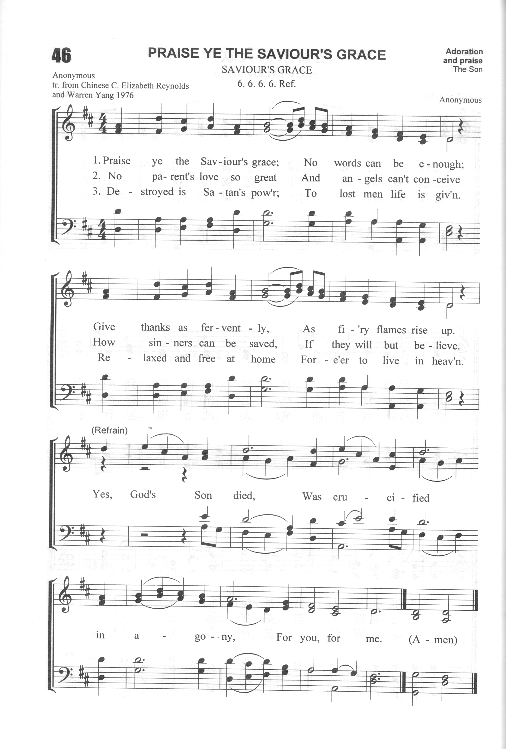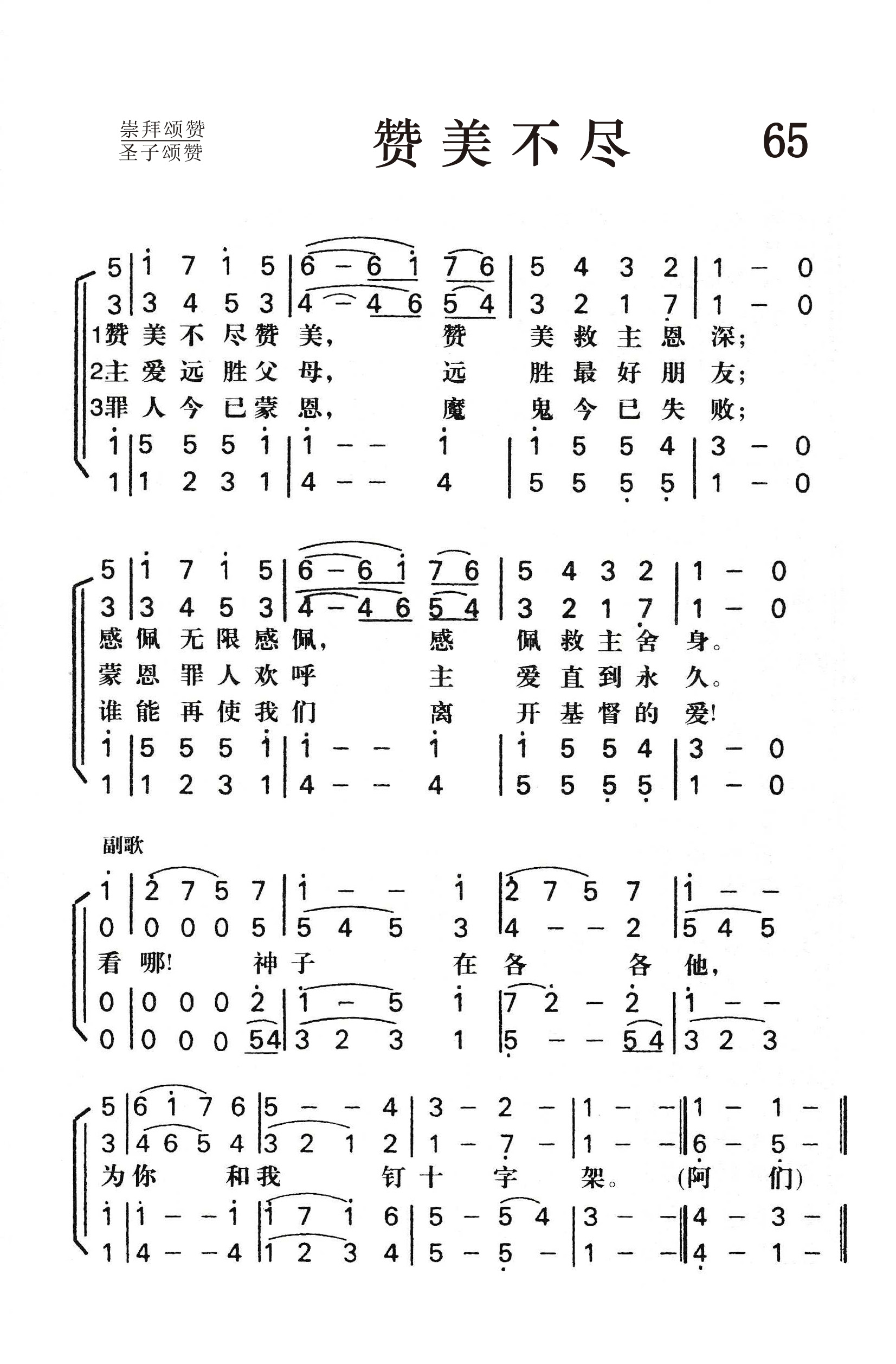 第65首赞美不尽 Praise Ye the Saviour’s Grace 赞美不尽赞美,赞美救主宏恩; 感佩无限感佩,感佩救主舍身。 主爱远胜父母,远胜最好朋友; 蒙恩的人颂扬,主爱直到永久。 罪人既已蒙恩,魔鬼权势溃败; 谁能再使我们离开基督的爱! 看哪!神子在各各他, 为你为我,钉十字架。 这首诗歌的词曲作者佚名,只知道是南美浸信会传教士高福德(T.P.Grawford)牧师所译。 诗歌的第一节赞美救主恩深,感佩救主舍身。第二节体验主爱胜过父母和最好朋友,因为祂爱我们到底。即使天地改变,父母朋友离开,主的爱仍永不变更。第三节叙述蒙恩的罪人靠主胜过魔鬼一切引诱。无人能使我们离开基督的爱。副歌要我们注目髑髅地的十字架,意味深长。
