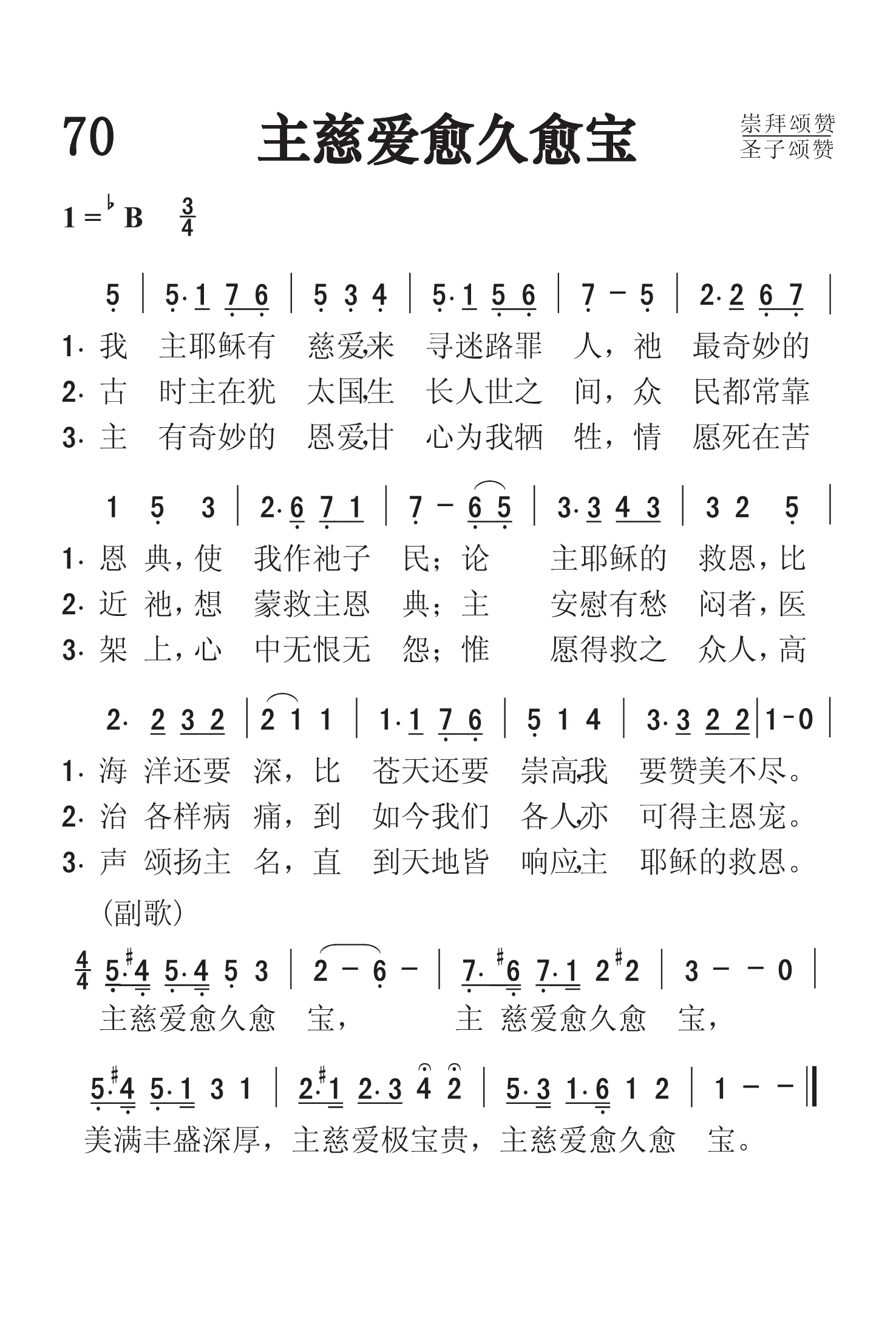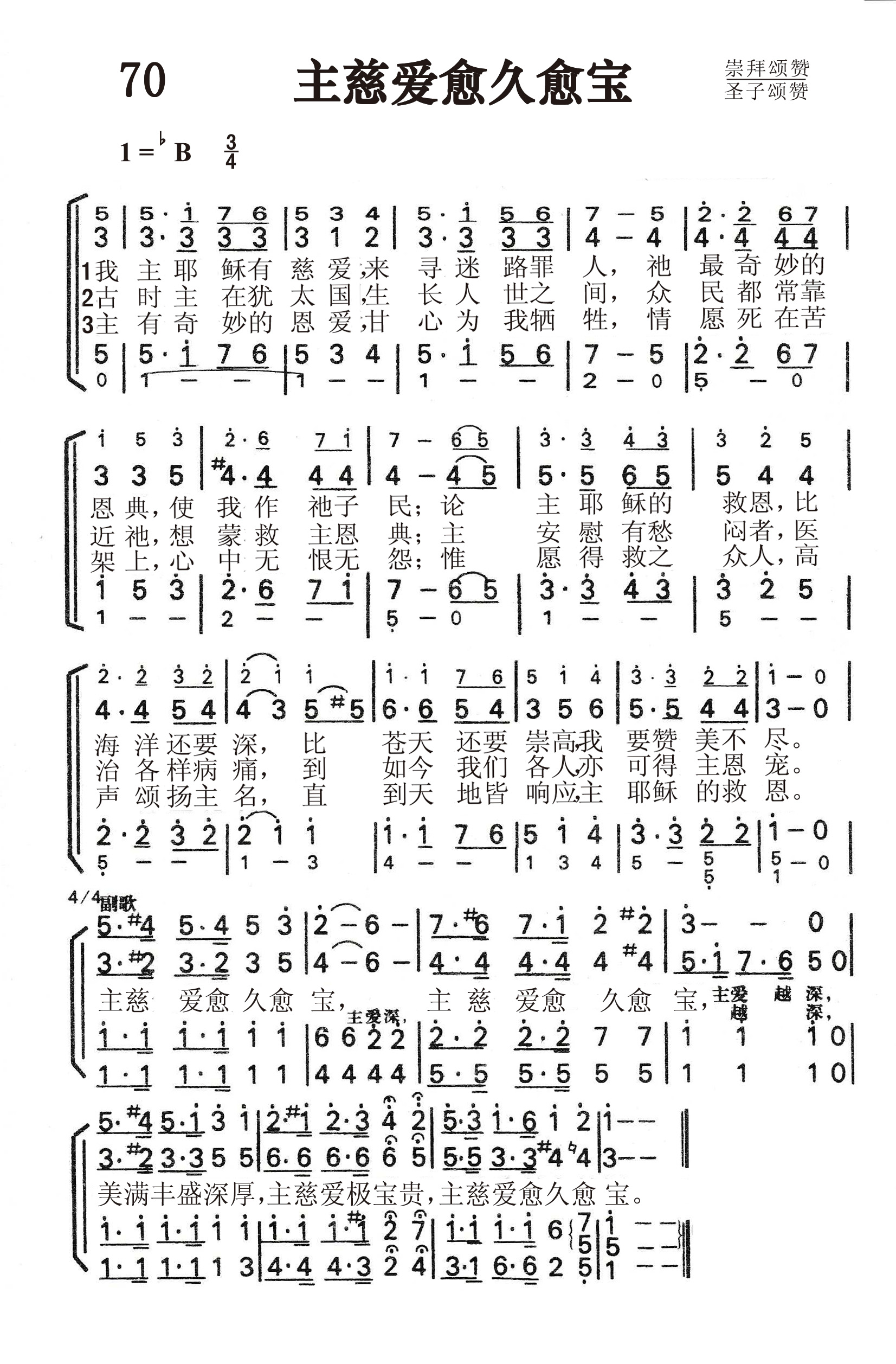 第70首主慈爱愈久愈宝 Of Jesus'Love That Sought Me 利利亚.莫里斯(L.N.Morris,1862,4,15-1929,7,23)作词作曲 我主耶稣有慈爱,来寻迷路罪人, 祂最奇妙的恩典,使我作祂子民; 论主耶稣基督的救恩,比海还要深, 比苍天还要崇高,我要赞美不尽。 古时主在犹太国,生长人世之间, 众民都常靠近祂,想蒙救主恩典; 主安慰有愁闷者,医治各样病痛, 到如今我们各人,也可得主恩宠。 主有奇妙的恩爱,甘心为我牺牲, 情愿死在苦架上,心中无恨无怨; 惟愿得救之众人,高声颂扬主名, 直到天地皆响应,主耶稣的救恩。 主慈爱愈久愈宝,主慈爱愈久愈宝, 美满丰盛深厚,主慈爱极宝贵,主慈爱愈久愈宝。 利利亚.莫里斯的父亲是美国南北战争中的军人,解甲归田后不久去世,留下寡妇和七个幼儿。莫里斯的童年生活十分清苦,幸而她的老师因她聪颖伶俐,刻意栽培。 她的邻居发现她有音乐天赋,特许莫里斯去她家练琴,因此她在十三岁时,就在教会司琴。莫里斯的母亲非常注意儿女的灵性,以圣书的原则管教他们。莫里斯在十岁时就经历了重生。 十九岁时她和同镇一位爱主的青年结婚。 他们同在教会热心事奉。当时美以美会主张追求圣洁,因此莫里斯也不断地清心追求主,蕴藏的圣诗恩赐也渐茁长。1892年莫里斯参加马里兰州山湖园的夏令会,这是她灵命上的一个转折点,她决心让圣灵在她心中居首位。 回家后,在她母亲店中踩缝衣机时,忽然心中涌出诗句和曲调,就赶快写下。 她母亲听了,提醒她这是圣灵的感动,鼓励她继续写下去。 在往后的三十七年中,她一共写了一千多首圣诗及曲谱。 通常一个诗人或作曲家常有他独特的风格,但莫里斯的作品很少如出一辙。 莫里斯说:“一位作者不是工厂便是管道,我不是工厂而是管道,我只是敞开我的心,让从某处来的故事流过。”她就这样地作上帝的流通渠道,甚至在1913年失明后,还继续藉友人的协助而写作。 她从未学过和声学与作曲,但出版家却难得改她的稿件。 她的诗歌意境优美,旋律热情奔放,脍炙人口,深受欢迎。到了晚年,她虽然双目失明,爱主的心仍丝毫没有减退。她以乐观的精神继续传道创作,直到她歇下劳苦的担子,安息在主怀里。 `《颂赞诗歌》92首《父旨成全》,130首《开心门让耶稣进来》,425首《奇妙大能力》, 536首《亲主更亲主》(1898年)等,也是莫里斯作词作曲的。