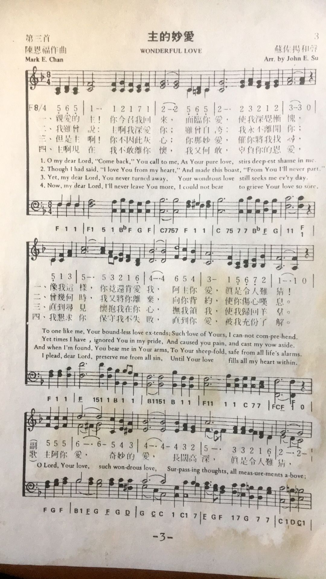 第71首 主的妙爱 Wonderful Love 陈恩福作词(1974年4月写与浙江黄岩),苏佐扬(John Su ,1916-2007)作曲(1947年4月写于甘肃兰州) 苏佐扬曾谈到这首诗歌的来历: “抗战时期,我一直在国内传道,直到西北的兰州,任职西北基督教联会总干事,要在甘肃,宁夏,青海一百零五个城镇中巡视及讲道。有时我要乘坐长途汽车,有些汽车是没有上盖的,风吹,雨打,日晒,雨淋亦一应俱全。有时要骑毛驴,由早上六时骑到晚上六时才能抵达一处黄土高原,有时也要骑脚踏车,记得有一次骑了三十英里还未抵达目的地;上山时要背着脚踏车,下山时,要用脚踏住前轮飞行而下,惊险万分;有时也要坐牛车,“今天不到,明天一定到”。当时是1945年,不久抗战胜利,人人思归,但我要工作最少两年才能南返。上述种种交通方式,我不是忍受,而是享受,觉得自己还可应付。 抗战胜利不久,我收到一封由杭州寄来的信,原来是华北神学院的学兄陈恩福牧师,是《主啊我深爱你》的词作者。在信中另有一首简谱的新歌,就是这首《主的妙爱》那一首,他来信如此说: 佐扬兄,欣悉你在中国大后方作,西北基督教联会总干事,可喜可贺,但是自从日军侵华后,杭州的人都四处奔逃,我和许多信主的人都逃到一个小山上,在那里我只有机会教小学,并无机会为主工作。这数年来,心中都十分不安,现在抗战胜利了,我决心下山回到工场里去,继续传道。这首新作便是我的心声,请你细阅,如有可能,请在你的天人报上为我发表,希望将来会有许多人受感动。 我细心阅他寄来这首新歌,歌有四节,我第一次阅读时,好像看见四幅不同的图画。我再读一次时,又像卷入四幕白话剧一样,心里甚为感动。 “亲爱的主!祢今召我回来,面临祢爱,使我深觉惭愧, 像我这样,祢竟还肯爱我,啊!主祢爱,真是令人难猜! 我虽曾说:主啊我深爱祢;虽曾自夸;我永不离开祢; 曾几何时,我又将祢离弃,向祢背约,使你伤心叹息。 但是主啊!祢不因此灰心;祢那妙爱,催你将我找寻, 直到寻见怀抱我在你心,抚我领我,使我归回羊群。 主啊!现在我不敢离祢怀,我又何敢,辜负祢的恩爱, 我恳求祢保守我不失败,直到你爱,被我充份了解。 (副歌) 主啊!祢爱,奇妙的爱,长阔高深,真是令人难猜, 虽然我曾一度叫祢伤怀,但主祢爱却又将我找回。” 当时天人报在兰州已出“西北版”,于是决定为这首新歌加上和声,定名为《主的妙爱》(诗篇第十七篇7节有“你奇妙的慈爱”一语),开始在中国各地流行,也寄一份给恩福兄看。 胜利后第二年,我一家五口蒙神带领,先到上海工作,一年后乘火车返港,其中艰苦的经过,详记在“蒙恩的脚踪”下集430条至434条,你看了会心酸。后来安抵香港,从今以后不再走难,可以安心事主。 蒙主带领,1953年开始凭信心在东南亚各地布道,也不断介绍这首“主的妙爱”,我在马来西亚布道时,曾独唱此歌,看见台下坐在第一行的一位长老流眼泪。在香港有一次我弹着当时的一部风琴(用脚踏板的)独唱此歌,有一位青年帮我忙的,也不断流泪,相信他心里有事。 有一年我在加拿大布道,有一位青年领唱诗,当他领唱“主的妙爱”时,竟然改了副歌中的一个字,那就是“虽然我曾一度叫你伤怀”,他竟然改唱为“虽然我曾几度叫你伤怀”。散会后我问他为甚么一度改为几度?他说:“是的,我真是几度叫主伤怀,希望在这次培灵布道会中,我会和作歌词的人一样,‘直到你爱,被我充份了解’”。