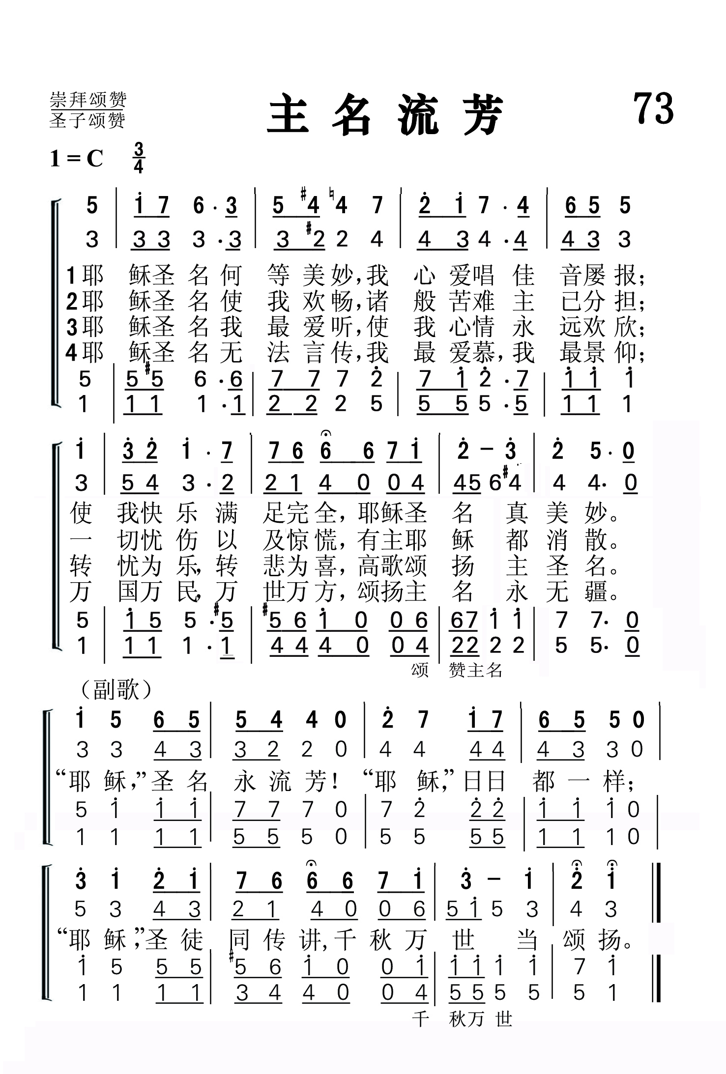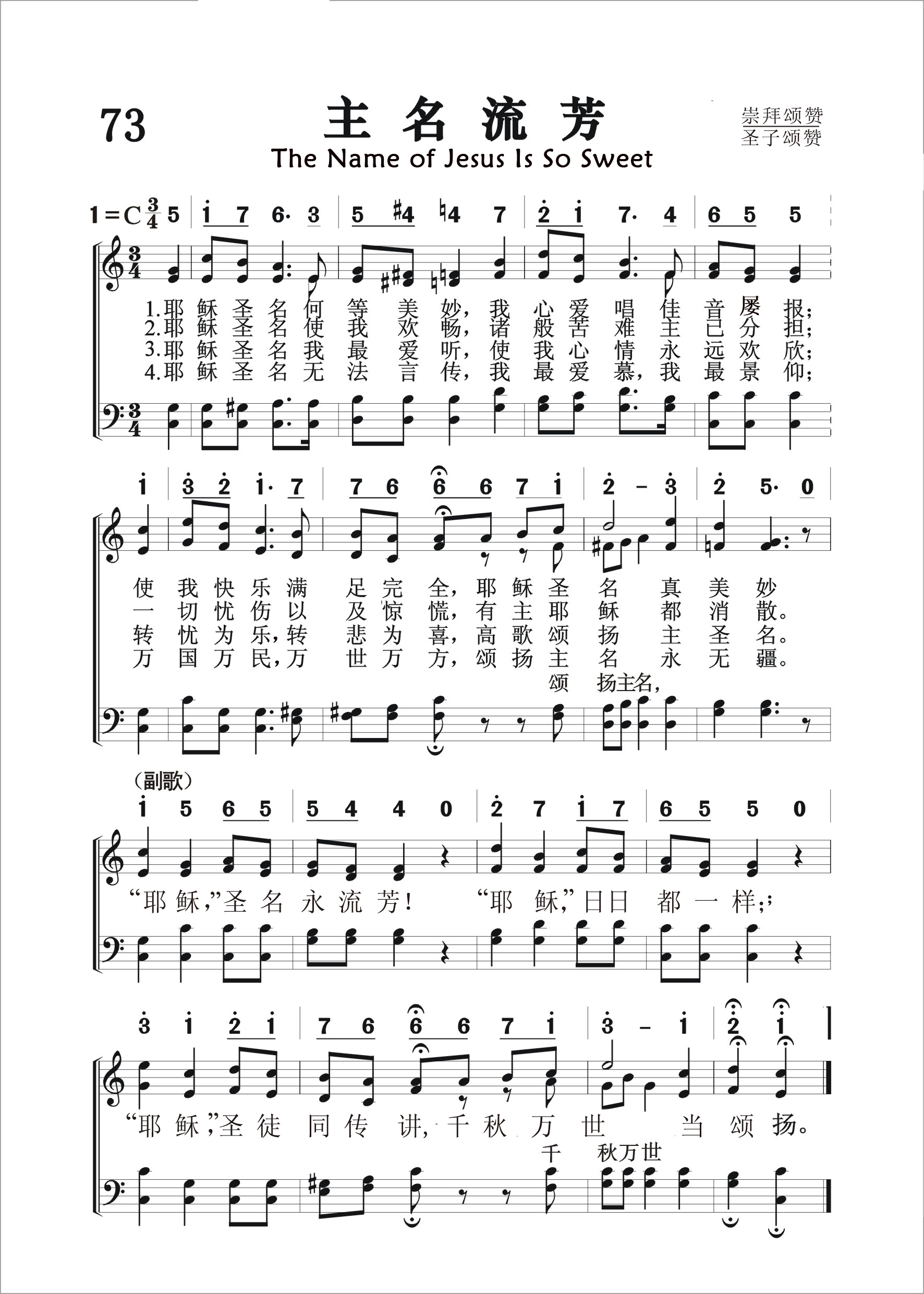 第73首主名流芳 The Name of Jesus Is So Sweet 威廉.马丁(William .C.Martin,1864,12,25-1914,8,30)作词,洛兰茨(Edmund Simon Lorenz,1854-1942)作曲 耶稣圣名何等美妙,我心爱唱佳音屡报; 使我快乐满足完全,耶稣圣名真美妙。 耶稣圣名使我欢畅,诸般苦难主已分担; 一切忧伤以及惊慌,有主耶稣都消散。 耶稣圣名我最爱听,使我心情永远欢欣; 转忧为乐,转悲为喜,高歌颂扬主圣名。 耶稣圣名无法言传,我最爱慕,我最景仰; 万国万民,万世万方,颂扬主名永无疆。 耶稣圣名永流芳,耶稣日日都一样; 耶稣圣徒同传扬,千秋万世当颂扬。 词作者威廉.马丁出生于美国新泽西州,是一位虔诚爱主的基督徒,一直担任浸信会的牧师。他曾创作不少感人的赞美诗歌。在这首诗歌里,他热情地歌颂耶稣甜美的圣名,表达了千万圣徒的共同心意。第104首《救主耶稣头戴荆冠》,397首《更加甘甜》也是威廉.马丁作词的。 曲作者洛伦茨在学生时代就显示出非凡的编辑才能。他从耶鲁大学毕业以后,就开始从事教会音乐的出版工作。1890年,他创办了洛伦茨出版公司,不断地为各地教会提供赞美诗歌。 《颂赞诗歌》191首《蒙召赴筵》,347首《赐我圣书》,《赞美诗》(506版)第450首《圣洁喜乐》等也是洛伦茨作曲的。