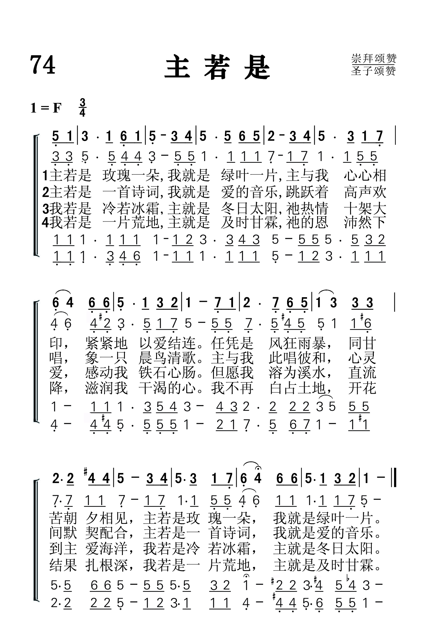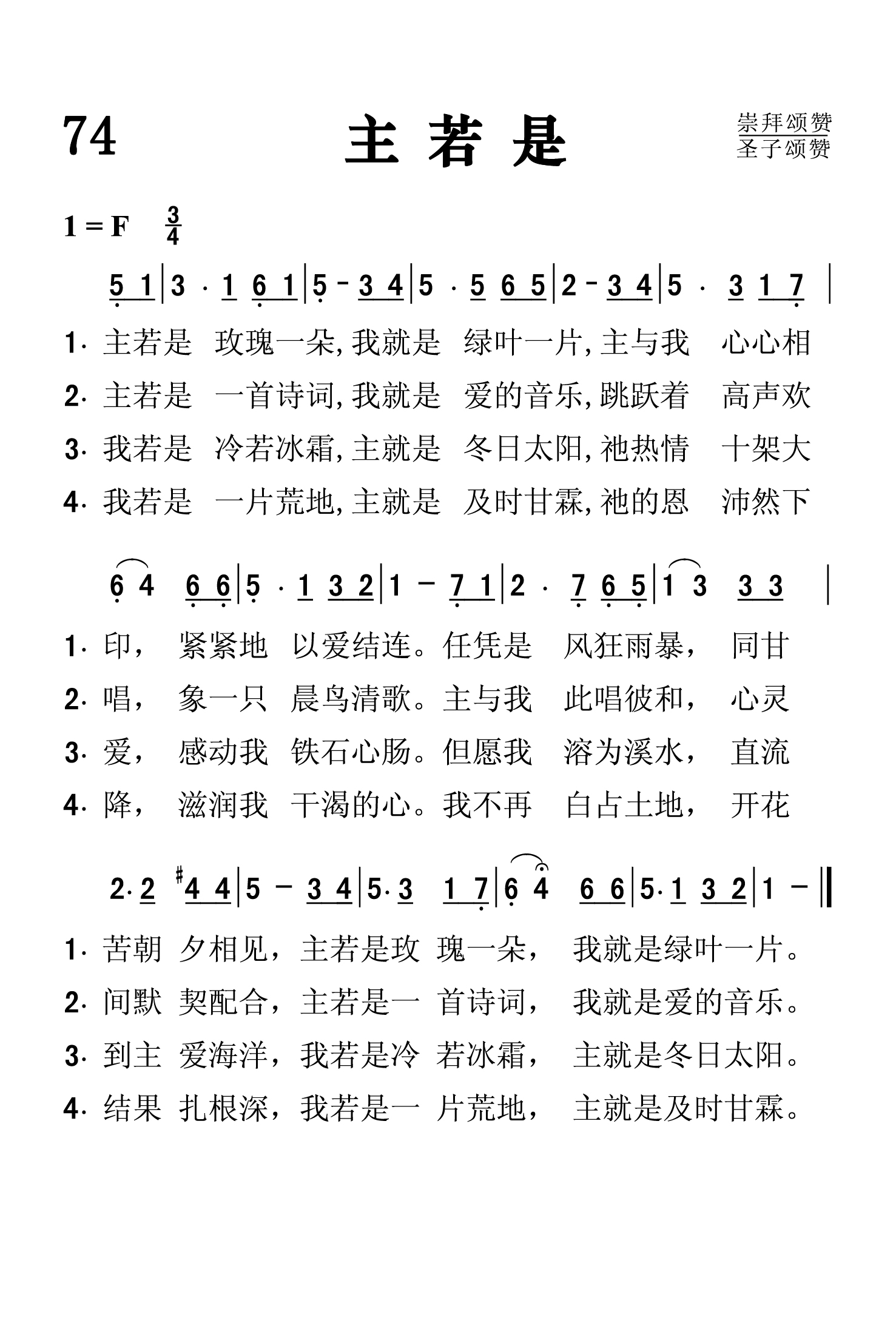 第74首主若是 If He Were 赵君影(Calvin Chao ,1906-1996)作词(写于菲律宾马尼拉),苏佐扬(John Su ,1916-2007)作曲(1951年12月8日写于菲律宾马尼拉) 主若是玫瑰一朵, 我就是绿叶一片, 主与我心心相印,紧紧地以爱结连。 任凭是风狂雨暴,同甘苦朝夕相见, 主若是玫瑰一朵,我就是绿叶一片。 主若是一首诗词,我就是爱的音乐, 跳跃着高声欢唱,象一只晨鸟清歌。 主与我此唱彼和,心灵间默契配合, 主若是一首诗词,我就是爱的音乐。 我若是冷若冰霜,主就是冬日太阳, 祂热情十架大爱,感动我铁石心肠。 但愿我溶为溪水,直流到主爱海洋, 我若是冷若冰霜,主就是冬日太阳。 我若是一片荒地,主就是及时甘霖, 祂的恩沛然下降,滋润我干渴的心。 我不再白占土地,开花结果扎根深, 我若是一片荒地,主就是及时甘霖。 这首广为传唱的优美诗歌,表达一个基督徒生活在主的爱中喜悦和平安的情怀。 词作者赵君影牧师出生于湖北省汉川县。 他在年青时曾胸怀大志,爱读名人传记,想创伟业。 在他未献身之前,宗教只是他整个生活的附属品,而不是生活的动力。 他曾说过:“三十六行,敲锣卖糖,行行都行,就是牧师不当。” 1930年,他在计志文牧师布道会中接受主,四年后决志奉献,从事向大专学生传福音的工作。 1942 年,他在中国开始推动“中国布道十字军”。抗战时在大后方带领两万余大专学生归主;1945年发起全国基督徒大学生联合会,即今日台湾校园团契的前身;1949-1959年间,先后在东南亚创立香港培灵书院,新加坡神学院。 1956年赵牧师举家迁美定居洛杉矶,为留学生举行查经班;1959年成立中华归主协会,向中国知识分子传福音,以期培养教会领袖,协助留学生解决种种生活困难。赵师母在不同的教会煮饭烧菜招待留学生约有十年之久。 1982年,他在洛杉矶创立中华归主神学院,旨在训练神国领袖人才,向海外华人传福音。 赵牧师写了将近廿首诗歌,如《现在我知》,《主啊!我心爱祢》,《尽忠为主》等,其中最脍炙人口的是《主若是》。 1951年他在新加坡,有一天独自在灵修、沉思、揣摩属灵的本质如何在实际的生活中表现出来?于是他写了这首诗,用四个比喻,玫瑰与绿叶,诗词与音乐,冰霜与太阳,荒地与甘霖。 这诗表明基督是他生命,他属主,天人在他里面合一了。 赵牧师认为情操是属灵生活的主要一部份,而诗歌就是情操的表达。 在他灵性追求的过程中,有时达到情绪的高潮,而写下了诗章。正如《以弗所书》五章十九节:“当用诗章、颂词、灵歌、彼此对说,口唱心和的赞美主。”赵牧师的诗有五首是由苏佐扬牧师谱曲,《主若是》是其中之一。 曲作者苏佐扬牧师出生于香港的九龙,原藉广东。他11岁开始学口琴,12岁学弹风琴,两年之内熟背二百多首圣诗曲谱后,14岁开学作曲。其后又学会了十余种中西乐器。当年宋尚节、赵君影等名牧布道会时,常请他司琴或领唱。16岁,他在宋尚节博士初来香港布道时,决志献身。18岁进入山东华北神学院念神学。 苏佐扬于1937年毕业于山东华北神学院,毕业后,日本战事开始,自1937-1948年间在中国十九省奔驰为主作工,经历许多困难,但从不灰心。先在中国各省自由传道,30岁在甘肃被按立为牧师,1948年终返香港,先后在香港、澳门两地牧会、教学四年。 1953年春,他辞去了受薪的职务,开始过信心的生活,准备去海外为主作工,当时他亲友都为他担心“一家七口何以养生”?神赐给他两句话:“红海面前自有路,约但河边不需桥”,神的话永远有效。自1953-1961年间,他足迹遍日本、菲律宾、新几内亚、澳大利亚、新加坡、马来西亚、泰国、越南、印度尼西亚等地。1962-1976年间,他在欧美四十六国家及地区向华人布道。他有语言天份,能用英语、普通话、广东话,闽南语、潮州话、客语及上海话讲道。此外他也懂十多种欧亚语言。他的座右铭是“只对主忠心,不问人褒贬”。 苏牧师凭信心于1942年创办《天人之声季刊》及1963年开办“天人神学院”(现只办海外函授科)。至今他已出版了卅多种书籍,他用圣书经文谱写了许多短歌,约有五百首,他立志要将音乐的恩赐为主所用,除短歌外,尚作有天人圣诗二百二十首。