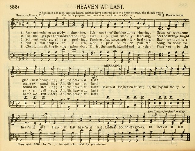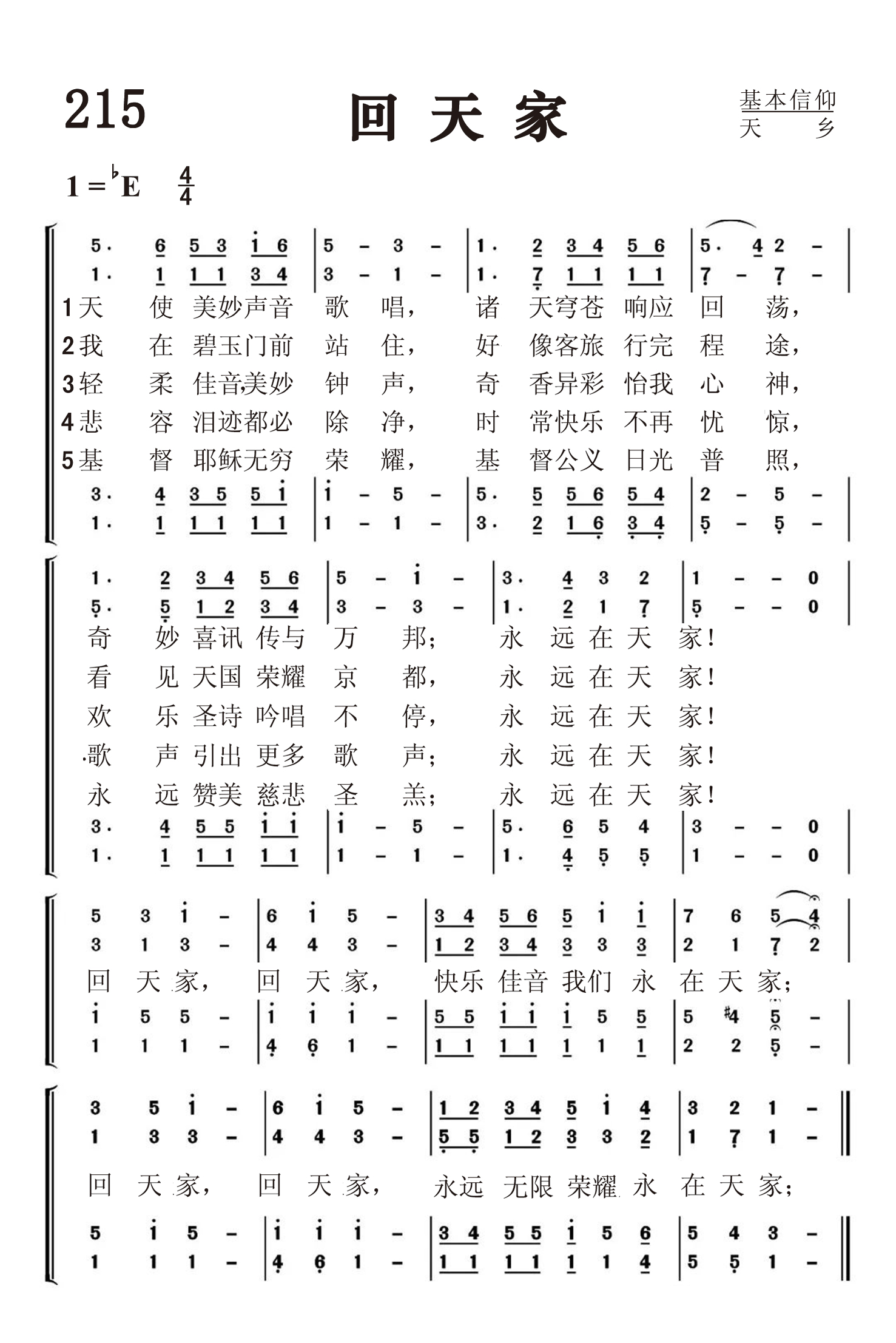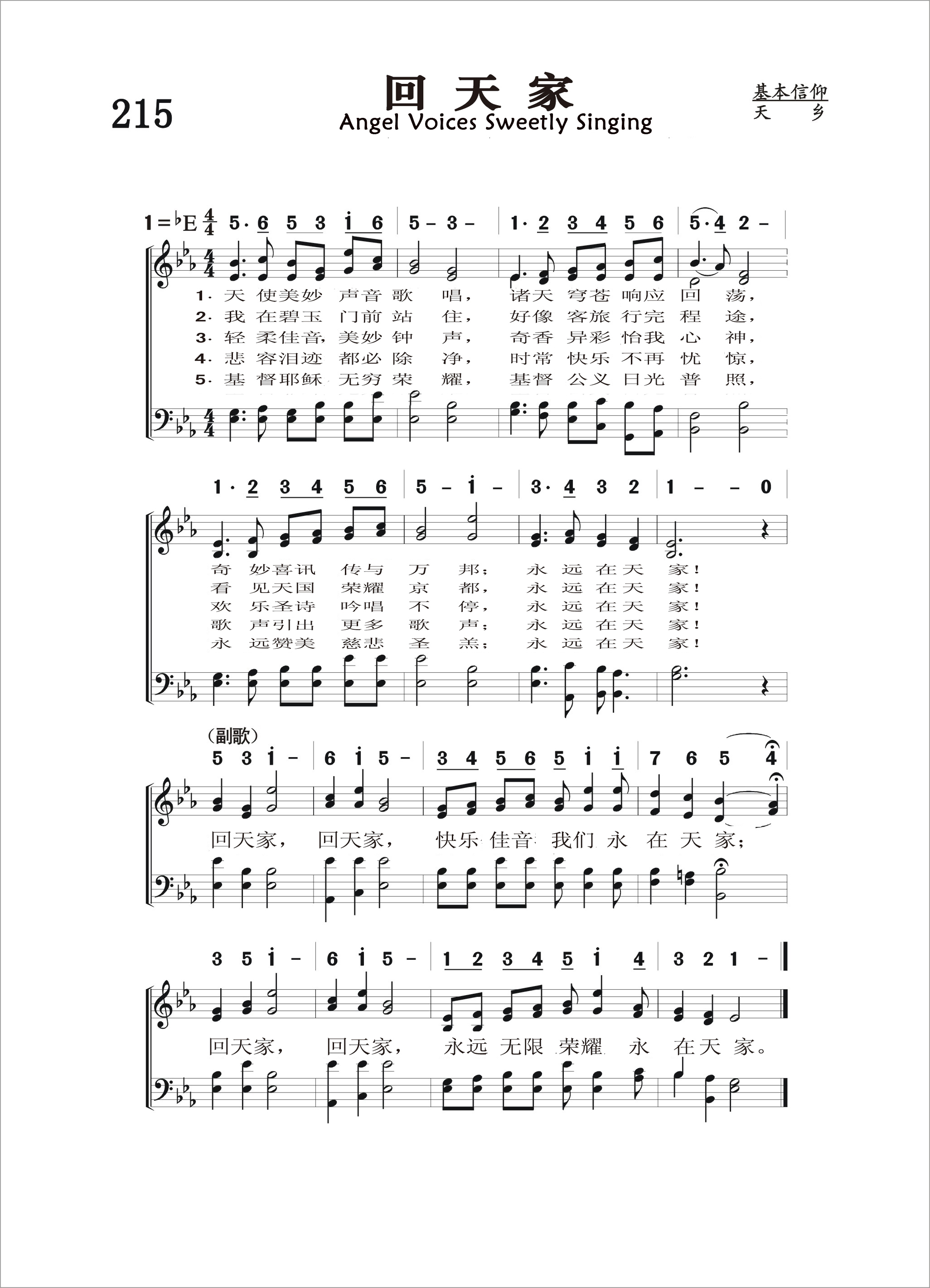 第215首 回天家Angel Voices Sweetly Singing 博纳(H.Bonar 1808,12,19-1889,7,31)作词,柯克帕特里克(W.J.Kirkpatrick,1838,2,27-1921,9,20)作曲 天使美妙声音歌唱,诸天穹苍响应回荡, 奇妙喜讯传与万邦;永远在天家! 我在碧玉门前站住,好像客旅行完程途, 看见天国荣耀京都,永远在天家! 轻柔佳音,美妙钟声,奇香异彩怡我心神, 欢乐圣诗吟唱不停,永远在天家! 悲容泪迹都必除净,时常快乐不再忧惊, 歌声引出更多歌声;永远在天家! 基督耶稣无穷荣耀,基督公义日光普照, 永远赞美慈悲圣羔;永远在天家! 回天家,回天家,快乐佳音我们永在天家; 回天家,回天家,永远无限荣耀永在天家。 博纳博士是苏格兰长老会中最著名,影响最大的圣诗作者。他于1808年12月19日出生于爱丁堡一个律师兼学者的家庭。他从小就立志献身归主,上大学时师从长老会神学大师多马•查默斯(1750-1847)。他毕业后担任苏格兰教会(即长老会,当时的苏格兰国教)的牧师。1843年追随其师以及一部分教牧人员脱离国教,另行组织自由长老会。查默斯去世后,他受聘担任爱丁堡查默斯纪念会堂首任牧师,并接任苏格兰自由长老会全国大会会长。他一生敬虔事主,努力工作,牧养羊群,素有勤祷告、勤写作、勤讲道、“三勤”牧师之称。 博纳博士以宣讲基督复临的要道见长。他于1855至1856年间漫游埃及与巴基斯坦以后,更增强了对于圣书预言的兴趣。他在报章上多次发表诗文,同时担任预言杂志的主编。他以满腔的热忱盼望基督再来,宣扬战胜死亡,荣归天家的快乐。他以自己虔诚祈祷的人生感动了周围无数的人。 他爱儿童,常常专为儿童写诗。他爱好音乐。在乌云密布的日子,他用笛声表达哀婉之情,然而顷刻间,又吹奏出快乐的旋律。他所写的诗歌,热情奔放,活泼生动,不事修饰,蕴含着不可压抑的内在力量,。尤其是死亡寒流袭来之际,他的诗更象灿烂辉煌的灯光,穿越黑暗,照亮前程。 他于1889年逝世时,虽遇狂风暴雨,前来送行的仍人山人海。他们痛惜教会失去了一个柱石,同时怀念他所写下的不朽诗章。 曲作者柯尔帕特里克是美国音乐出版家,宗教音乐作曲家。他出生于爱尔兰,自幼跟他父亲学音乐,以后受教于几个名师,青年时移居美国。南北战争时他参军,任军乐队吹笛手。1862年至1872年在美国费城做家具商,并在美以美会担任义工,曾任美国费城美以美会唱诗班指挥。同时他还作曲。他在1859年21岁时即开始编辑出版赞美诗工作,以后与斯托克顿.斯威尼合编出版约一百多部宗教音乐集和书刊。他谱写了不少信徒所喜爱的福音歌曲。
