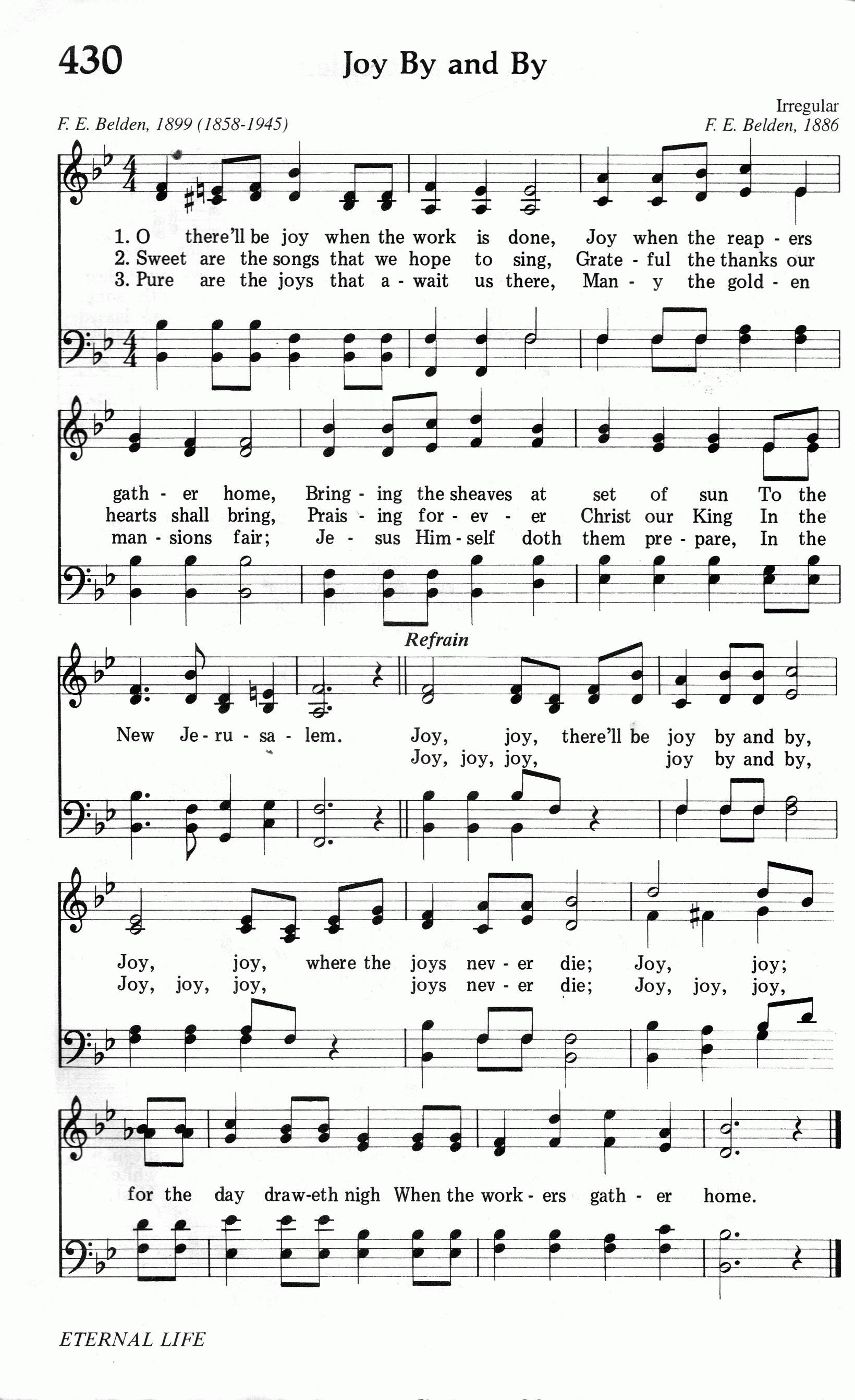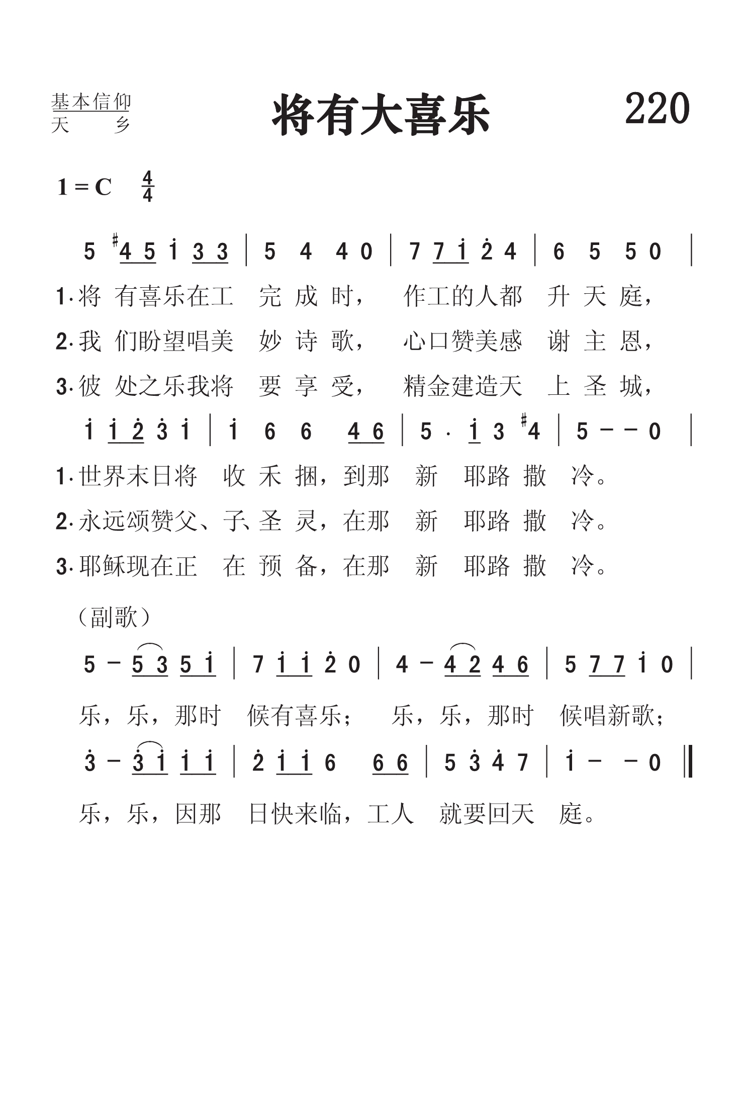 第220首将有大喜乐O There’ll Be Joy 贝尔登(1858-1945)作词作曲 将有喜乐在工完成时,作工的人都升天家, 基督来时将收禾捆,到那新耶路撒冷。 我们盼望唱美妙诗歌,心口赞美感谢主恩, 永远颂赞父、子、圣灵,在那新耶路撒冷。 彼处之乐我将要享受,精金建造天上圣城, 耶稣现在正在预备,在那新耶路撒冷。 乐,乐,那时候有喜乐;乐,乐,那时候唱新歌; 乐,乐,因那日快来到,工人就要回天家。 诗人在这首诗歌中展望了福音大工完成,最后的庄稼收割结束时的美好日子。那时地上的圣徒将放下劳苦的重担,口唱美妙的新歌,相聚在主耶稣所预备的新耶路撒冷。他们要永远颂赞三一真神,永享福乐与平安。 作者贝尔登是基督复临安息日会的创始人之一怀爱伦的外甥。他出生于美国密歇根州的巴特尔克里克。他十几岁随家人迁往加利福尼亚州时就开始创作音乐作品。后因健康原因迁往科罗拉多州。十九世纪八十年代初他与妻子返回巴特尔克里克。他是该教会1886年第一本赞美诗集的音乐编辑之一,曾担任《评论与通讯》杂志的主管。他创作了数百首安息日学诗歌和其他赞美诗,并且大部分是由他自己谱曲的。他才思敏捷,出手迅速。常常在听道的过程中就创作一首与之相匹配的诗歌词曲。讲道尚未结束,诗歌就已经写好了。他还为布道家比利.森迪写歌。1907年,他因在版税问题上与教会领导产生分歧而离开教会。但他临终时还是把他的所有文稿捐献给安息日会。1945年12月2日他在密歇根州的巴特尔克里克逝世。