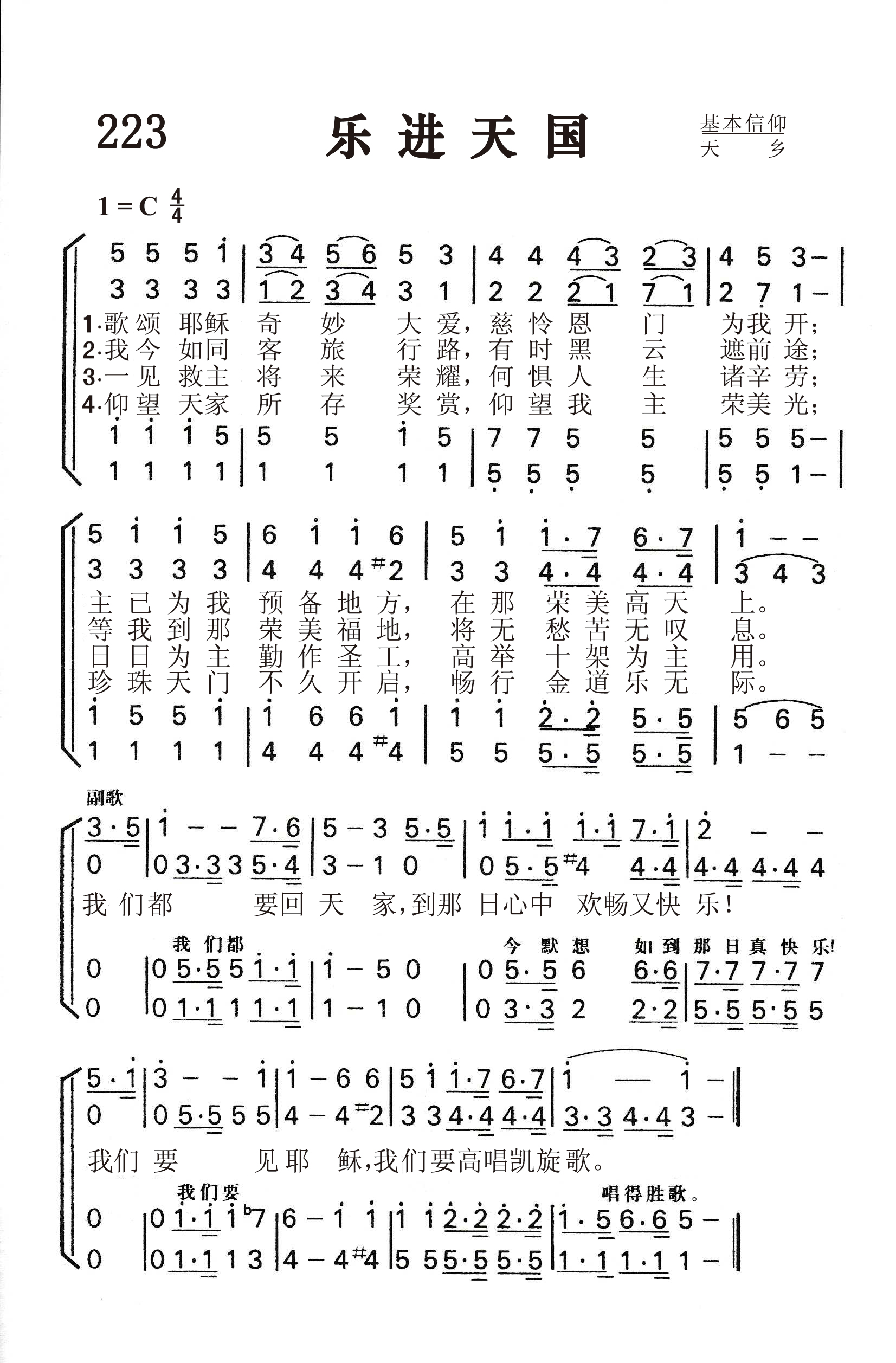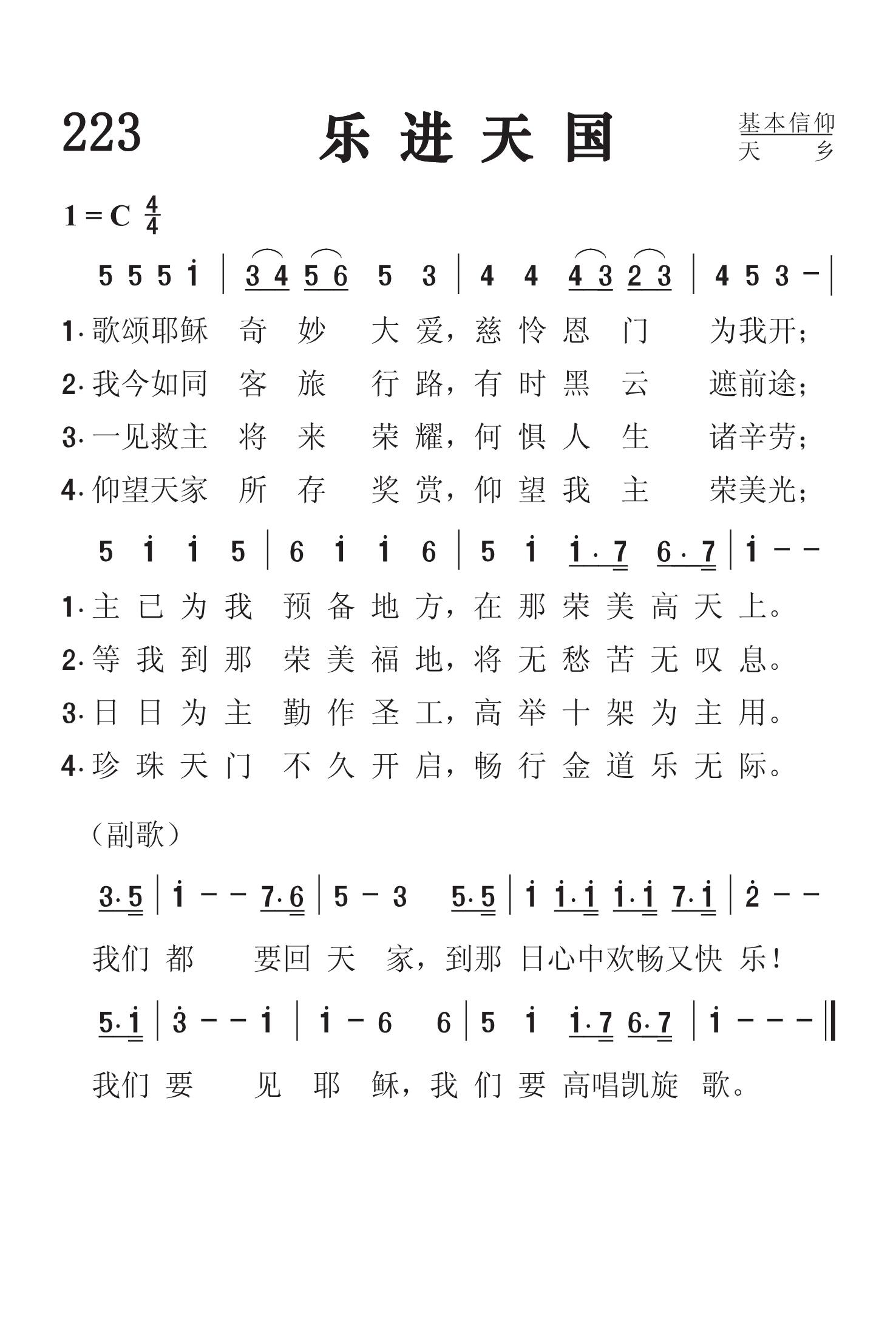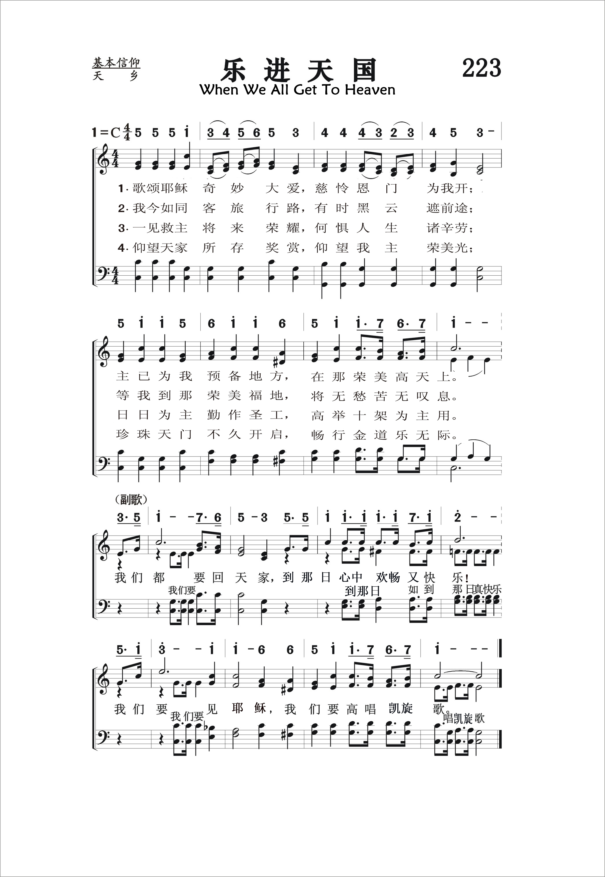 第223首 乐进天国When We All Get to Heaven 休伊特(E.E.Hewitt,1851,6,28-1920,4,24)作词(1898年),威尔逊(Emily D.Wilson,1865,5,24-1942,6,23)作曲(1898年) 歌颂耶稣奇妙大爱,慈怜恩门为我开; 主已为我预备地方,在那荣美高天上。 我今如同客旅行路,有时黑云遮前途; 等我到那荣美福地,就无愁苦无叹息。 一见救主将来荣 耀,何惧人生诸辛劳; 日日为主勤作圣工,高举十架为主用。 仰望天家所存奖赏,仰望我主荣美光; 珍珠天门不久开启,畅行金道乐无际。 我们都要回天家,到那日心中欢畅又快乐! 我们要见耶稣,我们要高唱凯旋歌。 “你们心里不要忧愁;你们信上帝,也当信我。在我父的家里有许多住处;若是没有,我就早已告诉你们了。我去原是为你们预备地方去”(约14:1、2)。 这是一首歌颂进入天国之乐的诗歌。词作者休伊特夫人经常到美国新泽西州欧欣格罗夫聚会。一天,她在那里遇见女作曲家威尔逊。两人久别重逢,欣喜无比,促膝交谈,亲密无间,于是就产生了这首《乐进天国》。 词作者休伊特是美国卫理公会一位牧师的妻子。早年她以优异的成绩毕业于美国费城女子师范学校,曾作为毕业生的代表在毕业典礼上致辞。后担任中学教师多年,热心教会主日学和社会的福利事业。休伊特夫人写过许多赞美诗,均由福音派作曲家为之谱曲。 曲作者艾米莉.威尔逊的父亲是爱尔兰人,母亲是英国人。她是一位富有音乐和戏剧才华的女子,曾对教会作出很大的贡献。她1887年与美国费城卫理公会的牧师约翰. 威尔逊结婚,成为他传福音的得力助手。
