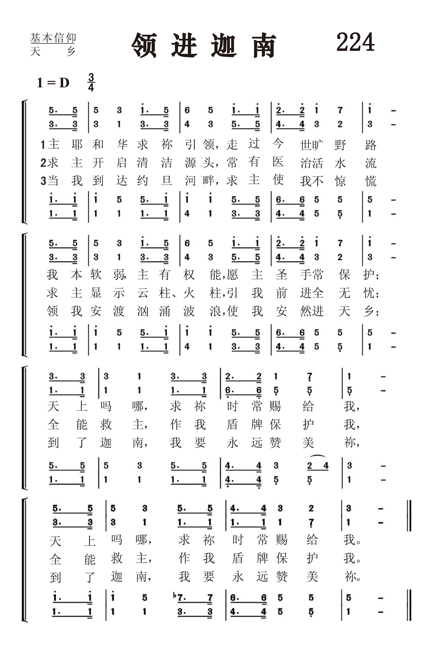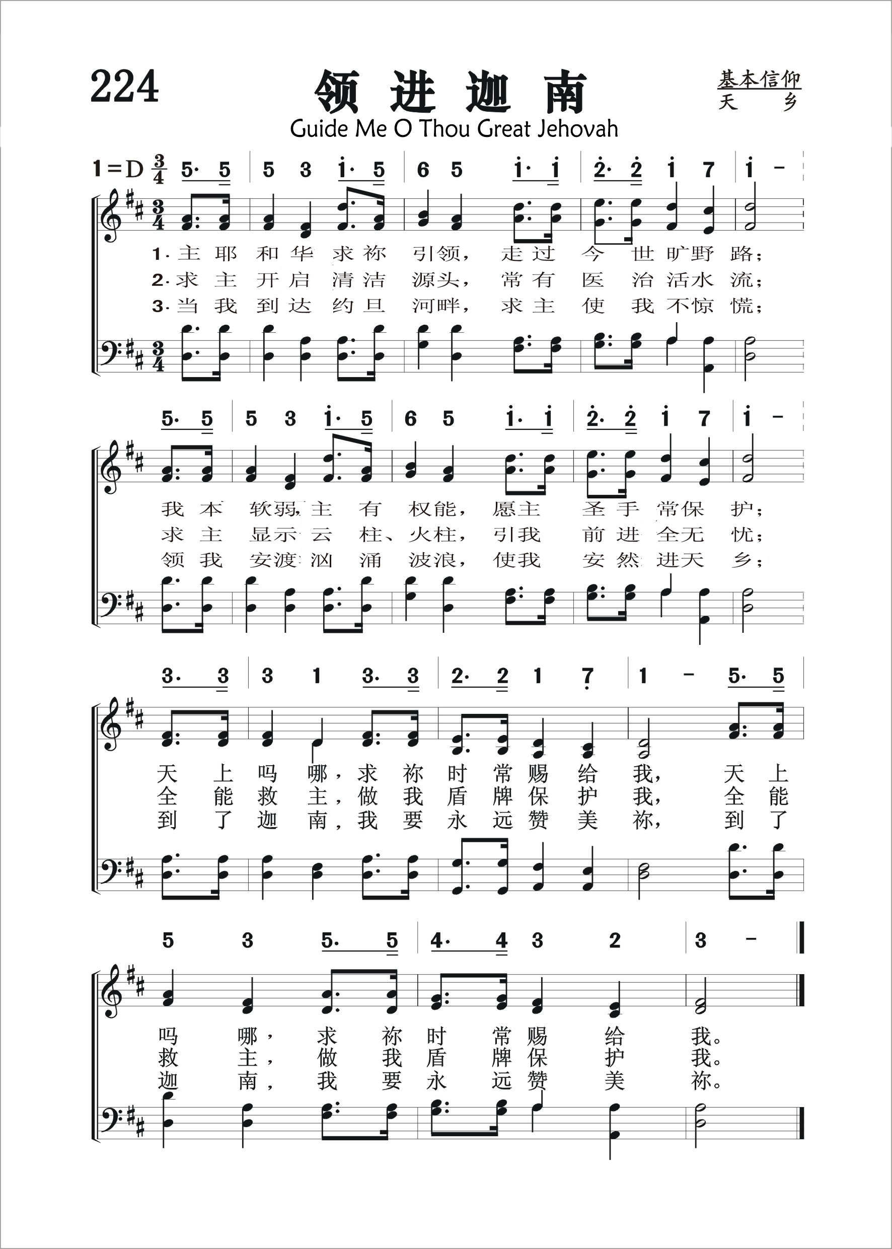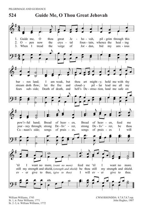 第224首领进迦南Guide Me O Thou Great Jehovah 词作者为享有“威尔士甜蜜歌者”美称的威廉斯(William Williams 1717-1791),曲作者为托马斯.黑斯廷斯(1784-1872 Thomas Hastings) 耶和华啊, 求祢引领,走过今世旷野路; 我本软弱,主有权能,愿主圣手常保护; 天上吗哪,求祢时常赐给我。 求主开启清洁源头,常有医治活水流; 求主显示云柱、火柱,引我前进全无忧; 全能救主,作我盾牌保护我。 当我到达约旦河畔,求主使我不惊慌; 领我安渡汹涌波浪,使我安然进天乡; 到了迦南,我要永远赞美祢。 威廉斯原籍威尔士,出身富裕,原来学医,但大学毕业后发生的一件事,使他骤改初衷。1738年的一天,他在回家途中听见教堂院内有讲道的声音,便进去听道,结果大受感动,决心终身事主。经过神学方面的训练以后,他在圣公会中担任圣职。三年以后,他加入韦斯利教会,成为巡回布道士。有人评论他说:“他拥有真正威尔士人的热情和丰富的想象力。他的信息充满生动的描述,并常因主的同在而光芒四射,对易受感动的威尔士人产生非常好的效果。” 他从事巡回布道四十多年,每年骑马或步行三千余里。他还用威尔士语创作诗歌800余首,用英语创作诗歌一百余首。他的诗以简洁、清晰、想象力丰富见称。这首《领进迦南》就是他的代表作之一,借用以色列人在旷野的经验,如天降玛拿,盘石,云柱火柱,约旦河边,应许美地作为信徒旅程的路标。 本诗发表于1744年,后被译成七十五种以上的文字,其意义是明显的:人生从摇篮到坟墓,“是客旅,是寄居的,说这样话的人是表明自己要找一个家乡。”(来11:13,14)于是就需要主的引导,经过种种艰难险阻,最后安抵永久,更美的家乡。 曲作者黑斯廷斯是美国宗教音乐的先驱。他父亲是一位乡村医生。黑斯廷斯很有音乐天赋,18岁就领导一个乡村唱诗班,并开始编辑赞美诗集。1823年至1832年,他担任一家宗教音乐周报的编辑,传播了不少福音歌曲。他写过一本关于指挥圣诗班技术和经验的书《四十个唱诗班的历史》。1858年,纽约大学授予他音乐博士学位。他一生写过六百首赞美诗,一千首赞美诗曲谱,编过五十卷宗教音乐曲集。由于他的努力,使宗教音乐在美国广为发展。 《颂赞诗歌》278首《万古磐石》,《赞美诗》(505版)123首《锡安守望者》和297首《施恩宝座》(1842年)也是黑斯廷斯作曲的。《赞美诗》505版317首《流泪作工》是黑斯廷斯作词的。