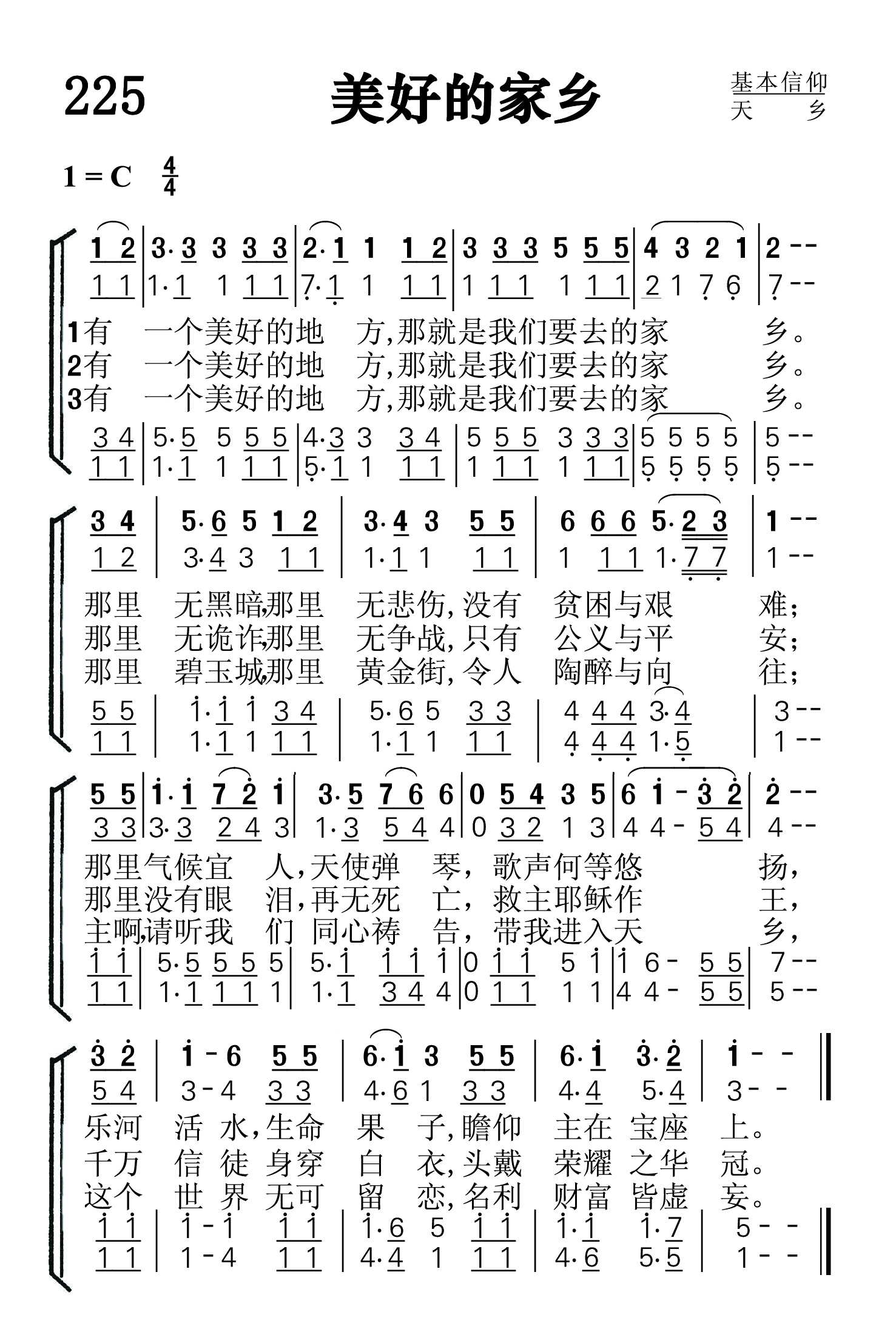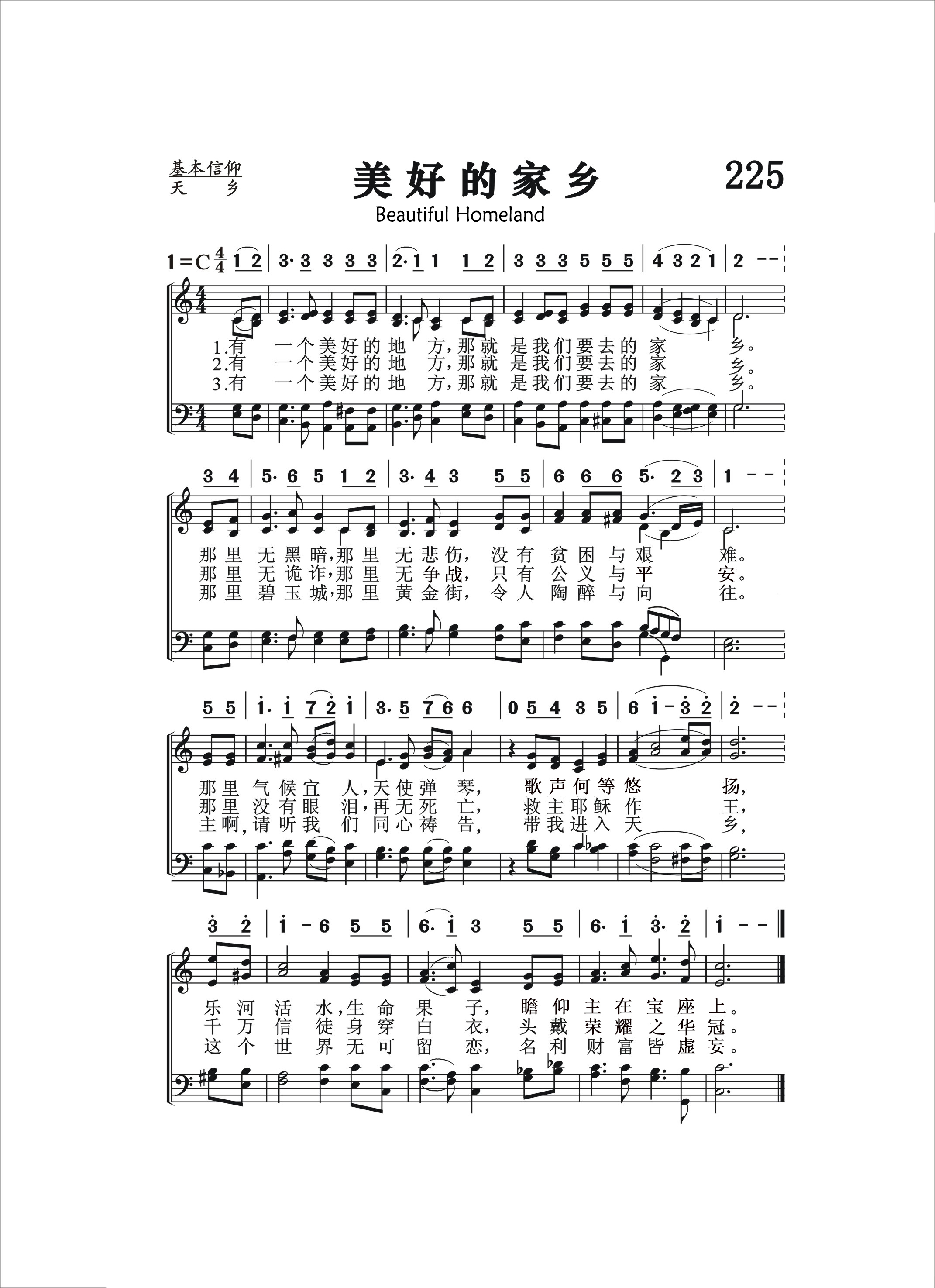 第225首 美好的家乡Beautiful Homeland (《颂赞圣诗》468首) 有一个美好的地方,那就是我们要去的家乡。 那里无黑暗那里无悲伤,没有贫困与艰难。 那里气候宜人,天使弹琴,歌声何等悠扬, 乐河活水生命果子,瞻仰主在宝座上。 有一个美好的地方,那就是我们要去的家乡。 那里无诡诈,那里无争战,只有公义与平安。 那里没有眼泪,再无死亡,救主耶稣作王。 千万信徒身穿白衣,头戴荣耀之华冠。 有一个美好的地方,那就是我们要去的家乡。 那里碧玉城,那里黄金街,令人陶醉与向往。 主啊,请听我们同心祷告.带我进入天乡, 这个世界无可留恋,名利财富皆虚妄。 这是一首家的赞歌。它歌颂我们永久家园的恬静、美丽、荣耀和喜乐。 我们要去的家乡是一个美好的地方。“上帝为爱祂的人所预备的,是眼睛未曾看见、耳朵未曾听见,人心也未曾想到的”(林前2:9)。上帝为我们所预备的荣耀基业,远超过我们肉眼所能看见的,因看得见的福分是暂时的,看不见的是永远的。这福分也是我们耳朵未曾听闻的,因我们所听见的属世荣耀是易变的会衰残的,而主为我们所预备的,乃是不能衰残、不能玷污、不能朽坏,为我们存留在天上的基业,是梦想不到的荣耀。