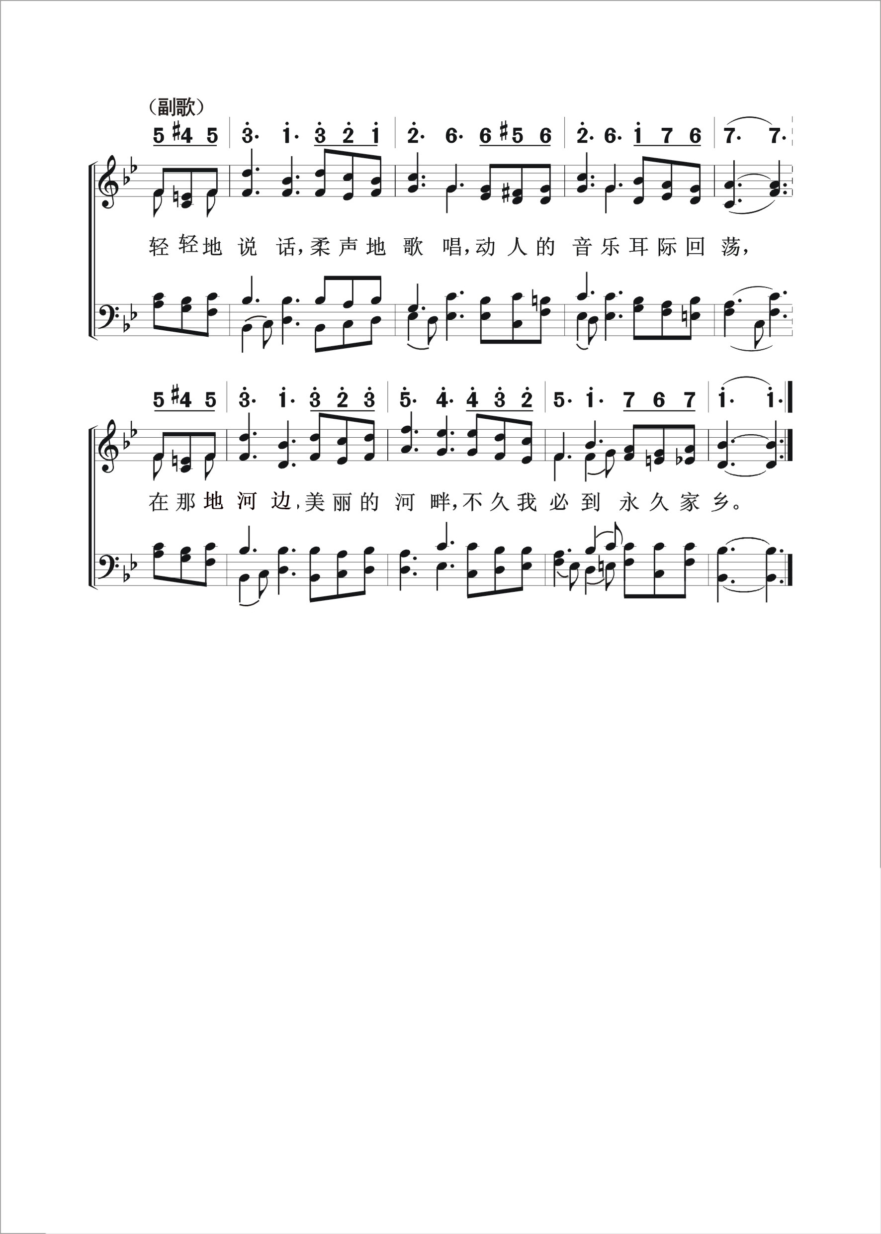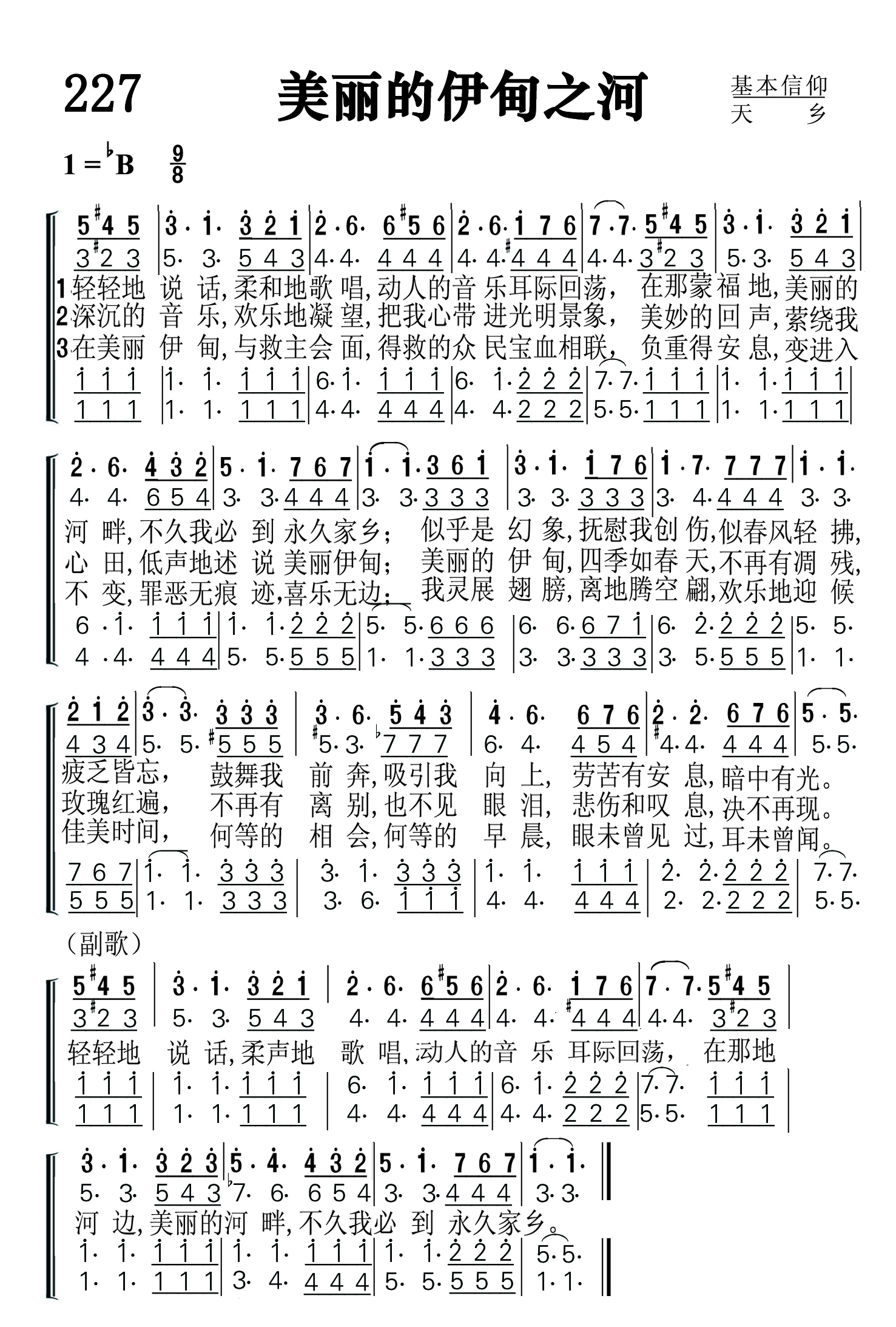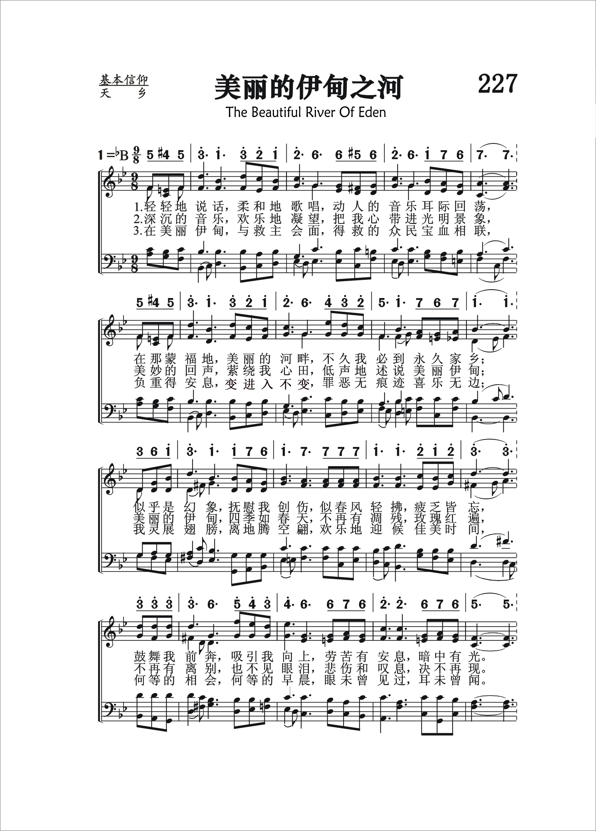 第227首 美丽的伊甸之河The Beautiful River of Eden (《颂赞圣诗》500首) 赵典仁、吴涤申译自英文《青年圣诗》28首 轻轻地说话,柔和地歌唱,动人的音乐耳际回荡, 在那蒙福地,美丽的河畔,不久我必到永久家乡: 似乎是幻象,抚慰我创伤,似春风轻拂,疲乏皆忘, 鼓舞我前奔,吸引我向上,劳苦有安息,暗中有光。 深沉的音乐,欢乐地凝望,把我心带进光明景象, 美妙的回声,萦绕我心田,低声地述说美丽伊甸; 美丽的伊甸,四季如春天,不再有凋残,玫瑰红遍. 不再有离别,也不见眼泪,悲伤和叹息,决不再现。 在美丽伊甸,与救主会面,得救的众民宝血相联, 负重得安息,变进入不变,罪恶无痕迹,喜乐无边: 我灵展翅膀,离地腾空翩,欢乐地迎候佳美时间. 何等的相会,何等的早晨,眼未曾见过,耳未曾闻。 轻轻地说话,柔声地歌唱,动人的音乐耳际回荡, 在那地河边,美丽的河畔,不久我必到永久家乡。 自从人类的始祖因违背上帝的命令被赶出伊甸乐园以后,重返伊甸成了人类累代的梦想。他们曾用最美丽的语言,来描绘他们对乐园的憧憬。上帝的儿子道成肉身,降世为人,受苦受难,舍身流血,为人类成就了救赎的大工,使人重返乐园成为可能。 这首诗歌展开了想象的翅膀,把人心带到了美丽的伊甸河畔。在那里,救主要擦去我们的一切眼泪,抚慰我们在世上所受的创伤,并要向他们开启全宇宙的奥秘,让他们心驰神往。