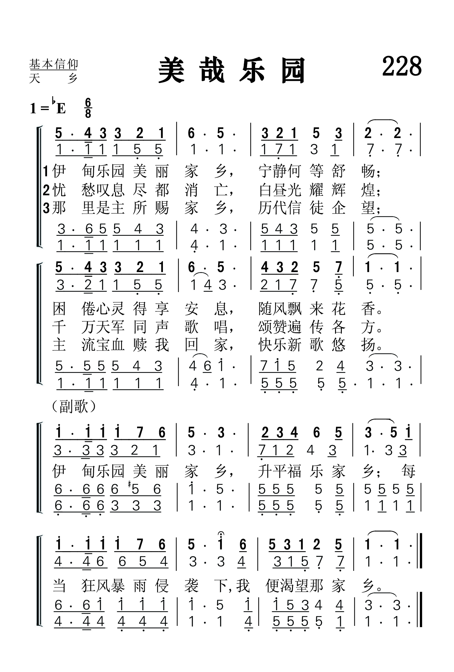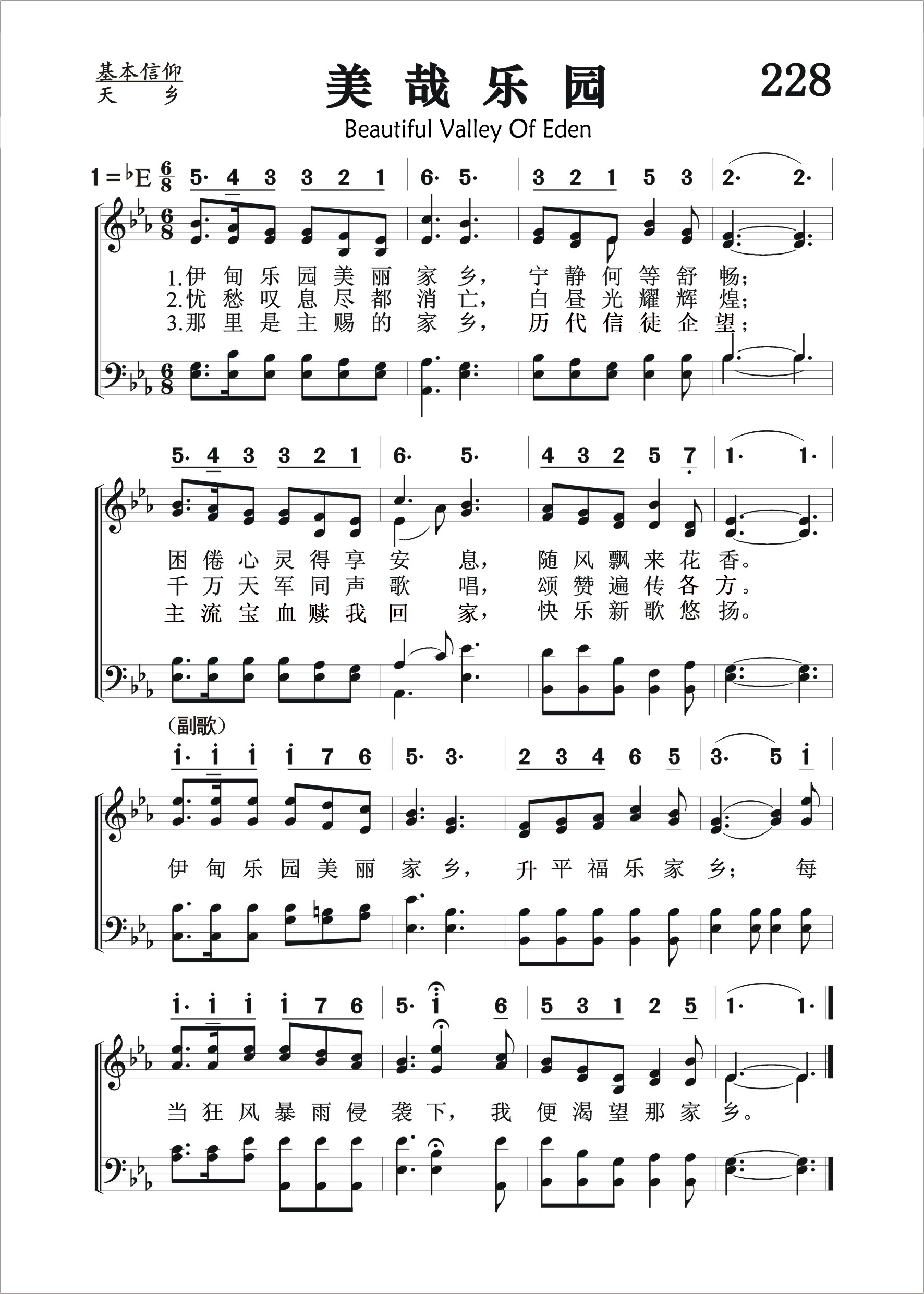 第228首美哉乐园Beautiful Valley of Eden 库欣(William O.Cushing,1823-1902)作词,舍温(W .F .Sherwin,1826,3,14-1888,4,14)作曲 伊甸乐园美丽家乡,宁静何等舒畅; 困倦心灵得享安息,随风飘来花香。 忧愁叹息尽都消亡,白昼光耀辉煌; 千万天军同声歌唱,颂赞遍传各方。 那里是主赐的家乡,历代信徒企望; 主流宝血赎我回家,快乐新歌悠扬。 伊甸乐园美丽家乡,昇平福乐家乡; 每当狂风暴雨侵袭下,我便渴望那家乡。 词作者库欣出生于美国新英格兰,自幼信主;青年时代受奋兴布道的影响,献身事奉主,担任牧师圣职。1870年他47岁时,不幸患病,健康恶化。后来疾病虽愈,但口以不能说话,无法再宣传主道,于是求主赐下写作圣诗的才能。此后,他以惊人的毅力写了圣诗三百余首,感动了许多人。他以坚强的信心,在世上又生活了三十三年,去世时80岁。他的圣诗多由鲁特、桑基、劳里等福音派圣诗作曲家为他配曲。 曲作者舍温是美国浸信会著名的作曲家和唱诗班指挥。他是美国著名宗教音乐家梅森的学生,从波士顿音乐学院毕业以后就从事音乐教育和合唱指挥的工作,后接受文森特博士的邀请到桥头洼集会所,负责组织圣诗班并担任音乐指导。 254首《黄昏崇拜》, 350首《永生之饼》和486首《高扬号角声》也是舍温作曲的。
