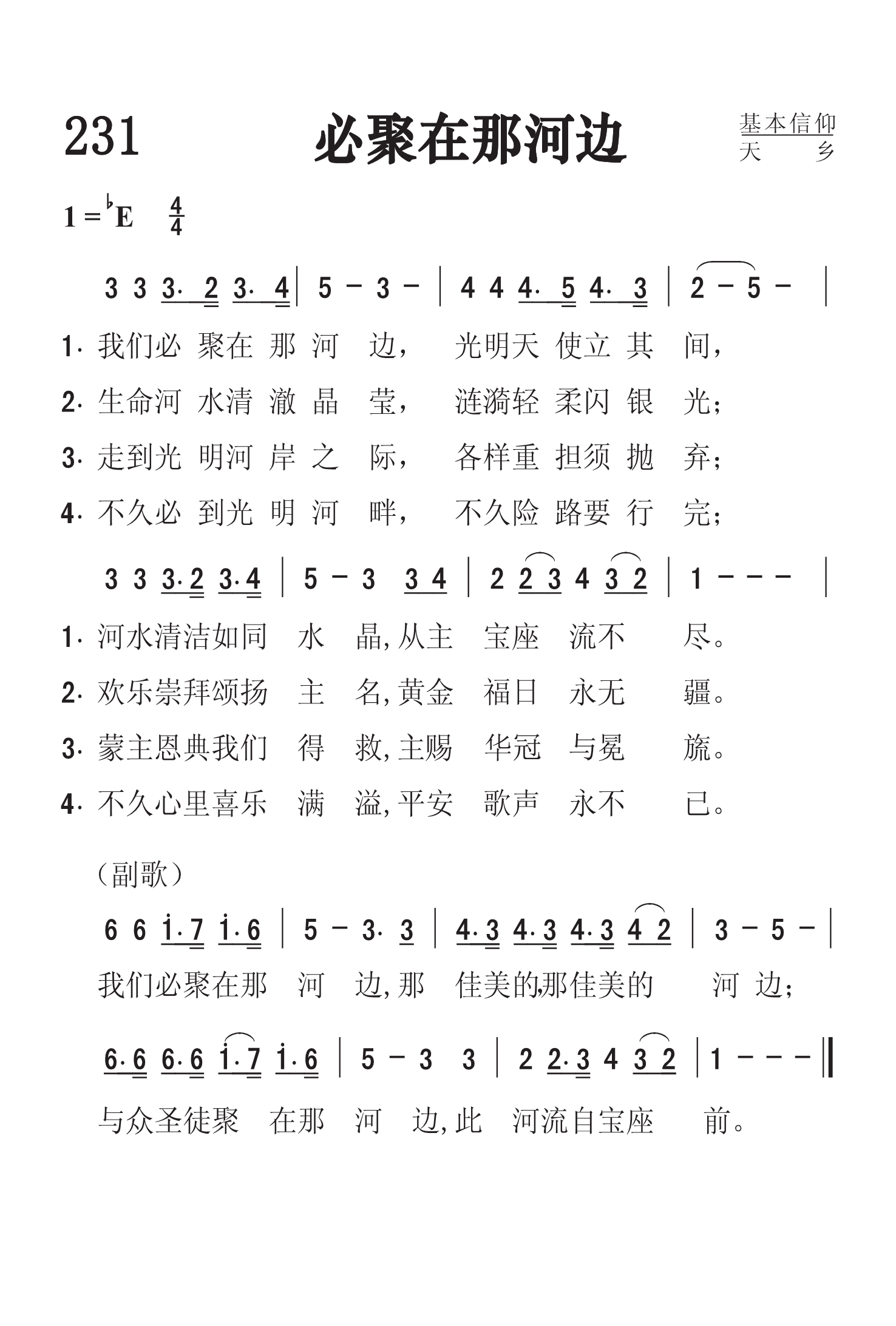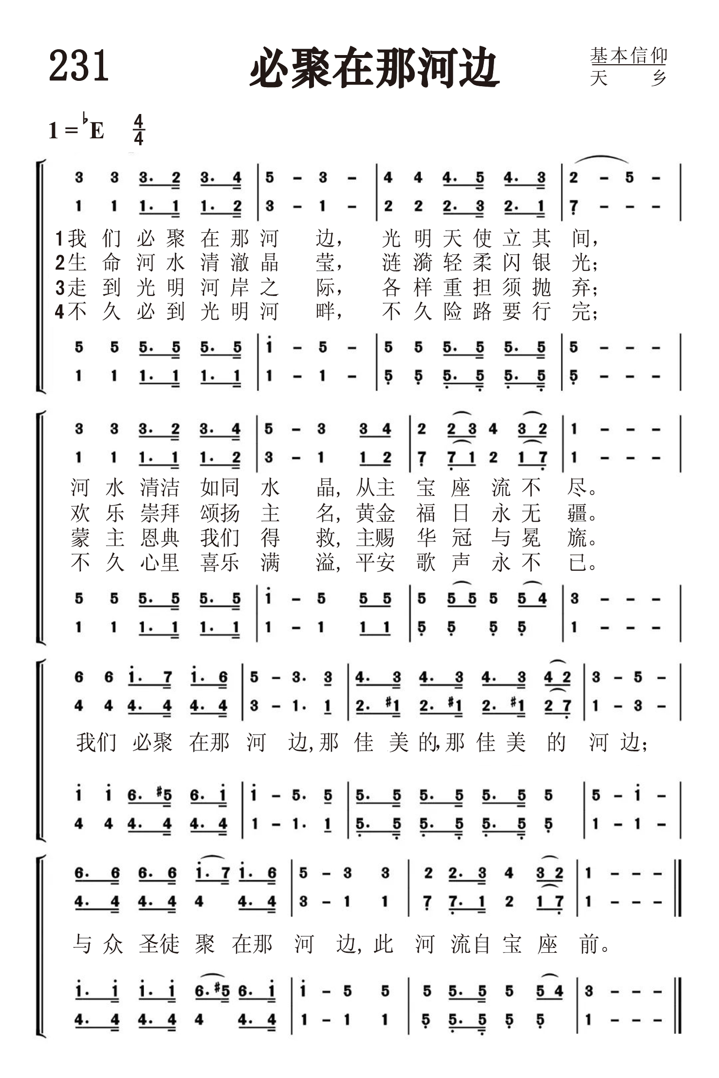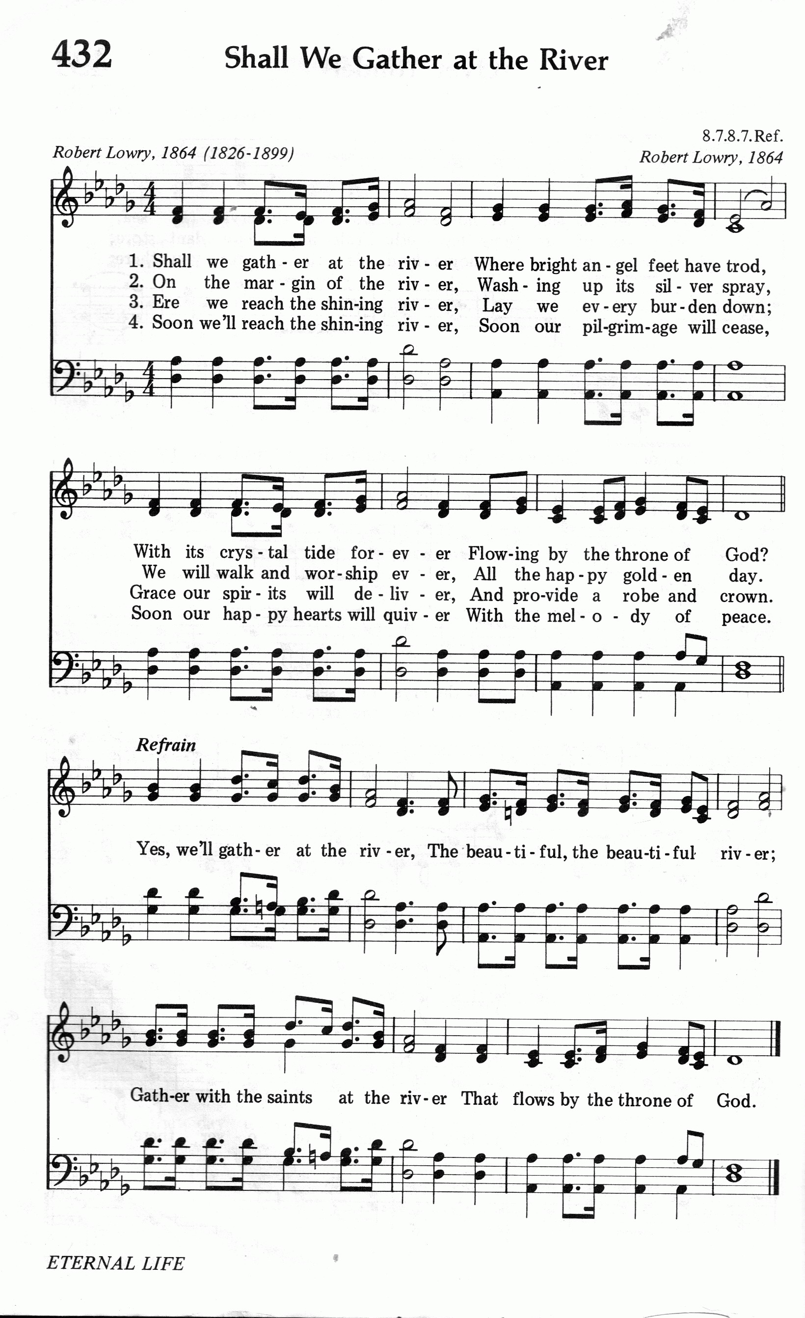第231首必聚在那河边Shall We Gather at the River 罗伯特.劳里(R .Lowry,1826,3,12-1899,11,25)作词作曲 我们必聚在那河边,光明天使候其间, 河水清洁如同水晶,从主宝座流不尽。 生命河水清澈晶莹,涟漪轻柔闪银光; 欢乐崇拜颂扬主名,黄金福日永无疆。 走到光明河岸之际,各样重担皆抛弃; 蒙主恩典我们得救,主赐华冠与冕旒。 不久必到光明河畔,不久险路要行完, 不久心里喜乐满溢,平安歌声永不已。 我们必聚在那河边.那佳美的,那佳美的河边: 与众圣徒聚在那河边,此河流自宝座前。 劳里出生于美国费城。大学毕业后,担任费城,纽约布鲁克林等地浸会教堂的牧师。1869至1875年兼任母校修辞学教授,离校时母校赠送他荣誉神学博士学位。1875年起至1899年去世,一直任新泽西州普兰菲尔德地方浸会牧师。他自幼爱好音乐,但并没有专学音乐,直到他41岁后才致力于福音音乐圣诗的编写,并自己作曲配和声。有人问他:“你怎么又能作词又能作曲并能配以和声呢?”他回答说:“我也没有什么特别的办法。有时,音乐曲调在我心中出现,而词句也随着出来了,词与曲就配合得很好。我常常注意着自己的心境,无论是在家中,还是走在街上,任何事物触动了我的灵感,我就马上抓住它,把它记录下来。我有时在报纸的边上或一个旧信封的背面,把我的灵感记录下来。我觉得我的头脑就象一架常转动的纺车,音乐从其中流了出来,有时并不注意在我头脑里流出来的曲调是C调还是A调,只有当我把它写在纸上时,才想它当用什么调。我在纸上一面写,一面把它完成,成为一首曲调,然后再到管风琴上去试奏,不是先试奏而后写出,而常常是曲调与词一同写出。” 劳里还说:“我有时宁愿写赞美诗可以长期流传下来,影响很多的人,因为讲道完毕后常常会被人遗忘。”的确,他当时讲道的听众只有一千人,而他所写的赞美诗多年以来却有成千上万的人在颂唱。劳里牧师一生编辑过十八种不同的赞美诗集。