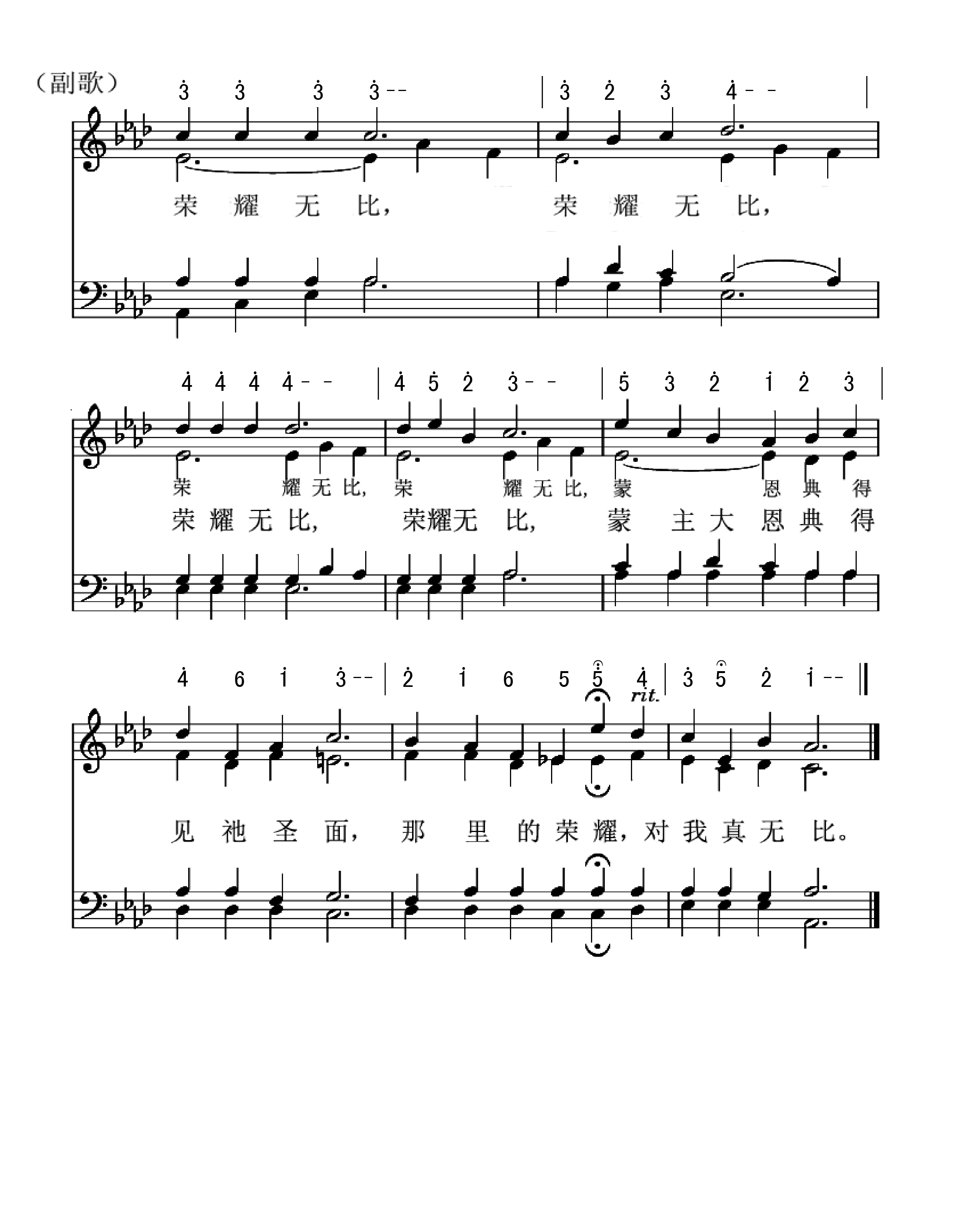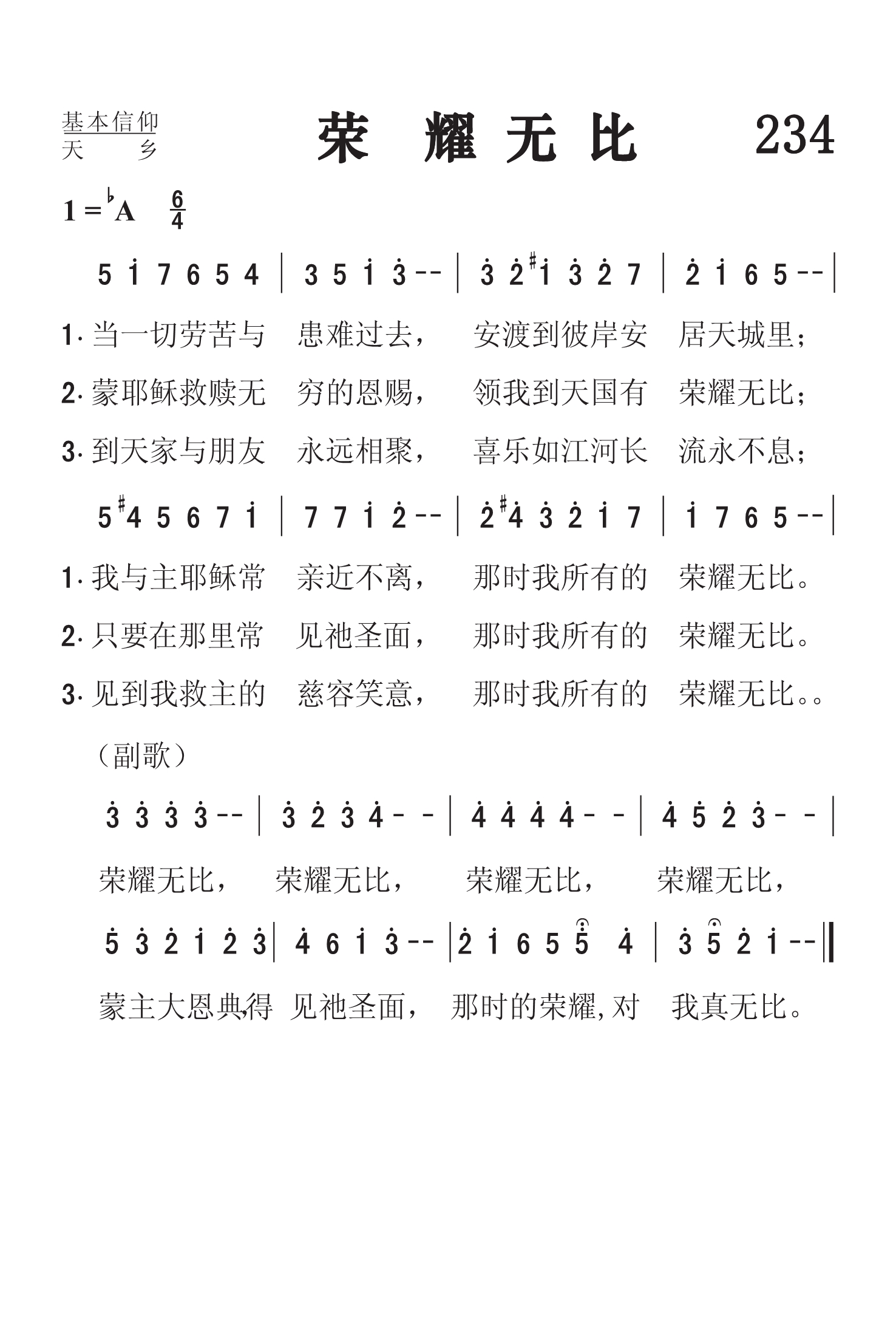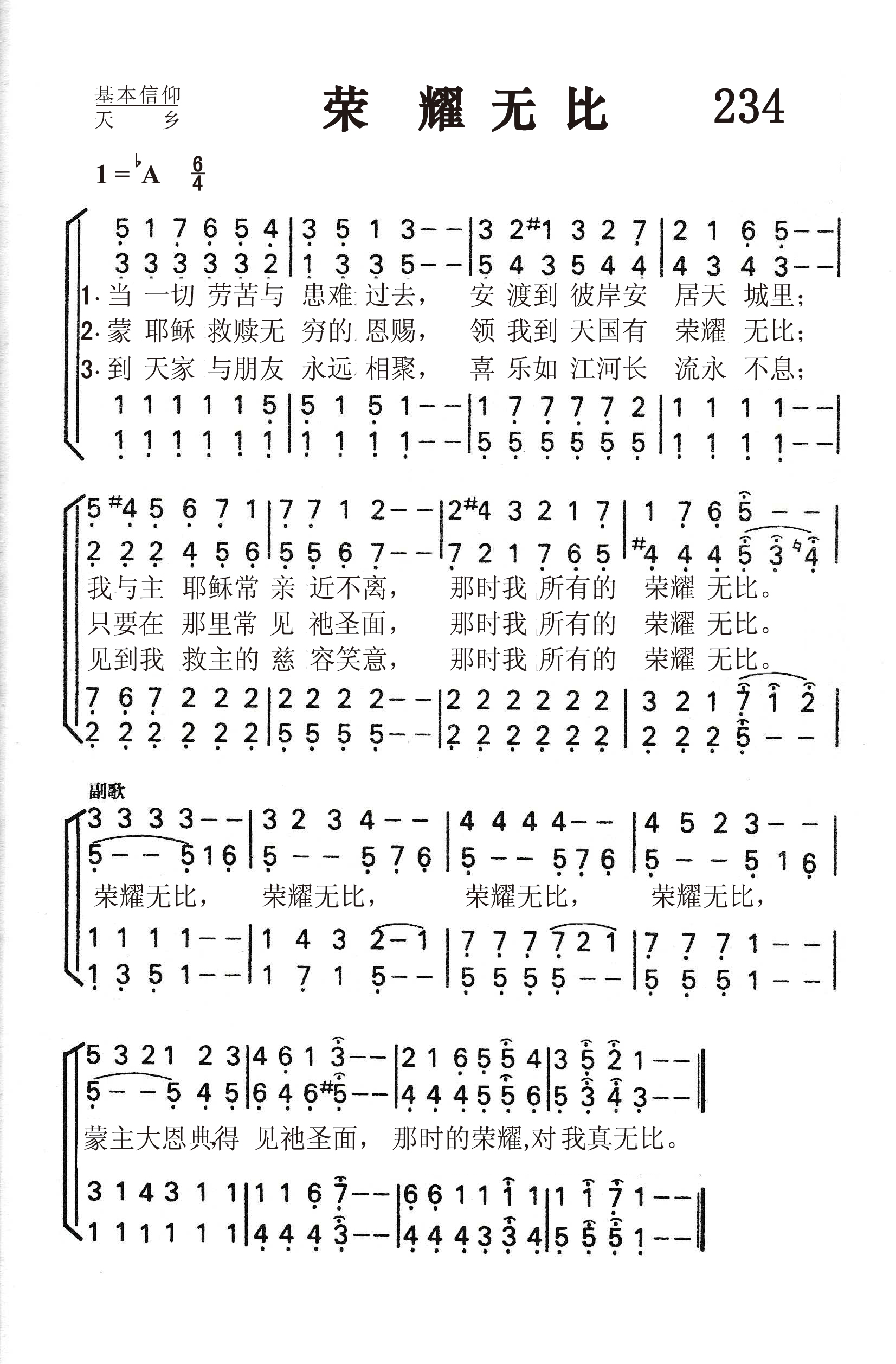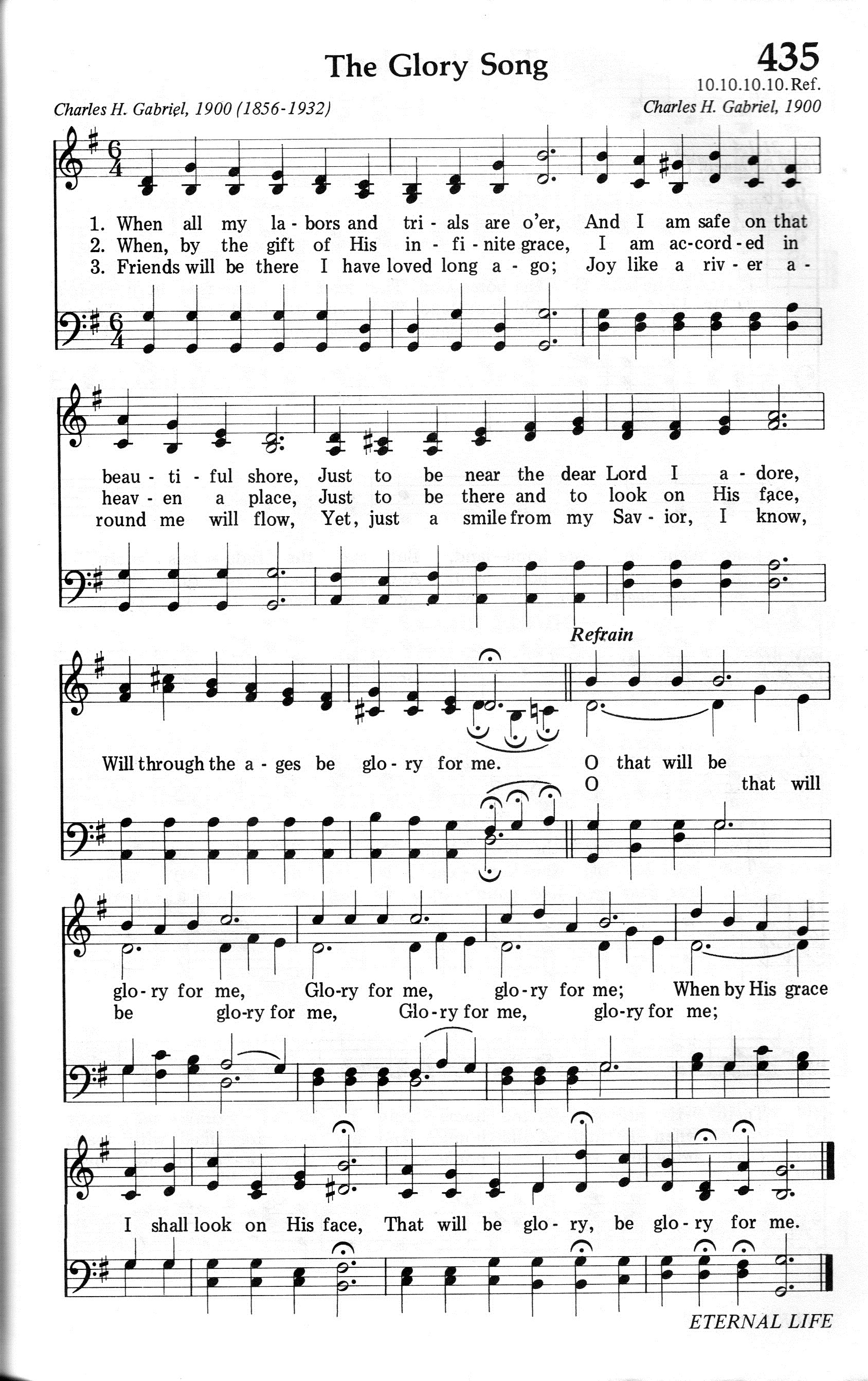 第234首荣耀无比Glory For Me 加布里埃尔(C.H.Gabriel,1856,8,18-1932,9,15)作词作曲 当一切劳碌与试炼过去,安渡到彼岸在天城安居; 我与主耶稣常亲近不离,那时我永远享荣耀无比。 蒙耶稣救赎无穷的恩典,领我到天国荣耀在眼前; 在那里我要常见祂圣面,那时我永远享荣耀无比。 到天家与亲友永不分离,喜乐如江河长流永不息; 亲见我救主的慈容笑意,那时我永远享荣耀无比。 加布里埃尔是20世纪20年代美国布道团中最受欢迎的歌唱家和作曲家。这首诗和曲都是他的得意之作。 1900年有一天,加布里埃尔在密苏里州圣路易市遇见一位信徒,名叫卡德。这个人有个特点,就是从不发愁,他见人总是满脸笑容,听道时常喊着“荣耀”,祷告结束时总是说:“这是我的荣耀。”人们喊他“老荣耀”。加布里埃尔看到他后,很受感动和启发,就谱写出这首诗和曲,以后编入他自己出版的小集子中,起名为“赞美主的荣耀”。上世纪20年代初,在奋兴布道会上,人们总是称这首诗为“荣耀之歌”,流传至今。 加布里埃尔是自学成才的宗教音乐家。他在美国南方衣阿华州农场中长大,平生爱音乐,好唱歌,自己在家里学习,在一架破旧的小风琴上弹奏。16岁时就自告奋勇到附近音乐学校教唱,成绩显着,不久被正式聘为教员。从此,他更努力学习,精益求精,终于成为一个有名的作曲家,业余时间还兼任旧金山一个卫理公会礼拜堂的音乐指导。1895年迁居芝加哥,继续写作、编曲,曾编印出版过好几本乐谱。