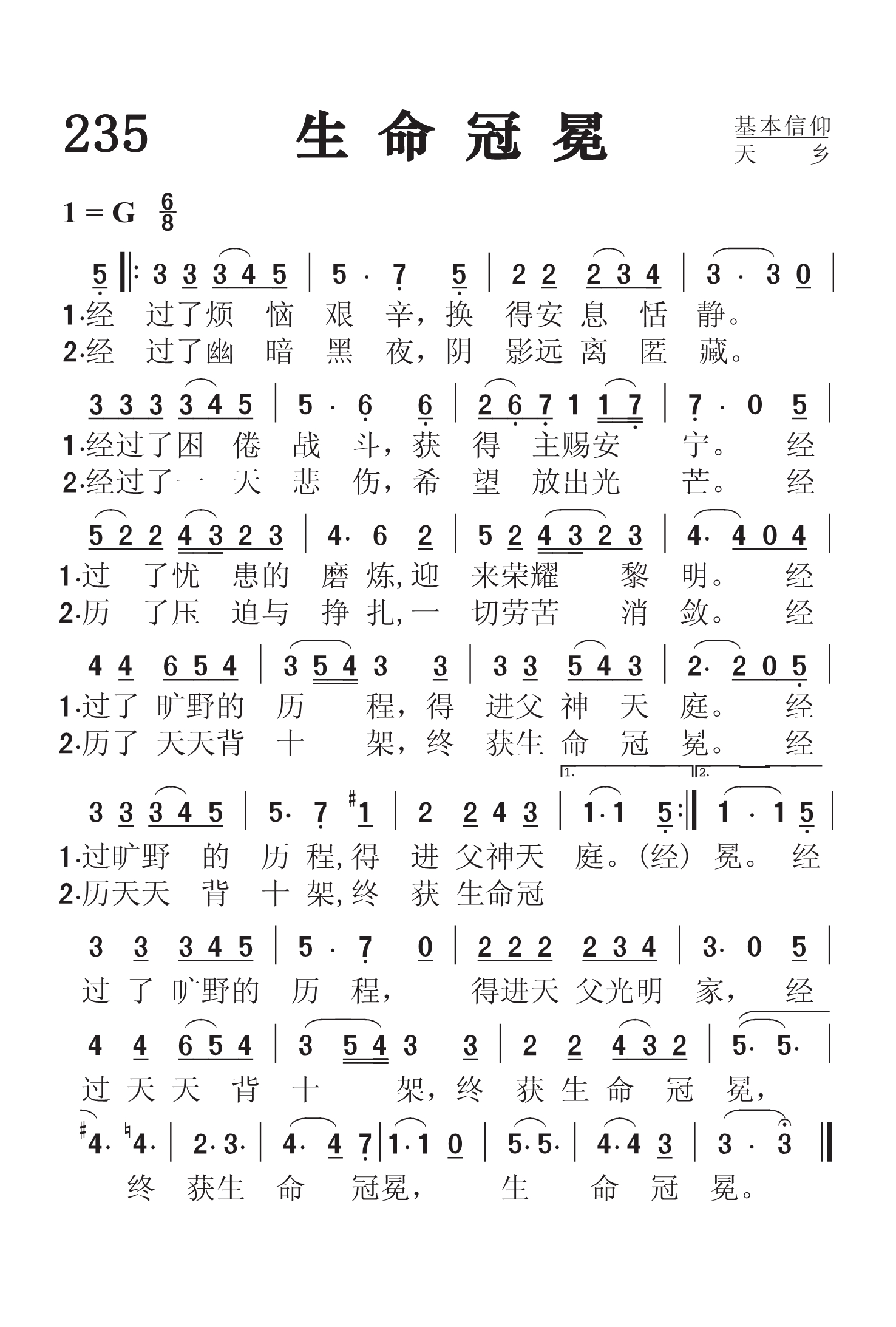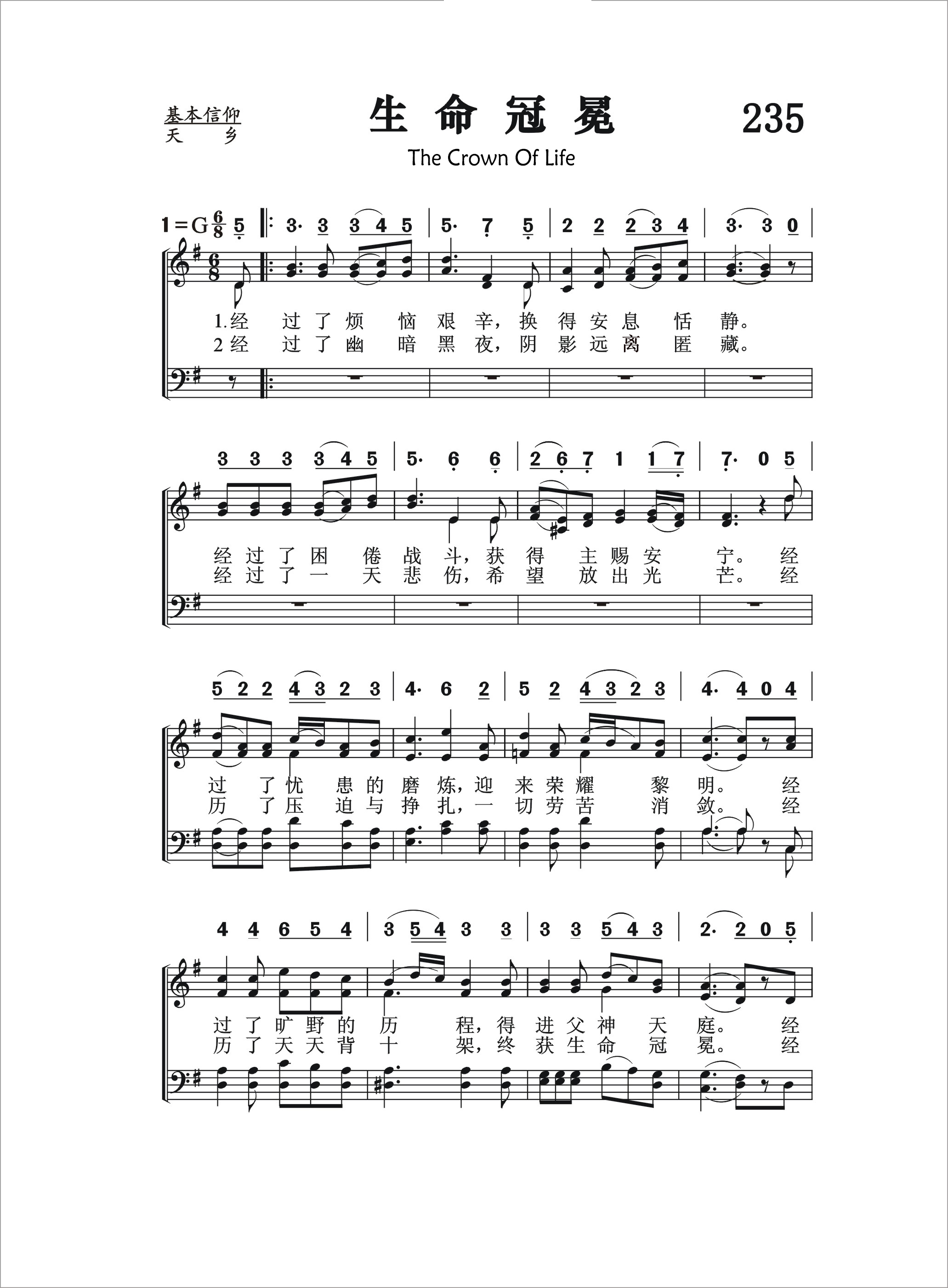 第235首 生命冠冕The Crown of Life 纪哲生译词,门德尔松(F.Mendelssohn,1809-1847)作曲,纪哲生译 经过了烦恼艰辛,换得安息恬静。 经过了团倦战斗,获得主赐安宁。 经过了忧患的磨炼,迎来荣耀黎明。 经过了旷野的历程,得进父神天庭。 经过旷野的历程.得进父神天庭。 经过了幽暗黑夜,阴影远走匿藏。 经过了一天悲伤.希望放出光芒。 经历了压迫与挣扎,一切劳苦消敛。 了天天背十架,终获生命冠冕。 经历天天背十架,终获生命冠冕。 经过了旷野的历程,得进天父光明家, 经过天天背十架,终获生命冠冕, 终获生命冠冕,生命冠冕。 纪哲生牧师是著名的华人圣乐作家。他出生于1922年2月14日,毕业于上海大夏大学,先后向上海国立音专杨嘉仁教授和德国犹太人罗伯特.罗斯教授学习音乐,向美国著名指挥家约翰.威廉森博士学习指挥。 他曾任香港中文大学崇基学院诗班指挥,香港浸信会出版部副社长兼音乐主任廿十多年,是天恩出版社的创办人,曾任香港圣乐学院教务长,八十高龄仍不断写作。除了主编《圣乐季刊》,《颂主新歌》诗集及编译大量诗班用歌之外,他还创作了大量圣乐作品。如诗歌集《浪子回家》,《圣诞神曲》,《称谢耶和华》,诗班合唱曲集《万有颂主》」,《婚礼歌集》,《丧礼圣歌集》等,还有《主日崇拜序奏曲 1 & 2》。他的专著有《圣诗名曲漫谈》,《教会诗班灵修手册 1 & 2》等。 本诗采用是门德尔松《乘着歌声的翅膀》的优美旋律。 门德尔松是犹太籍的基督徒,是一位与贝多芬,莫扎特,海顿等平名的音乐大师,38岁就英年早逝。他12岁就创作一首钢琴四重奏;20岁就组织演出几乎被人遗忘的巴赫作品《马太受难曲》。他一生写过许多宗教音乐,最著名的有清唱剧《伊莱贾》,《圣保罗》和《耶稣基督》(未完成)。这首《新生王歌》是门德尔松为印刷术发明400周年而写的《颂歌》(作品第68号)中第二乐章的主题,原为男声合唱,由铜管乐队伴奏。