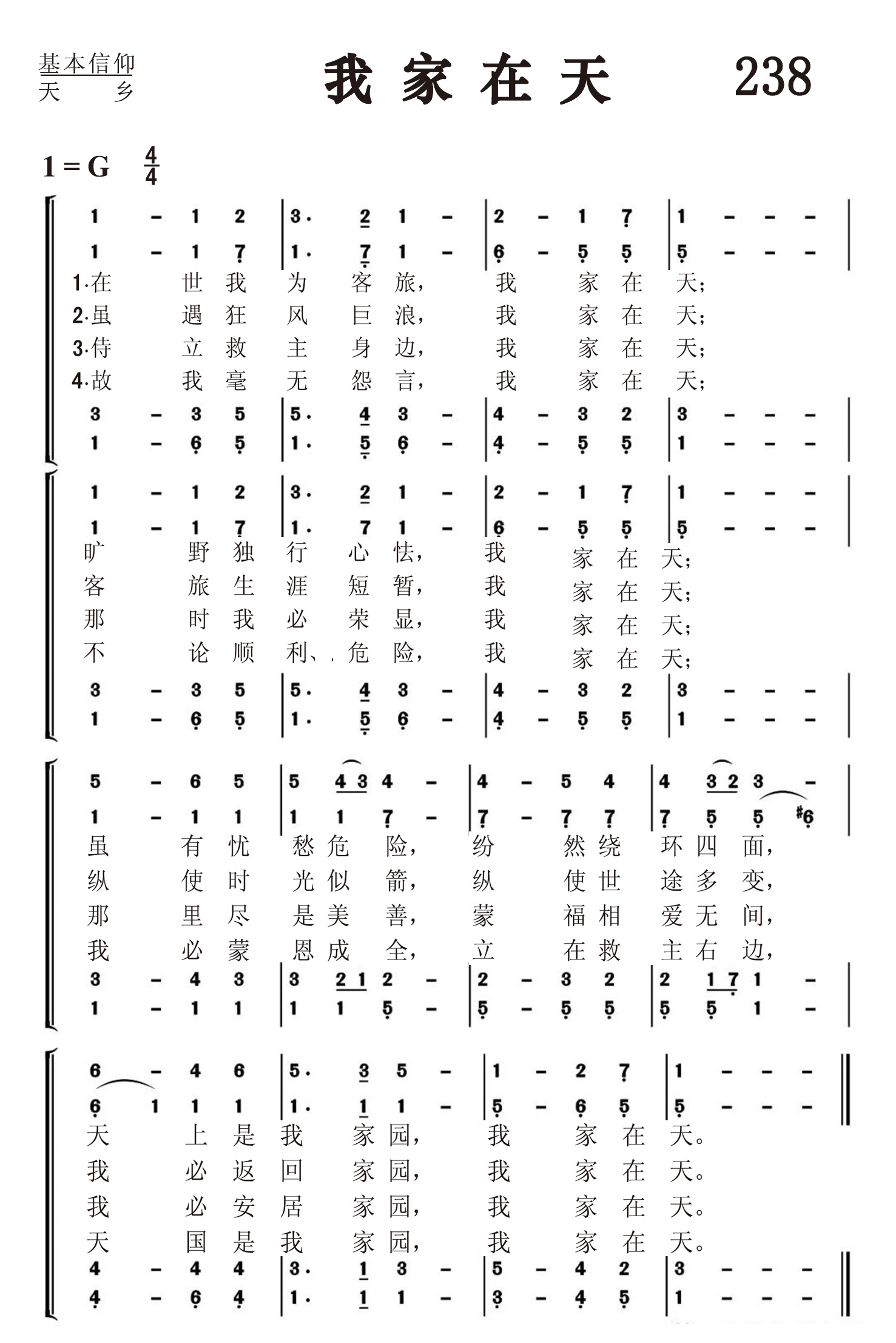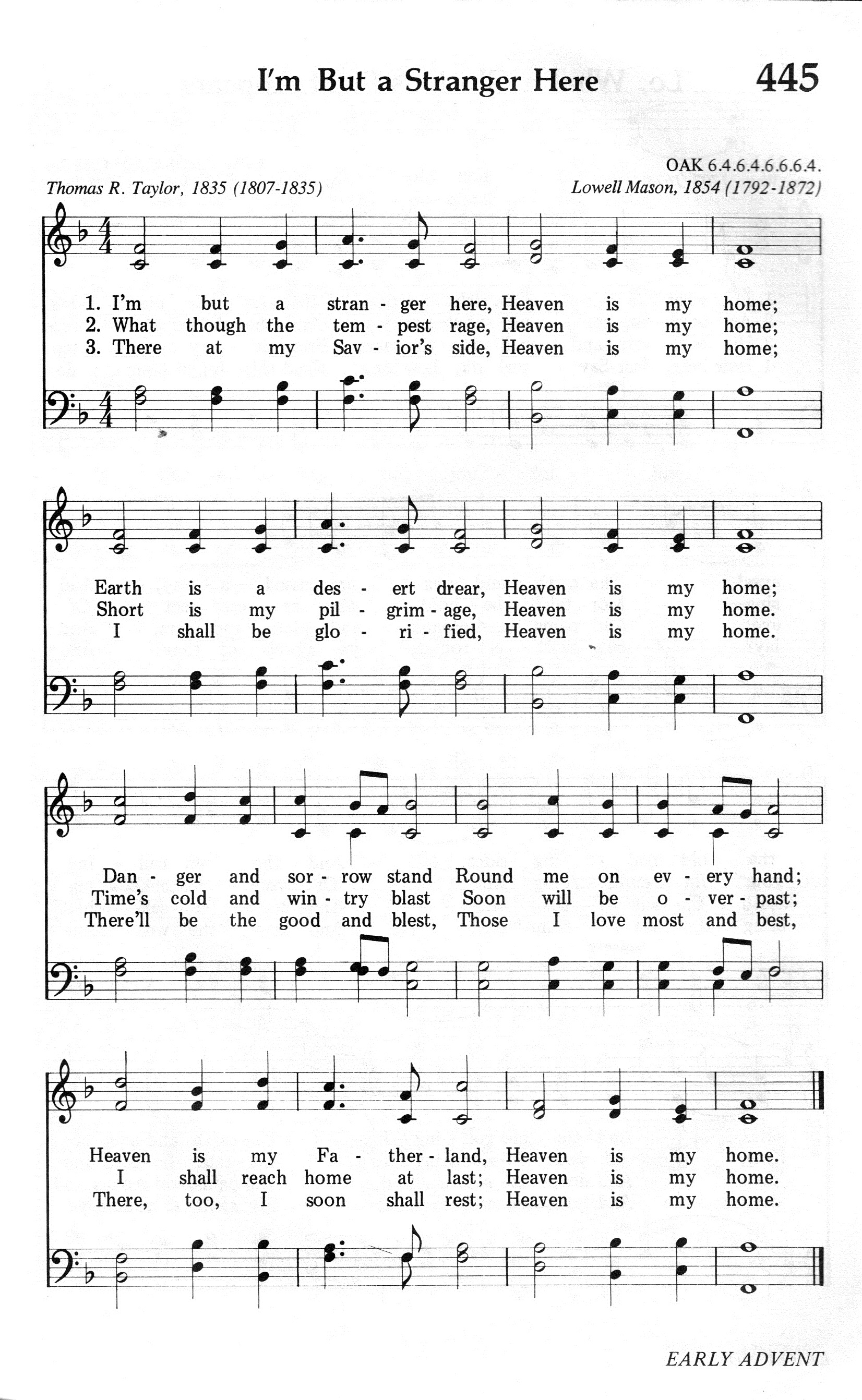 第238首我家在天I’m but a Stranger Here 托马斯.泰勒(Thomas R.Taylor,1807,5,9-1835,3,15)作词(1836年),梅森(Lowell Mason,1792,7,8-1872,8,11)作曲, 约翰.汉米尔顿改编 在世我为客旅,我家在天; 旷野独行心怯,我家在天; 虽有忧愁危险,纷然绕环四面, 天乡是我家园,我家在天。 虽遇狂风巨浪,我家在天; 客旅生涯短暂,我家在天; 纵使时光似箭,纵使世途多变, 我必返回家园,我家在天。 侍立救主身边,我家在天; 那时我必荣显,我家在天; 那里尽是美善,蒙福相爱无间, 我必安居家园,我家在天。 故我毫无怨言,我家在天; 不论顺利、危险,我家在天; 我必蒙恩成全,立在救主右边 天国是我家园,我家在天。 托马斯.泰勒出生于英国约克郡一个公理会牧师的家庭。在曼彻斯特读完中学以后,他立志象他父亲那样,献身传道,为主服务,遂入阿尔代尔大学攻读神学。1830年他23岁被按立为牧师,派往谢菲尔德教会工作,与著名诗人蒙歌马利结为好友。泰勒素来体质软弱。繁重的工作,使他患上严重的肺病,不得不于三年以后回到故乡。他一方面协助父亲传道,一方面在母校兼任文学课程。他是一位勇敢而有爱心的基督徒。他写的诗与他的生活一样的美丽。因体力不支,他于1835年去世。他的人生虽然只有短短的二十八年,但他散发出来的馨香之气,为主作了美好的见证。他最后一天还在讲道,说:“我宁愿作一名英勇的战士,虽葬身沙场,仍不放弃手中的武器。”这就是他人生的写照。他所写《在世我为客旅》,曾鼓舞无数的信徒满怀信心走过世界危路,仰望天上的家乡。 曲作者梅森出生于美国马萨诸塞州的梅德菲尔德。幼年在校时就喜欢音乐,16岁时已成了乡村教堂唱诗的指挥。1812年迁居乔治亚州,在一家银行当办事员,同时在长老会礼拜堂任管风琴师及唱诗班指挥,并开始学习和声学和作曲。他自编了一本《圣乐曲调集》,送到好几家印刷长和出版社去,虽然讲明不要稿费,也没有一家肯承印。后经波士顿亨德尔.海顿音乐社出资代印,结果销路之广,出人意料,大大鼓舞了梅森,使他决定以音乐为他的终生事业。1827年他迁居波士顿,当选为亨德尔及海顿学会主席,并任教堂唱诗班指挥十四年。1829年编辑出版了第一本《儿童赞美诗》。他为了培养训练儿童唱诗,创办成立波士顿音乐学院,专门训练儿童唱歌。1834年又在音乐学院内成立了培训儿童音乐的教师培训班。他还负责出版音乐杂志,编辑出版了80多种诗歌集,创作诗歌曲谱1126首,改编496首,对提高美国的音乐水平,改善教会圣乐方作出突出贡献,为19世纪美国音乐界最有影响的人物。1835年纽约大学授予他第一位音乐博士学位。