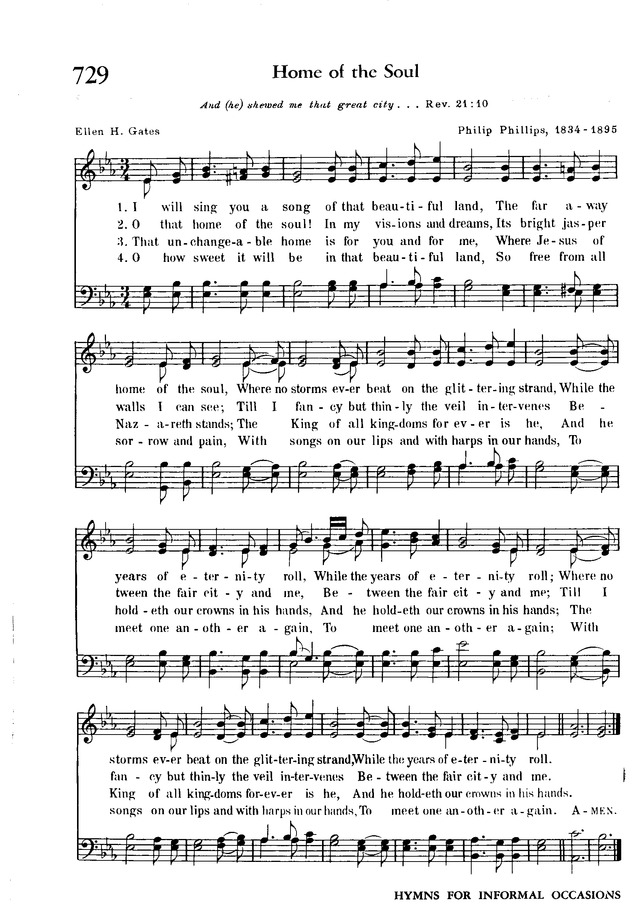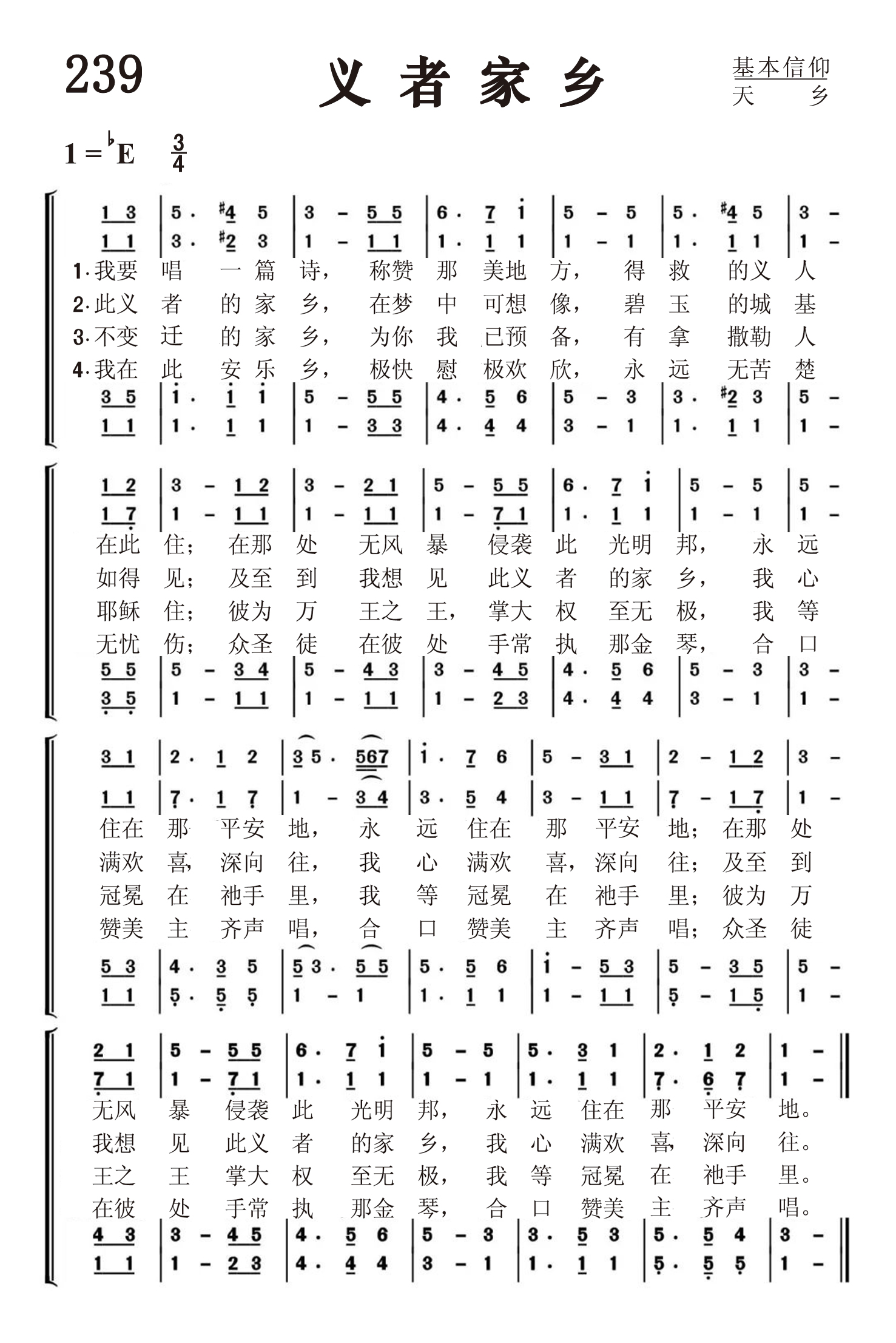 第239首义者家乡I Will Sing You a Song 盖茨(Hellen H.Gates)作词,菲利普斯(Philip Phillips,1834,8,13-1895,6,25)作曲 我要唱一篇诗,称赞那美地方,得救的义人在此住; 在那处无风暴侵袭此光明邦,永远住在那平安地。 此义者的家乡,在梦中可想像,碧玉的城基如得见, 及至到我想见此义者的家乡,我心满欢喜,深向往。 不变易的家乡,为你我己预备,有拿撒勒人耶稣住。 彼为万王之王掌大权至无极,我等冠冕在祂手里。 我在此安乐乡,极快慰极欢欣,永远无苦楚无忧伤; 众圣徒在彼处手常执那金琴,合口赞美主齐声唱。 词作者盖茨的生平不详。曲作家菲利普斯是美国著名的歌唱家和作曲家。他出生于纽约州的一个农民家庭,从小就表现出音乐天赋,五岁登台献唱,十六岁进音乐学校,并参加村里的诗班,十九岁在他自己的音乐学校授课,同时在一个制造奶酪的农场当学徒。1858年与克拉克结婚。1860年起经商,销售风琴和钢琴等乐器并出版主日学诗歌集,时常沿街弹唱,用他美妙的歌声推销自己的产品。1865年遭遇火灾损失了全部财产,但他没有灰心。1867年他迁居纽约,开始陆续出版他的《歌唱旅程》等圣诗专着达11种,大受欢迎,售量达一百万册以上。他因出色的歌唱才华而受到伦敦主日学协会的邀请去演唱100个晚上的圣诗,从而开创了他环球诗歌演唱的新篇章。他到处举行诗歌演唱演唱会,用歌声宣扬耶稣基督的福音,让救主的大爱感到千百万人。他的足迹遍布各大洲,共计在英国和爱尔兰献唱972次,欧洲大陆150次,加拿大和澳大利亚187次,印度,巴基斯坦和埃及81次,美国3200次。他在伯利恒降生教堂的献唱,是他一生引以为荣的。他的虔诚,热情和美妙的歌喉,以及他所留下的著作是人们永远不会忘记的。 312首《天门为我敞开》和492首《迎击恶敌》也是菲利普斯作曲的。